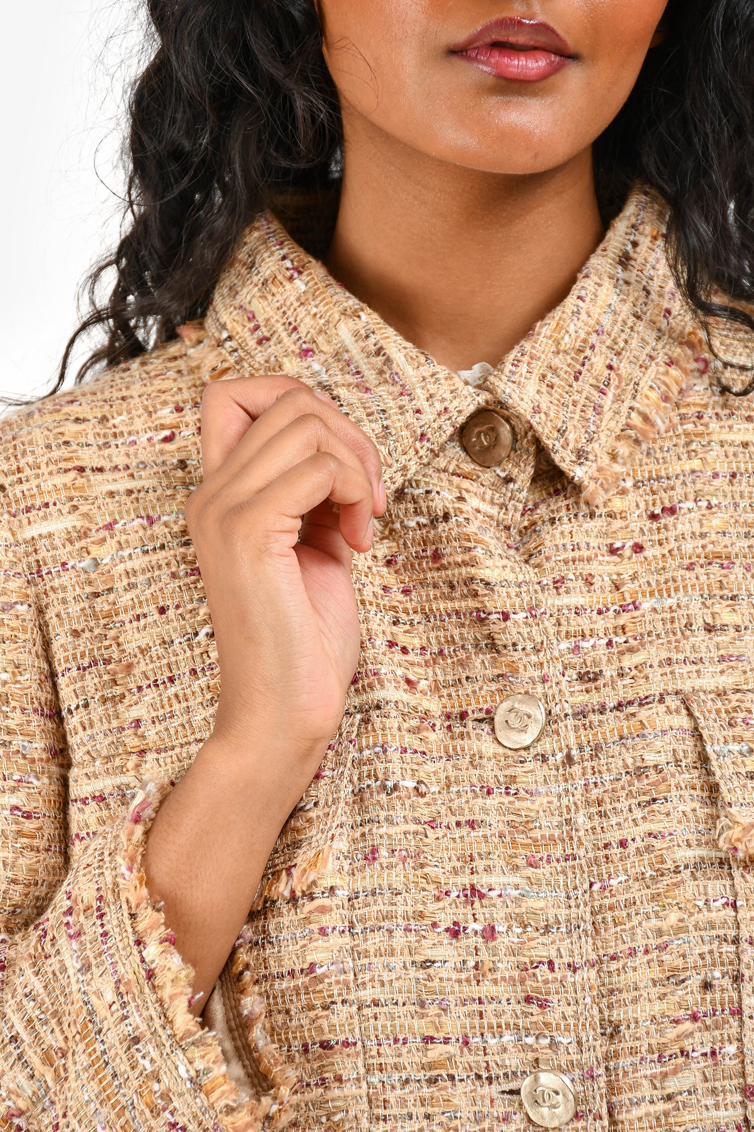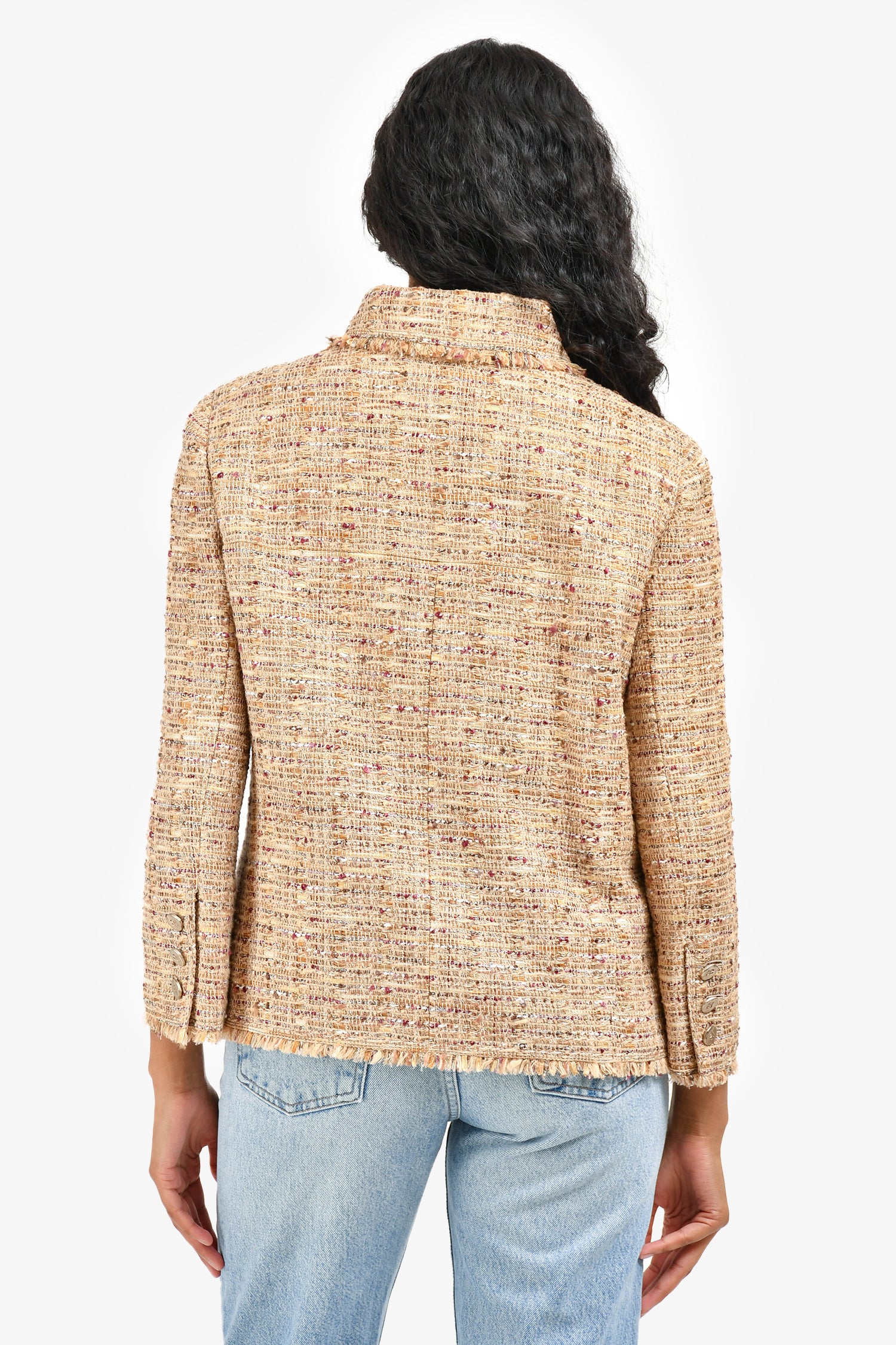 Refresh availabilityPre-Loved Chanel™ 2006 Brown Tweed Metallic Fringe CC Blazer. Long sleeves. Front button closure. Fringe trim detailing. Lined interior. Tonal stitching.