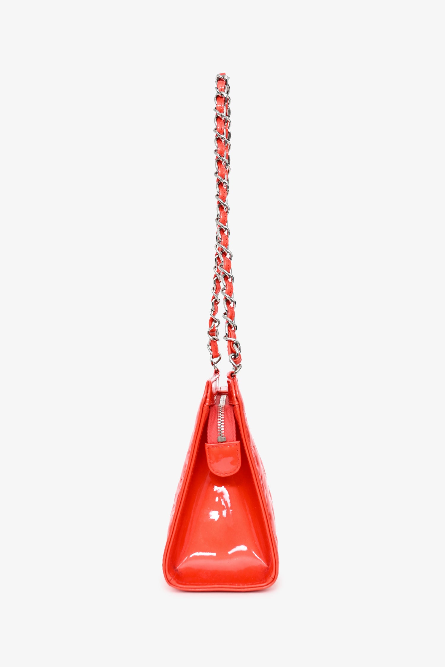 Refresh availabilityPre-Loved Chanel™ 2006–2008 Orange Patent “Lucky Symbols” Pochette. Top zip closure. Signature chain link and leather strap. Silk-lined interior. 1 interior slip pocket. Silver-tone hardware. Tonal stitching.