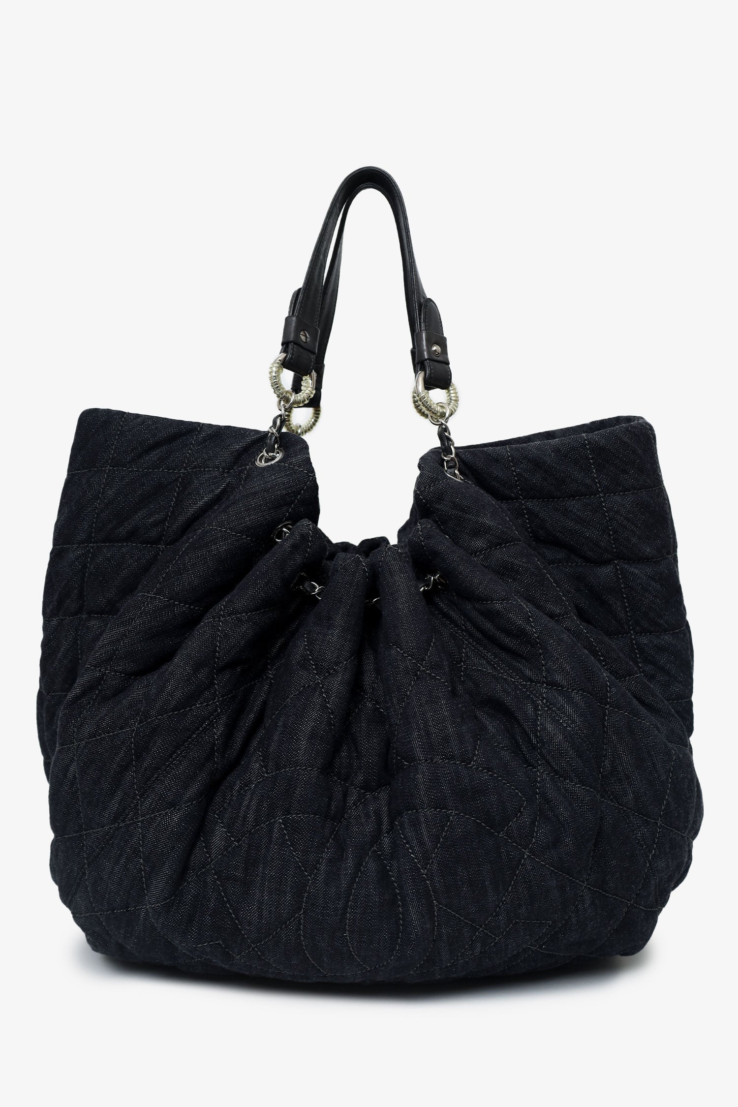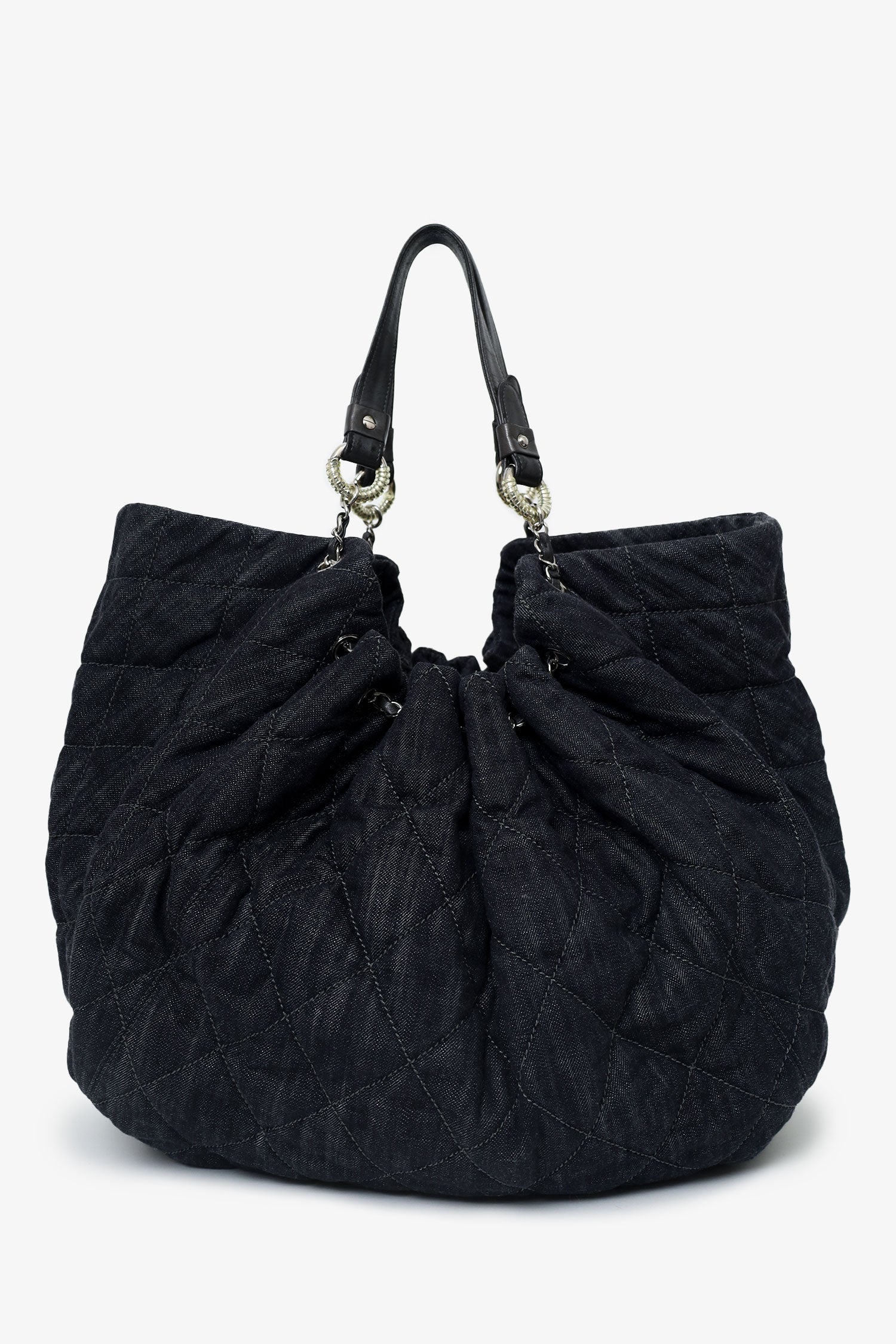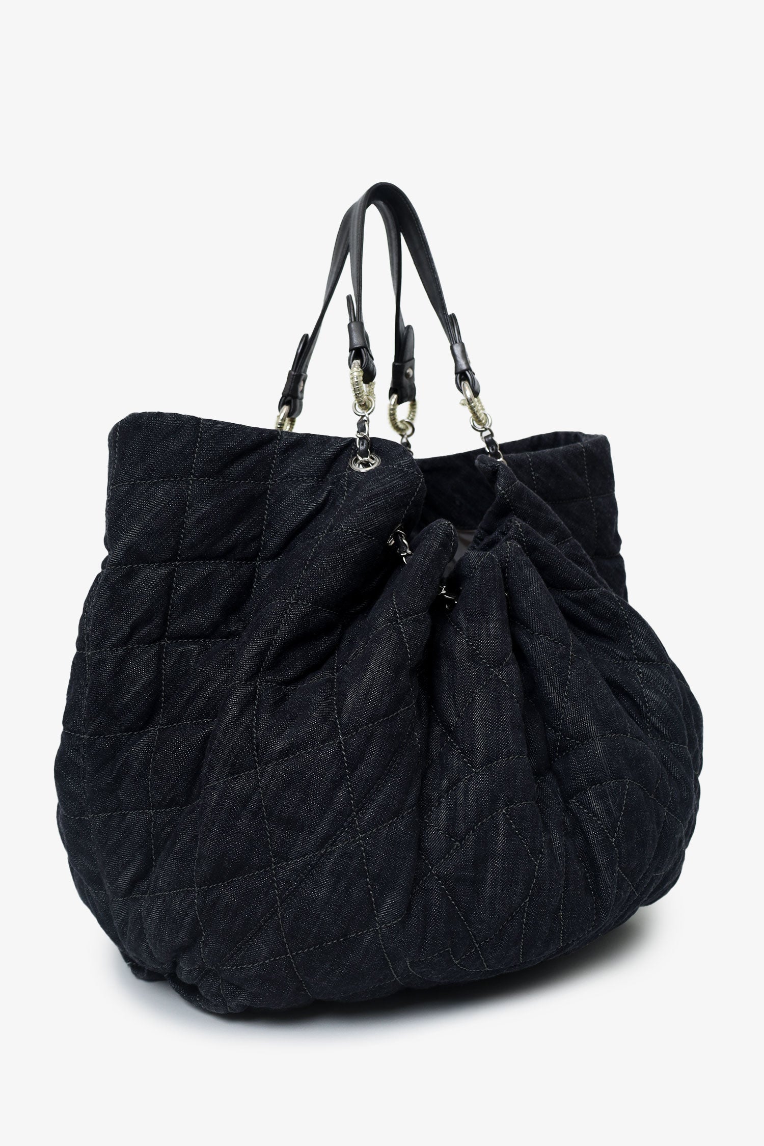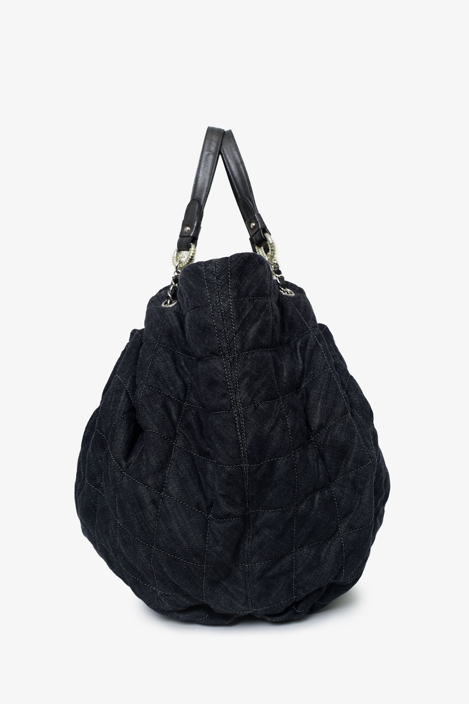 Refresh availabilityPre-Loved Chanel™ 2008-09 Navy Quilted Denim XL Coco Cabas Spirit Bag. Open top. Twin leather straps with chain detail. Fabric-lined interior. 3 interior pockets: 2 font slip, and 1 rear zip. Interior key ring with a lobster-clasp closure. Silver-tone hardware. Tonal stitching.