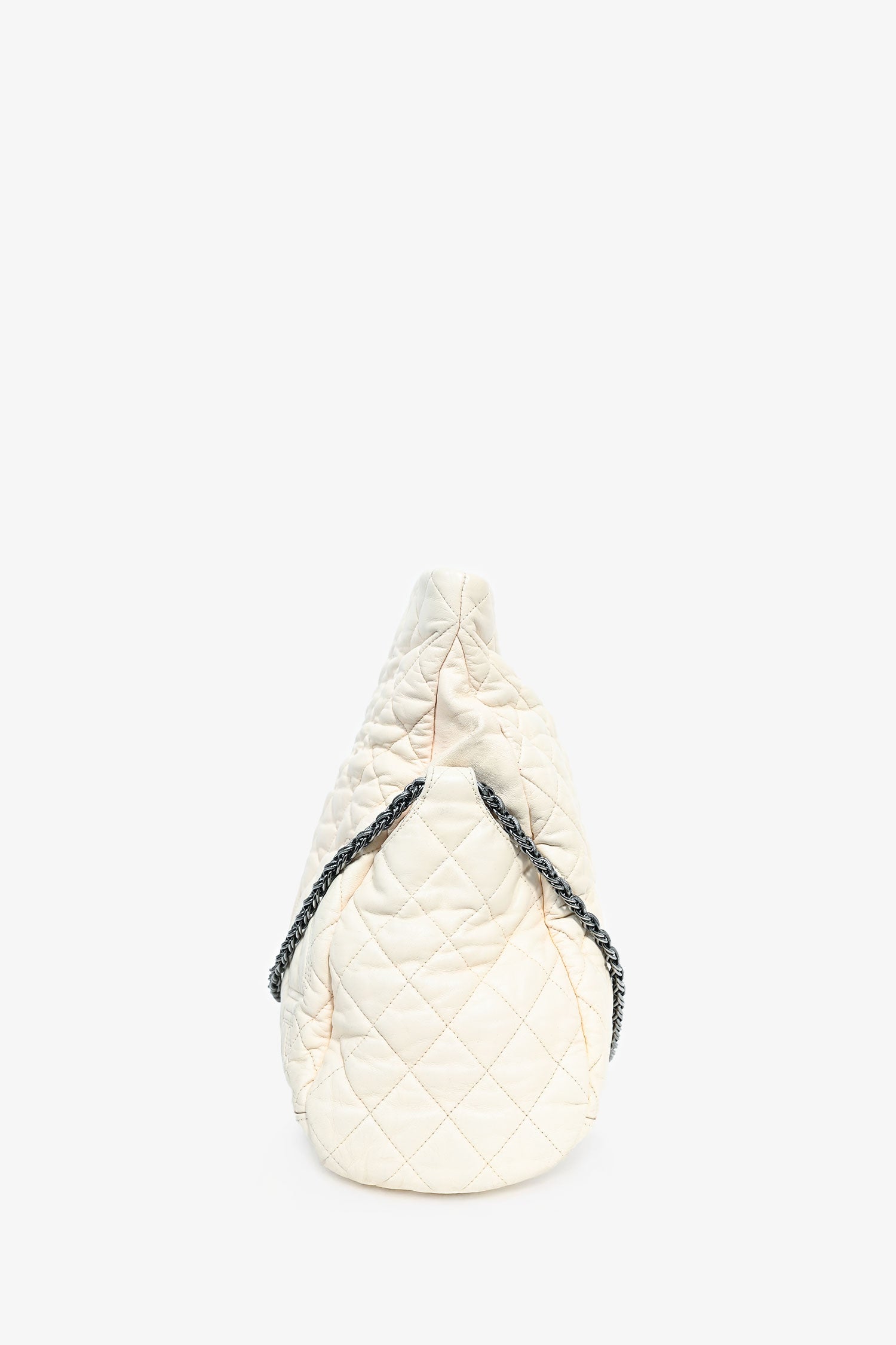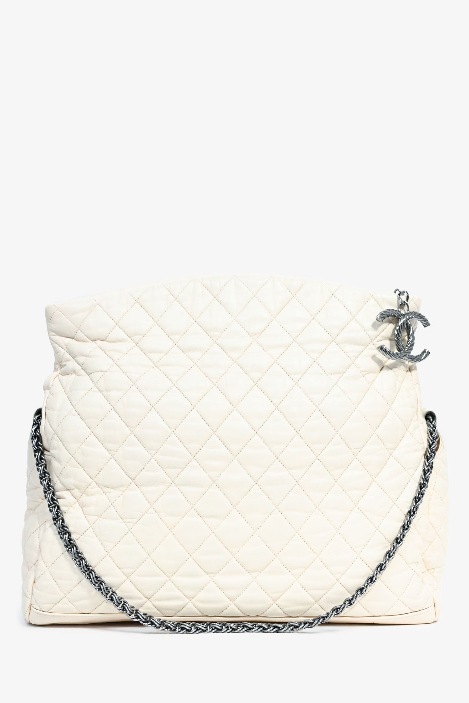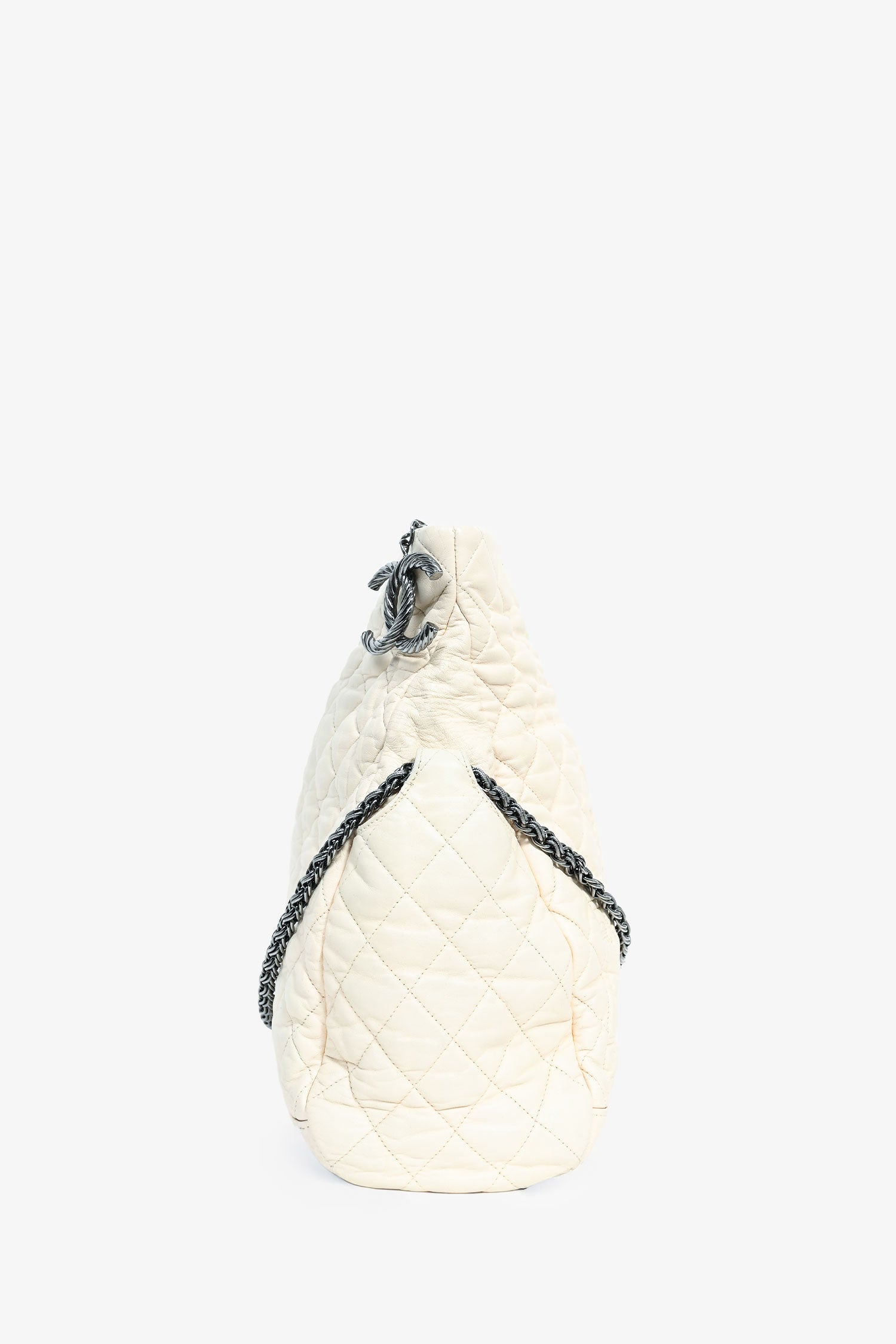 Pre-Loved Chanel™ 2008-09 White Lambskin Quilted Paris-Moscou Red Square Kremlin Tote. Dual handles. Side exterior slip pockets. Top zipper closure. Interior single compartment with two wall slip pockets and a wall zip pocket. Metalic textile lining. Gunmetal-tone hardware. Tonal stitching.