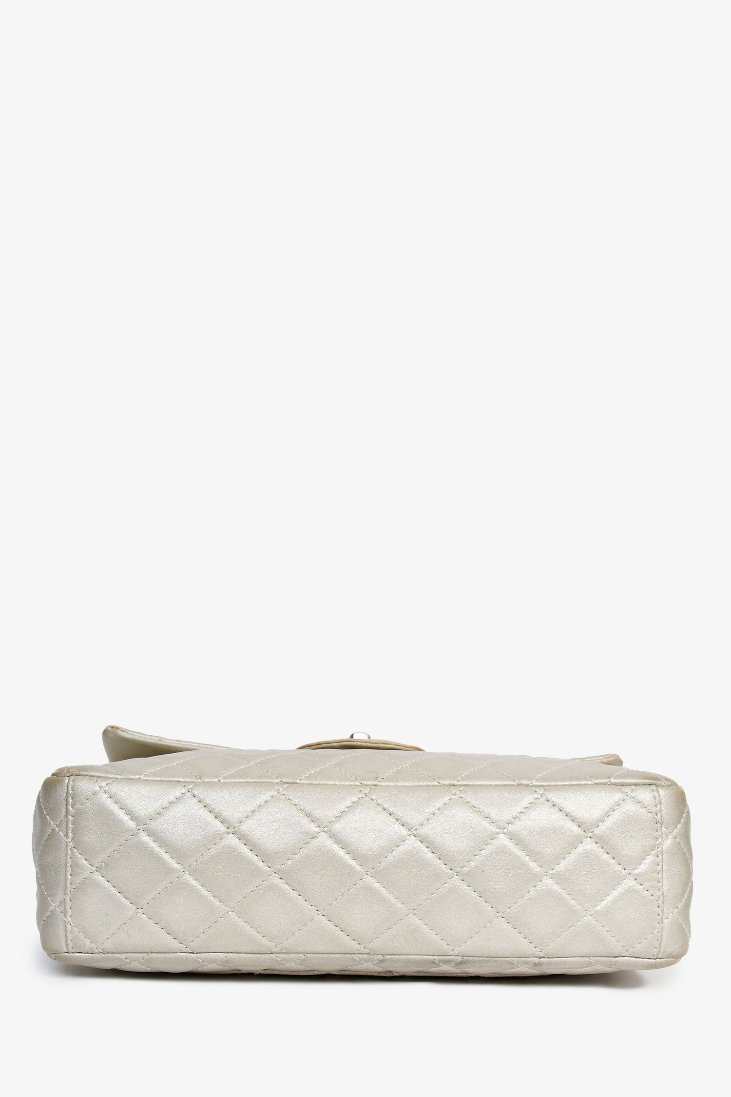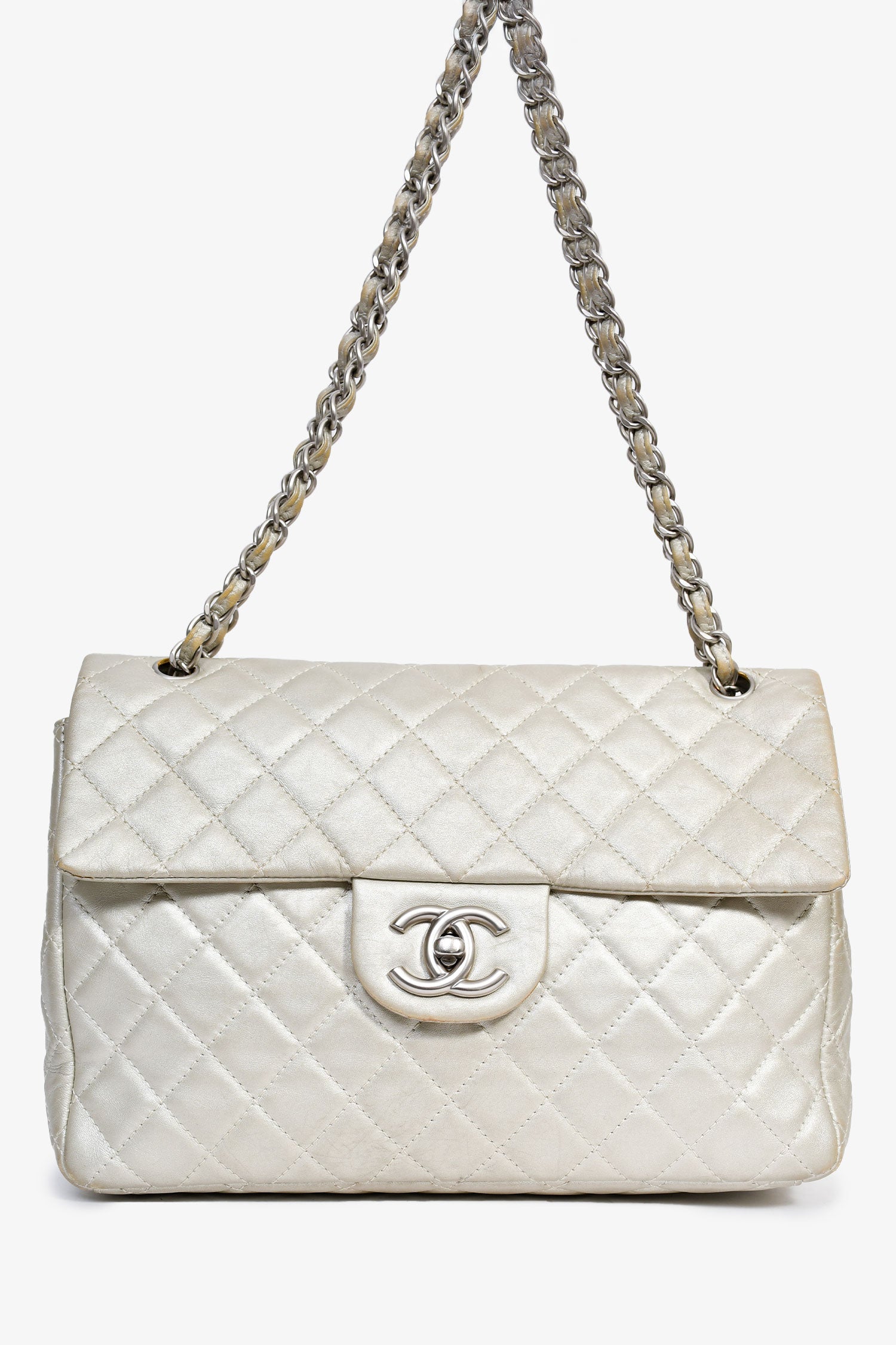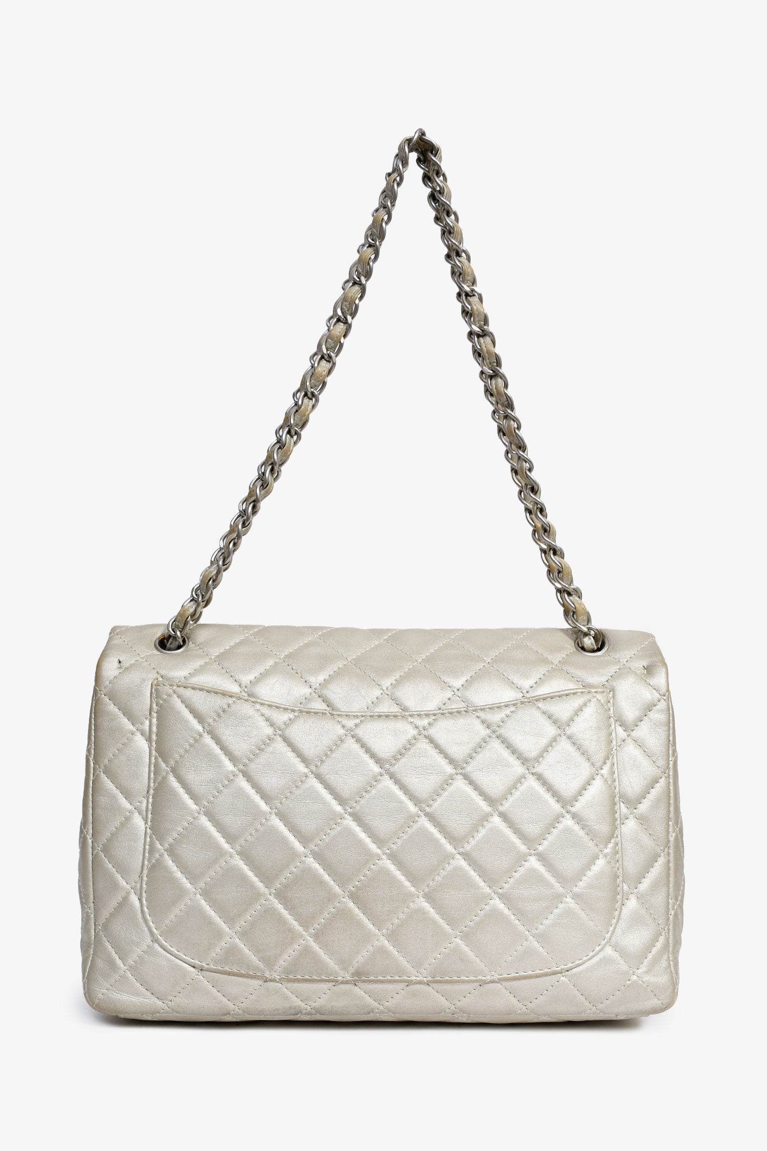 Refresh availabilityPre-Loved Chanel™ 2008/2009 Silver Leather Metallic Quilted Maxi Classic Bag. Front fold-over flap with turn-lock closure. Two interior wall pockets; one slip and one with zip closure. Silver-tone hardware. Slide-around chain strap. Outer rear exterior slip pocket.
