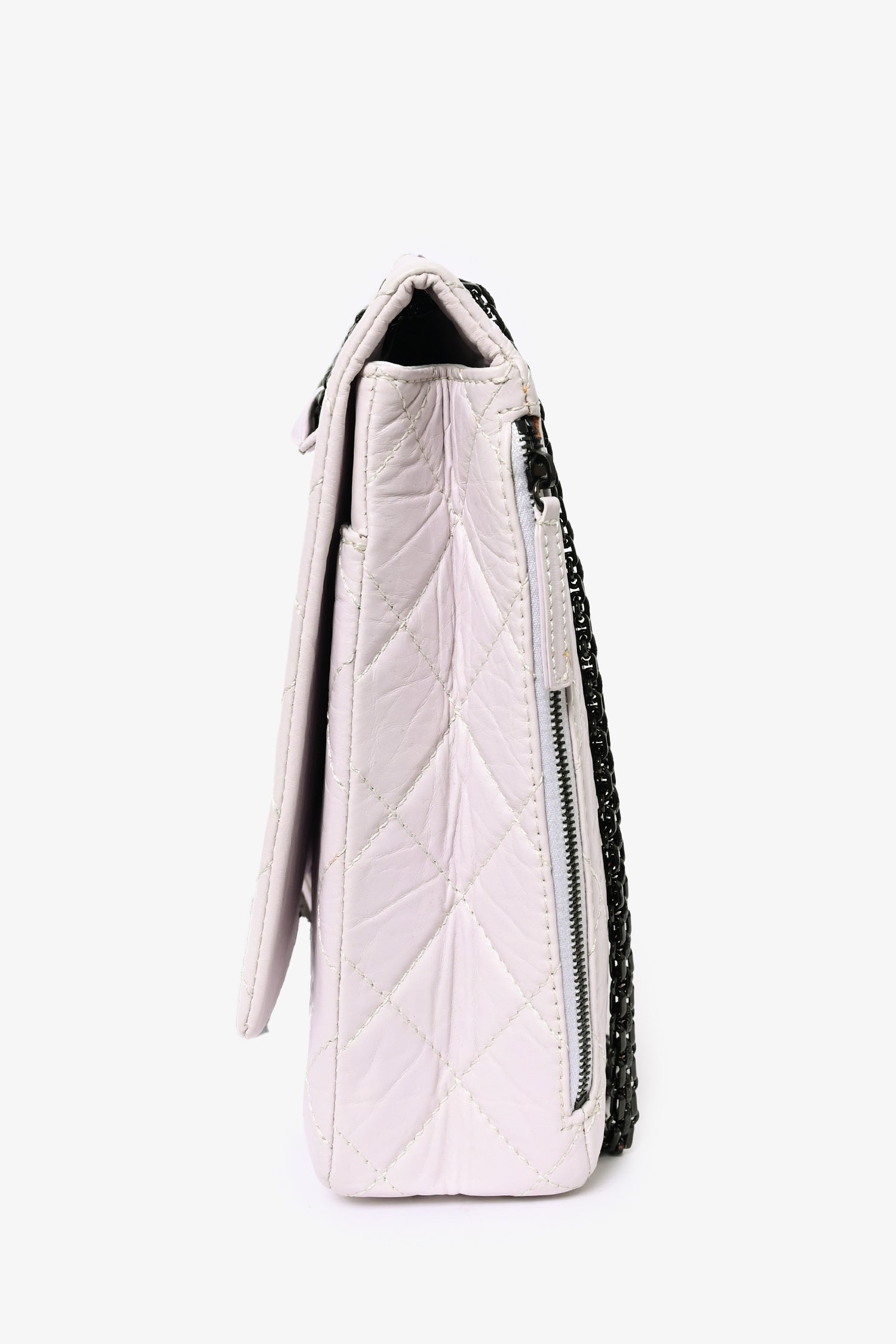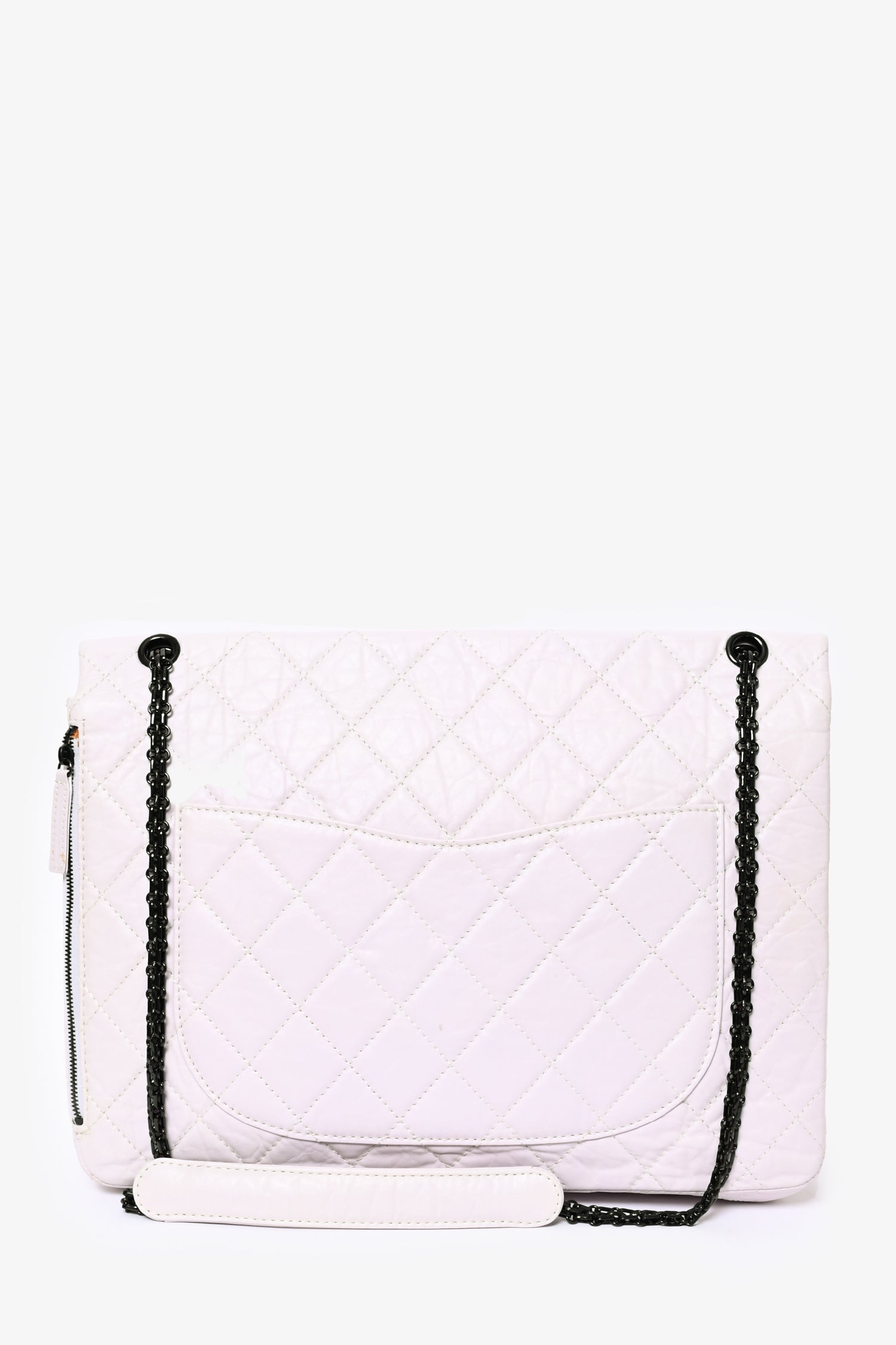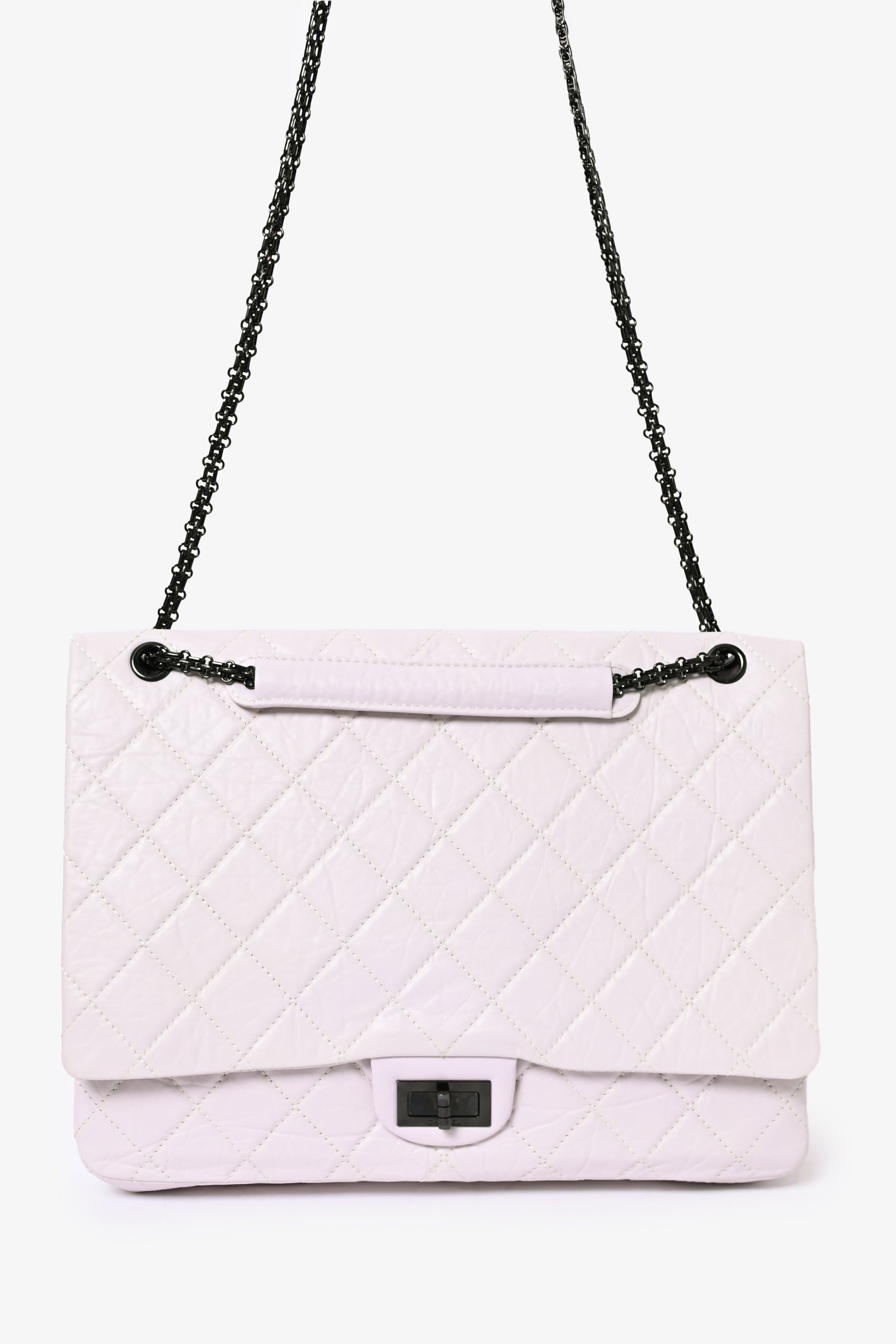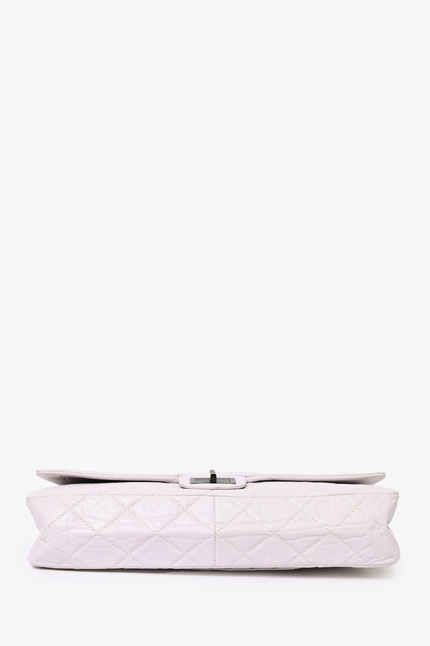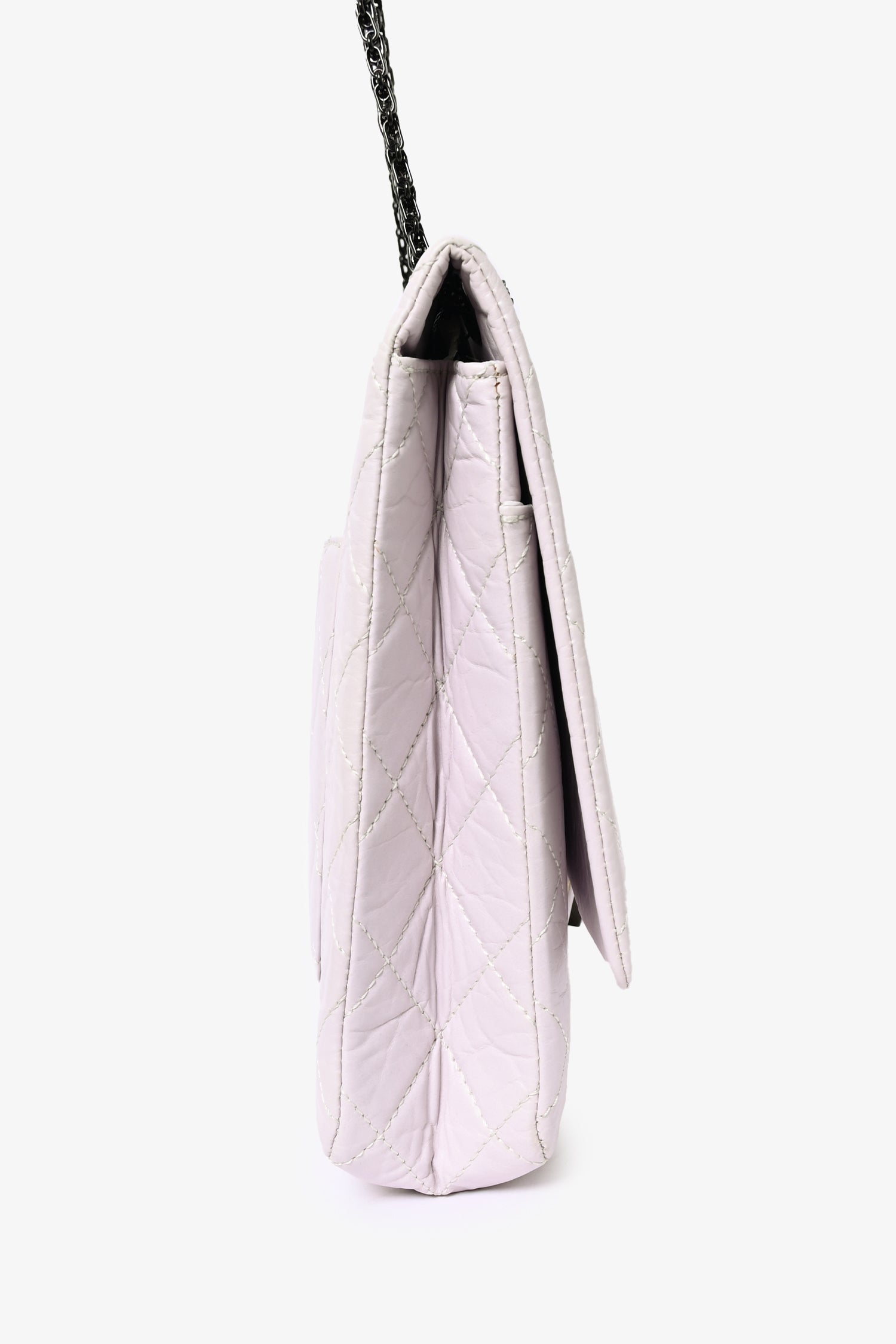 Pre-Loved Chanel™ 2008/9 Grey Leather Quilted 2.55 Reissue XL Bag. Turn-lock closure. Antiqued hardware. Tonal stitching. Chain-link shoulder strap with leather accent. 2 interior compartments. Exterior pocket. Interior wall zipper. Dual interior pockets.