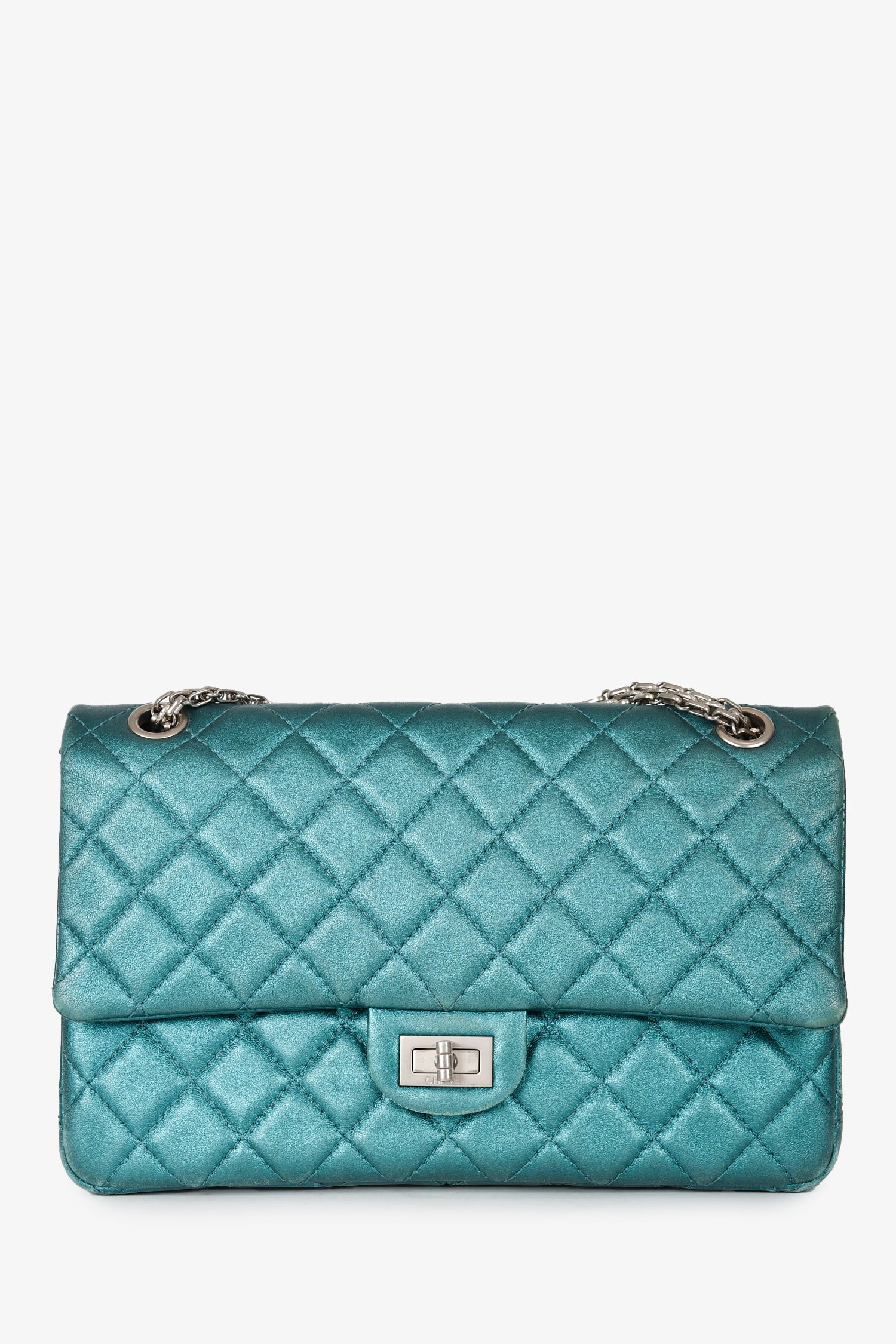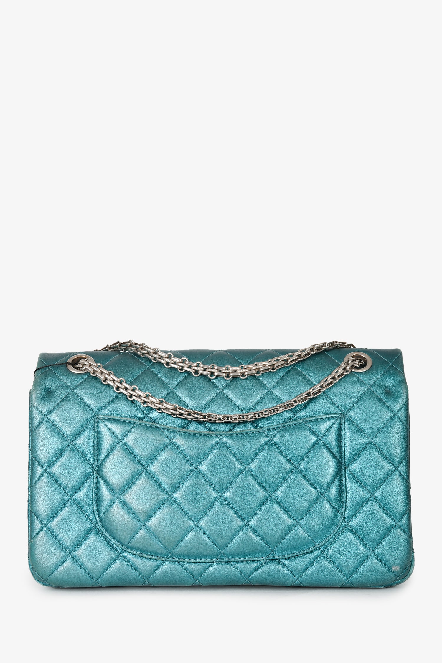Refresh availabilityPre-Loved Chanel™ 2008/9 Teal Metallic Quilted Leather 2.55 Reissue 226 Double Flap Bag. Front flap with turn lock closure. Back flap with button closure. 3 open interior compartments. 2 interior wall slip pockets. Silver-toned hardware. Tonal stitching.
