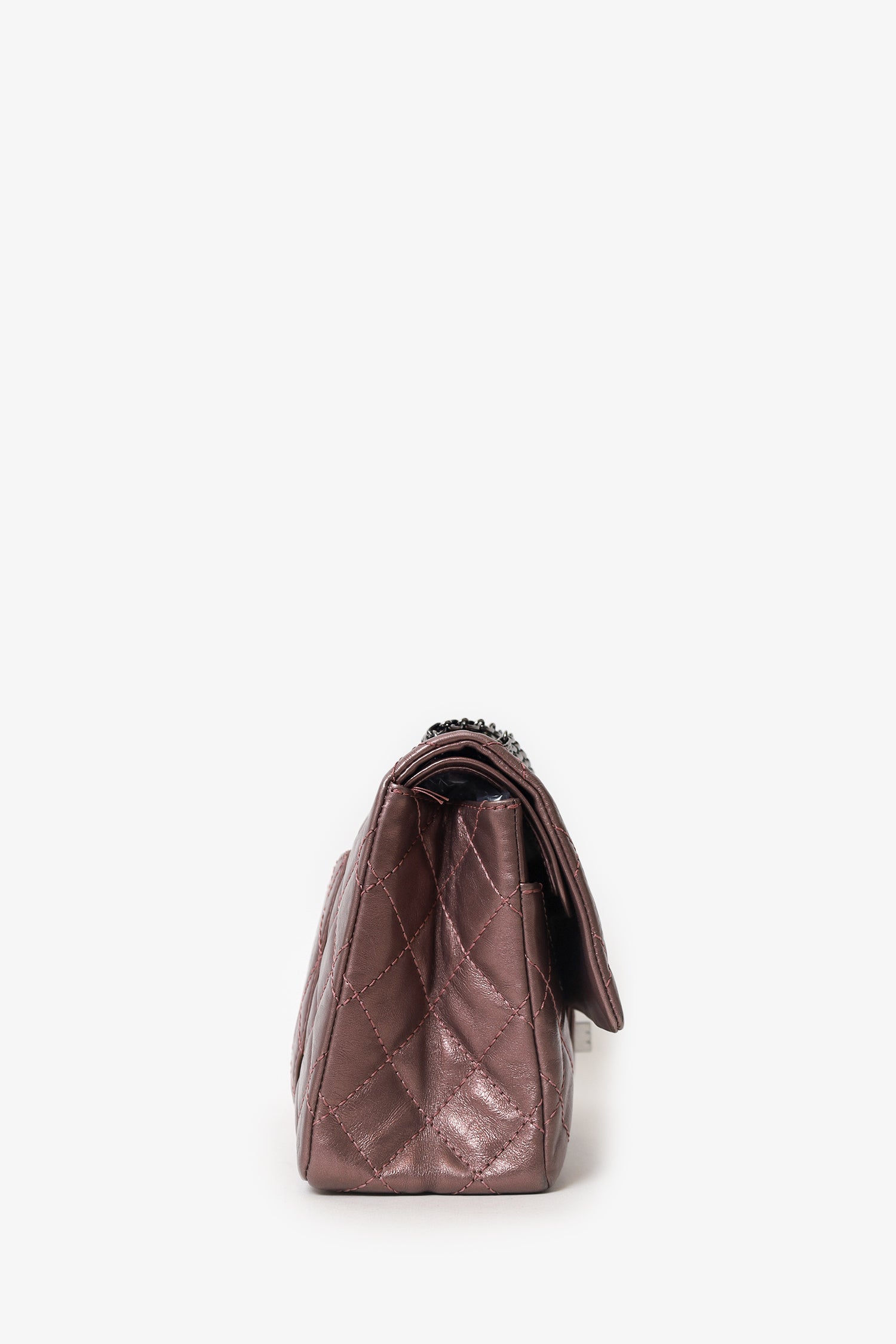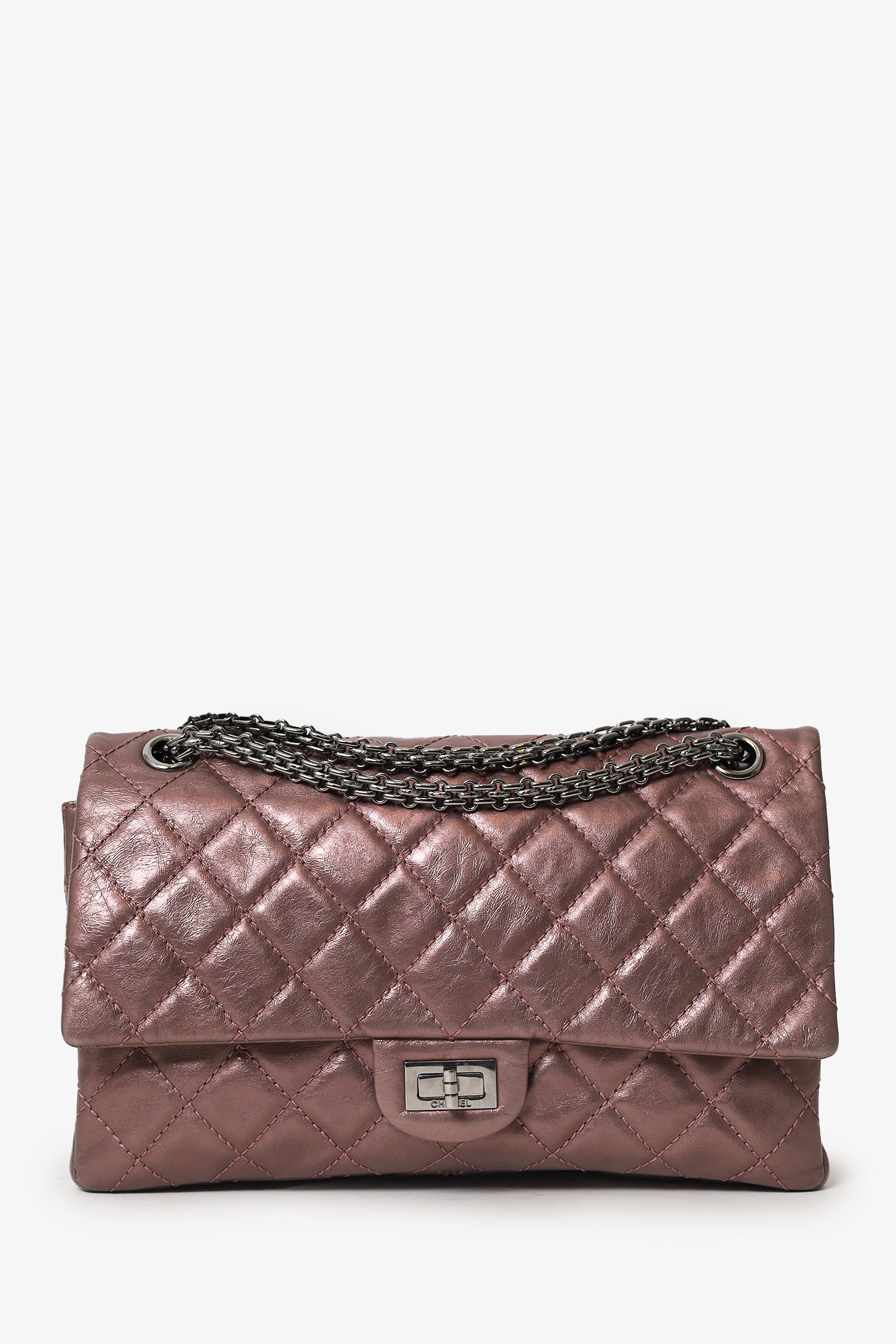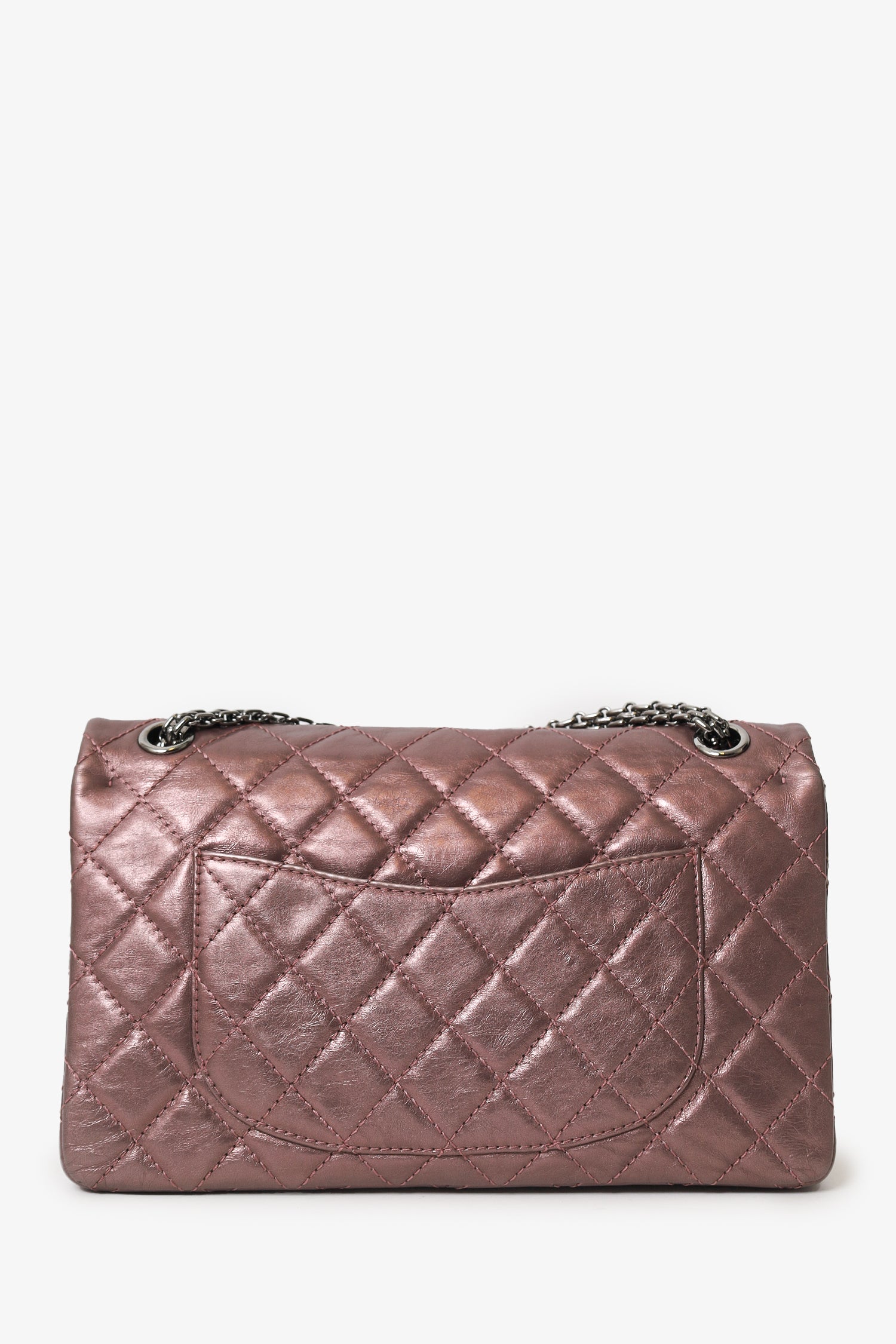 Pre-Loved Chanel™ 2008-09 Brown Metallic Aged Calfskin Quilted 2.55 Reissue Shoulder Bag. Front fold-over flap with turn-lock closure. Chainlink shoulder strap. Rear slip pocket. Interior snap button-up compartment with 7 pockets; 5 slip, 1 lipstick, and 1 zip. Palladium-tone hardware. Tonal stitching.