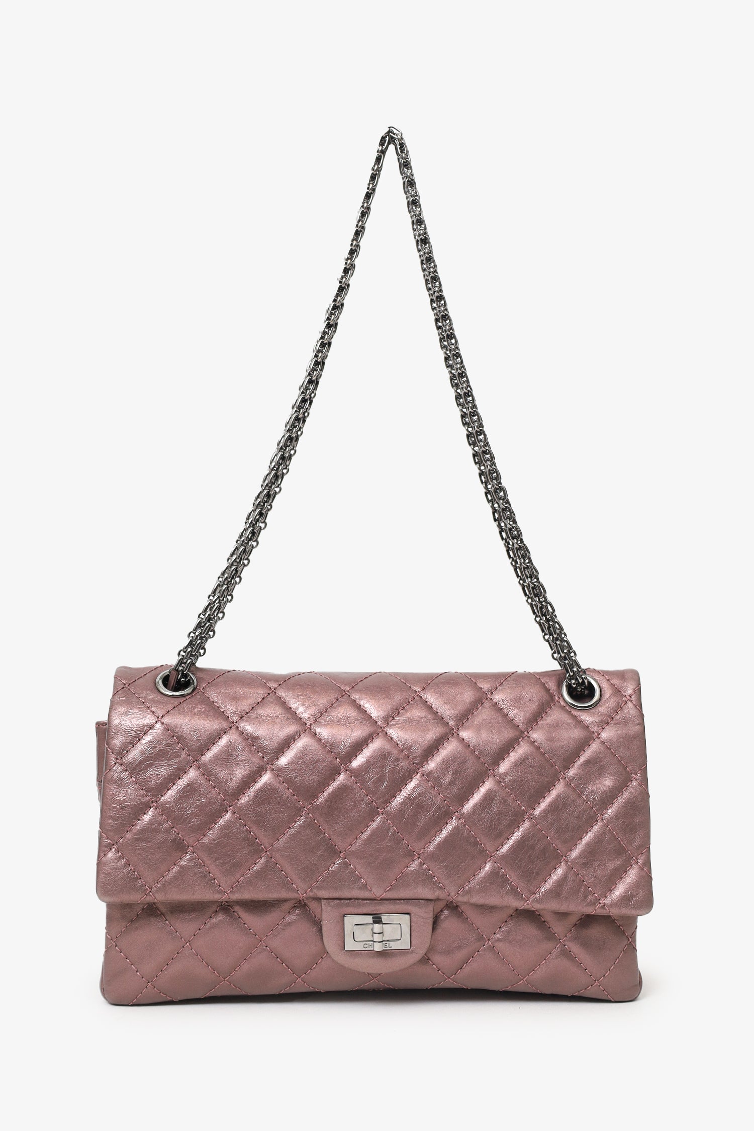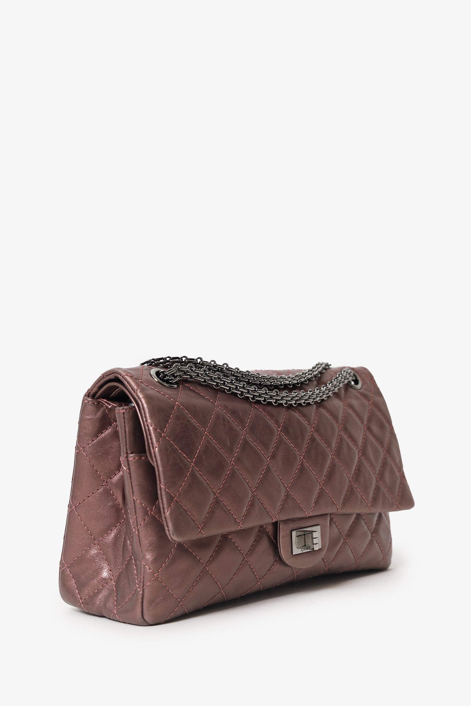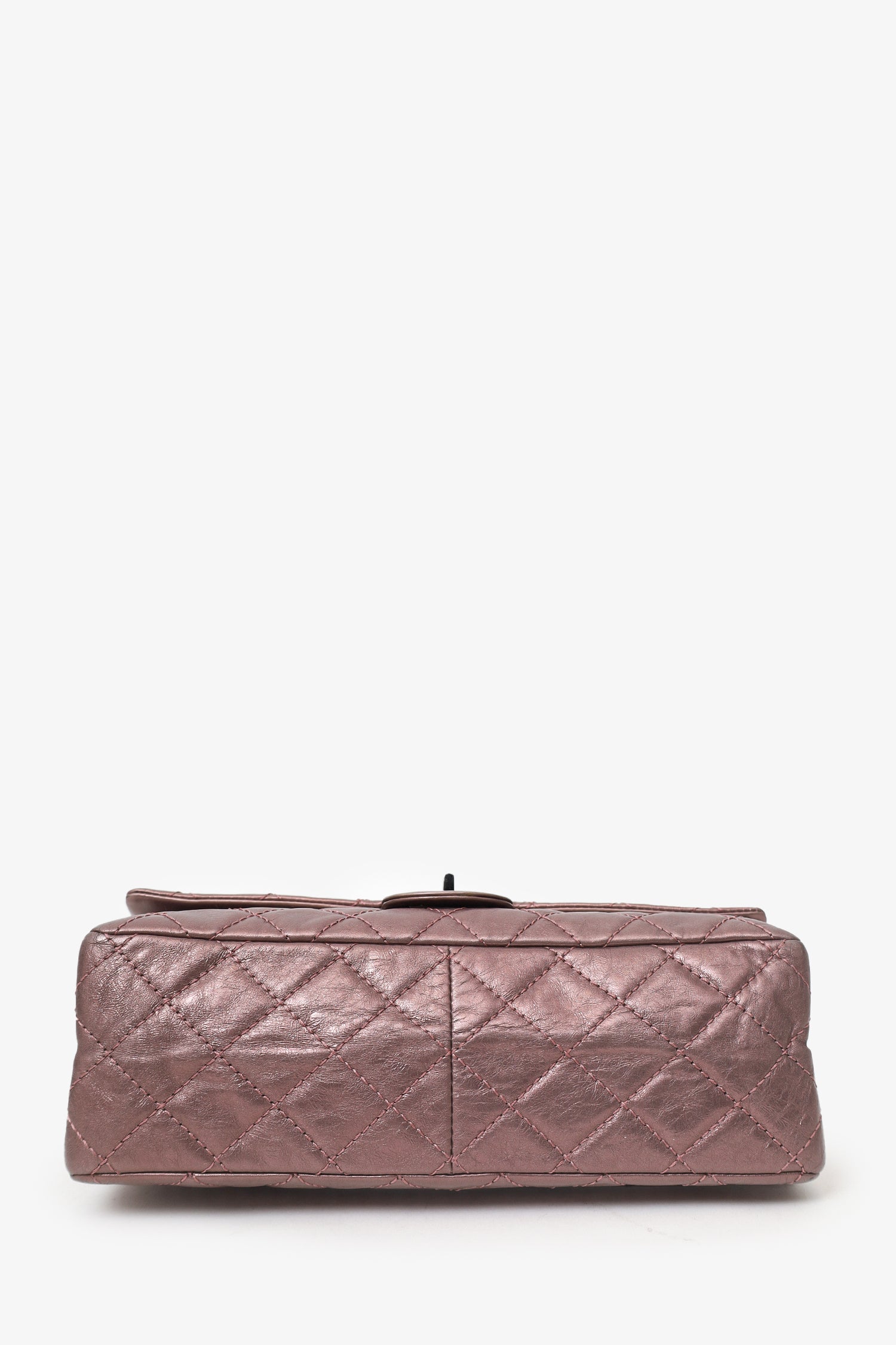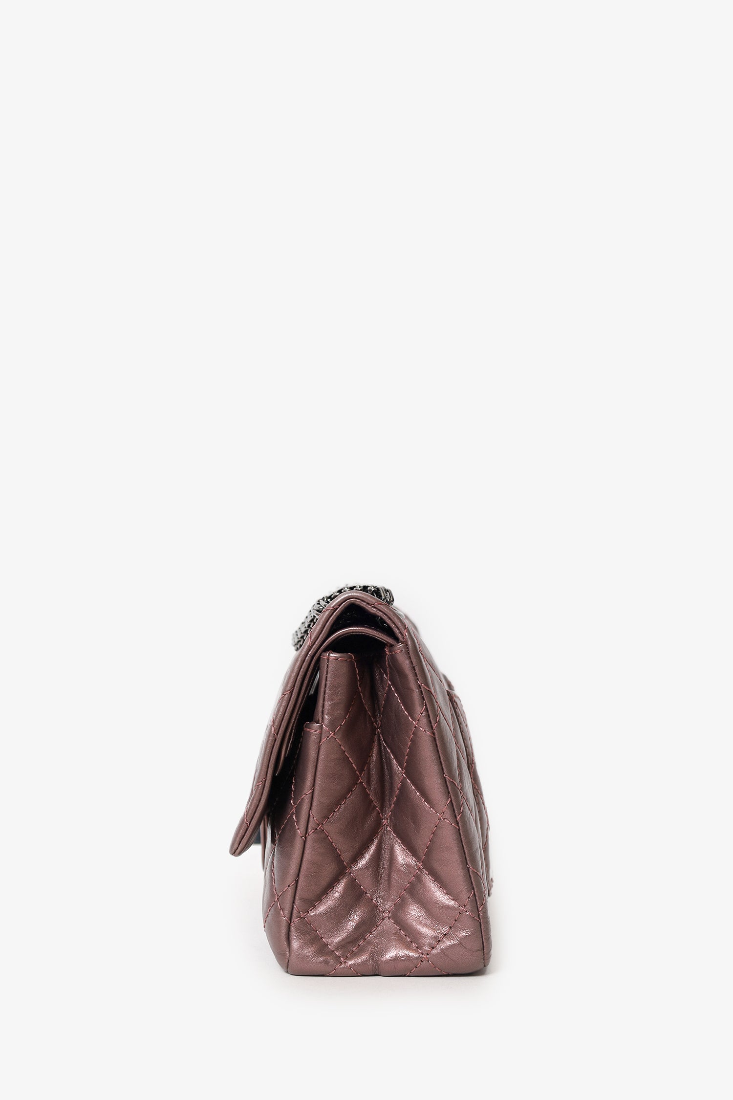 Pre-Loved Chanel™ 2008-09 Brown Metallic Aged Calfskin Quilted 2.55 Reissue Shoulder Bag. Front fold-over flap with turn-lock closure. Chainlink shoulder strap. Rear slip pocket. Interior snap button-up compartment with 7 pockets; 5 slip, 1 lipstick, and 1 zip. Palladium-tone hardware. Tonal stitching.