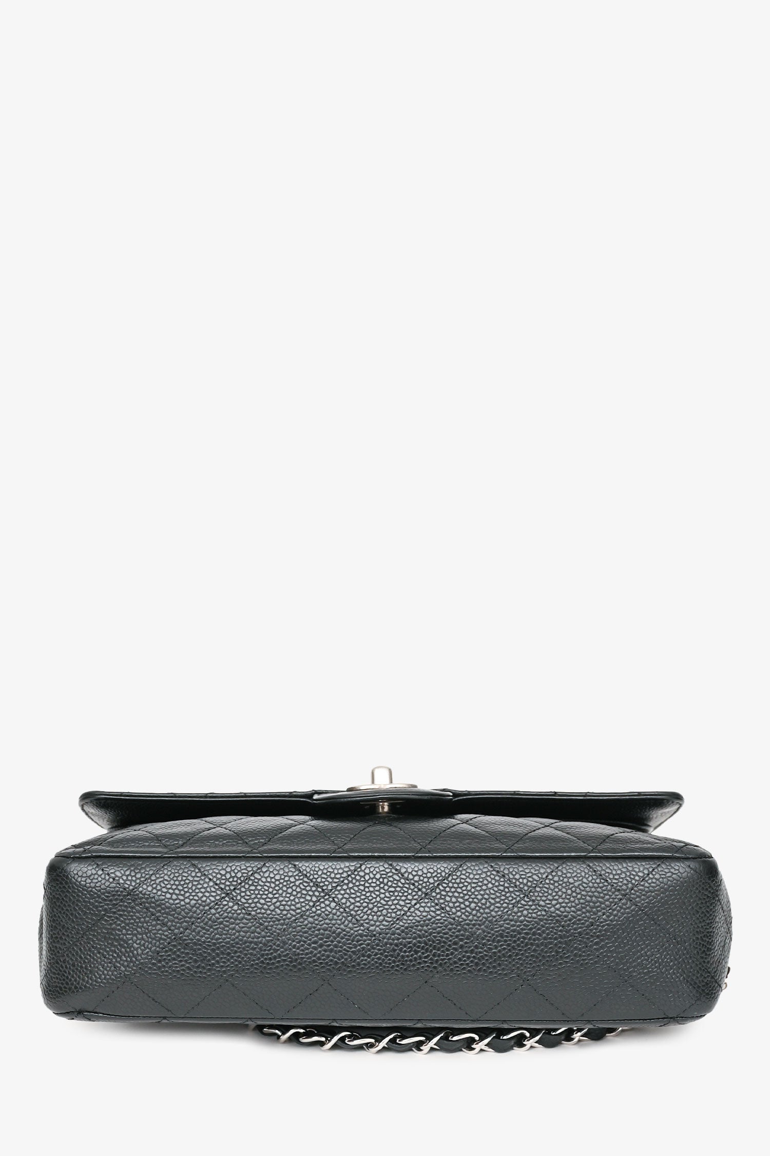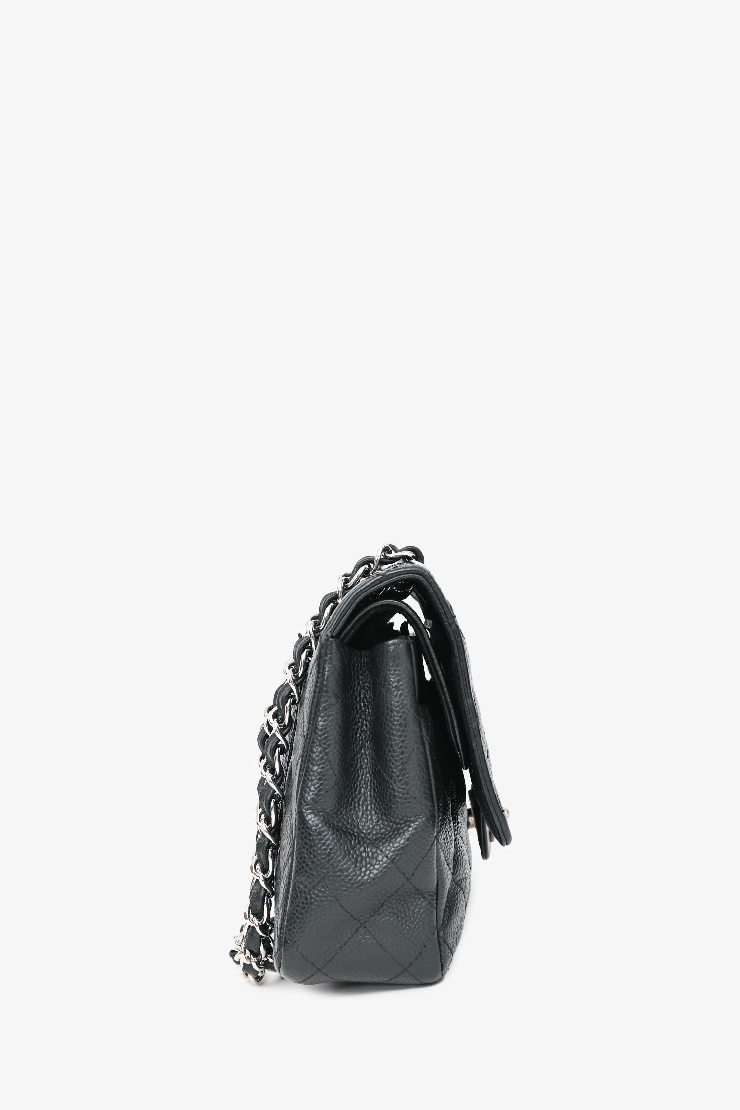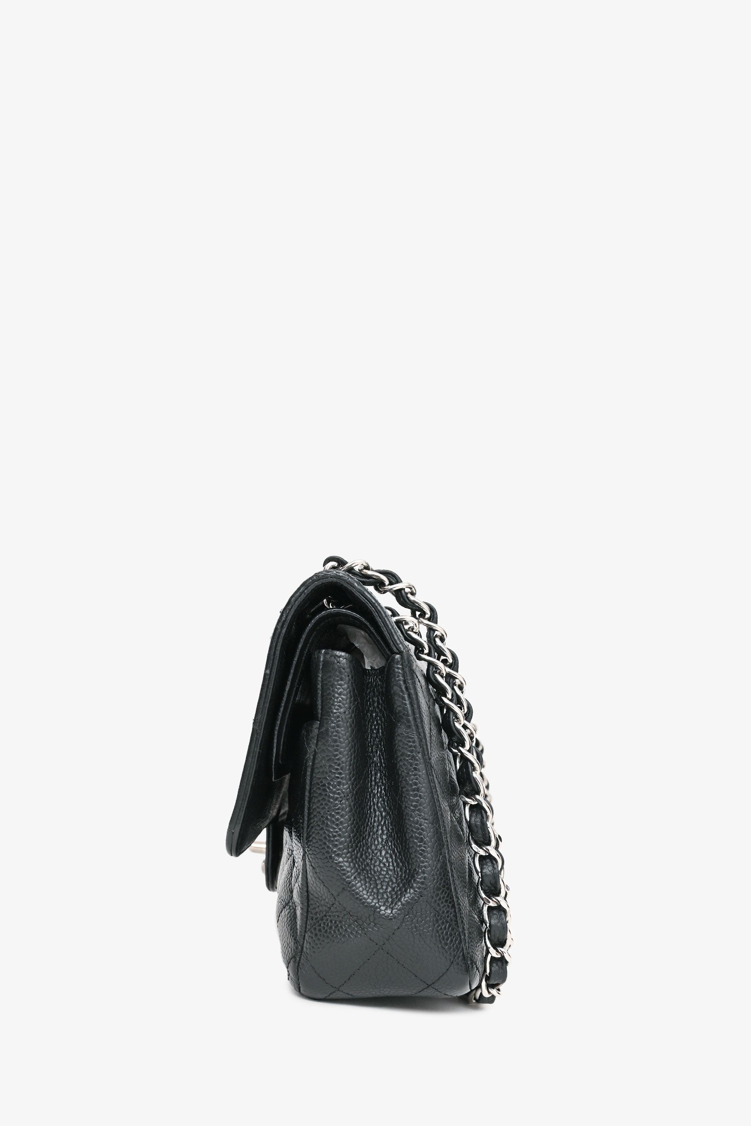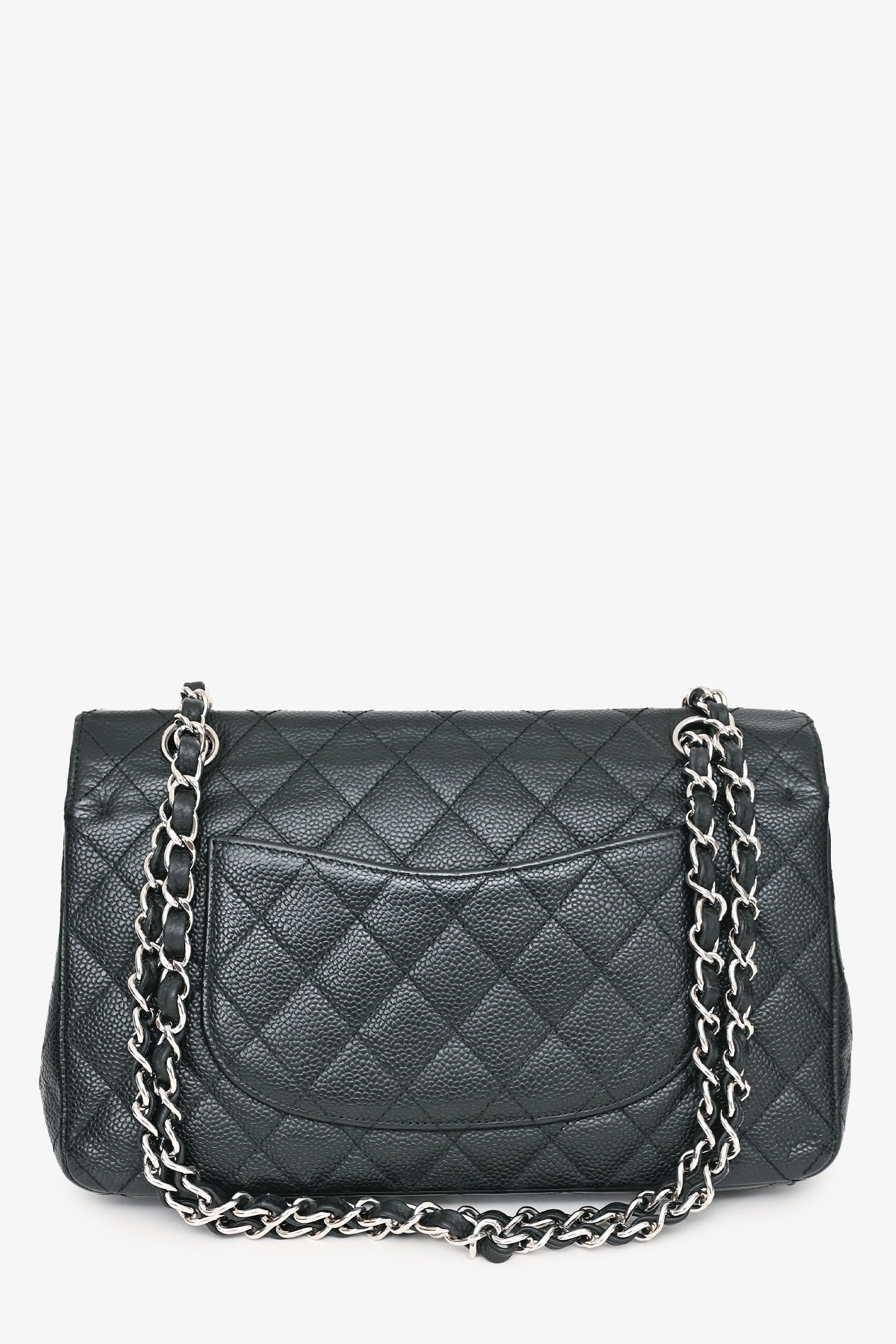 Refresh availabilityPre-Loved Chanel™ 2009-10 Black Caviar Leather Medium Double Flap. Fold-over flap with a turn-lock closure. Silver-tone hardware. Concealed folding flap. 2 interior compartments with 2 pockets. Chain-link shoulder strap. Tonal stitching.