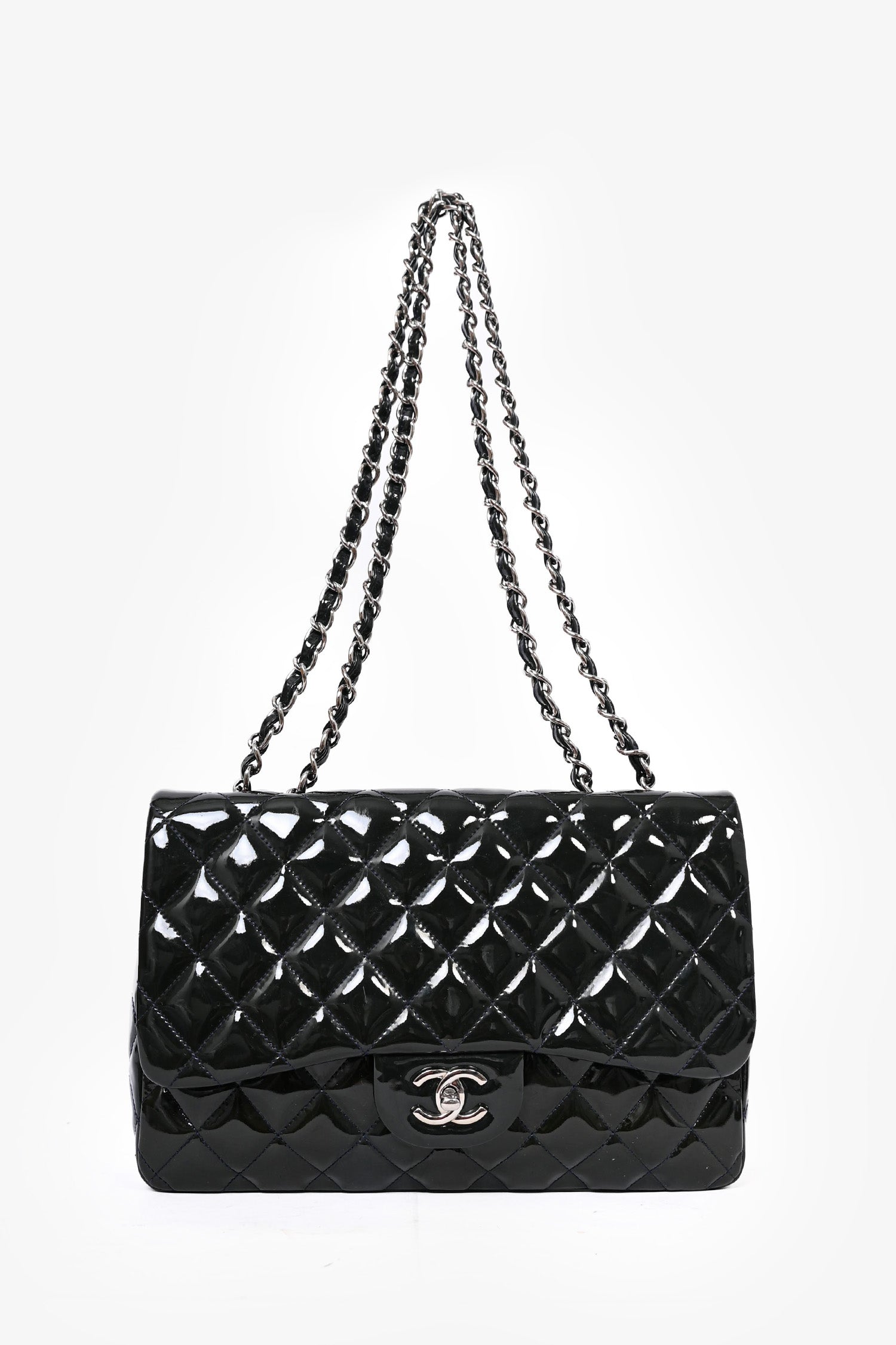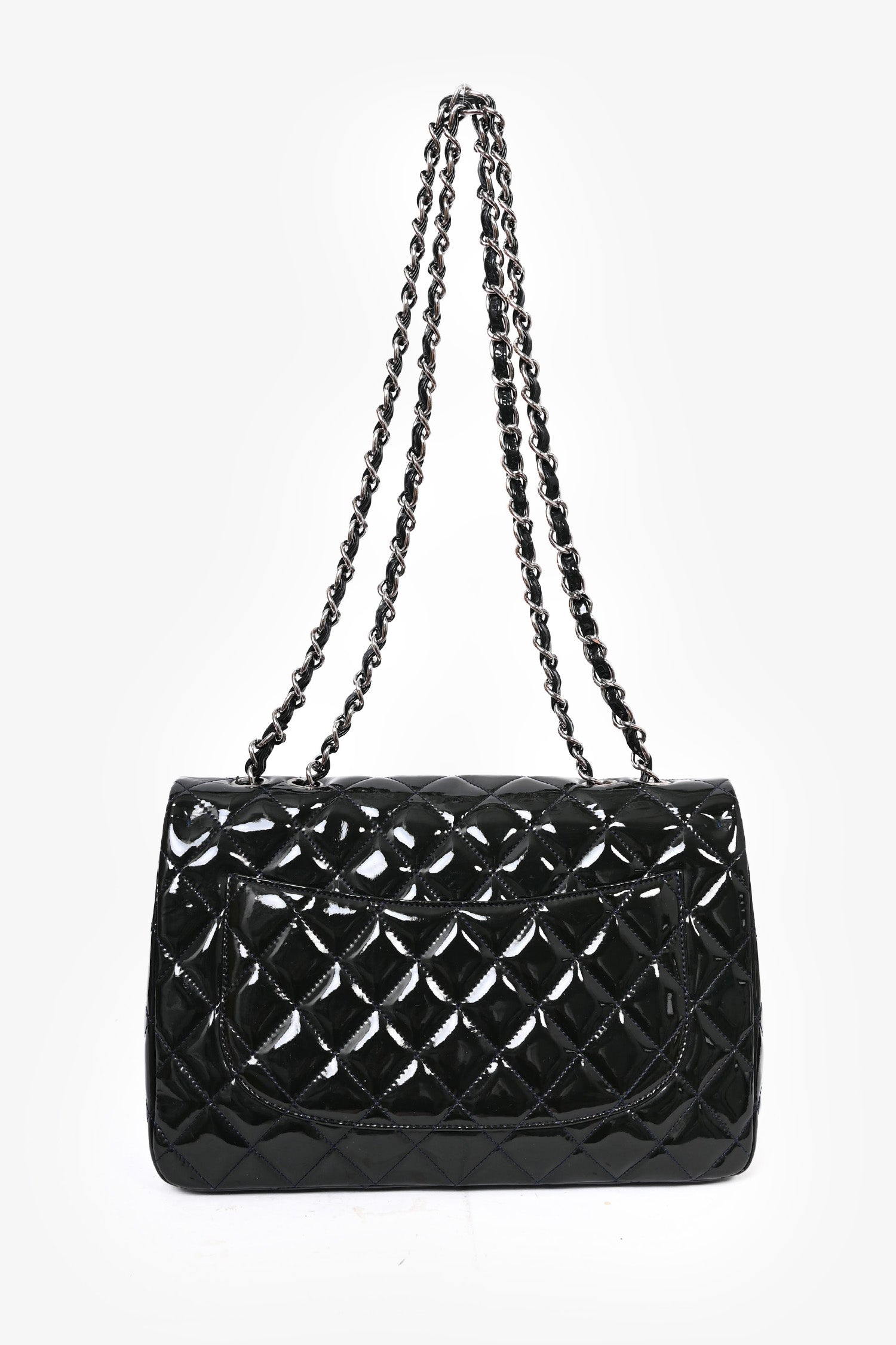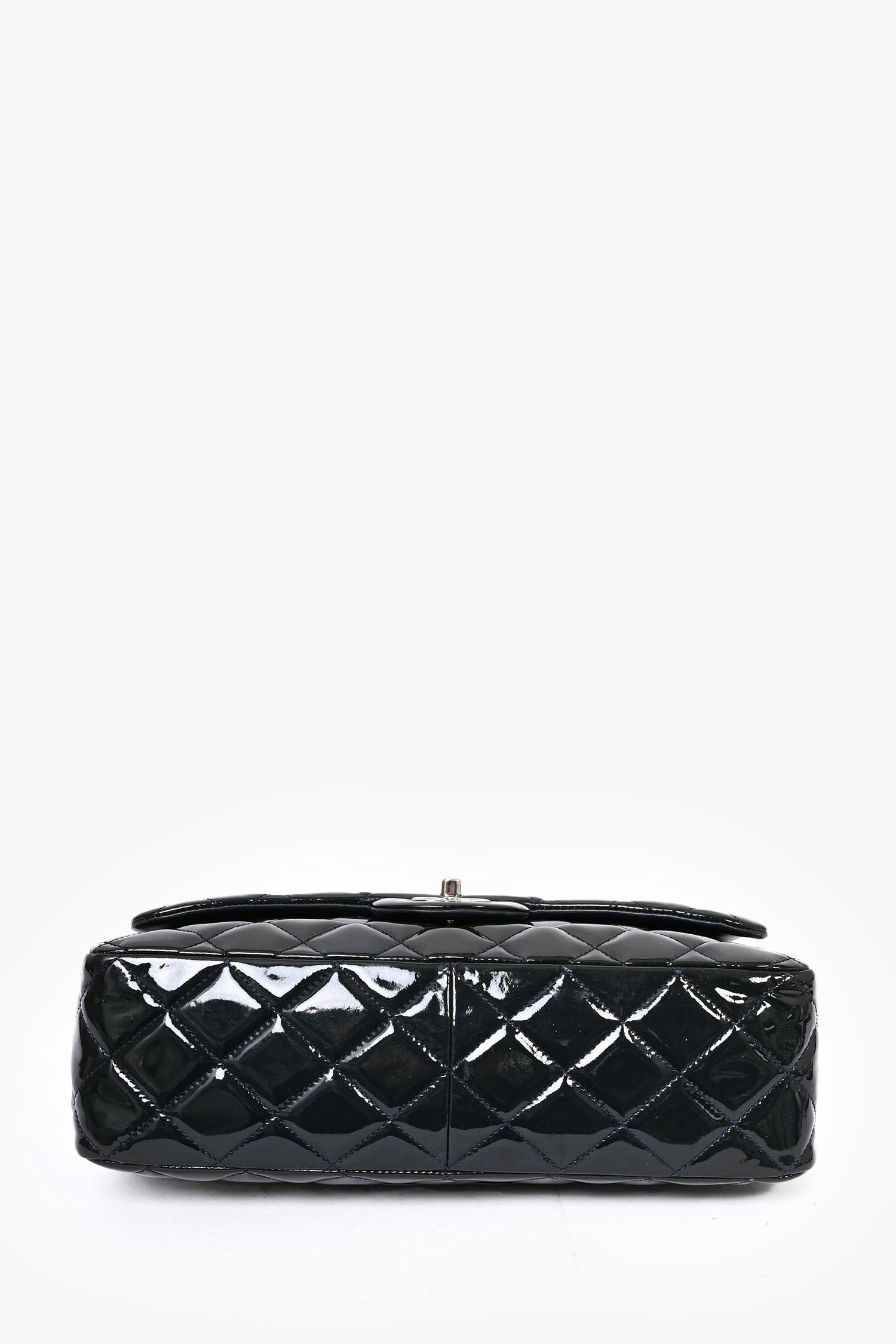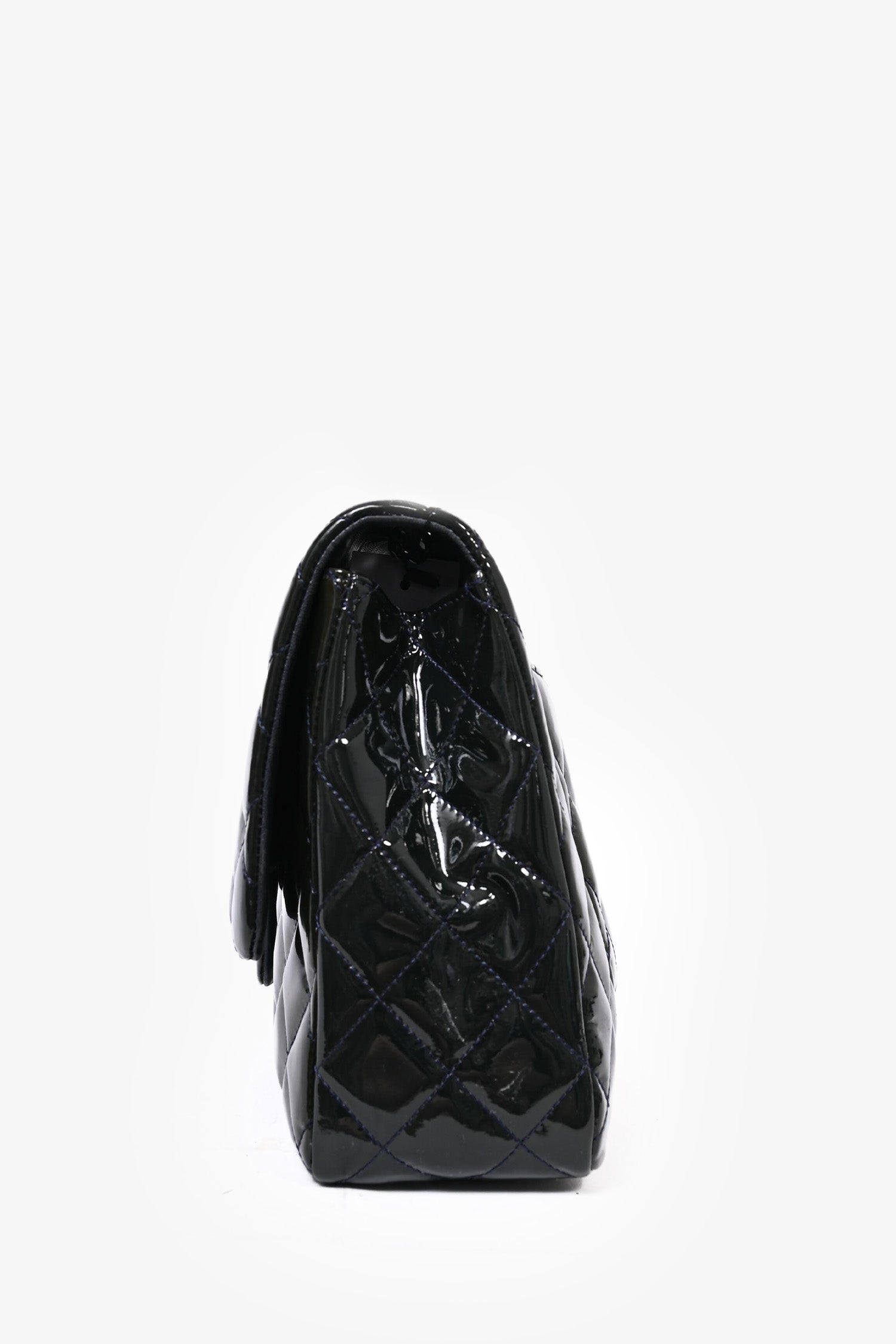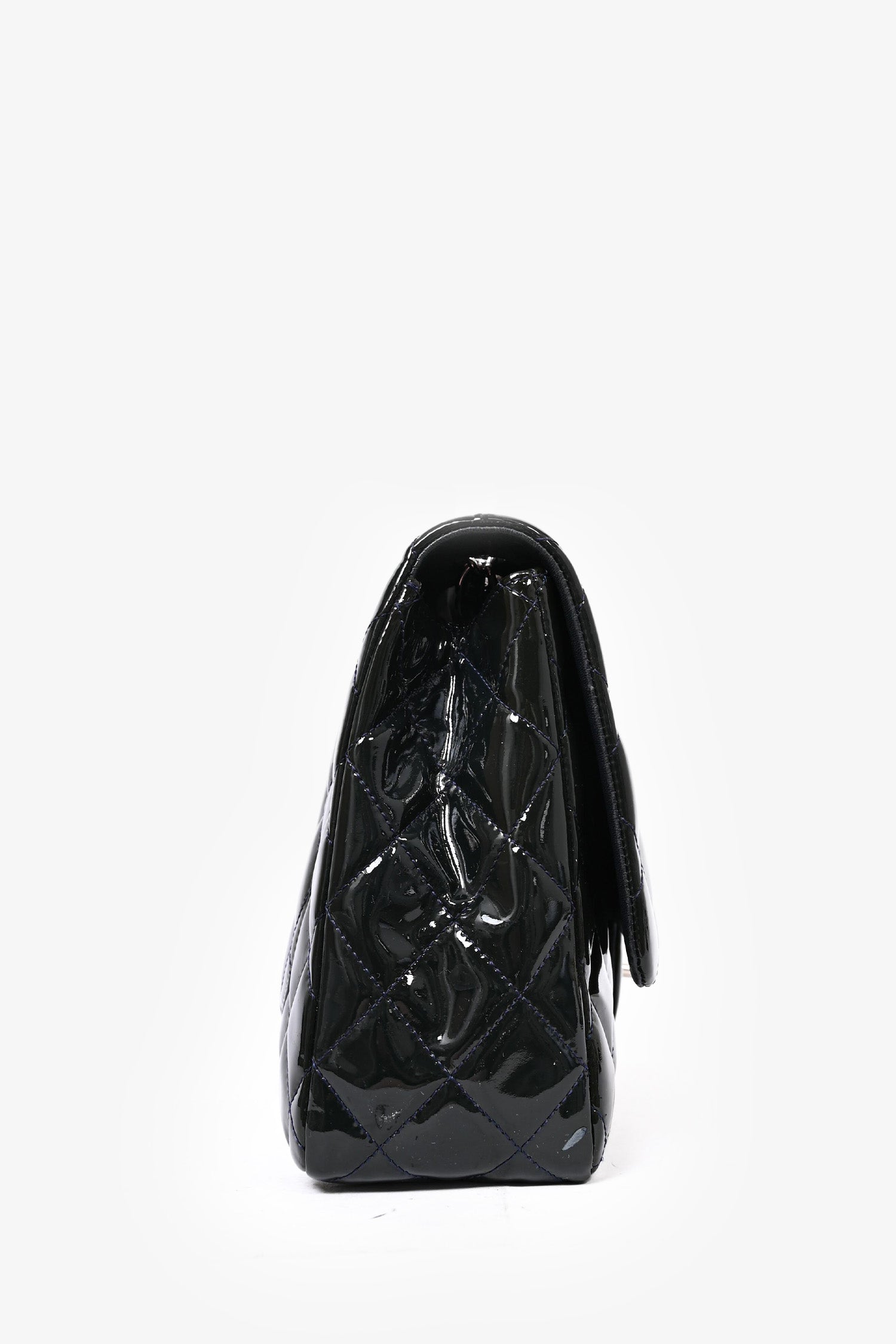 Pre-Loved Chanel™ 2009/10 Green Quilted Patent Blue Stitched Jumbo Single Flap Shoulder Bag. Tonal stitching. Interlocking 'CC' turn-lock closure. Silver-toned hardware. Interior compartment. Interior zipped compartment.