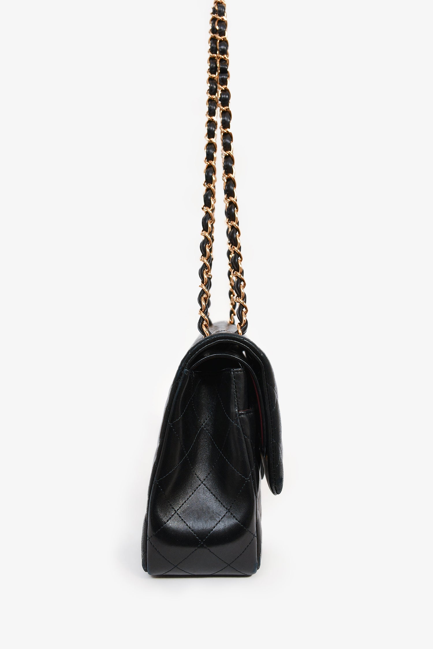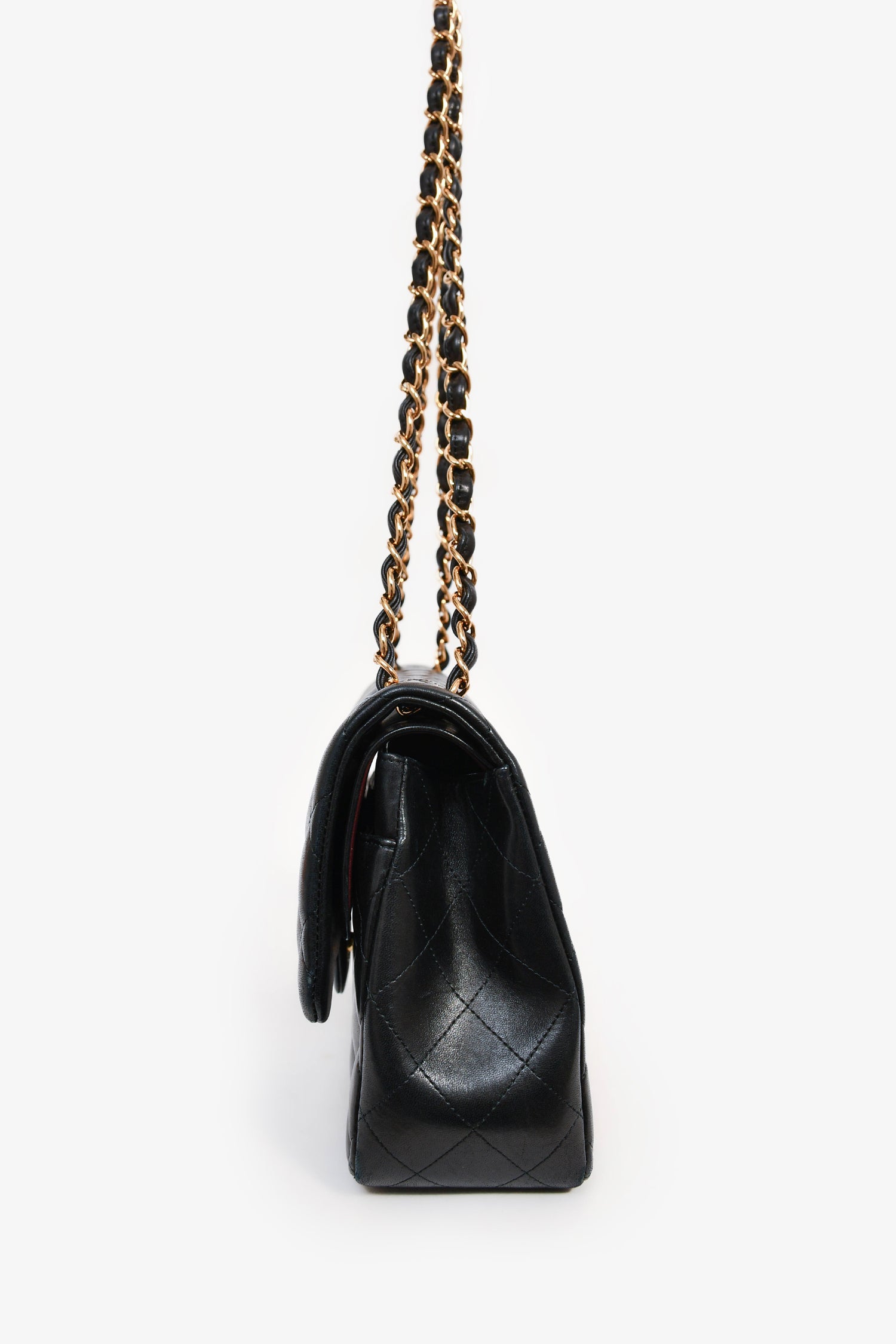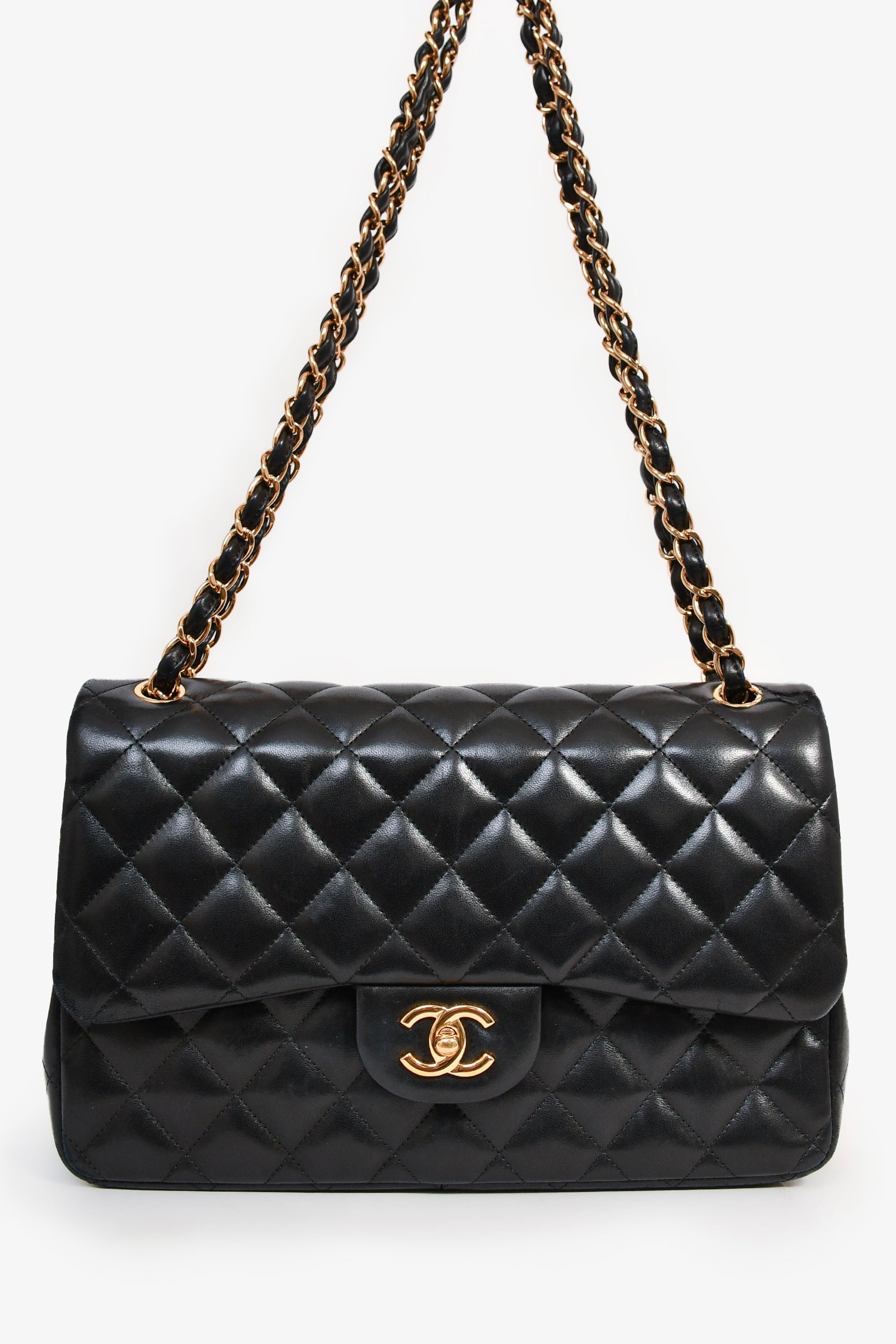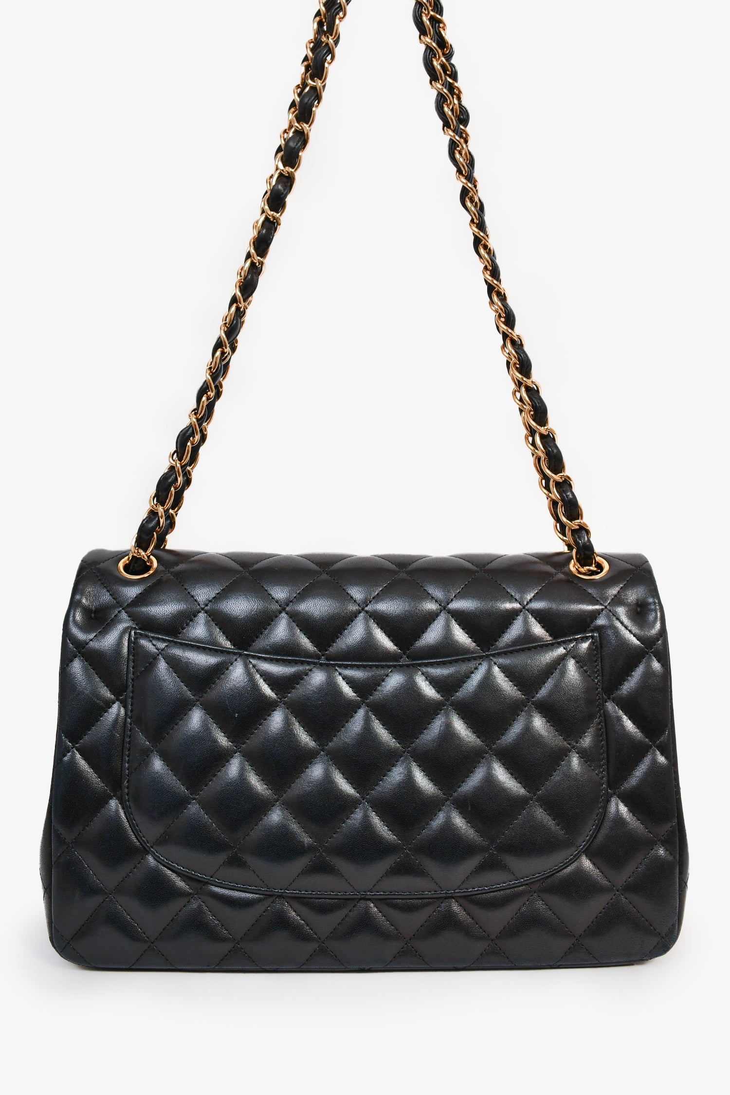 Refresh availabilityPre-Loved Chanel™ 2010-11 Black Lambskin Jumbo Double Flap. Gold hardware. Fold-over flap with a turn-lock closure. Chain-link and leather shoulder strap. Concealed flap in the interior. 2 compartments. 2 interior pockets. Single exterior slip compartment. Tonal stitching.