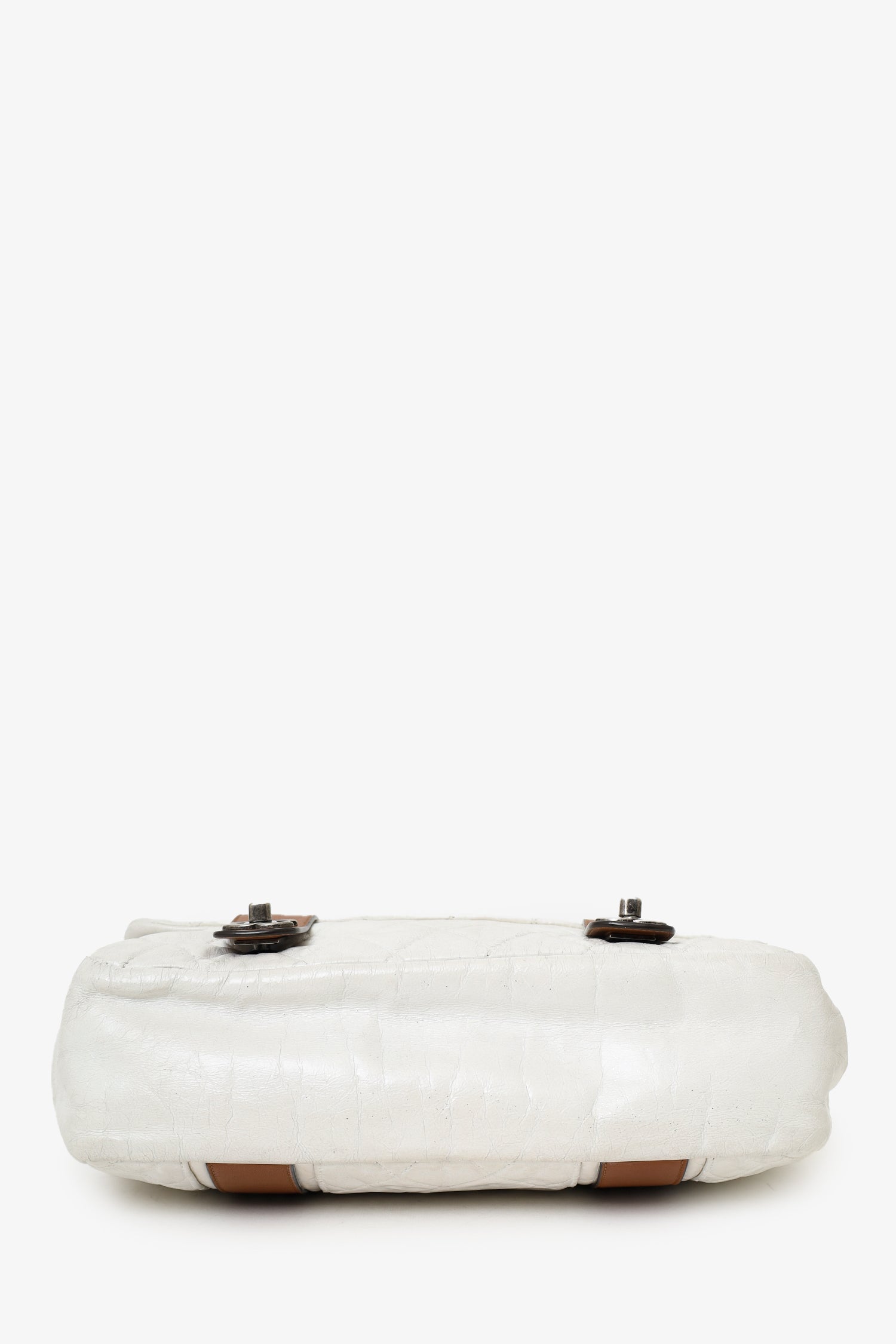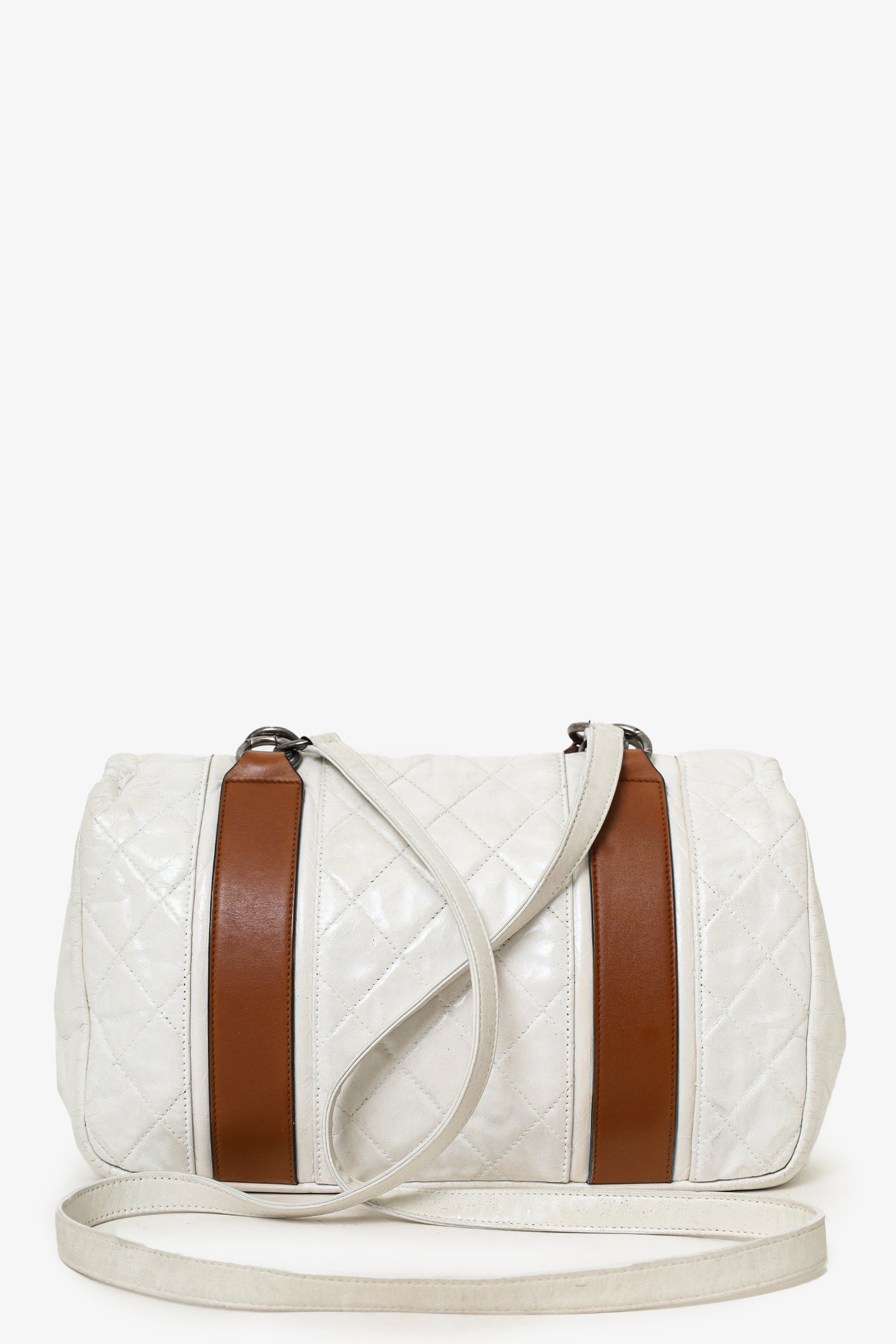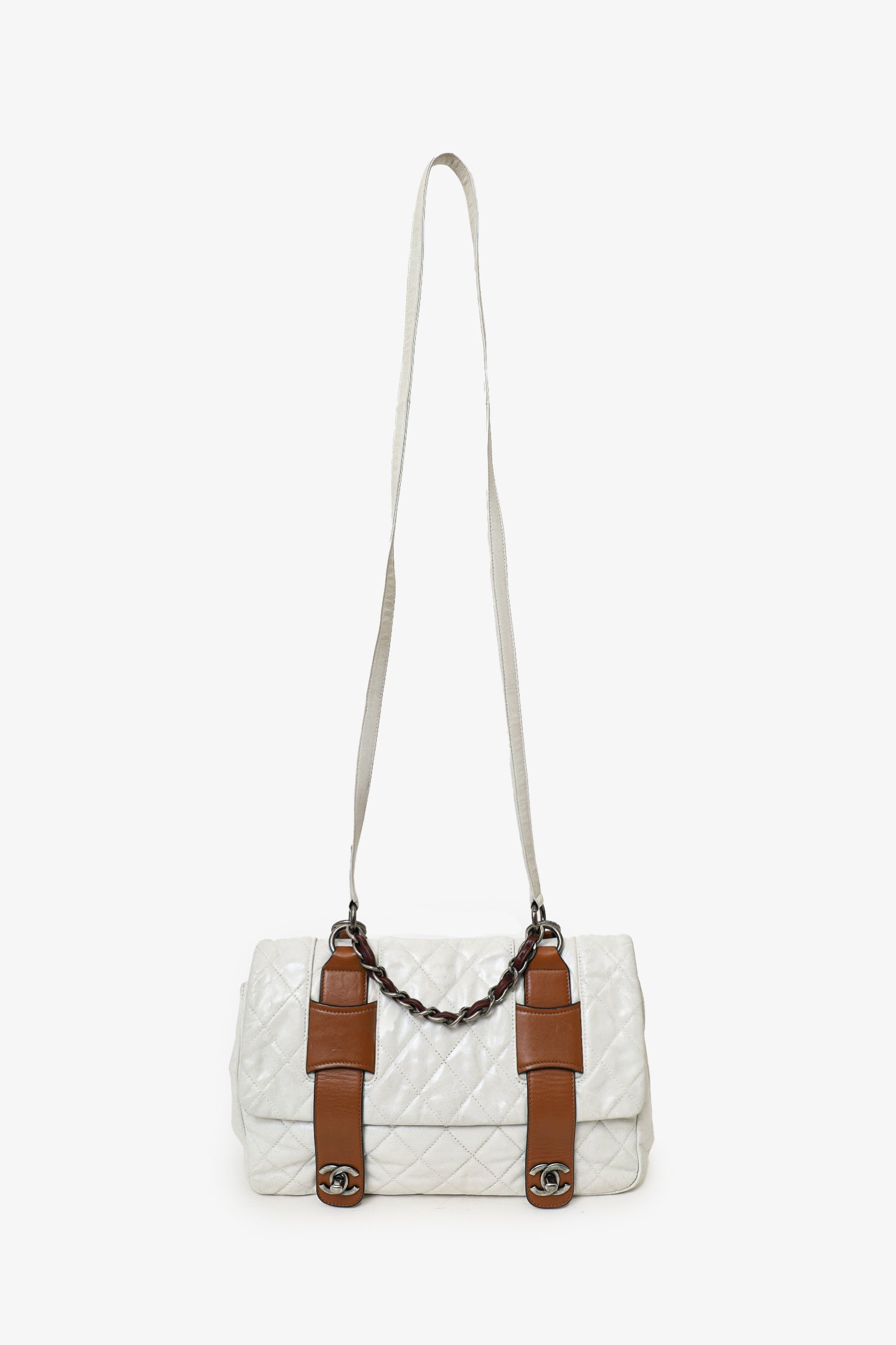 Refresh availabilityPre-Loved Chanel™ 2010-11 White/Brown Quilted Calfskin In the Mix Messenger Bag. Front fold-over flap with double turn-lock closure. 2 attached straps; chainlink handle and leather strap. Glitter-finish. Canvas-lined interior. Single interior zip pocket. Palladium-tone hardware. Tonal stitching.