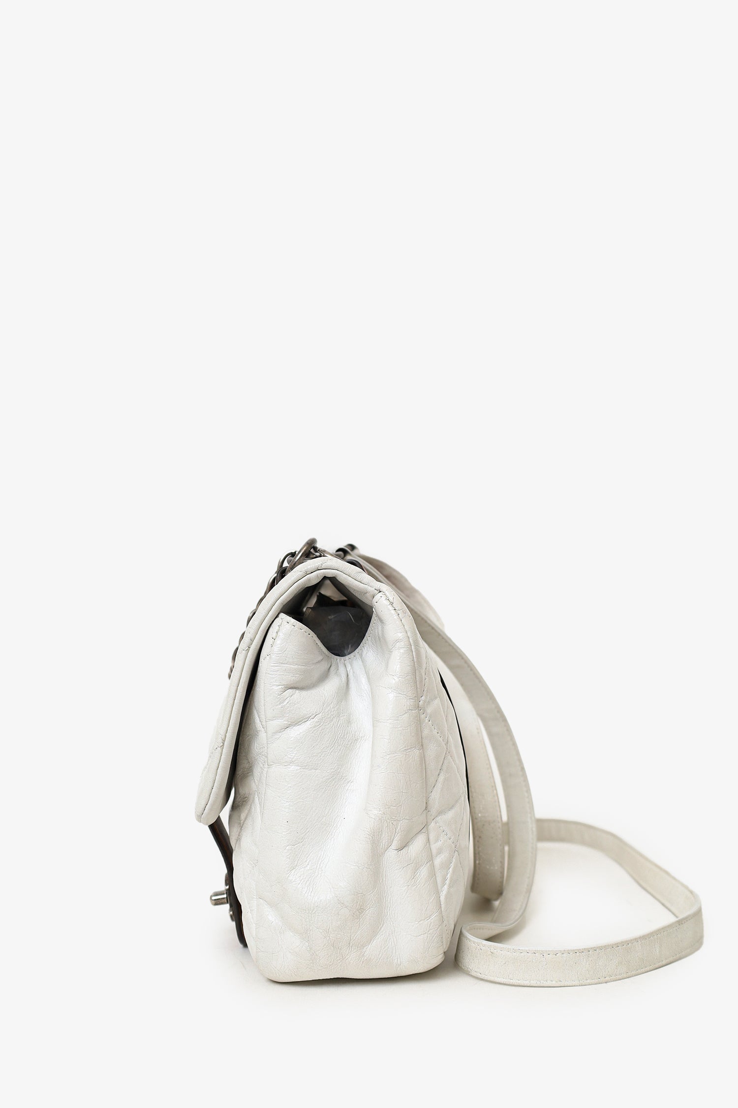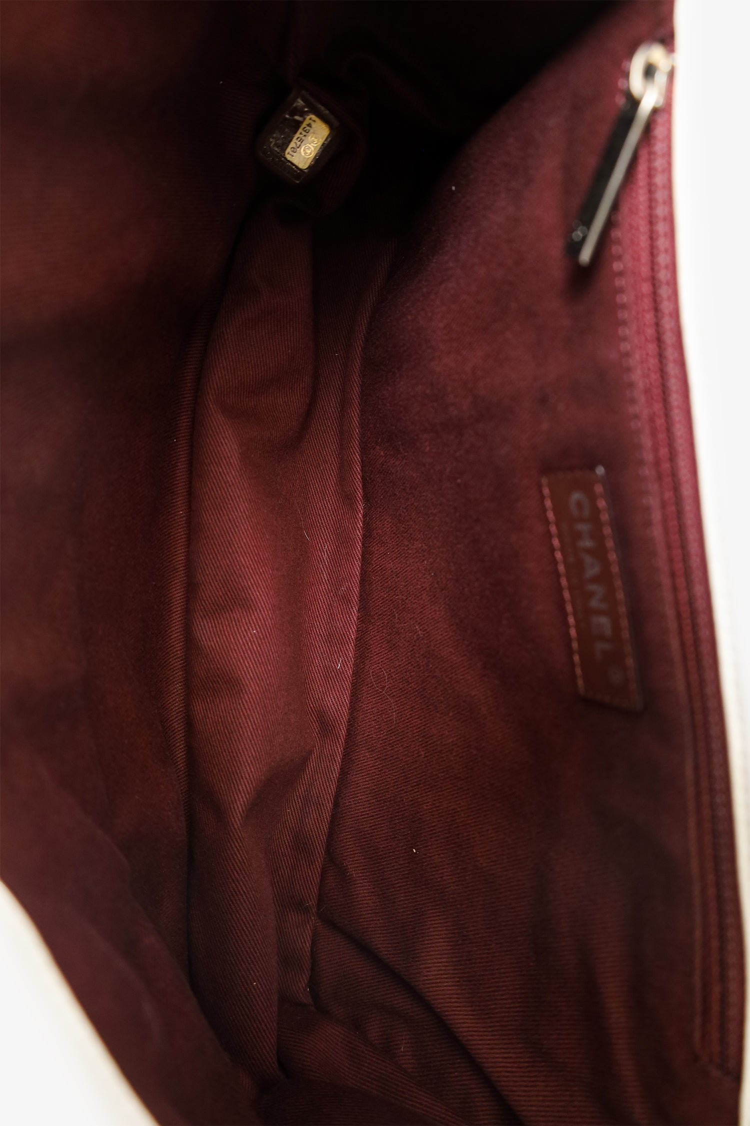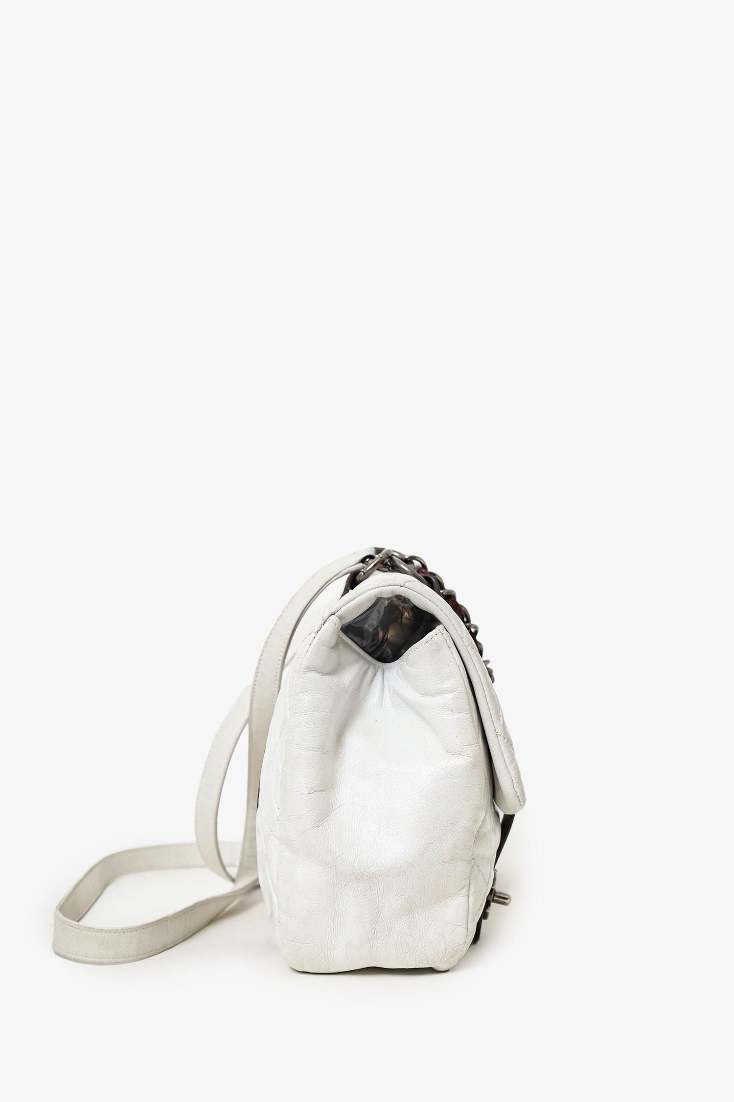 Refresh availabilityPre-Loved Chanel™ 2010-11 White/Brown Quilted Calfskin In the Mix Messenger Bag. Front fold-over flap with double turn-lock closure. 2 attached straps; chainlink handle and leather strap. Glitter-finish. Canvas-lined interior. Single interior zip pocket. Palladium-tone hardware. Tonal stitching.