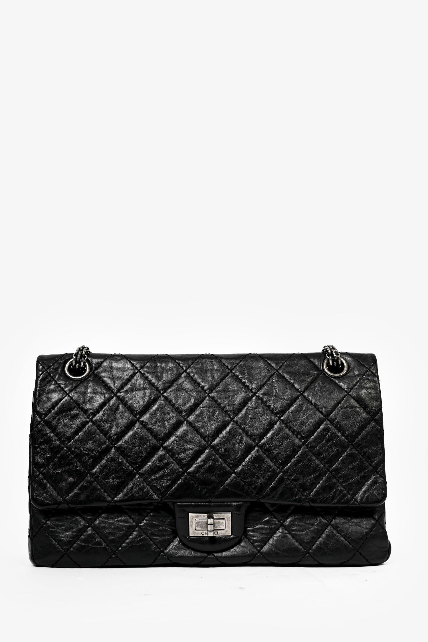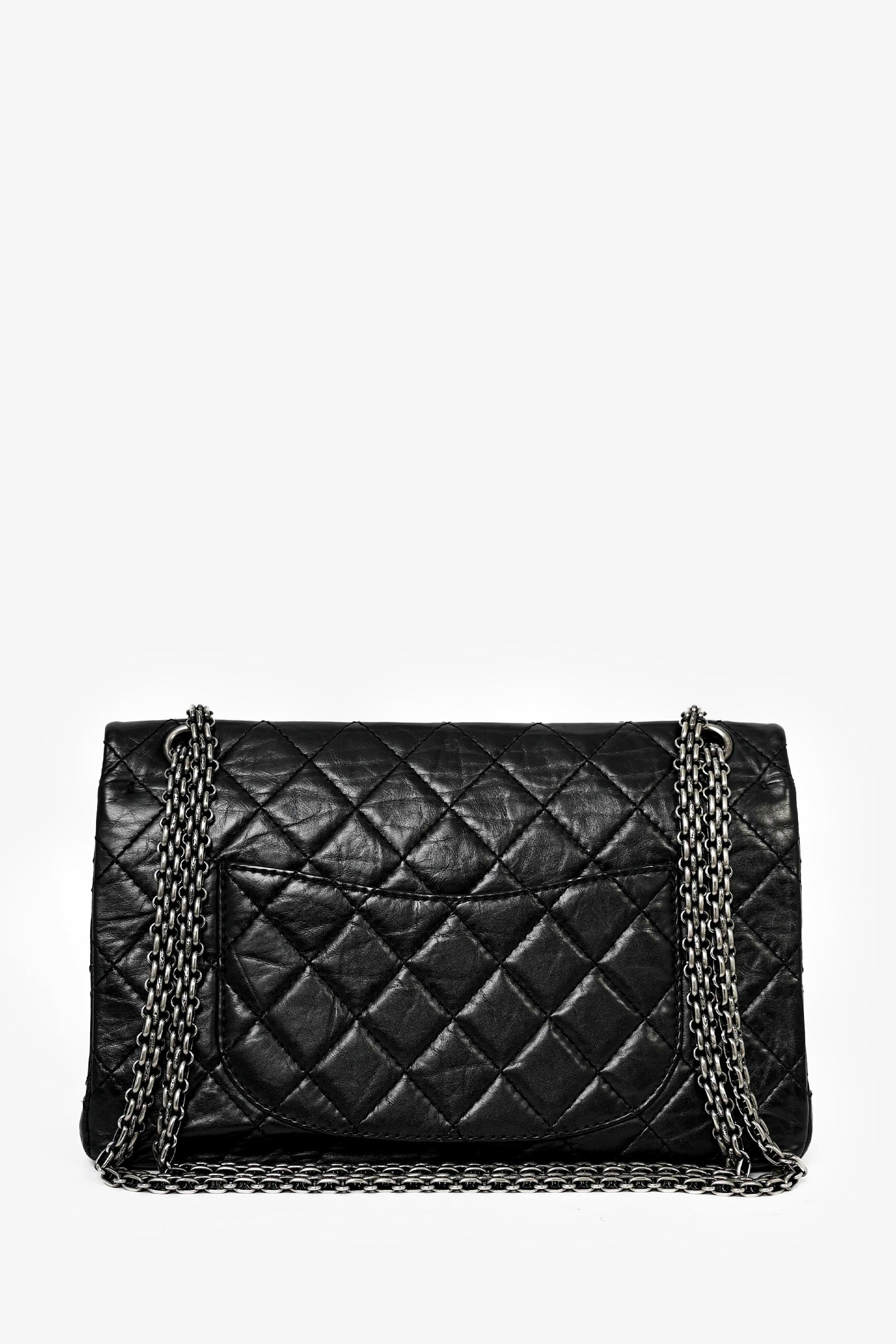 Refresh availabilityPre-Loved Chanel™ 2010 Black Lambskin Reissue 226 Shoulder Bag. Front fold-over flap with turn lock closure and interior snap button closure. Exterior rear slip pocket. Double chain shoulder strap. Single zip closure pocket on outer flap and slip pocket on outer flap. Open compartment with 2 wall slip pockets and 1 centre pen compartment pocket. Rear exterior and front slip pocket. Silver-tone hardware. Tonal stitching.