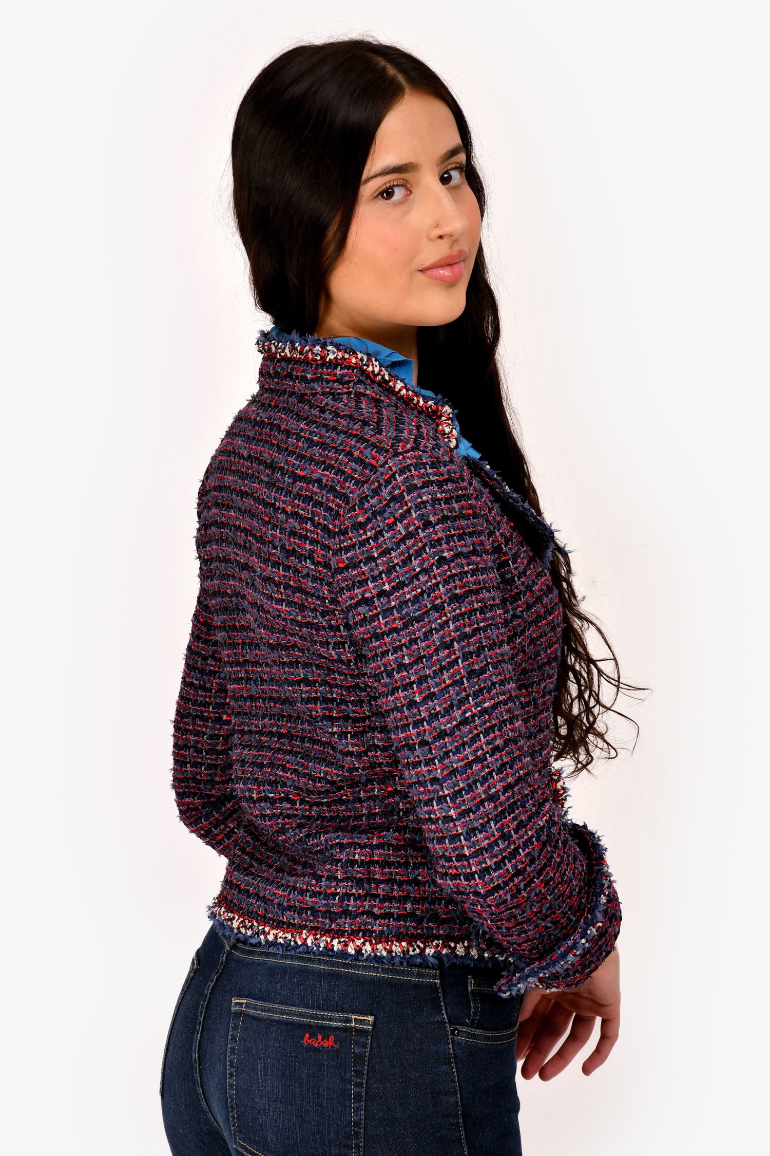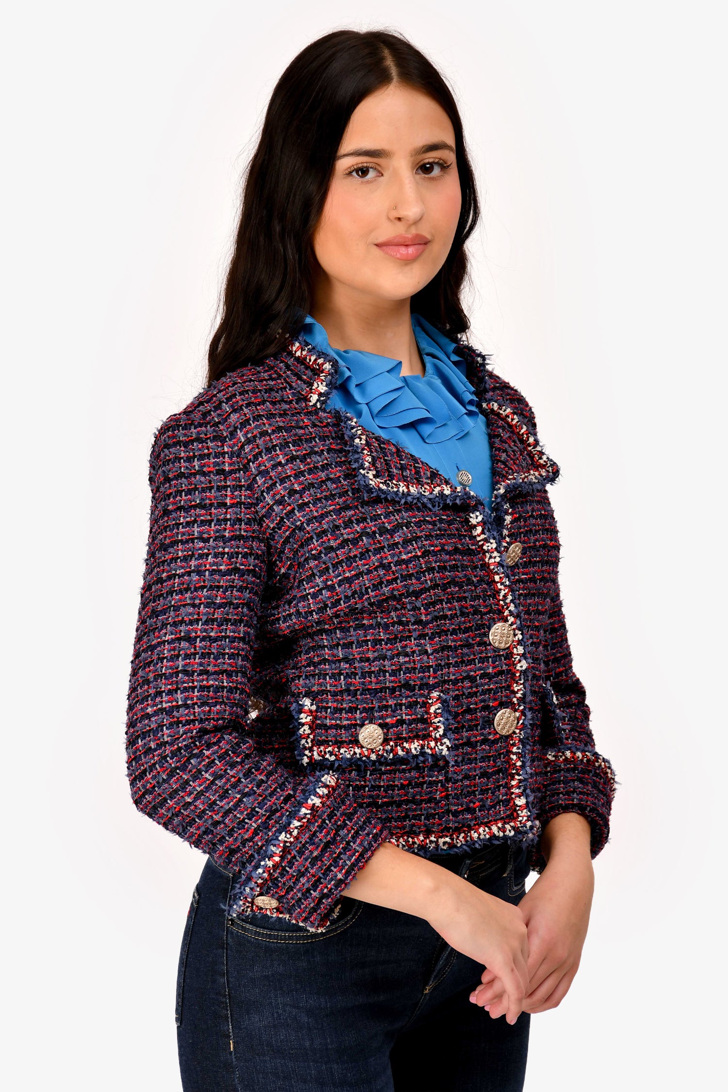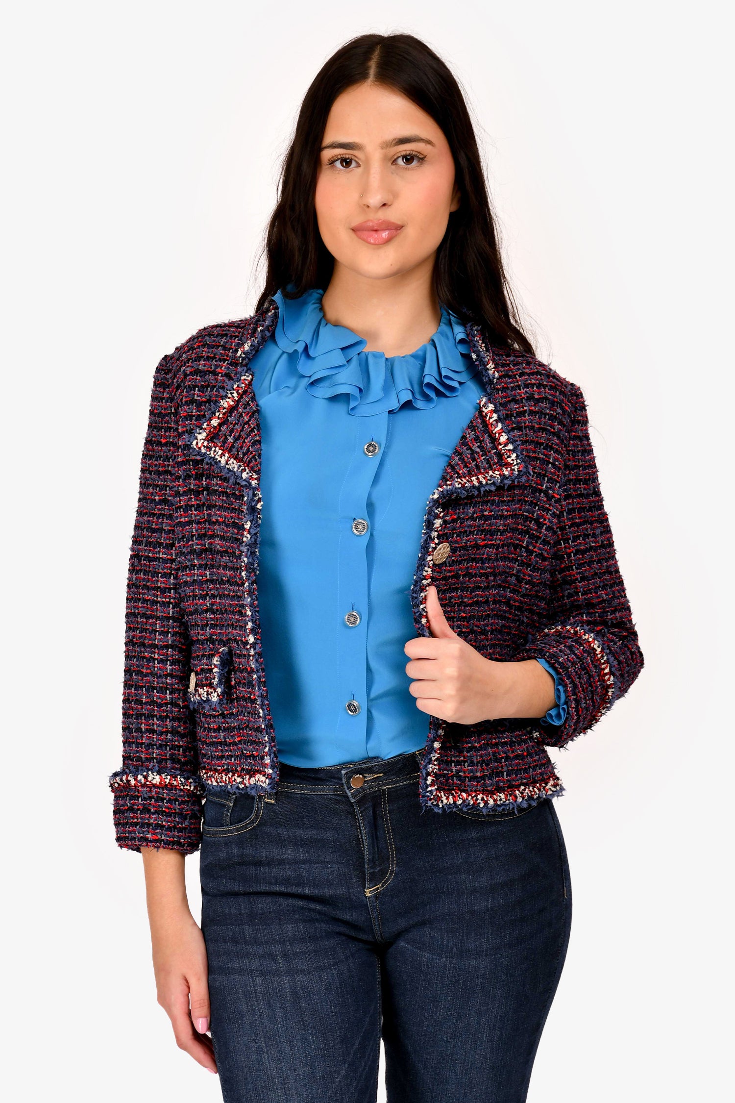 Refresh availabilityPre-Loved Chanel™ 2010 Red/Navy Blue Tweed Single Breasted Jacket. Features a notched collar. Front button closure and long sleeves with buttoned cuffs. Lined interior. Tonal stitching.