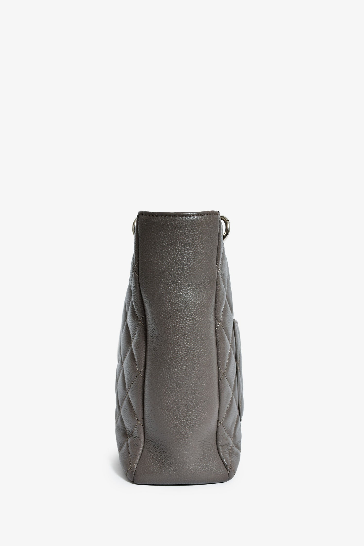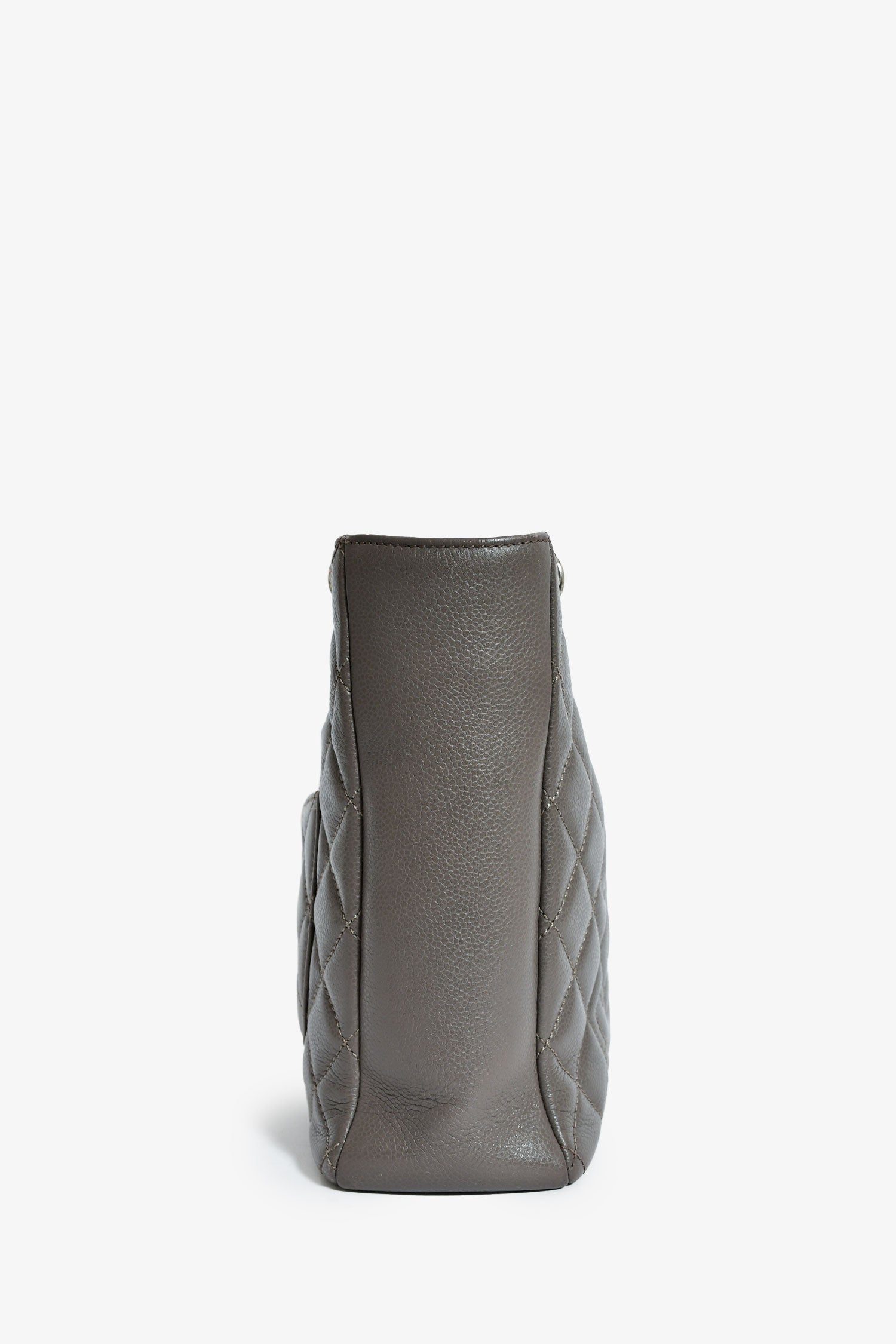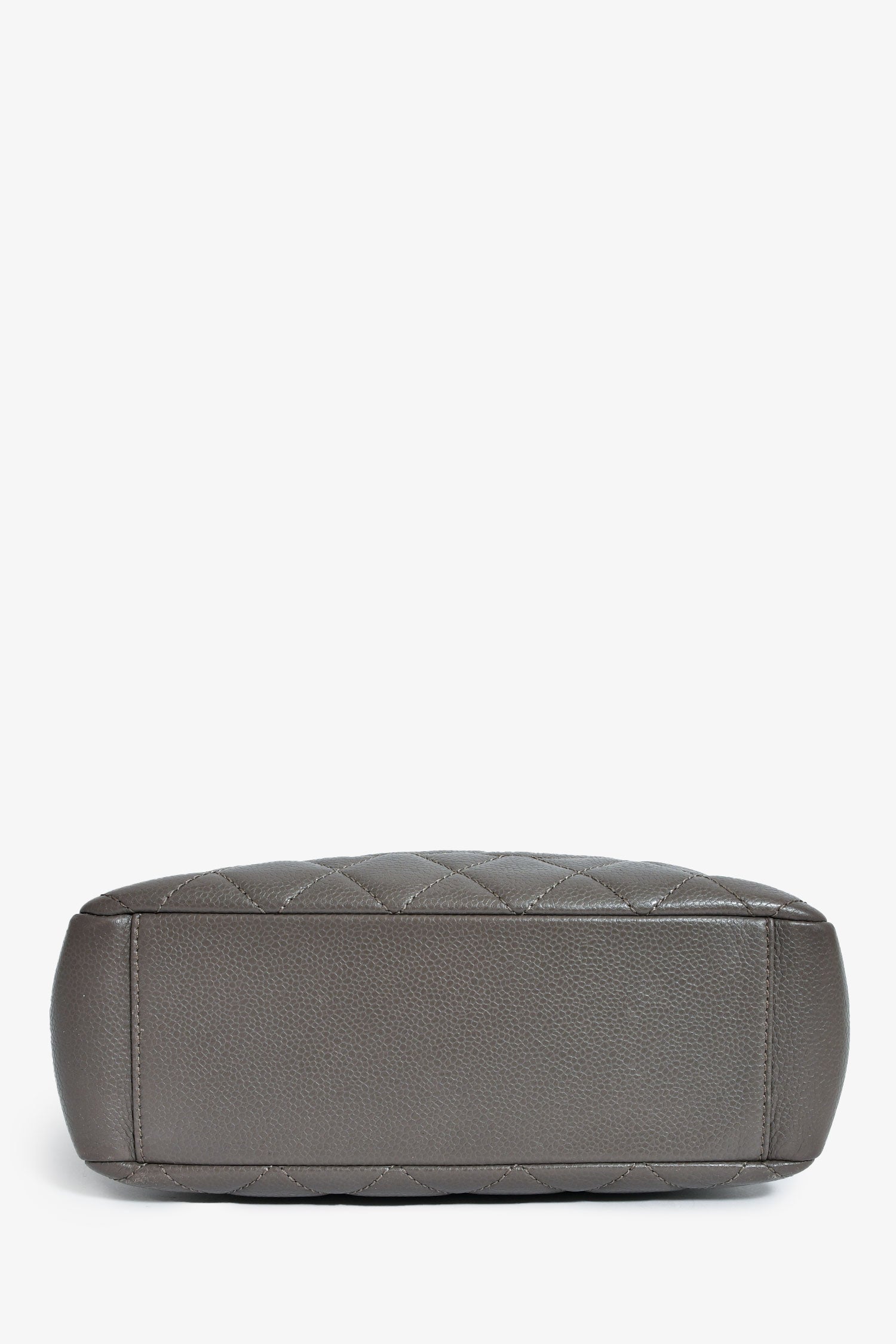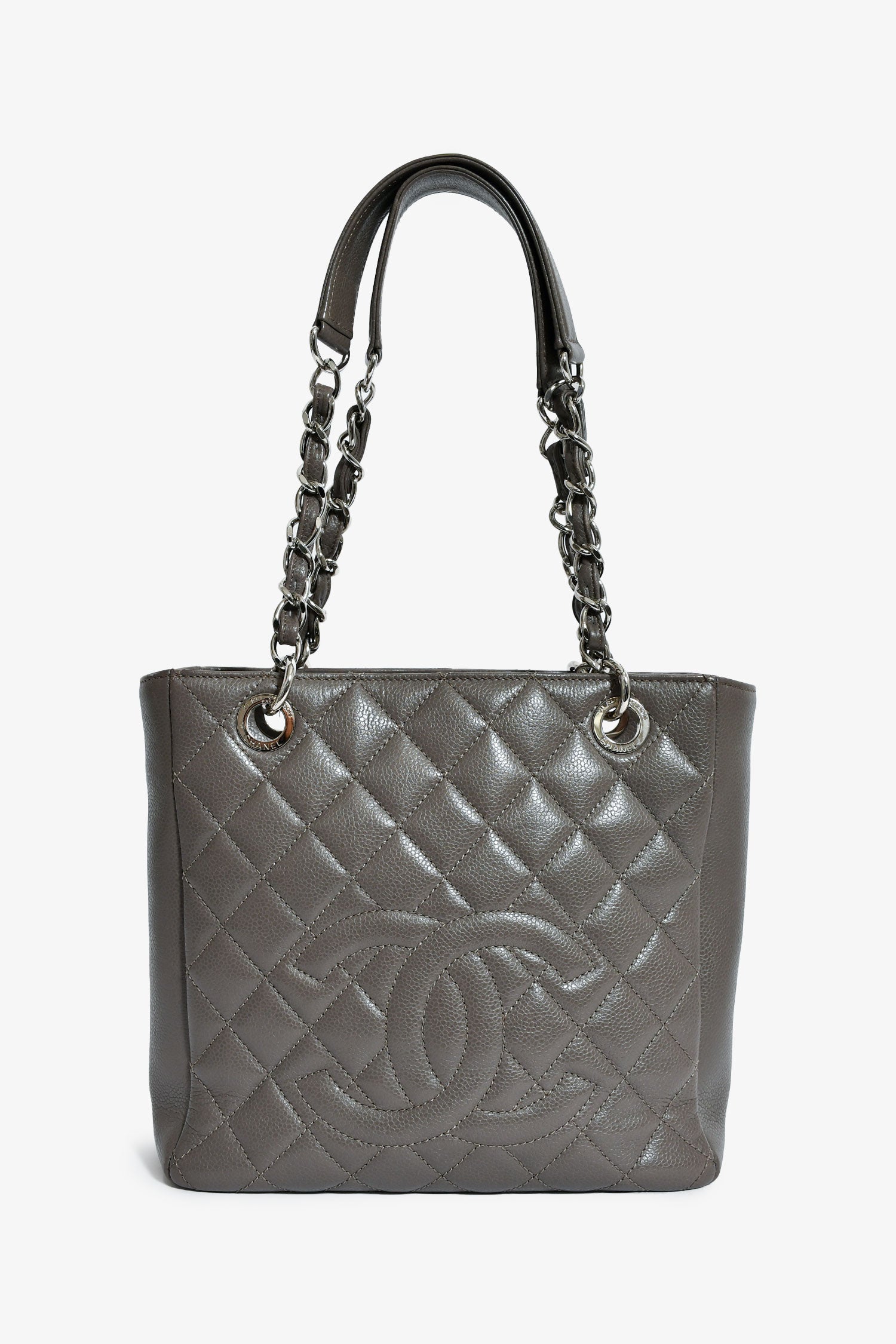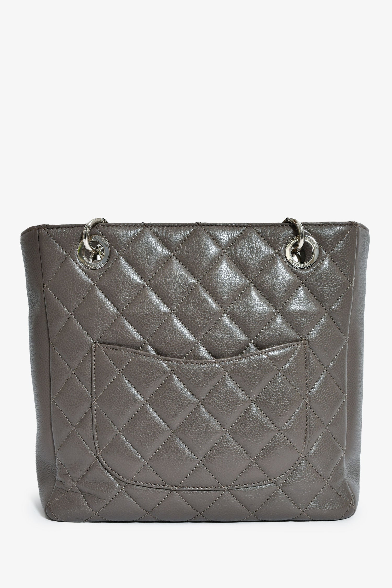Refresh availabilityPre-Loved Chanel™ 2010-11 Grey Caviar Leather Petite Shopping Tote. Concealed top snap button closure. Chain-link shoulder straps. Exterior rear slip compartment. Lined interior with 2 pockets; 1 zip and 1 slip. Silver-tone hardware. Tonal stitching.