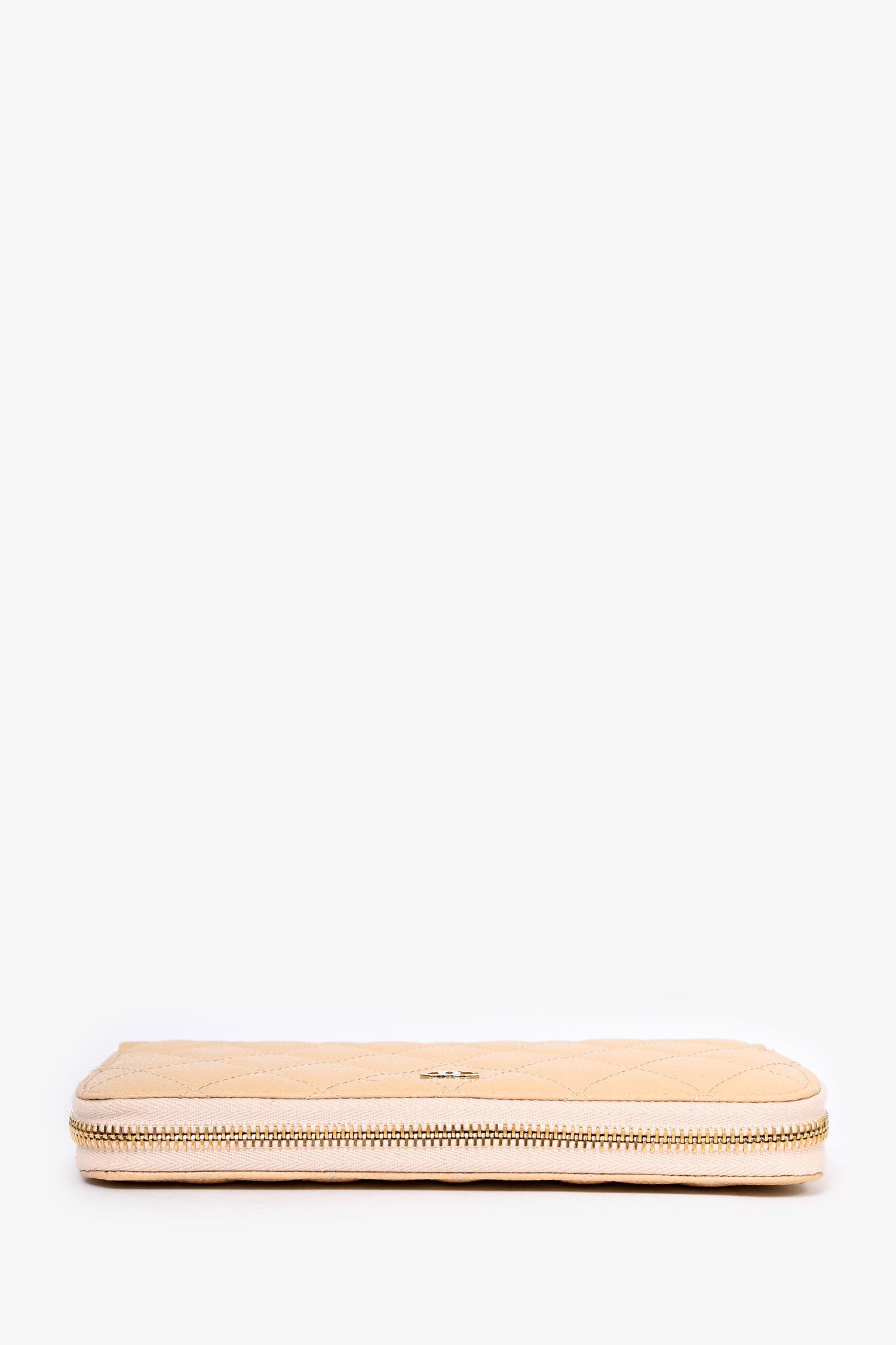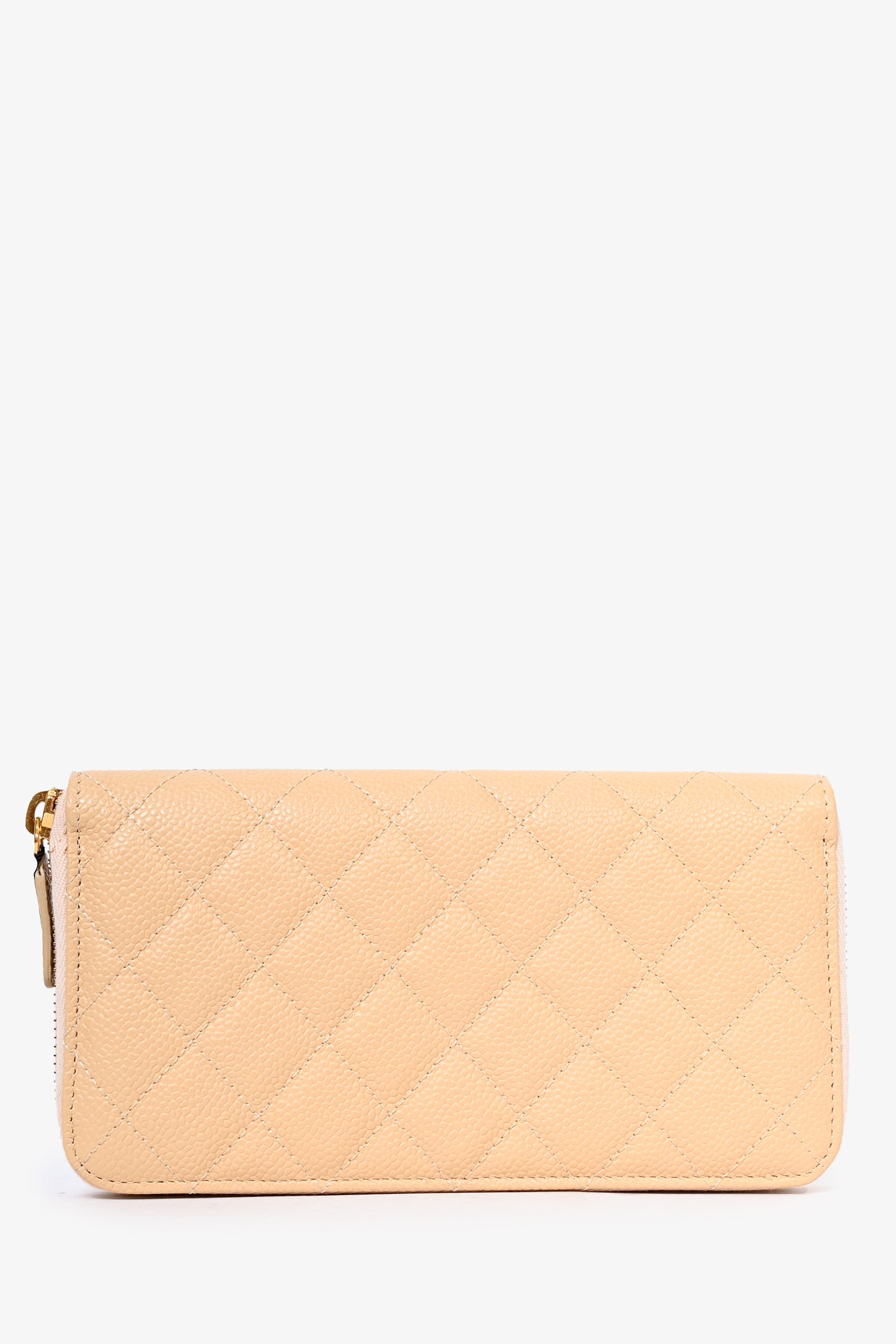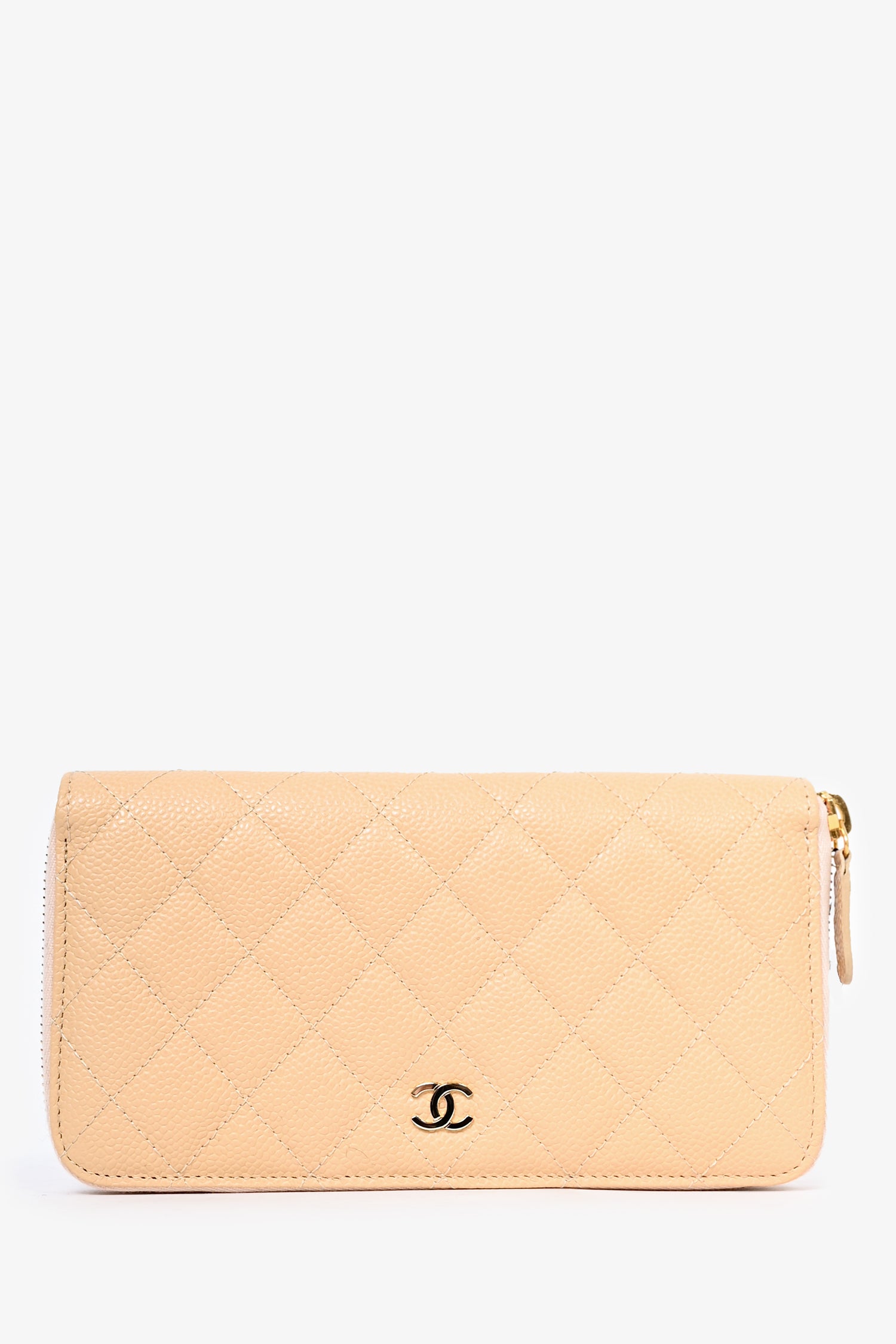 Pre-Loved Chanel™ 2011-12 Beige Caviar Leather Zip Wallet. 8 card slots. 2 billfold compartments. 1 zippered coin comaprmtent. Gold-tone hardware.