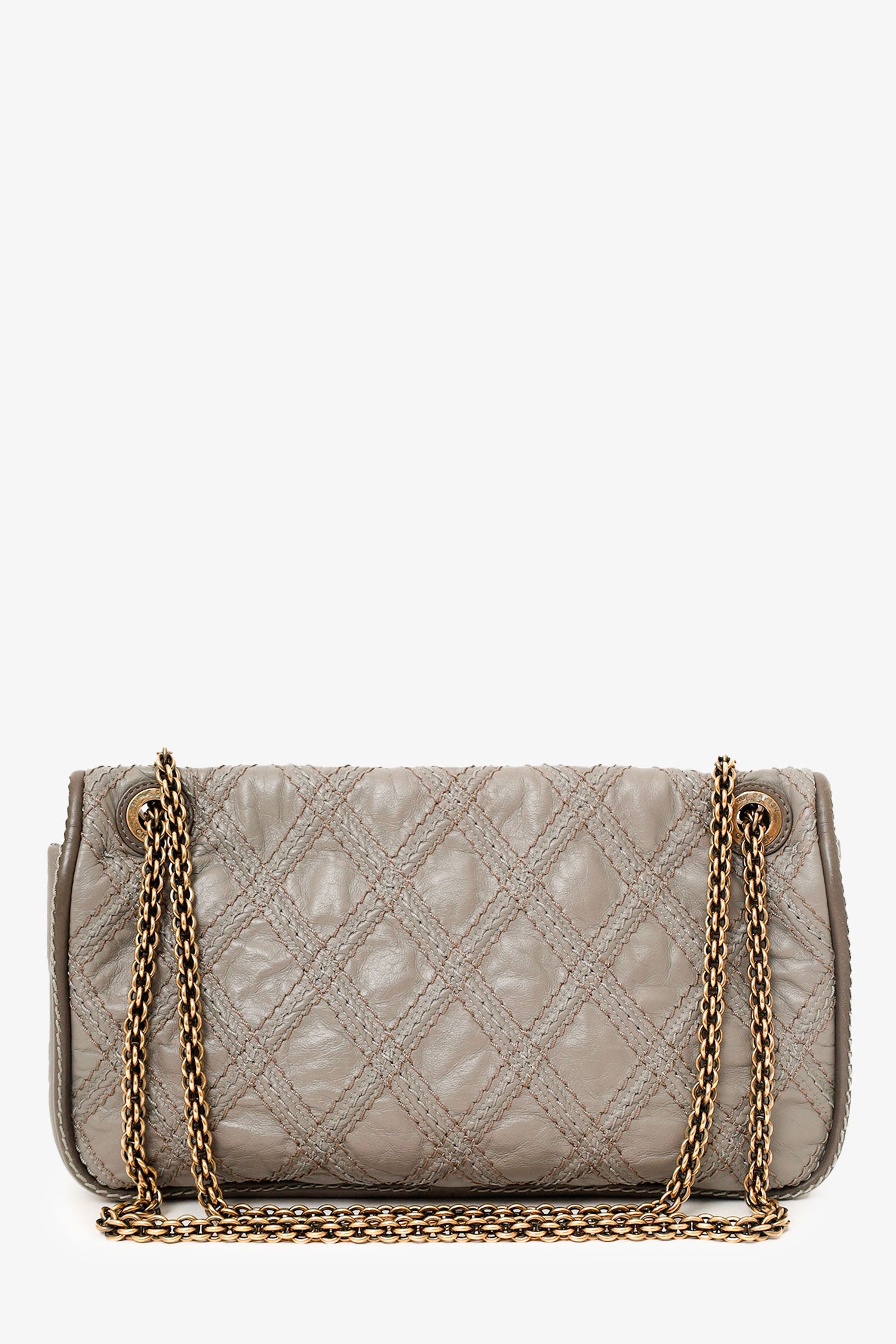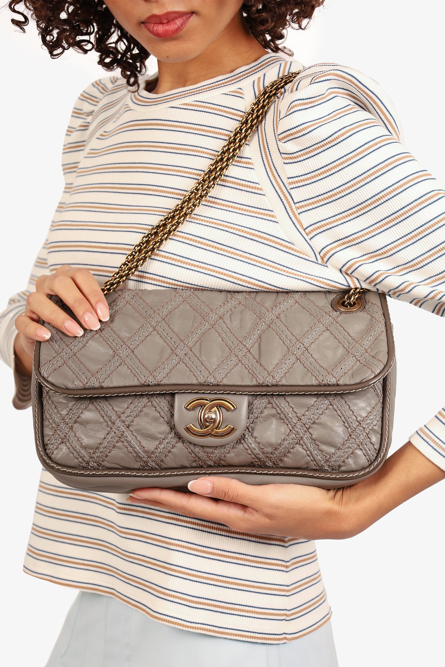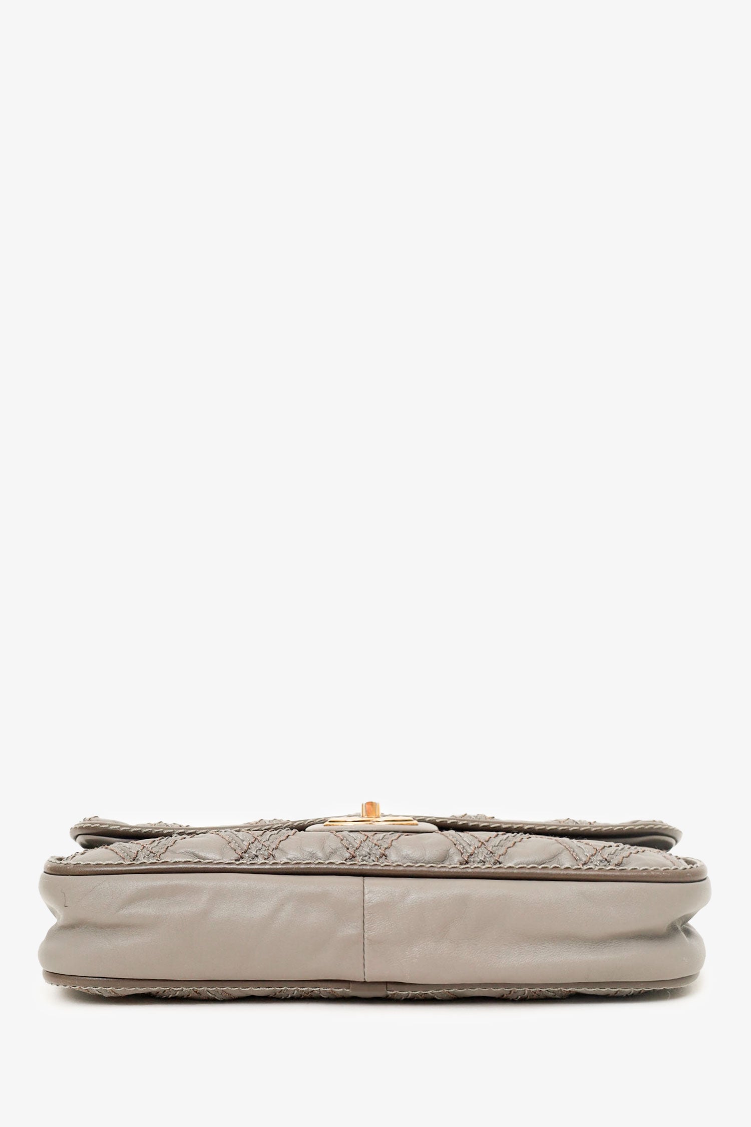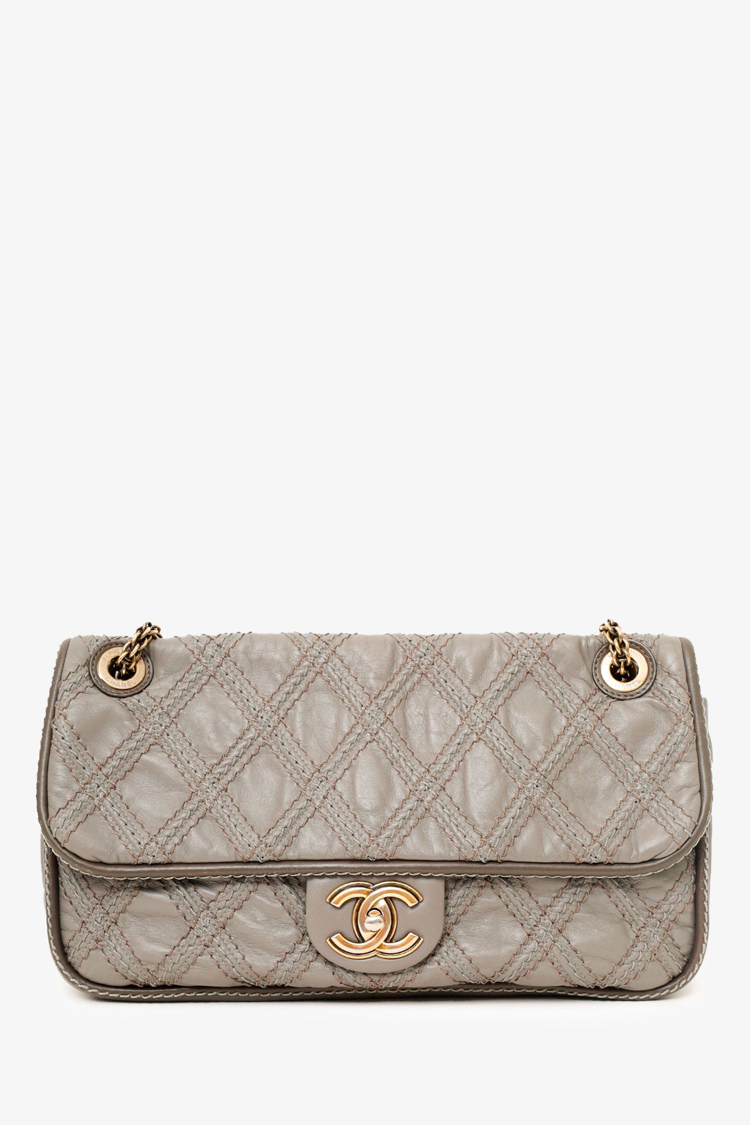 Pre-loved Chanel™ 2011 Grey Quilted Leather Paris-Bombay Triptych Flap Bag. Turn lock closure. Interior wall pocket with zip closure. Gold-tone hardware. Tonal stitching