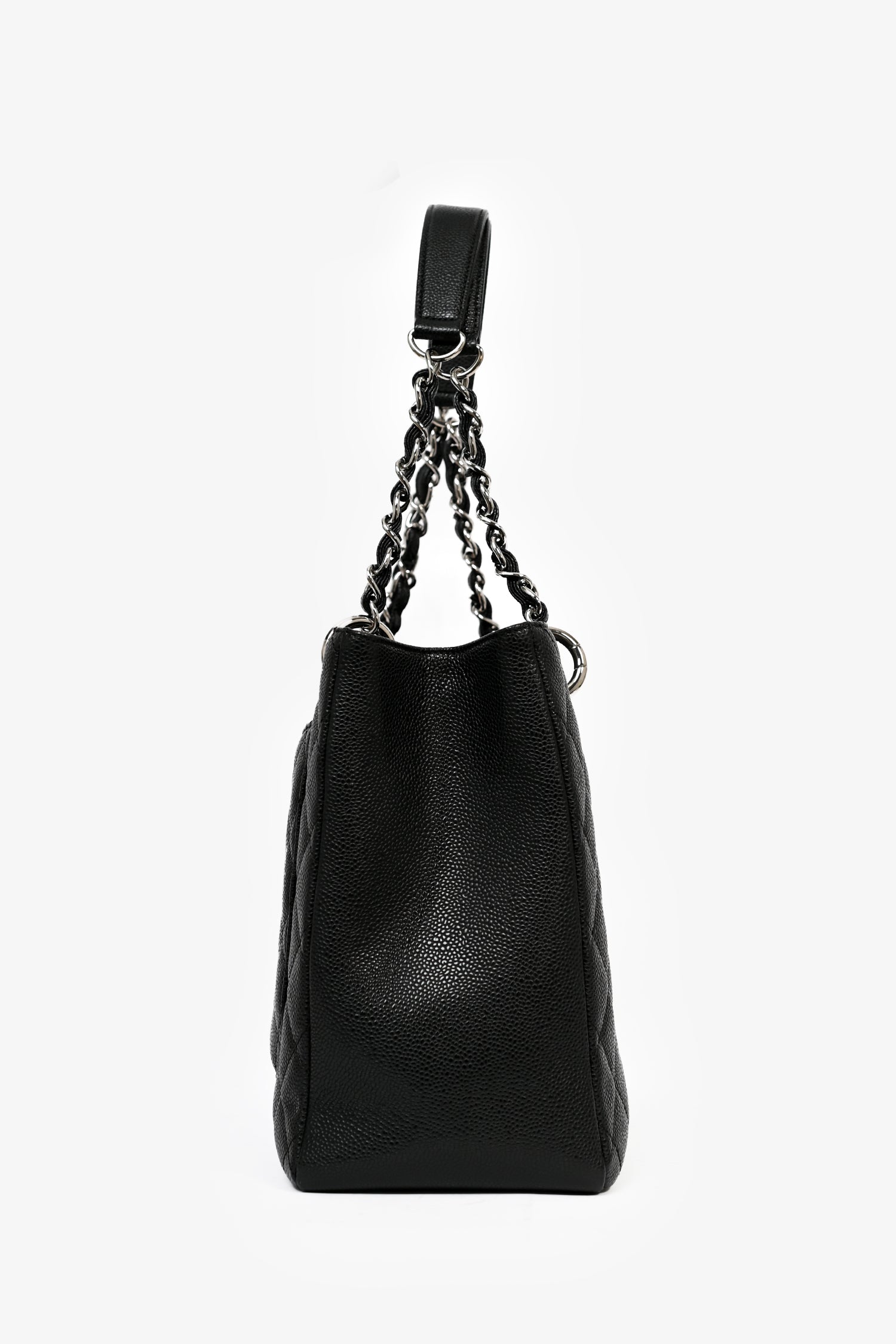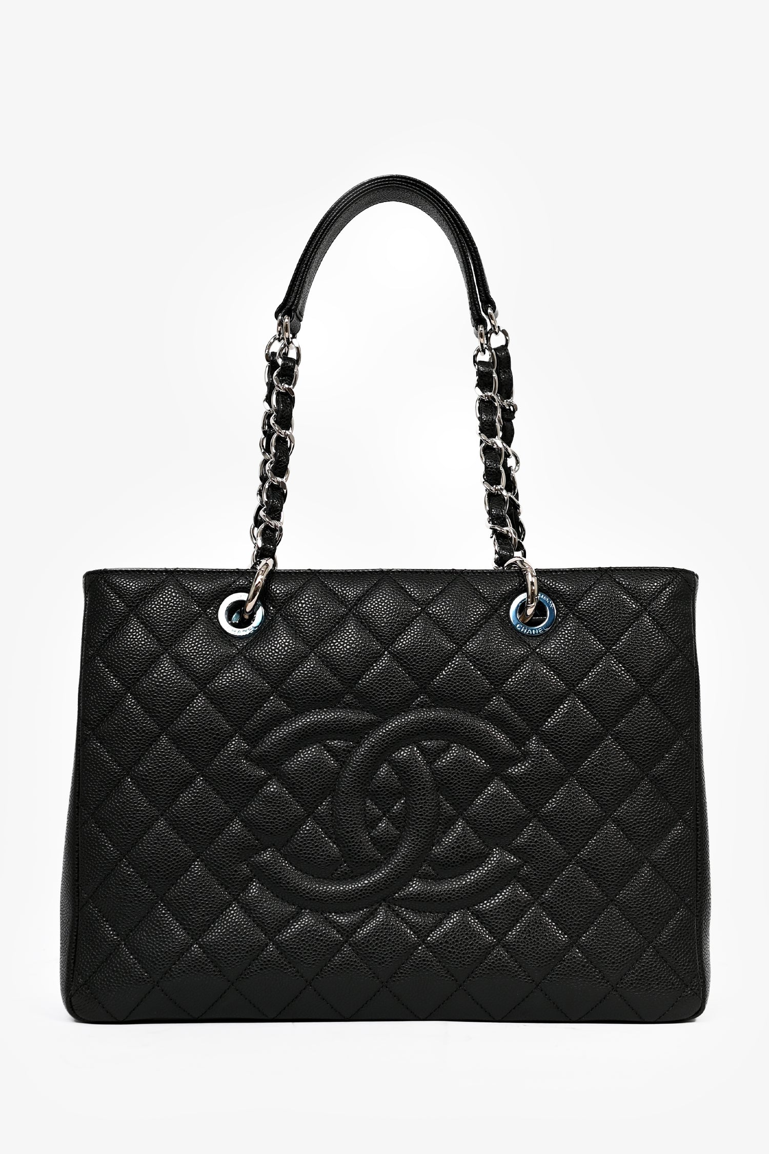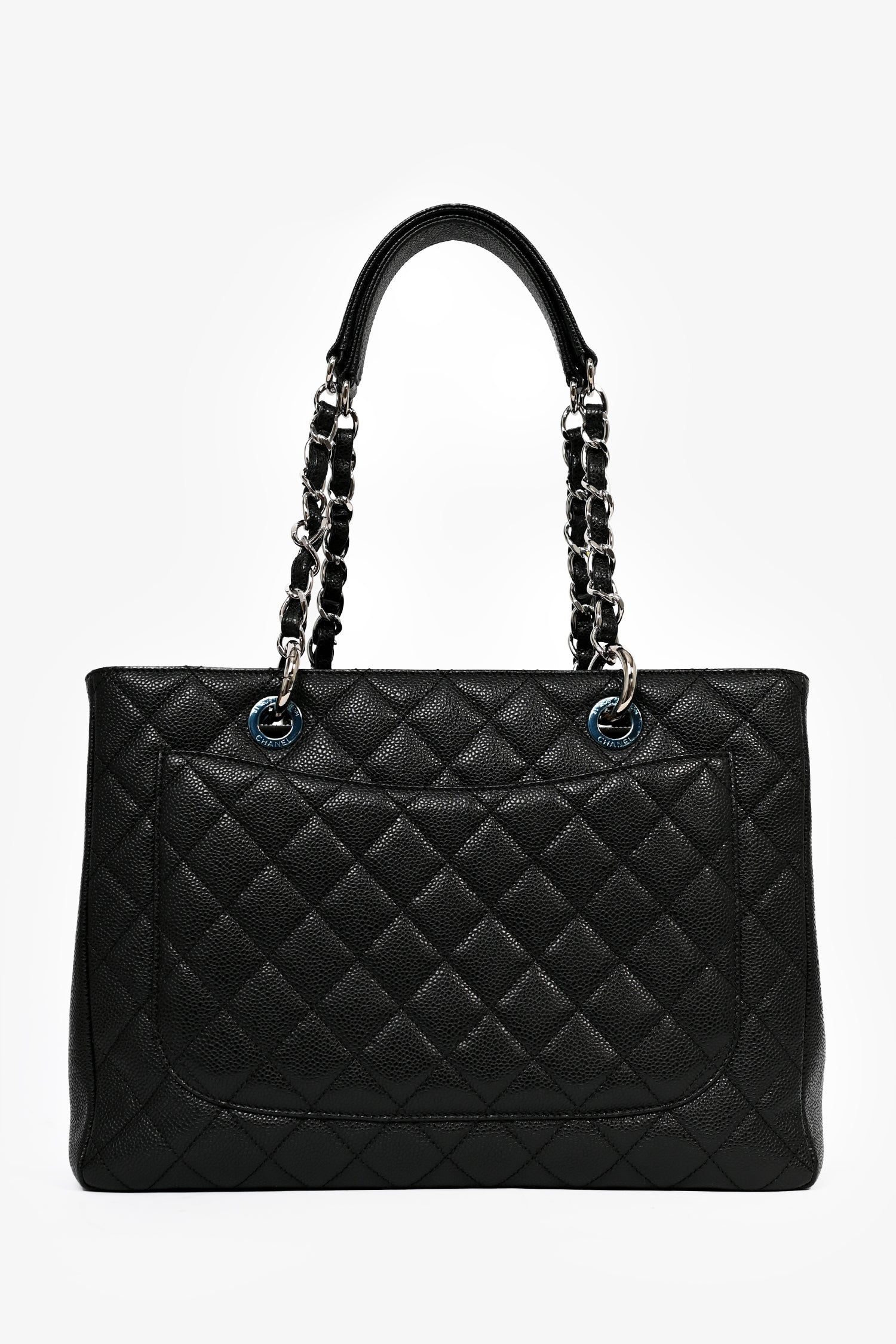Refresh availabilityPre-Loved Chanel™ 2012-13 Black Caviar Grand Shopping Tote. Dual chain linked shoulder straps. Open top with two main compartments, separated by a zipped middle pocket. Two bag insert included, one for each compartment. One wall zipped pocket. One wall slip pocket. One exterior slip pocket in the back. Silver-tone hardware. Tonal stitching.