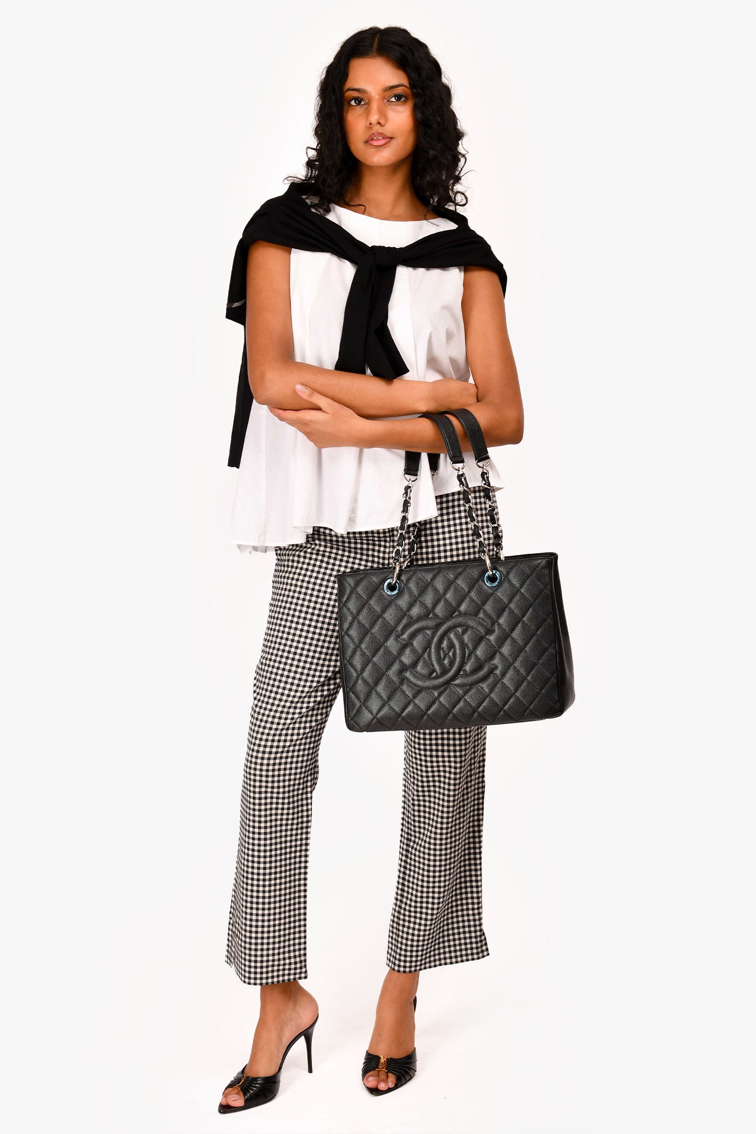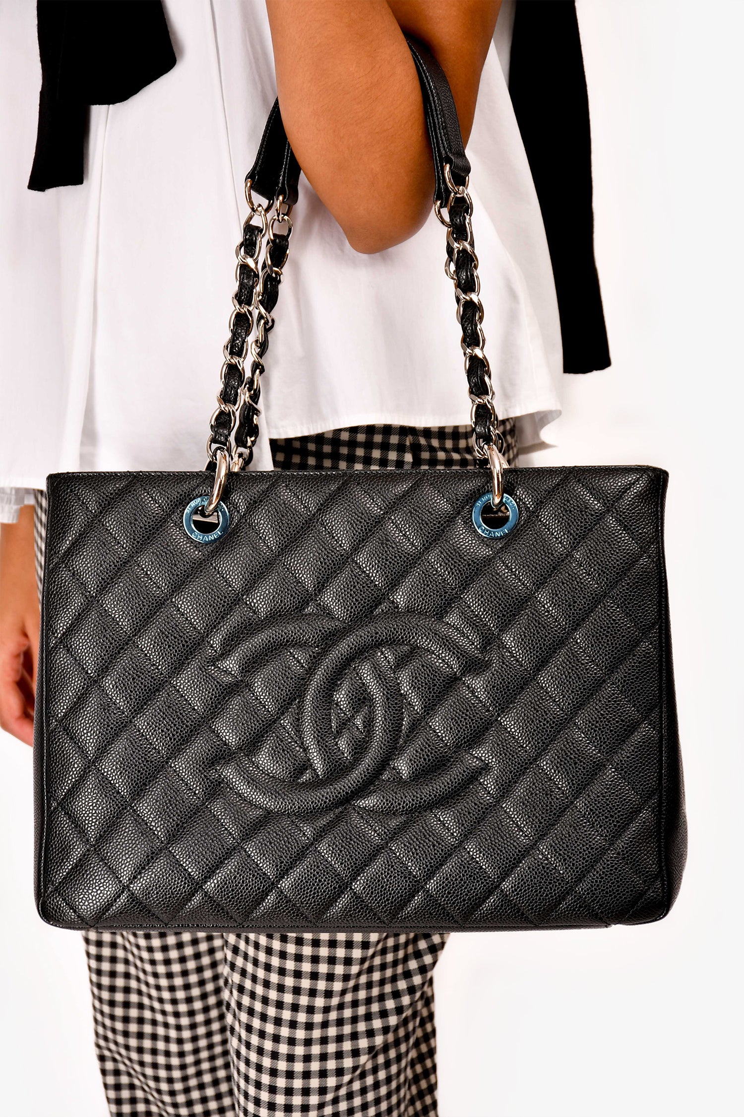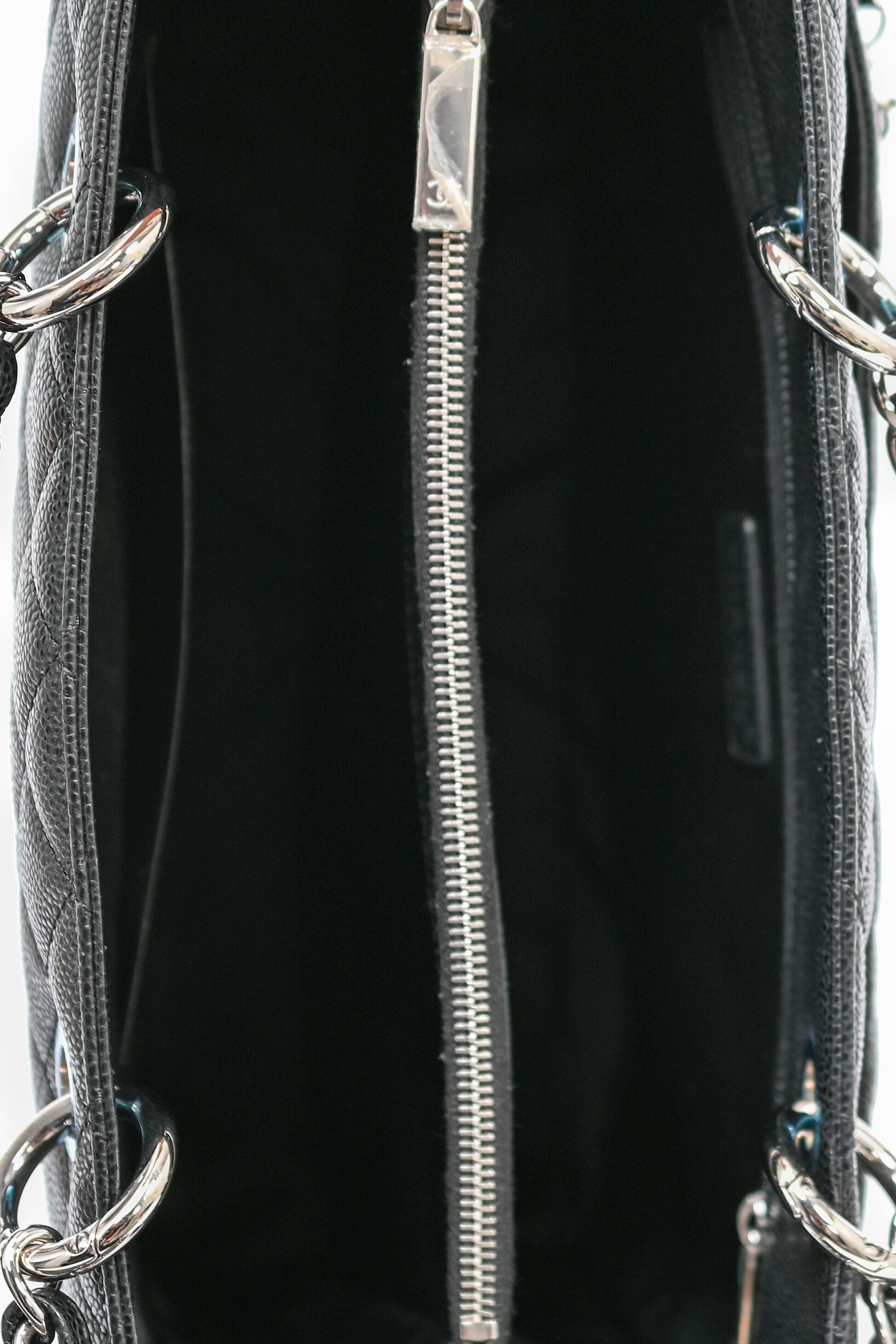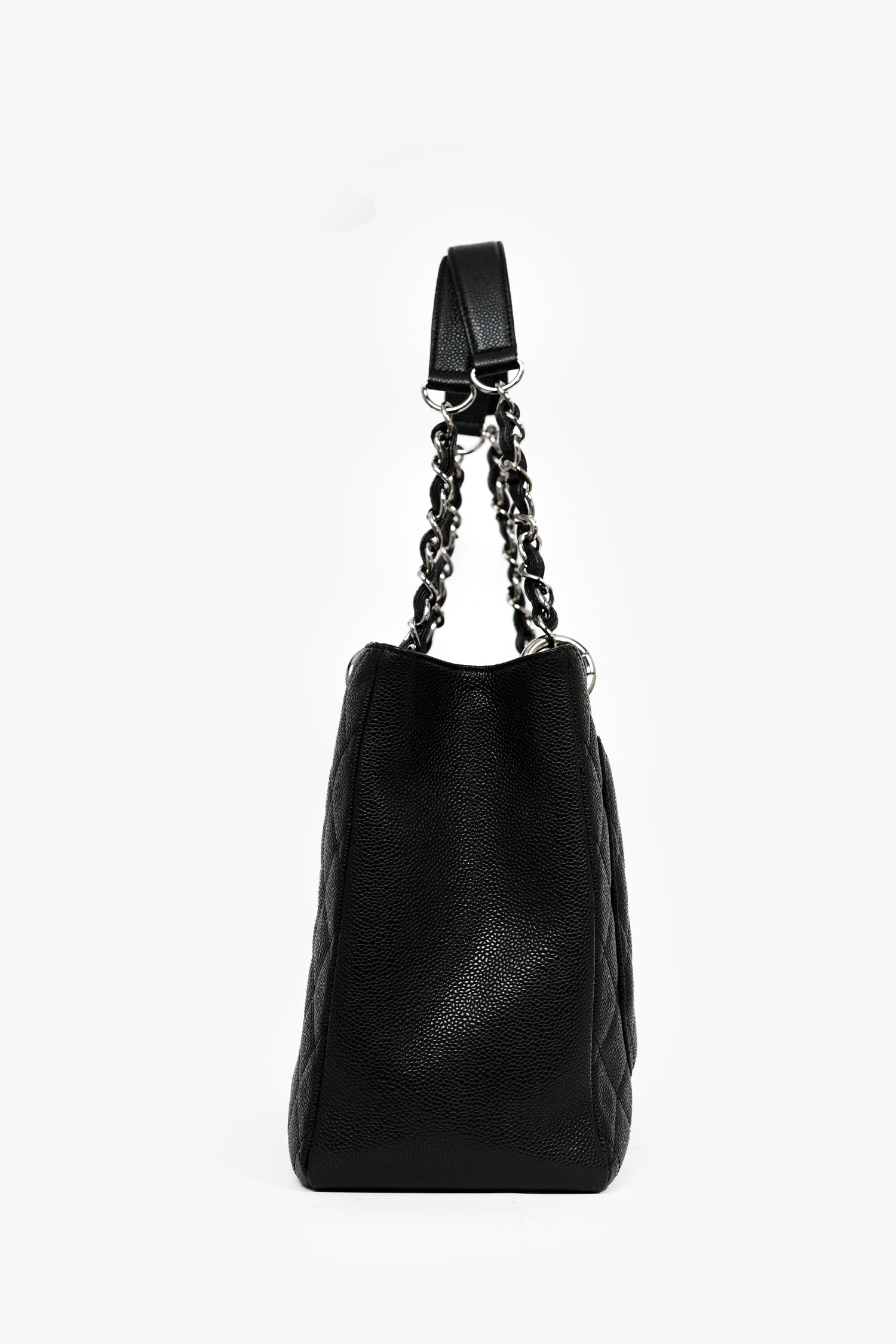 Refresh availabilityPre-Loved Chanel™ 2012-13 Black Caviar Grand Shopping Tote. Dual chain linked shoulder straps. Open top with two main compartments, separated by a zipped middle pocket. Two bag insert included, one for each compartment. One wall zipped pocket. One wall slip pocket. One exterior slip pocket in the back. Silver-tone hardware. Tonal stitching.