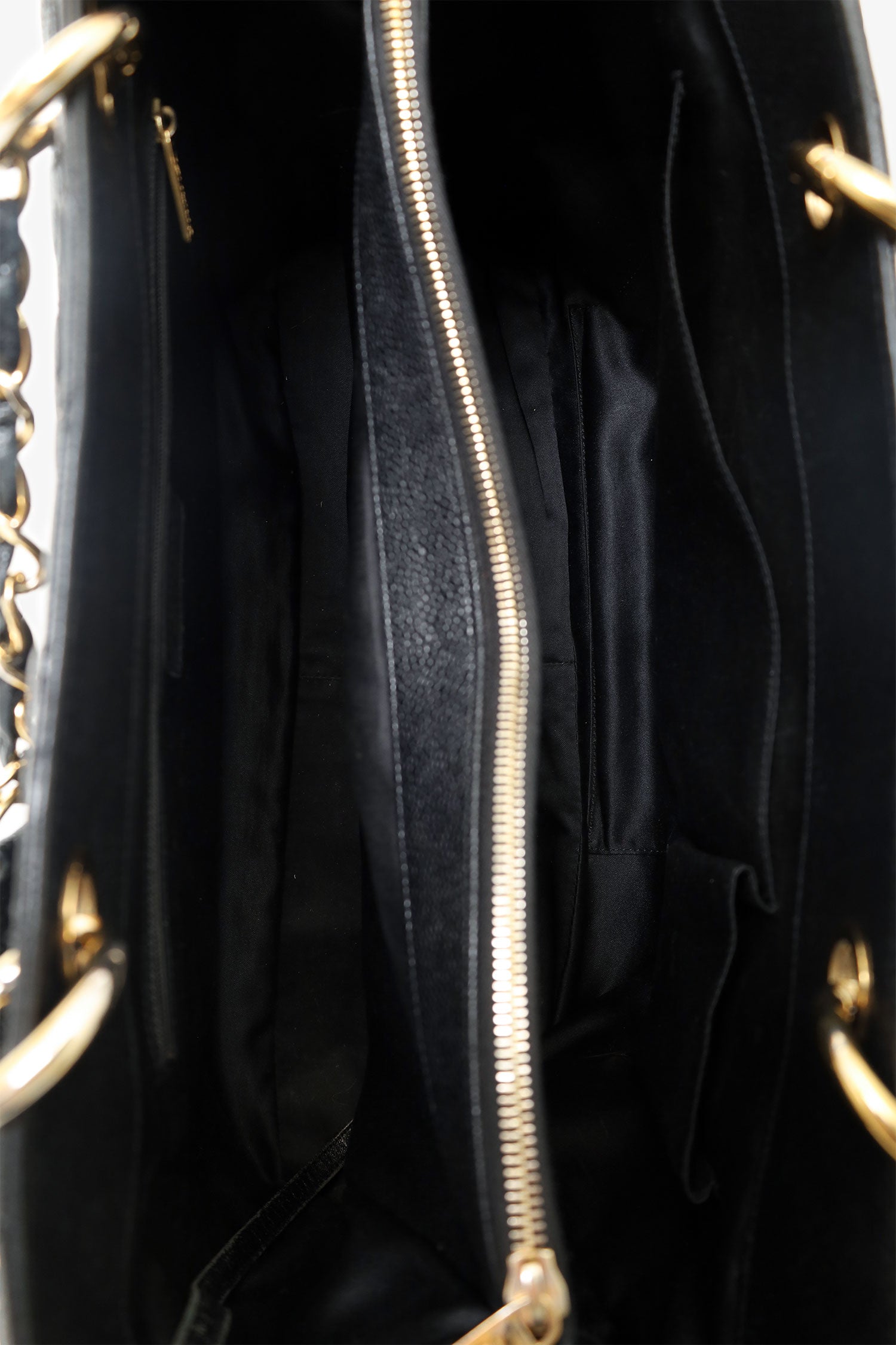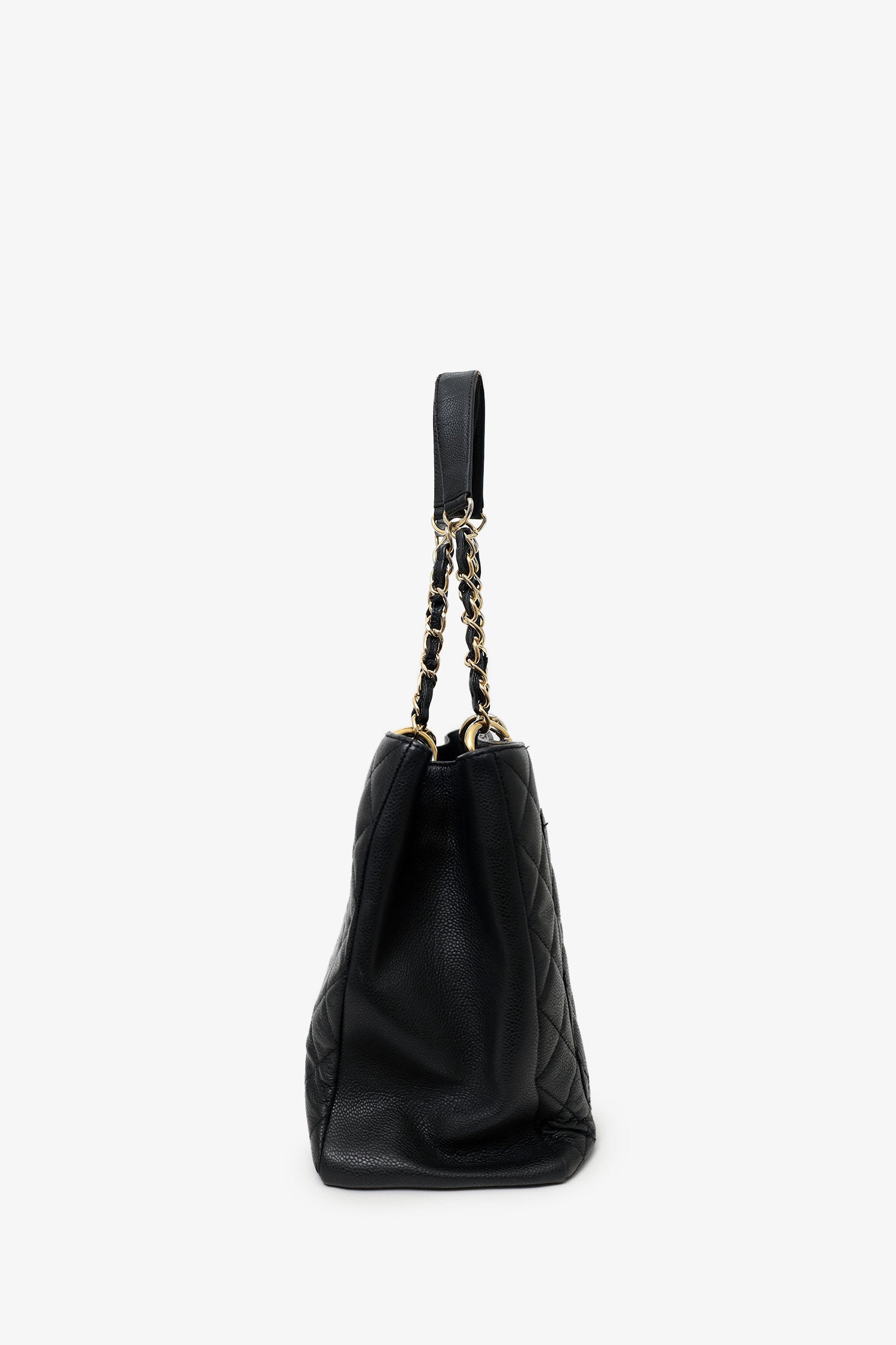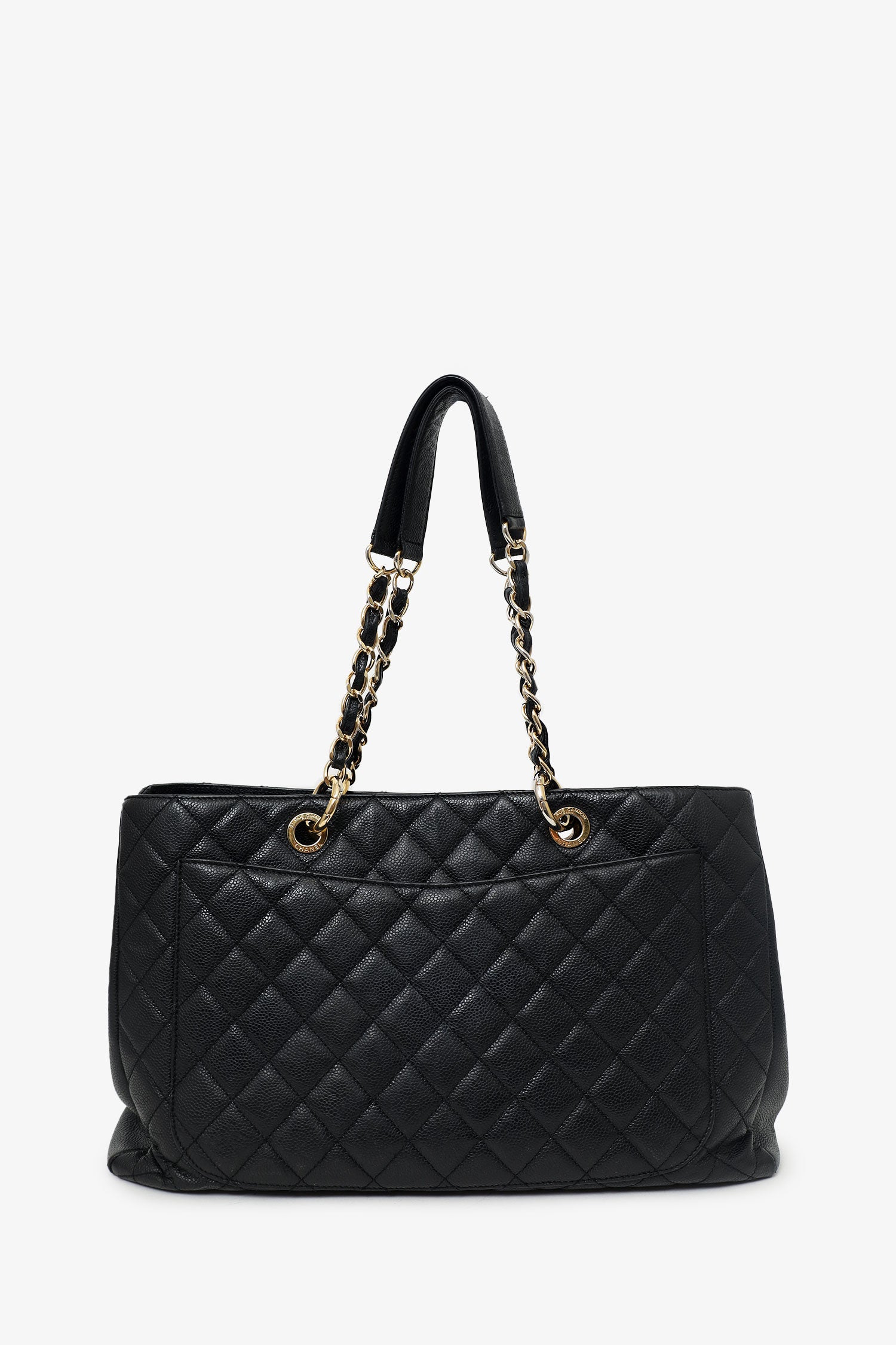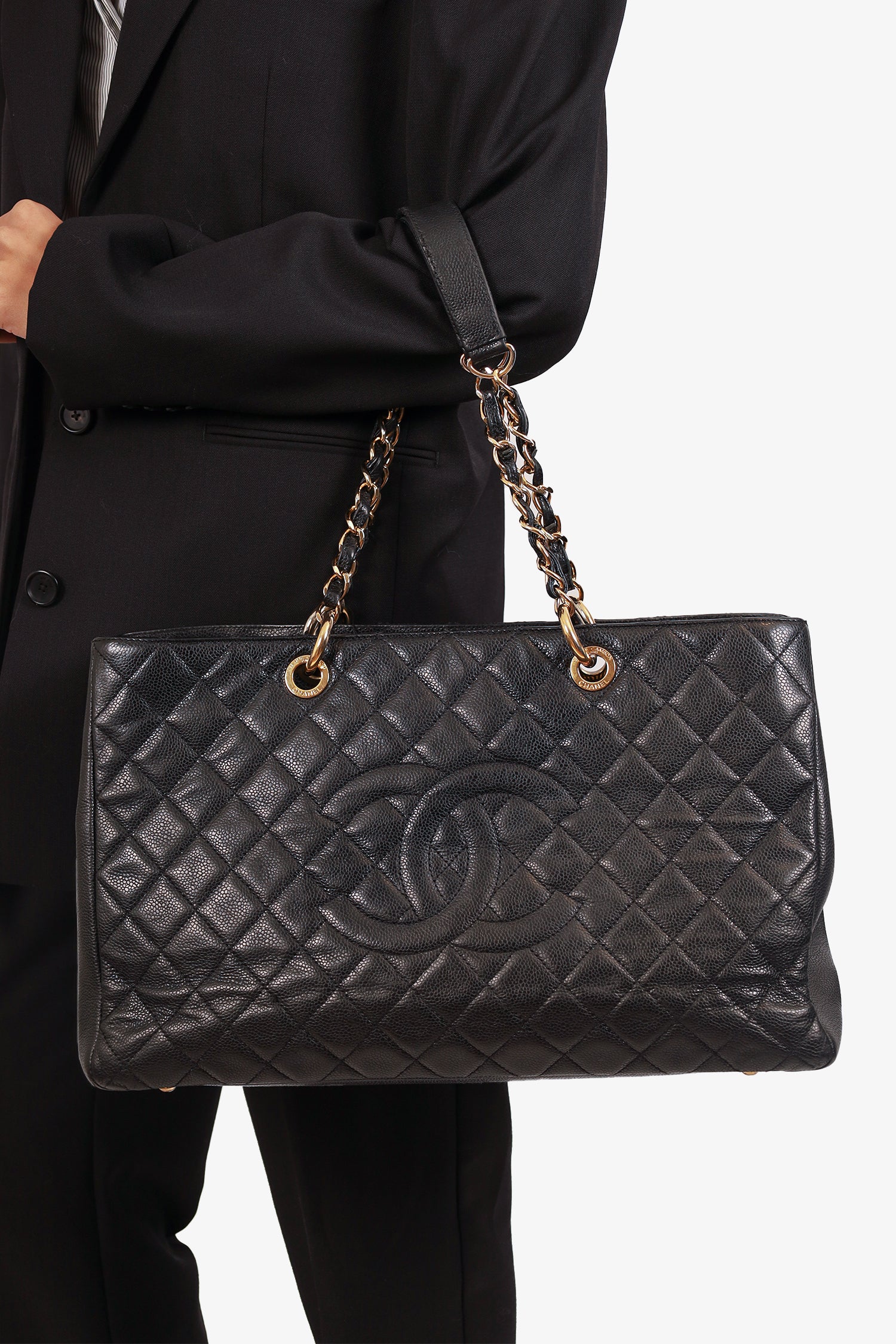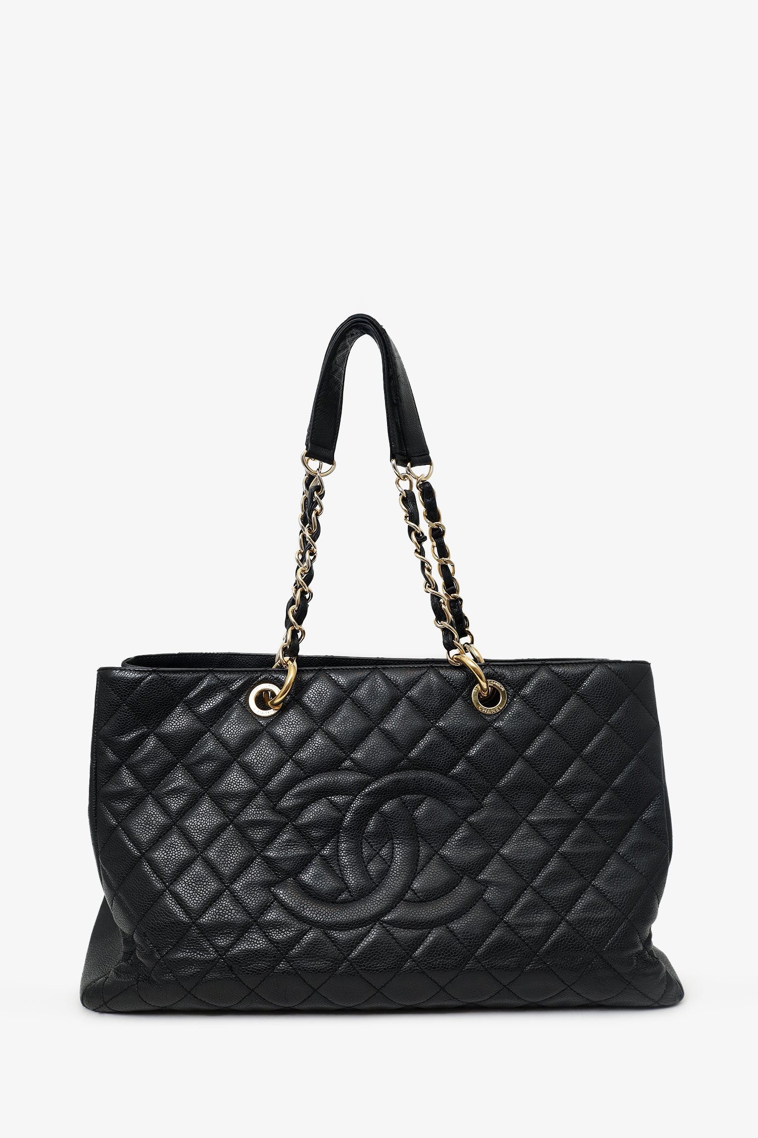 Refresh availabilityPre-loved Chanel™ 2012-13 Black Caviar Leather Grand Shopping Tote. 3 compartments; 2 open, 1 with zip closure. Interior wall pocket with zip closure. Interior slip wall pocket. Rear exterior slip pocket. Gold-tone hardware. Protective studs on bottom. Tonal stitching.