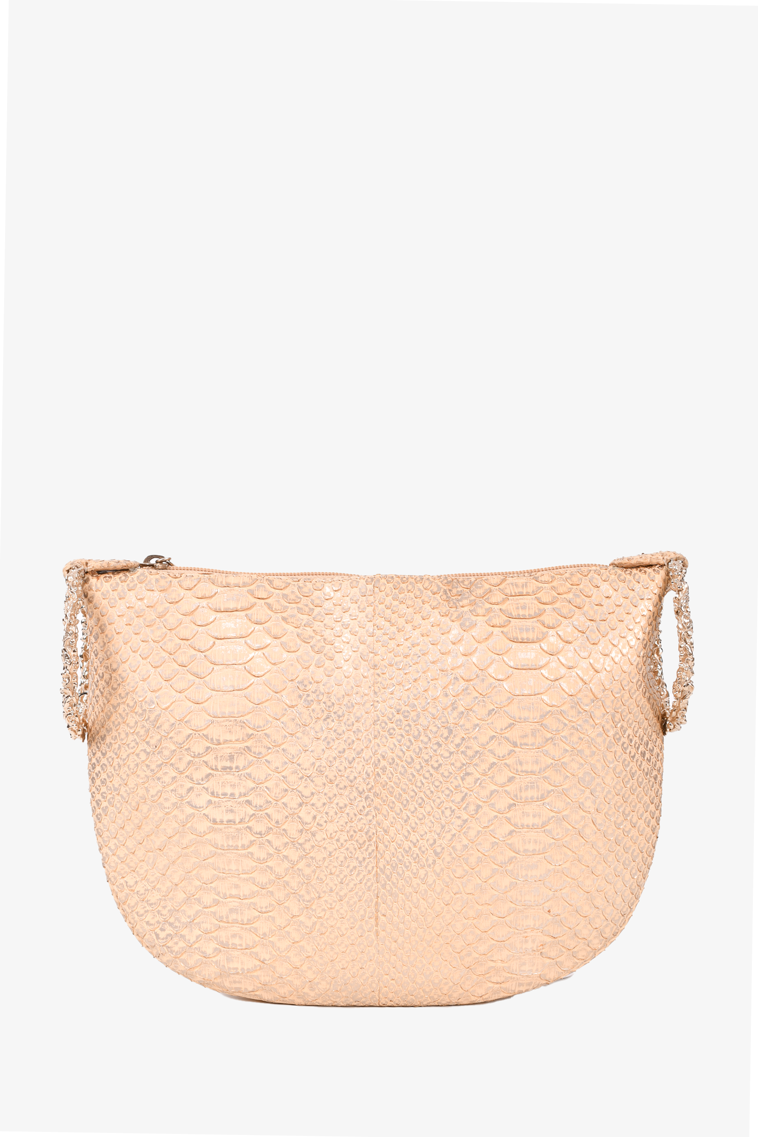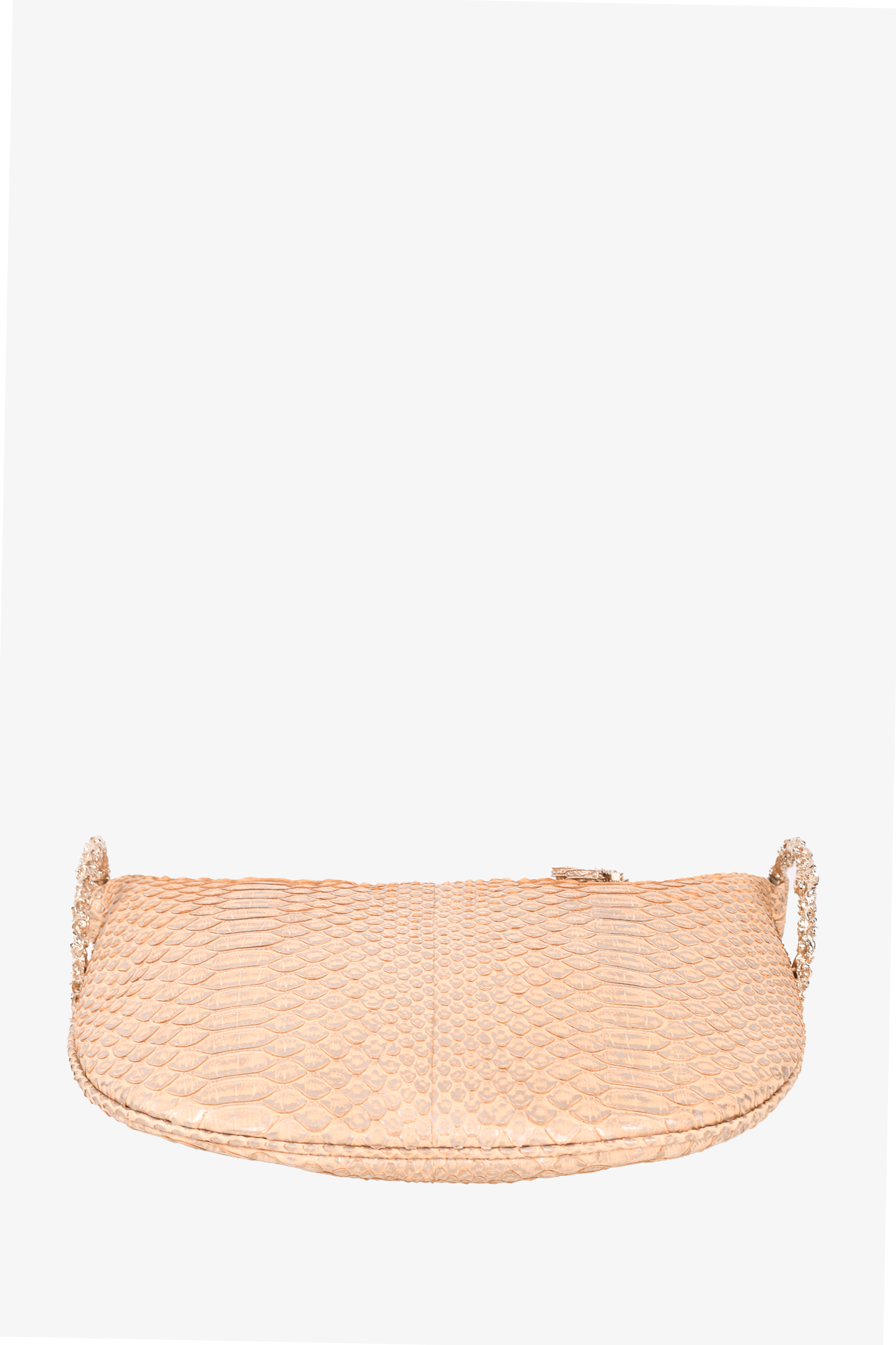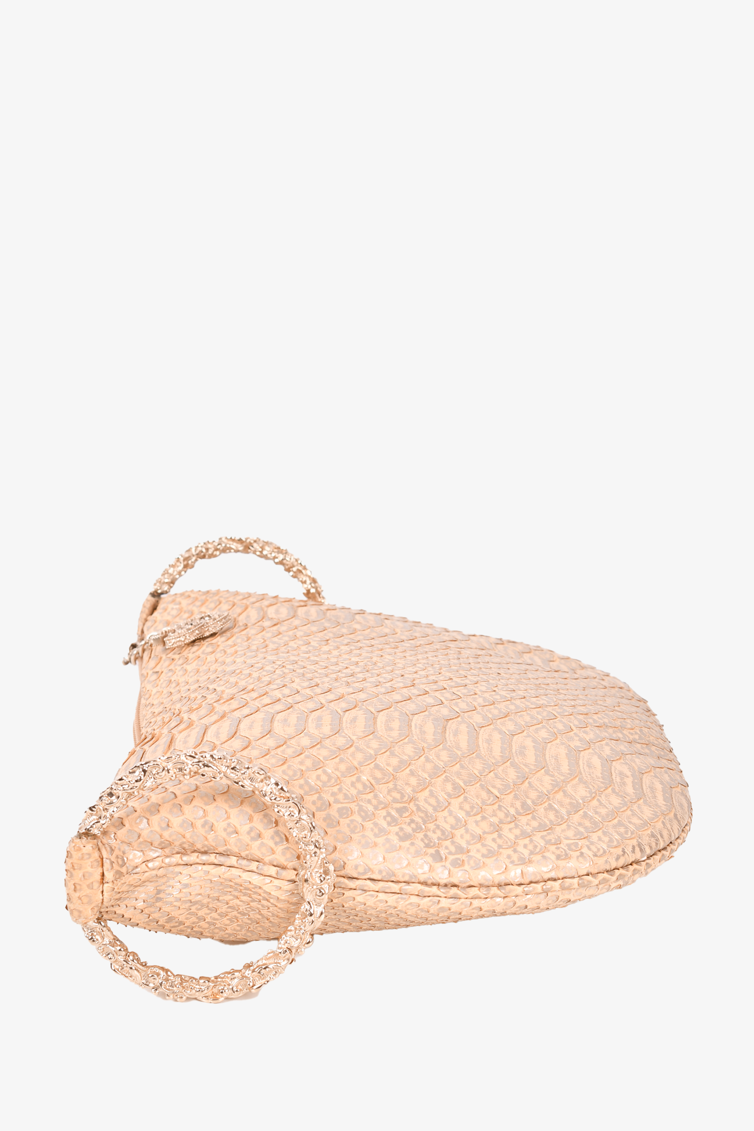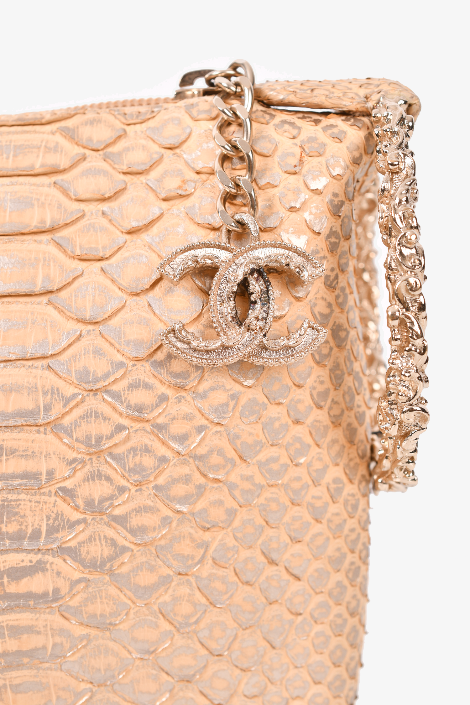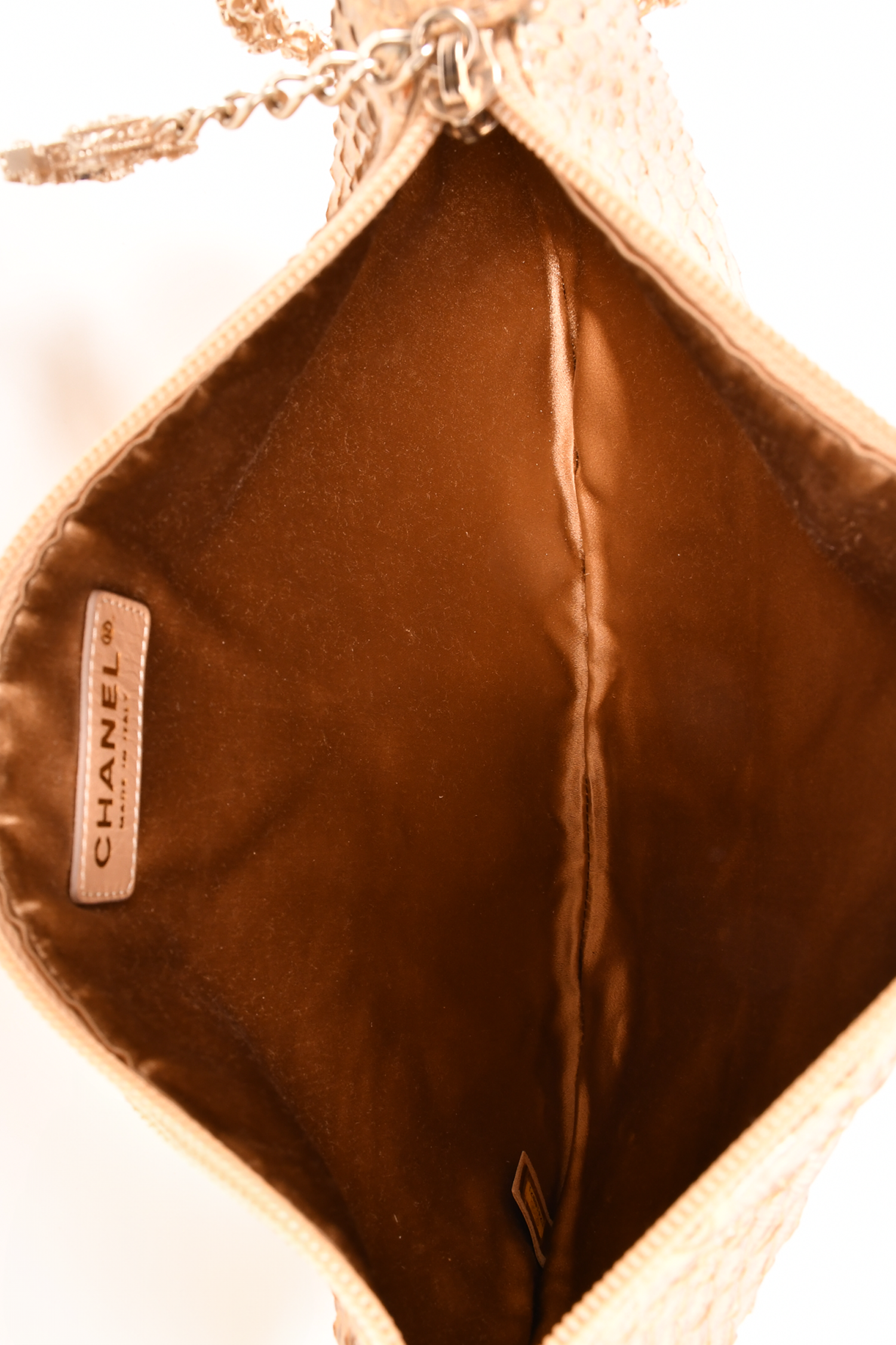 Pre-loved Chanel™ 2012/13 Gold Python Leather Fortune Cookie Clutch Bag. Top zip closure. Tonal textile interior lining. Open interior. Gold-tone hardware. Tonal stitching.