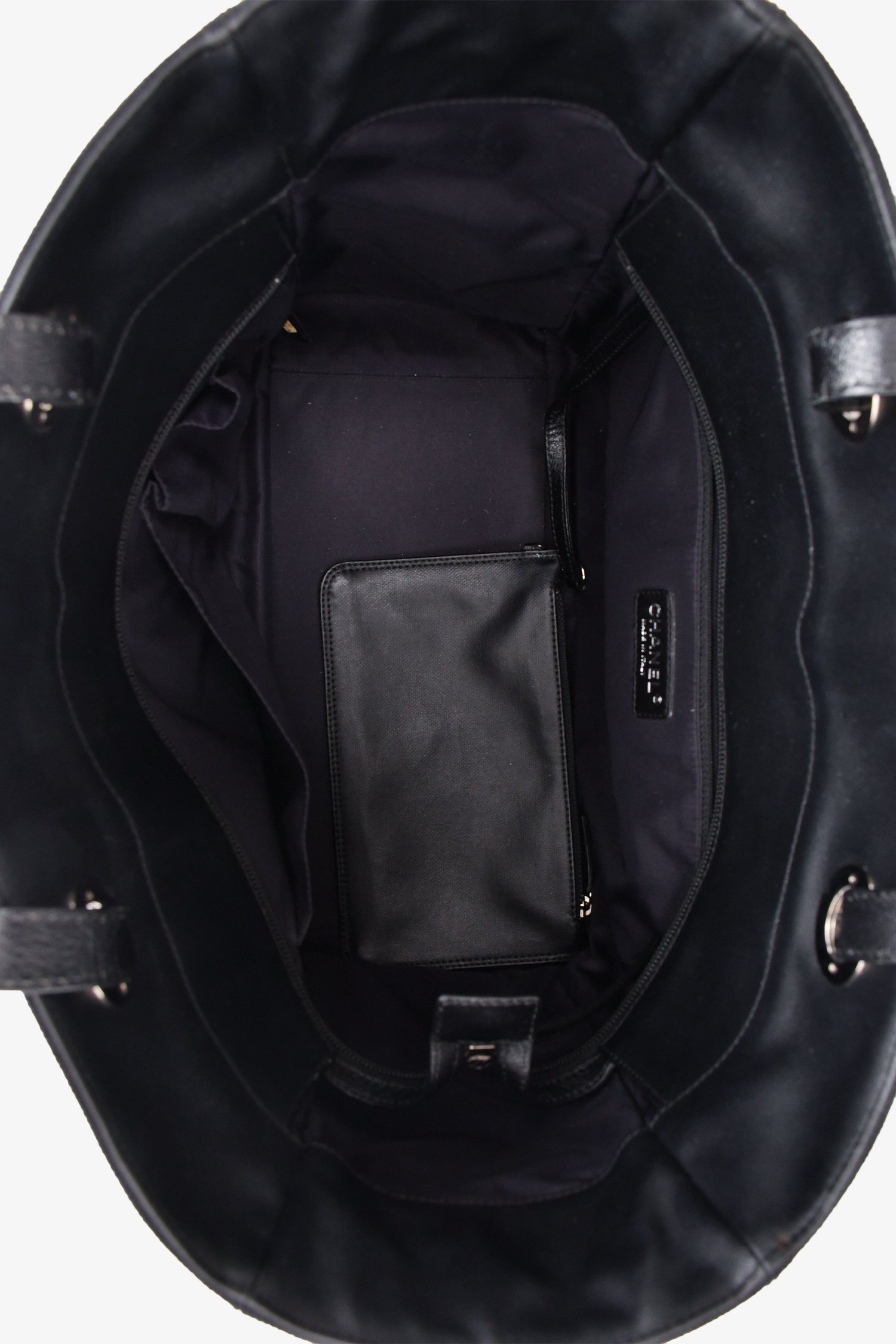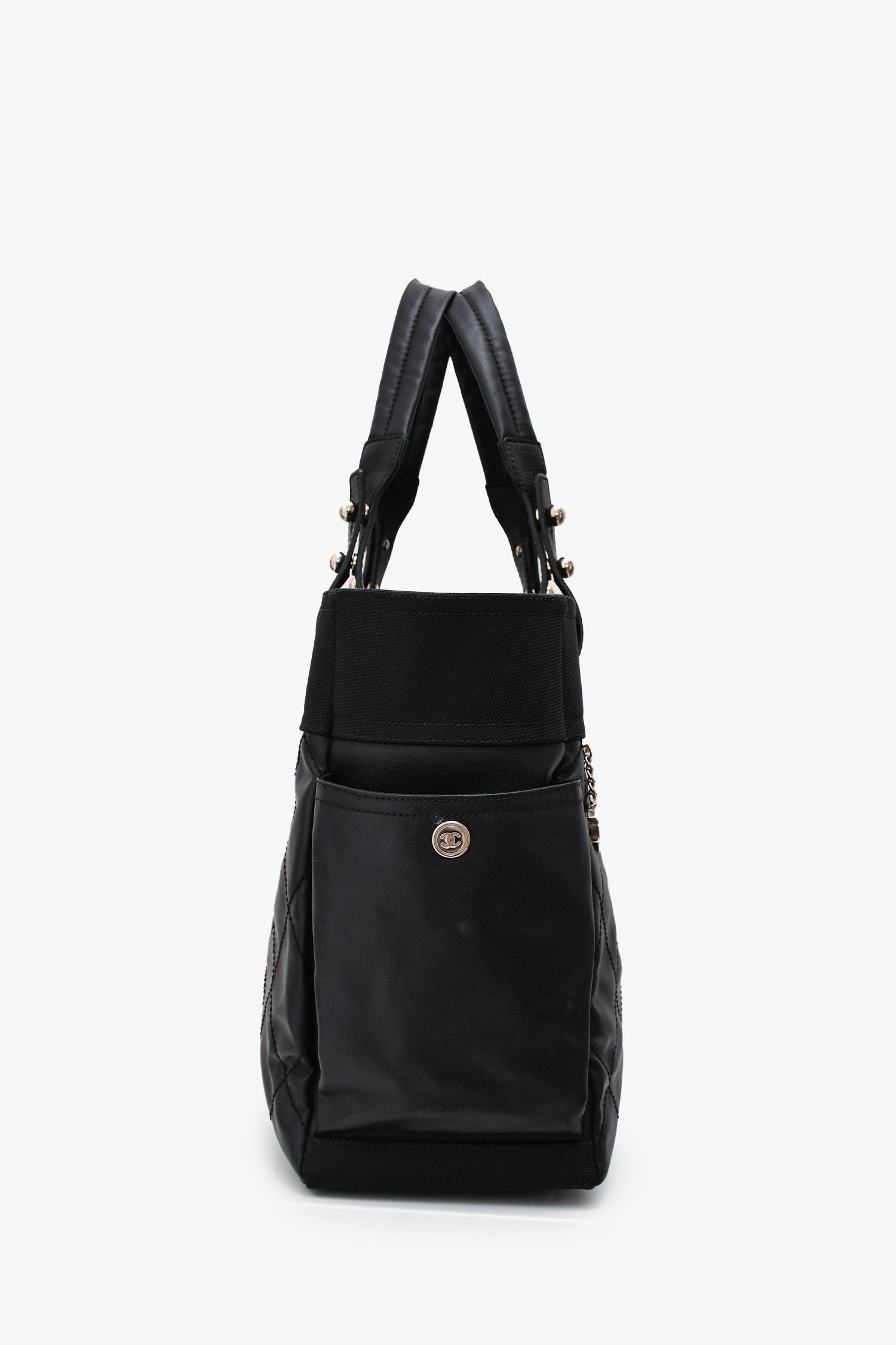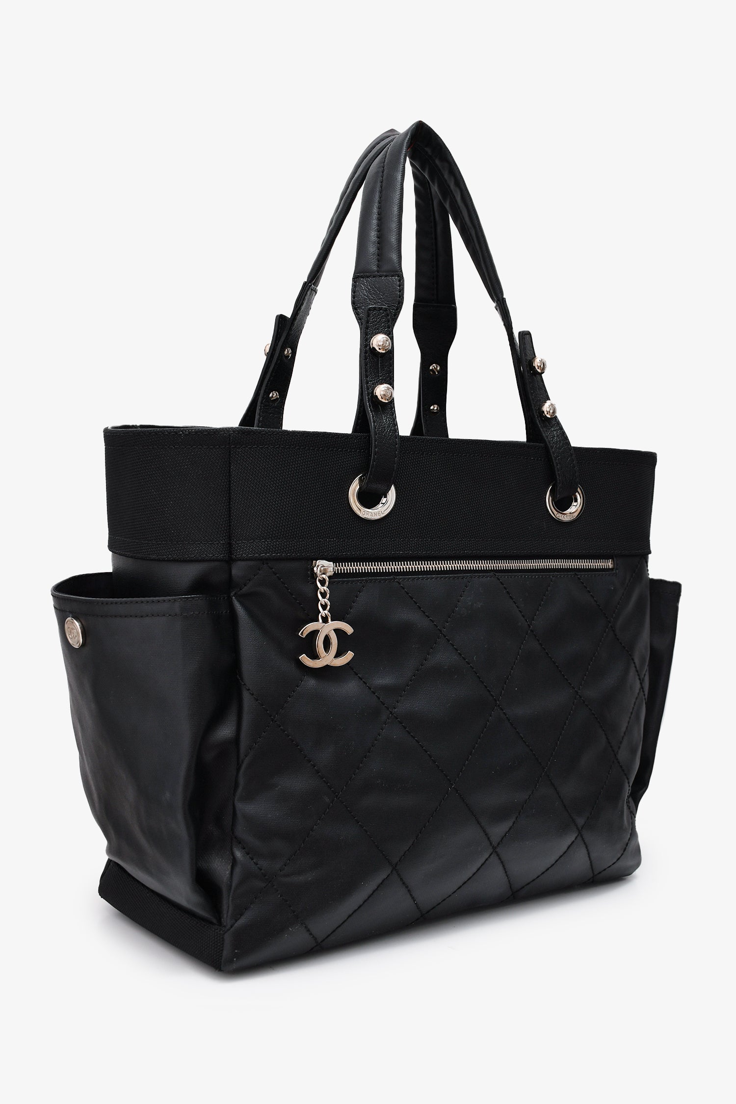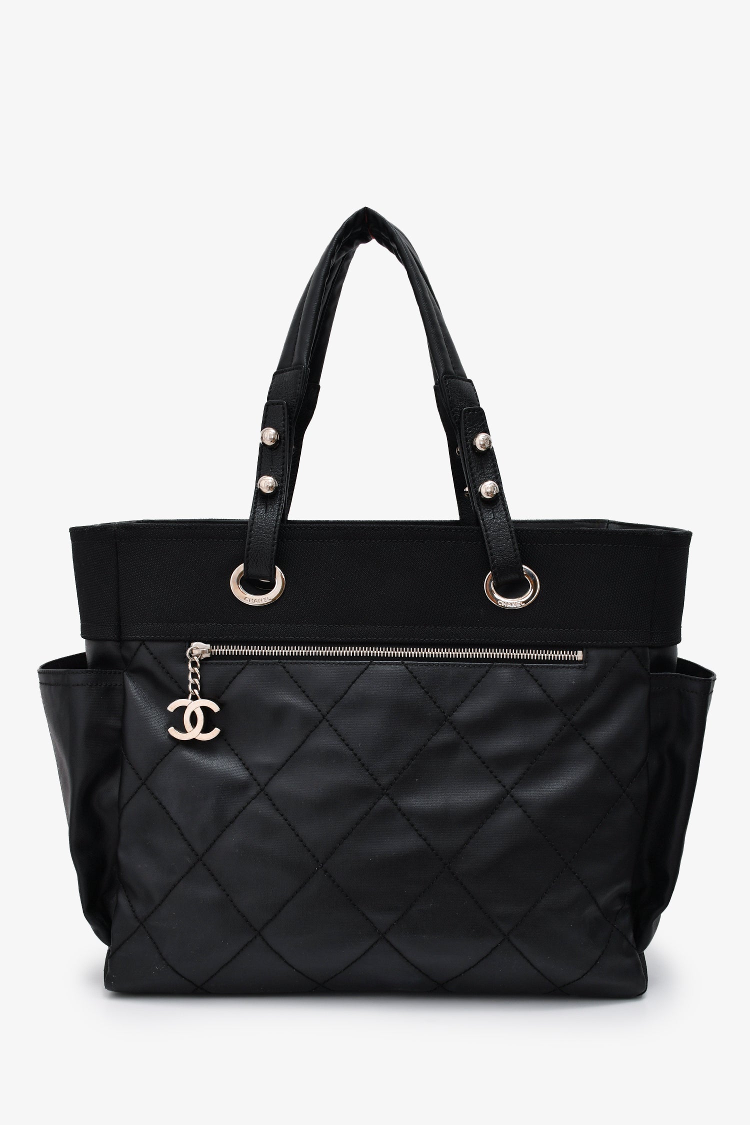 Pre-Loved Chanel™ 2012 Black Leather/Canvas 'Paris Biarritz' Tote Bag. Dual handles. Exterior side pockets with magnetic closure. Interior top zip closure. 3 interior wall pockets; 2 slip and 1 with zip closure. Detachable interior zip pouch. Silver-tone hardware.