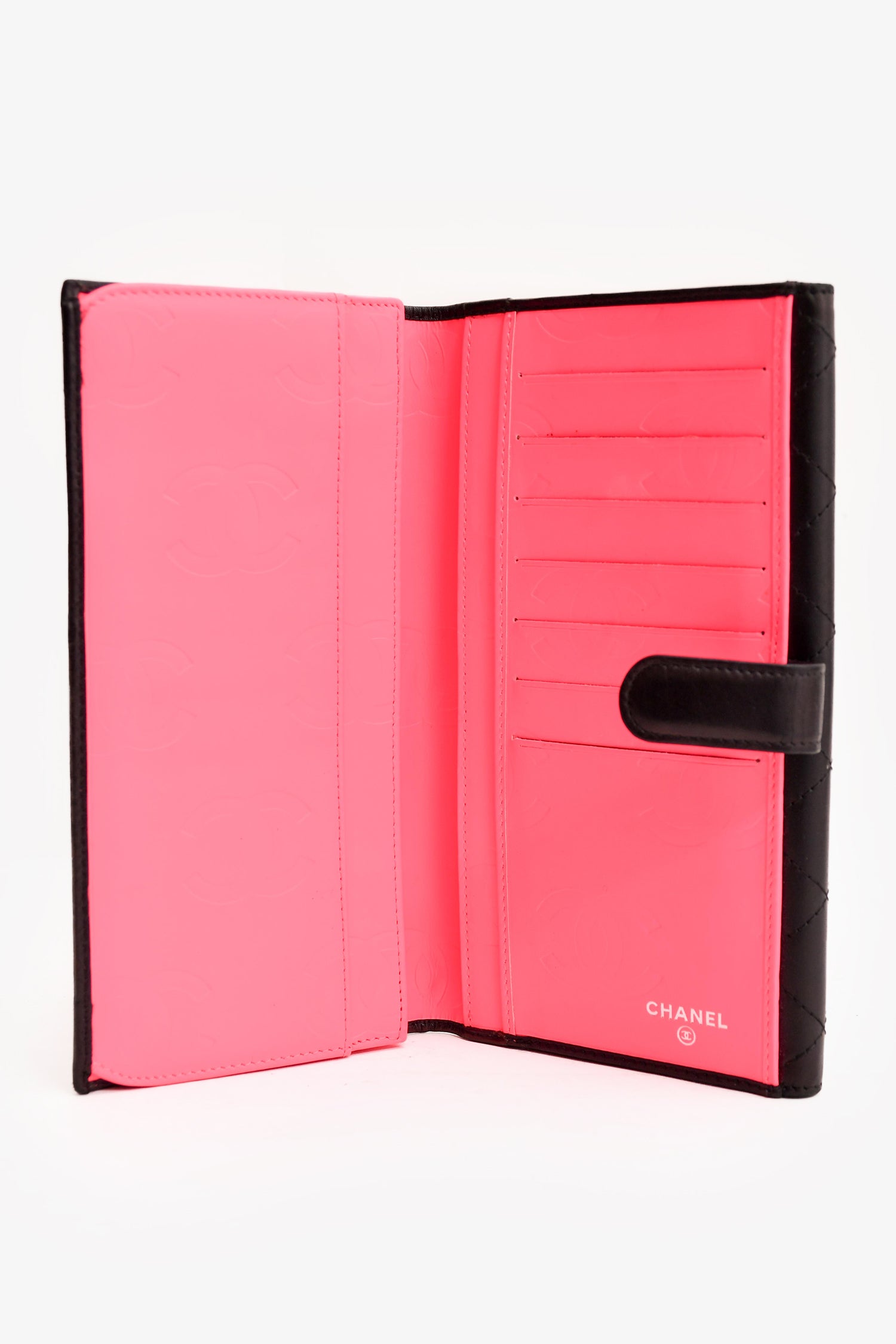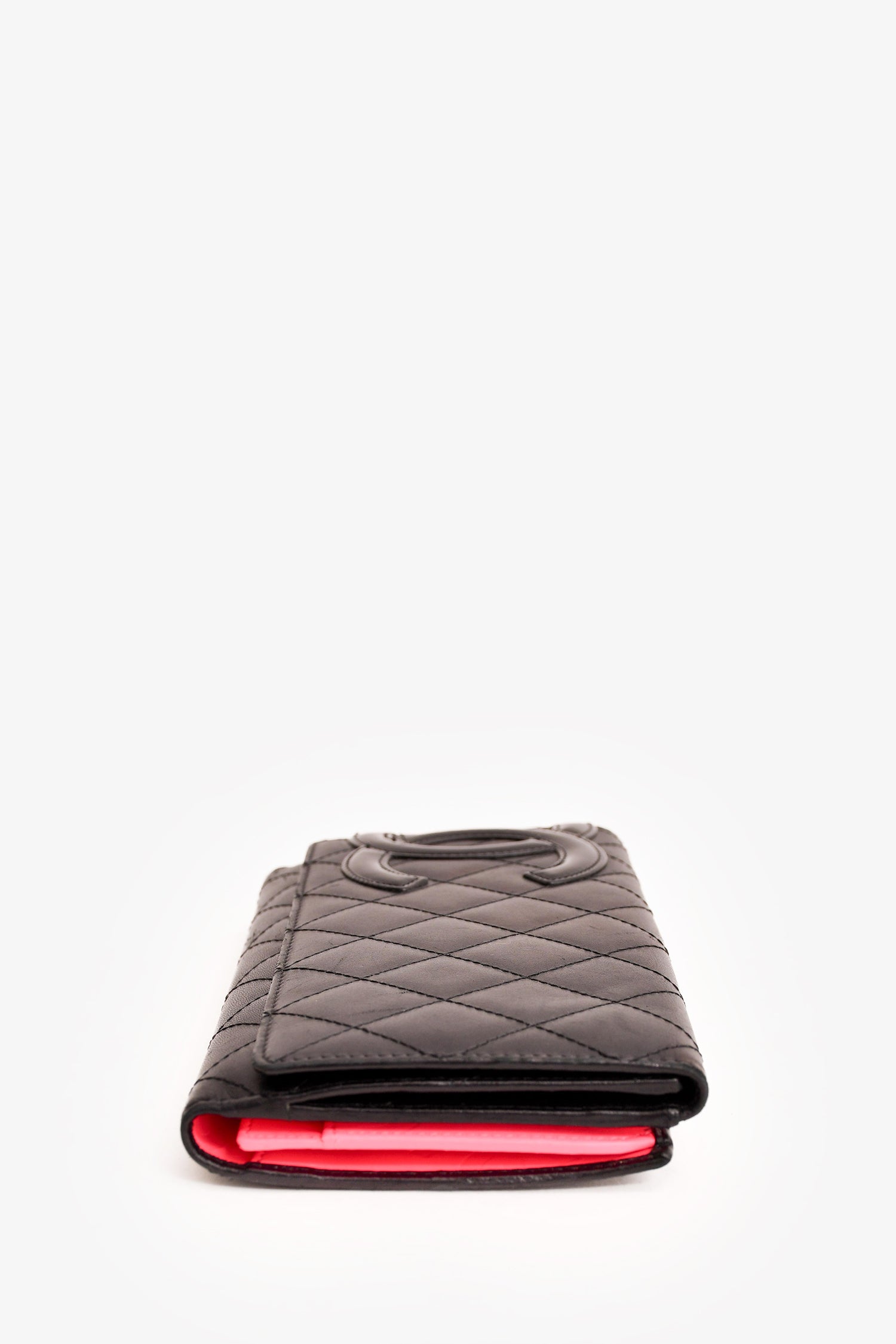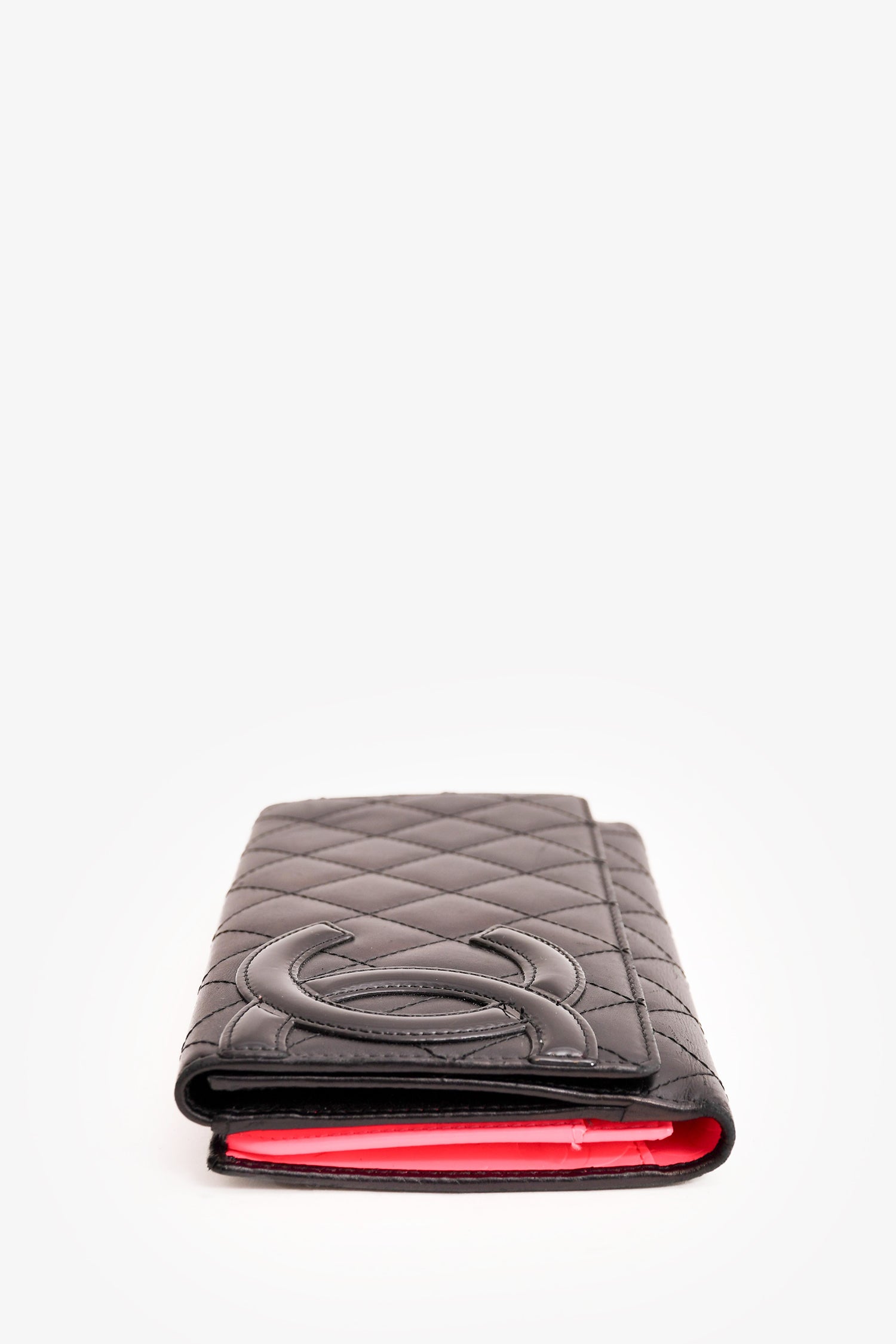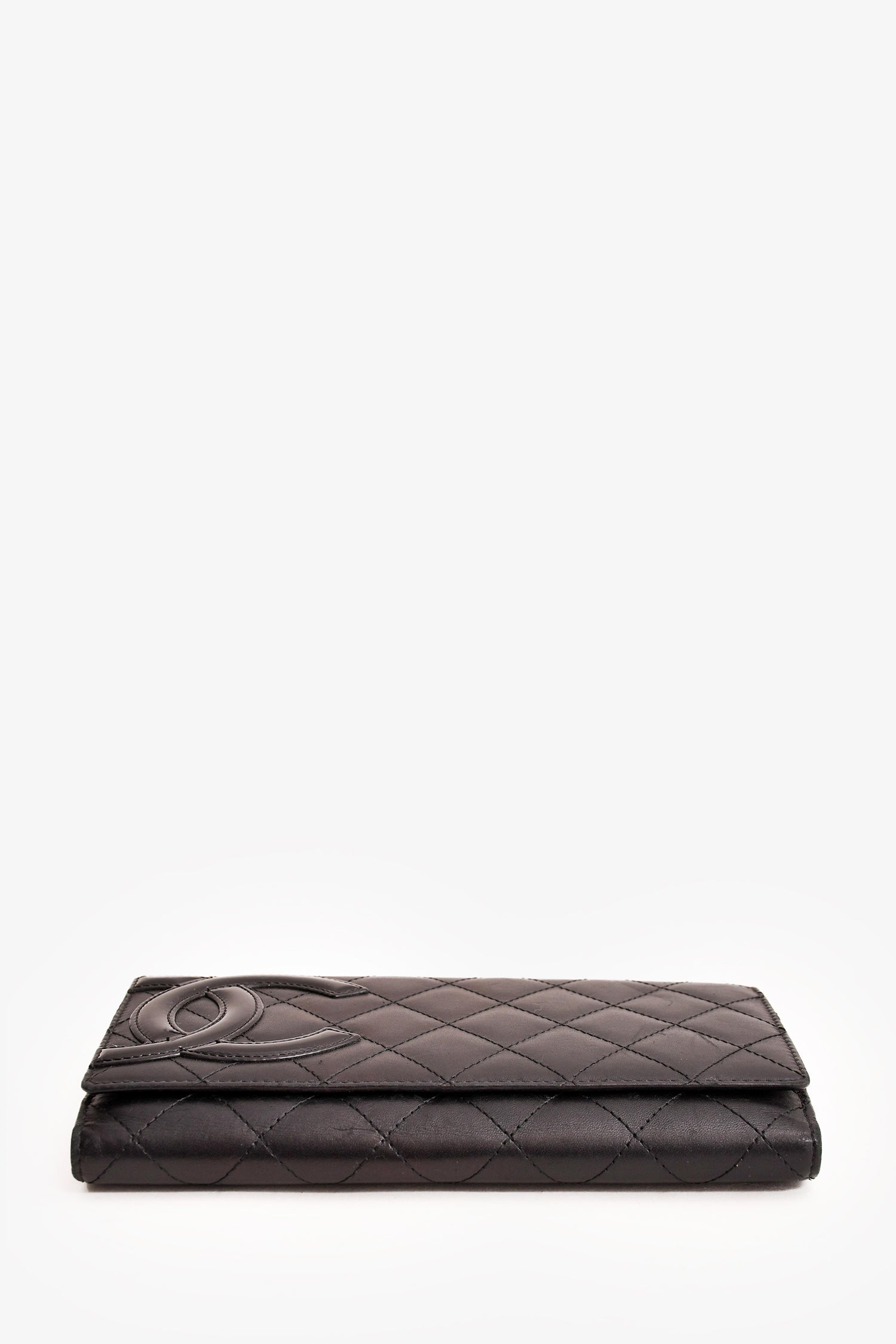 Pre-Loved Chanel™ 2012 Black Quilted Leather Cambon Wallet. Silver-tone hardware. Snap-on button closure for front and back. Four interior compartments. One exterior compartment. Seven cardholders. Interior "CC" monogram. Front patent logo detailing. Tonal stitching.