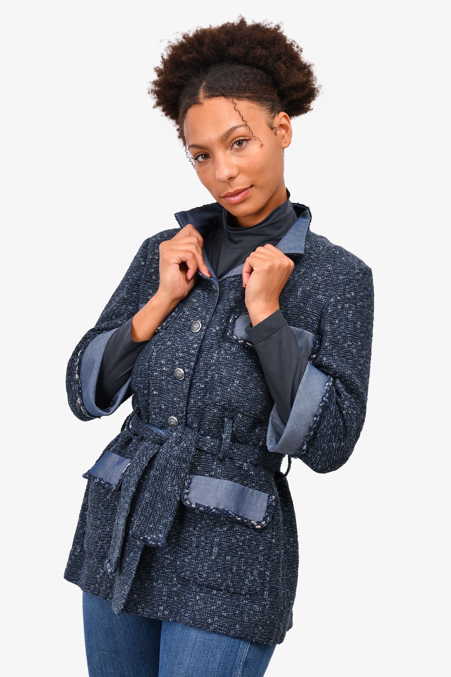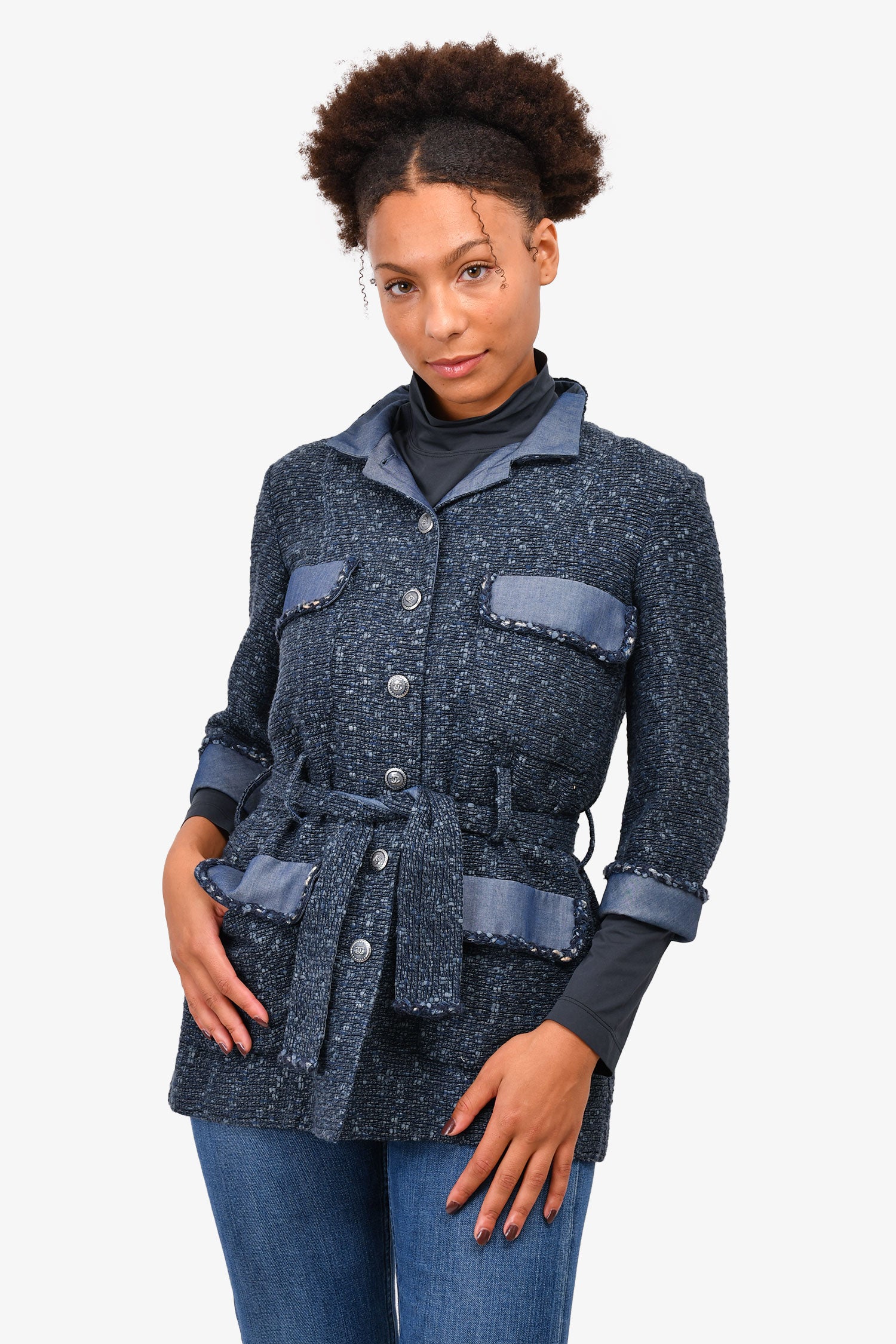 Refresh availabilityPre-Loved Chanel™ 2012 Navy Tweed Belted Blazer Jacket. Unlined interior. Antiqued silver-tone hardware.