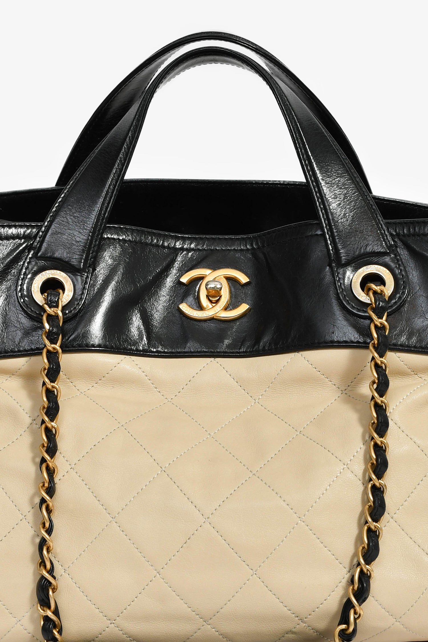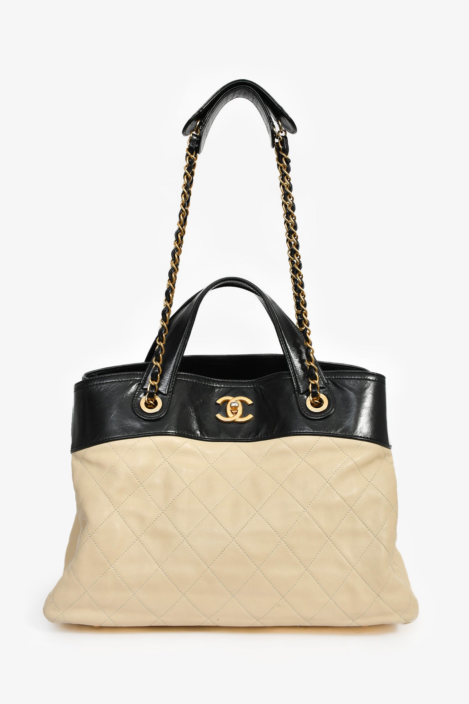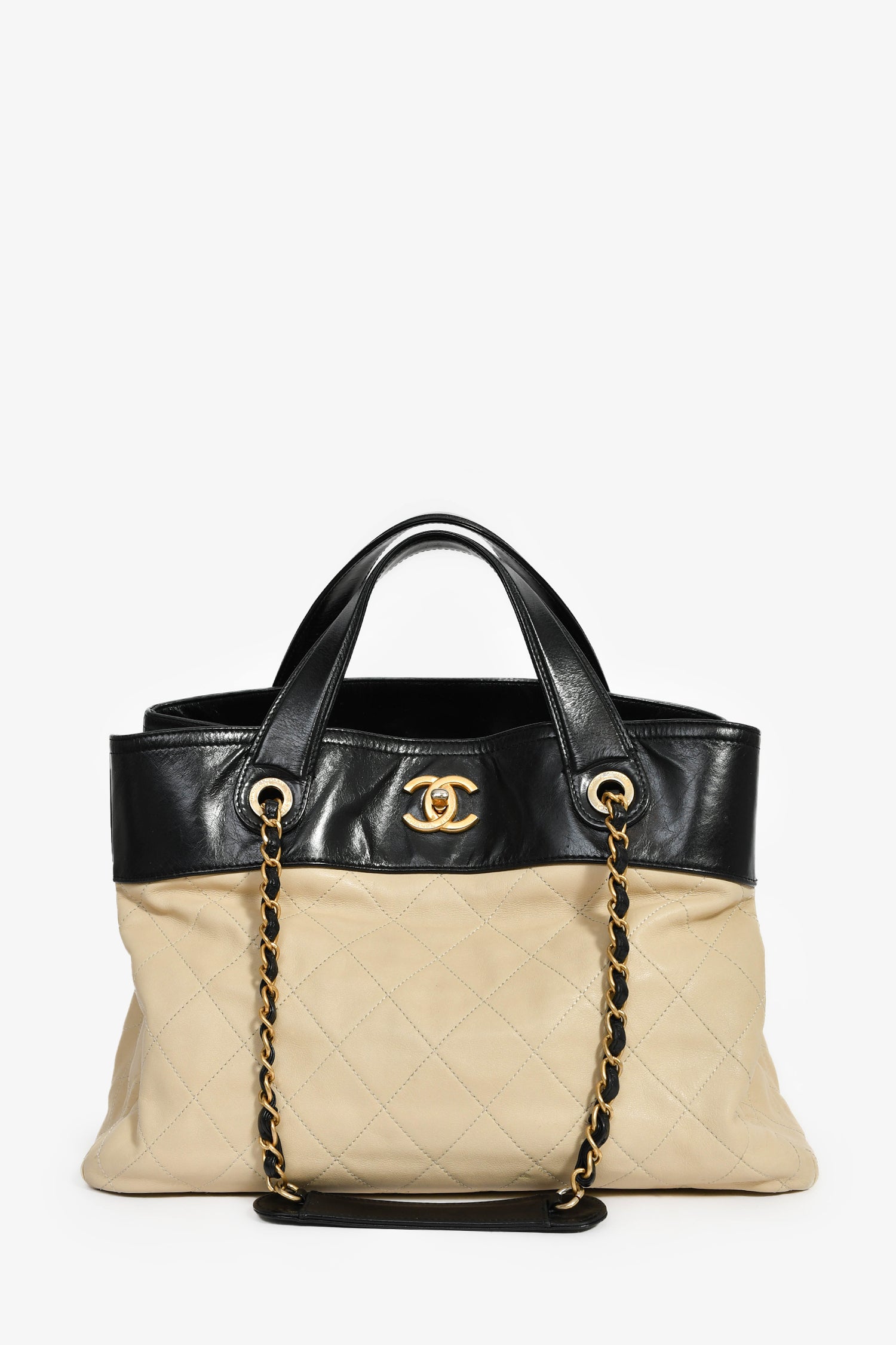 Refresh availabilityPre-Loved Chanel™ 2012/13 Cream/Black Quilted Calfskin In The Mix Tote Bag. Dual shoulder and top handles. Top fold-over flap turn-lock closure. 4 interior compartments: 1 front compartment with 2 wall slip pockets; a middle zip slot; 1 rear compartment with a wall zip pocket. Protective base studs. Gold-tone hardware. Tonal stitching.
