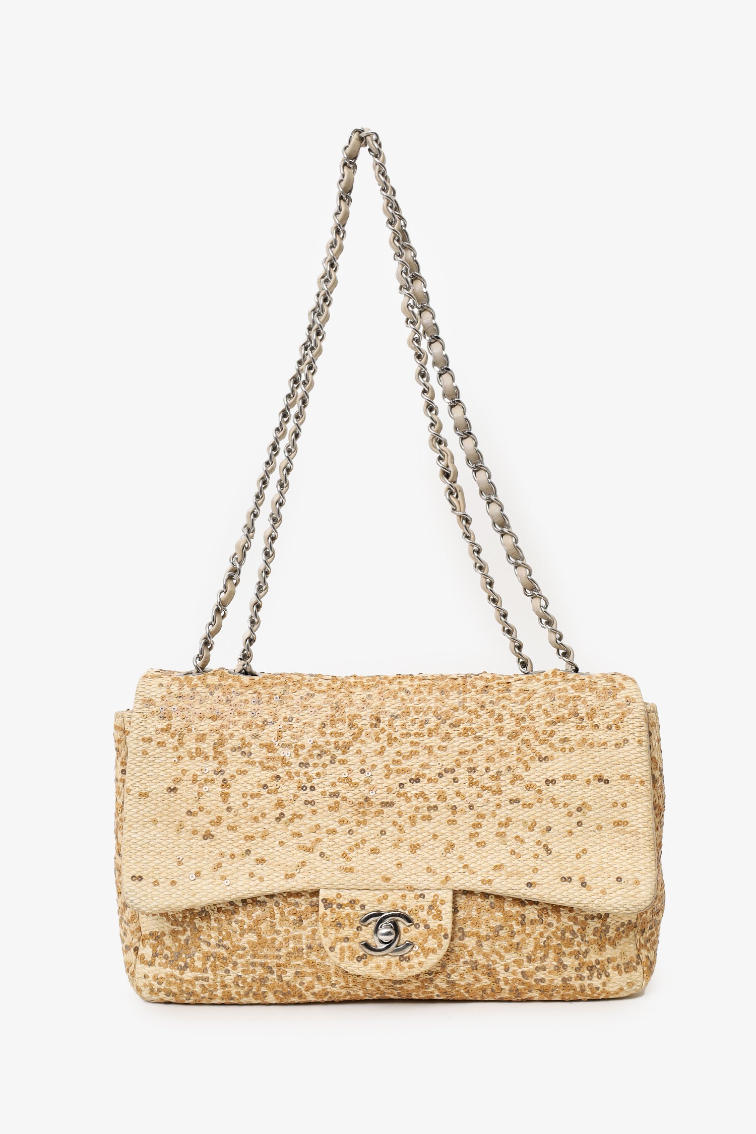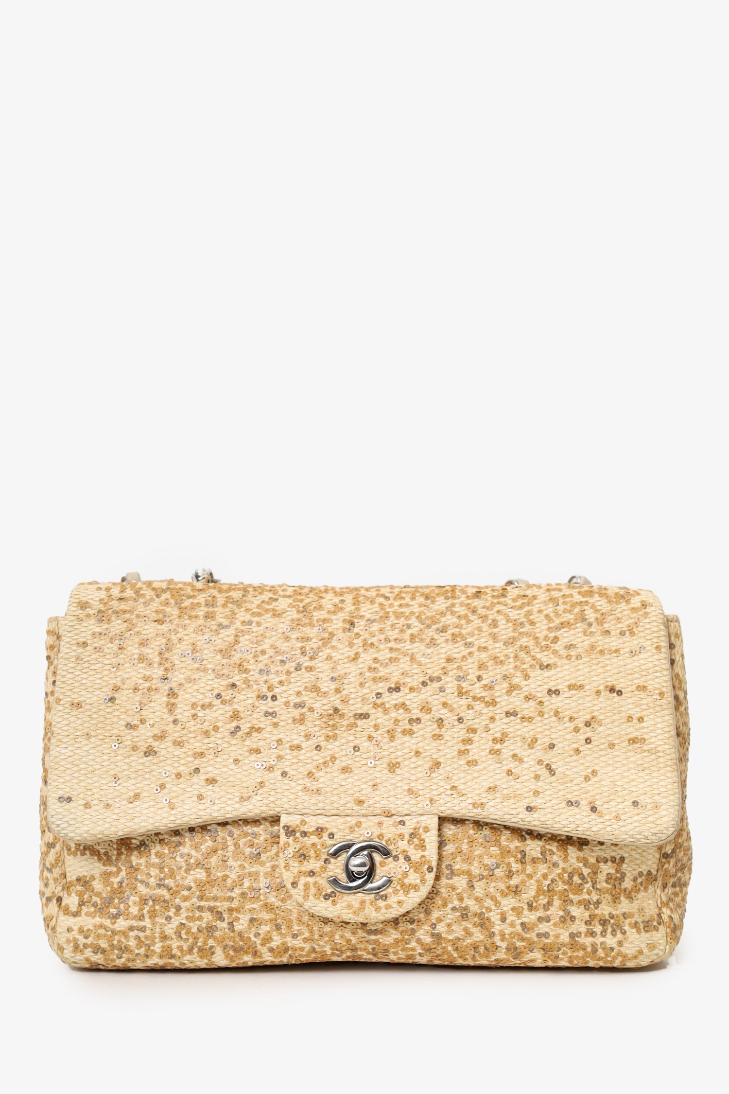 Refresh availabilityPre-Loved Chanel™ 2013-14 Beige Raffia Sequin Small Single Flap Bag. Front fold-over flap with turn-lock closure. Twin chainlink strap that can be pulled into one long strap. Leather-lined interior. 2 interior pockets; 1 zip and 1 slip. Silver-tone hardware. Tonal stitching.