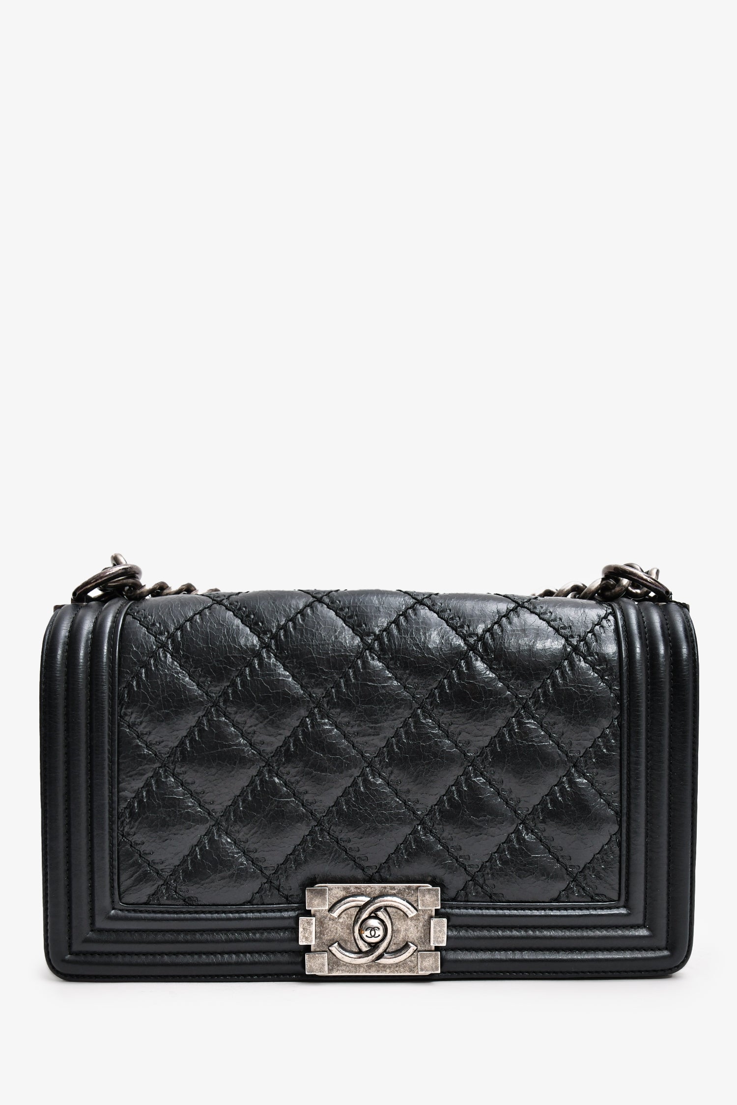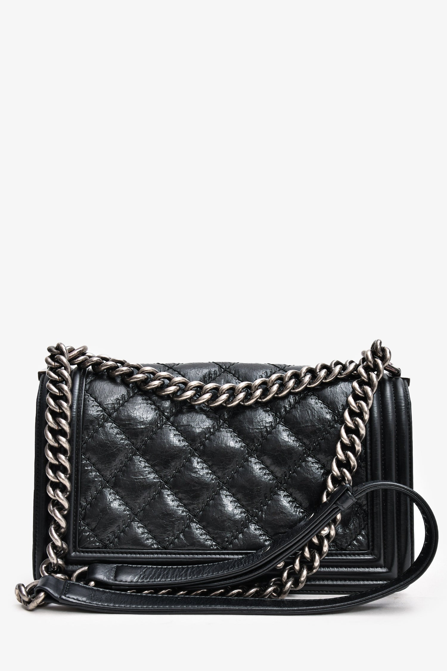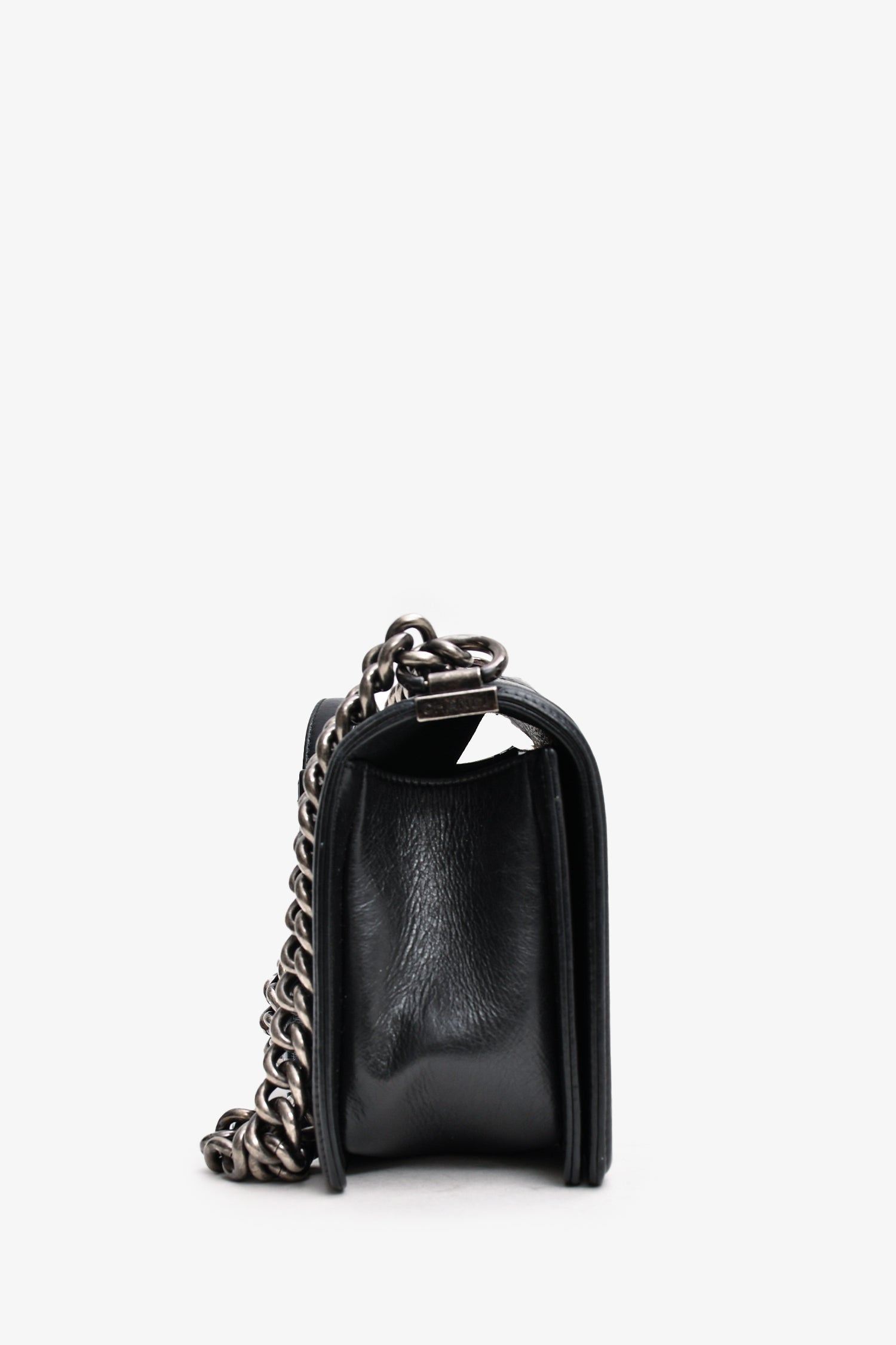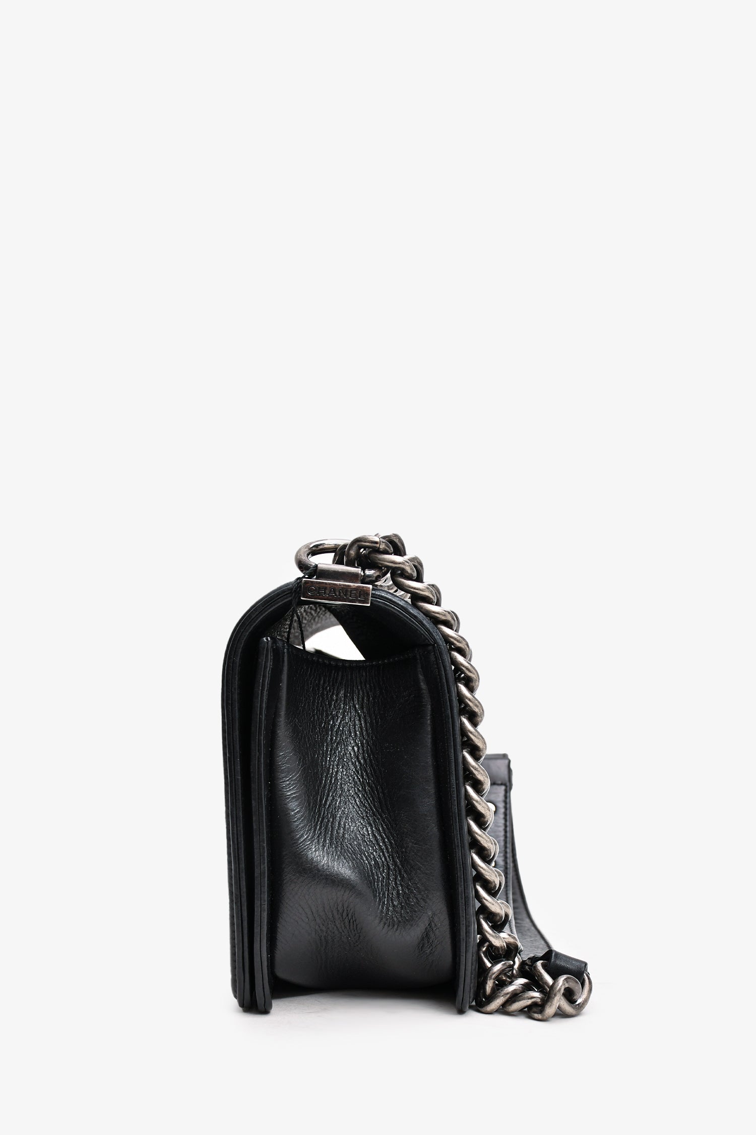 Refresh availabilityPre-Loved Chanel™ 2013-14 Black Calfskin Leather Medium Boy Bag. Front fold-over flap with pinch-lock closure. Tonal textile interior lining. Single interior wall slip pocket. Slide-around chain. Silver-tone hardware.