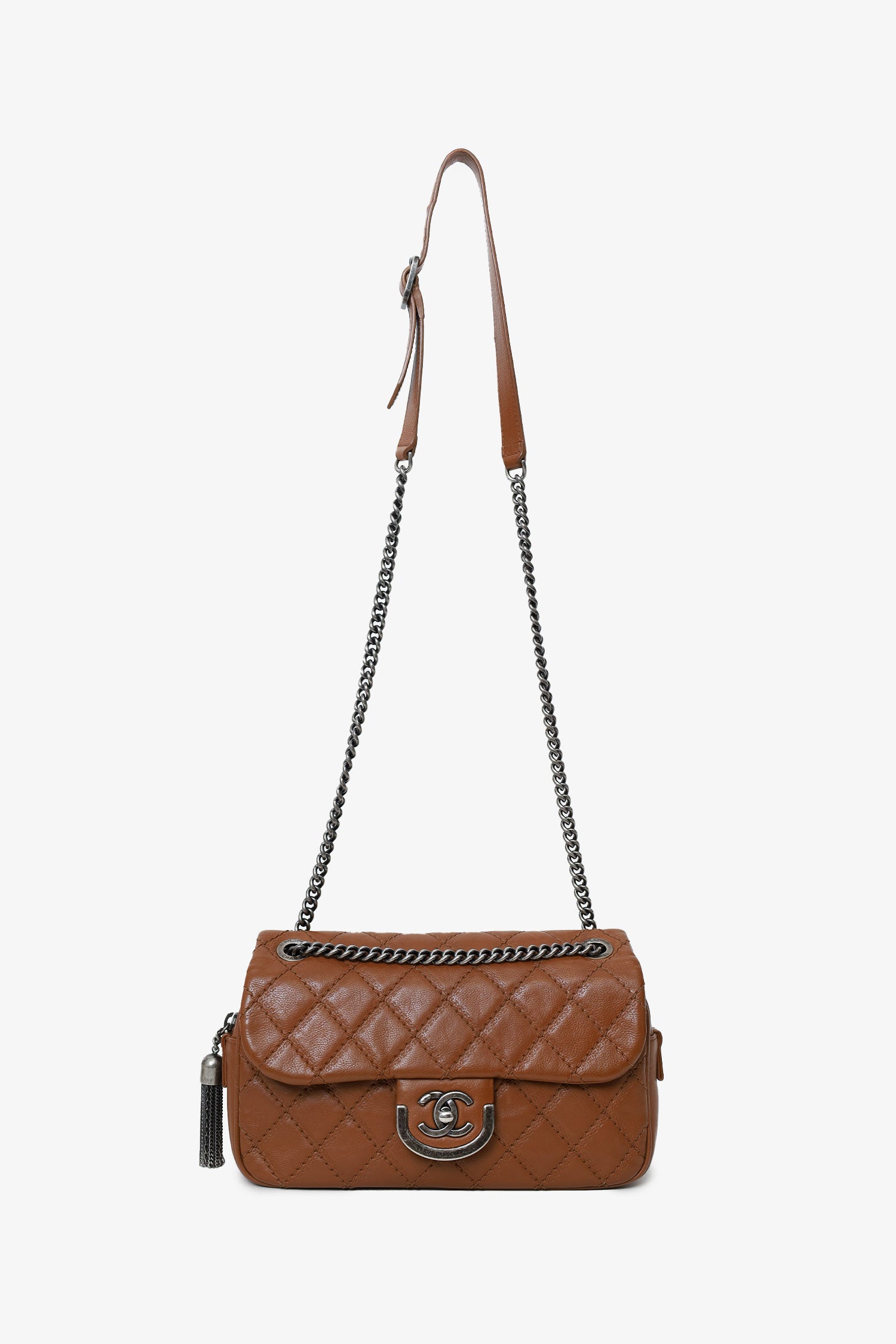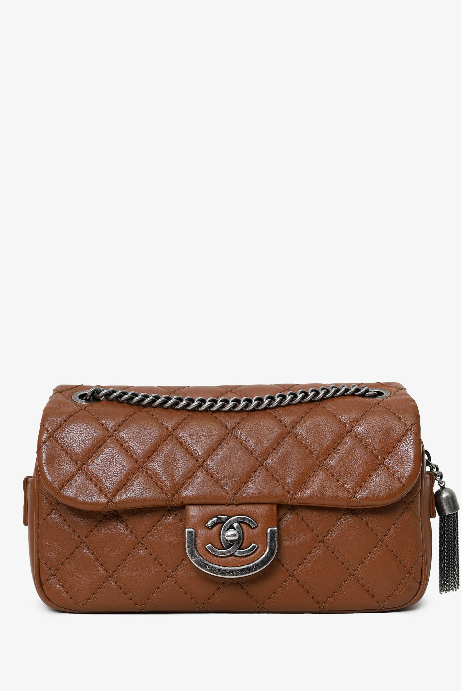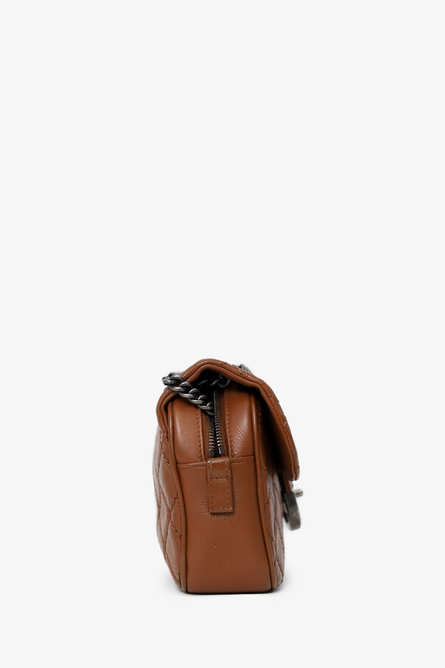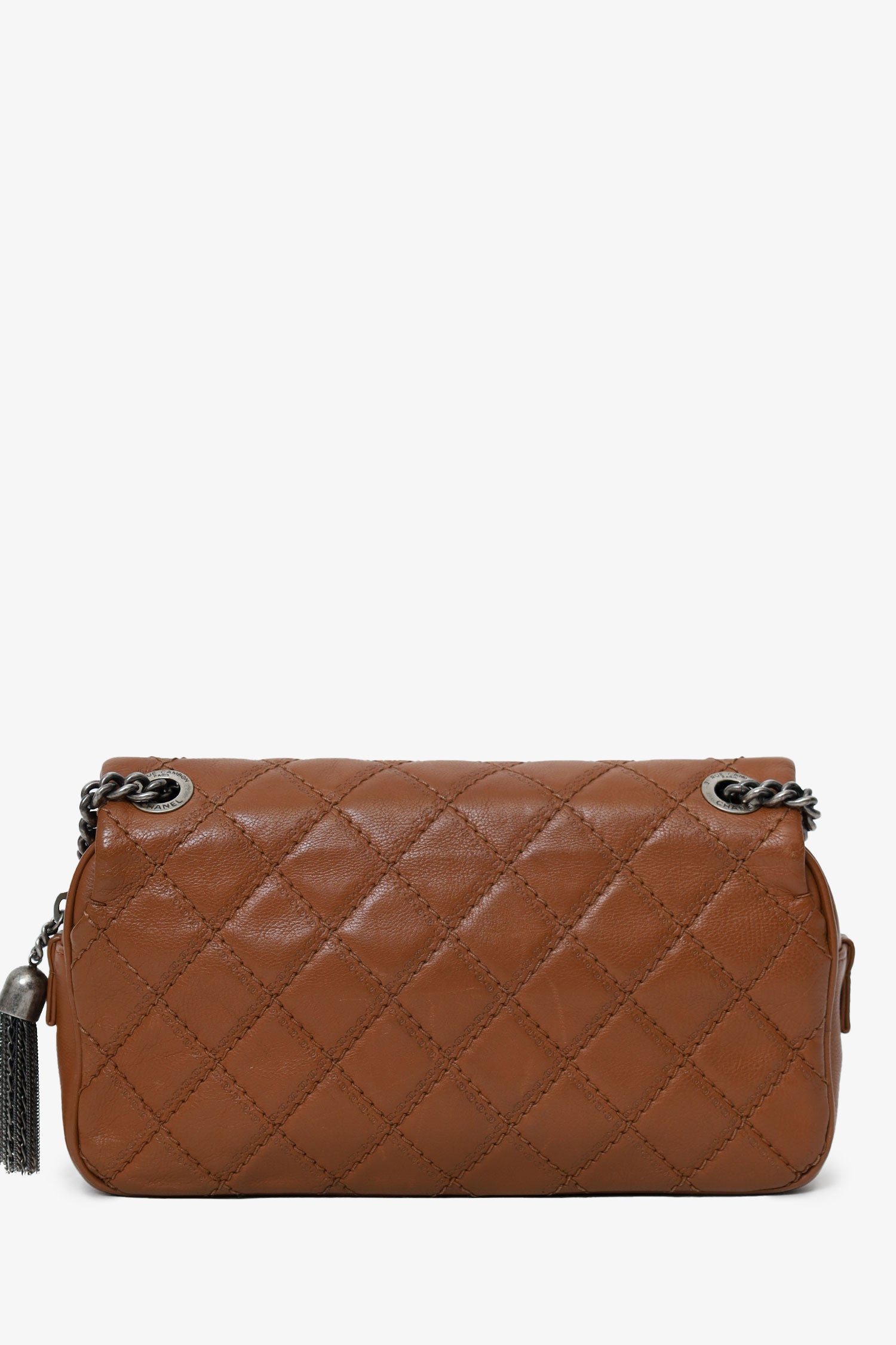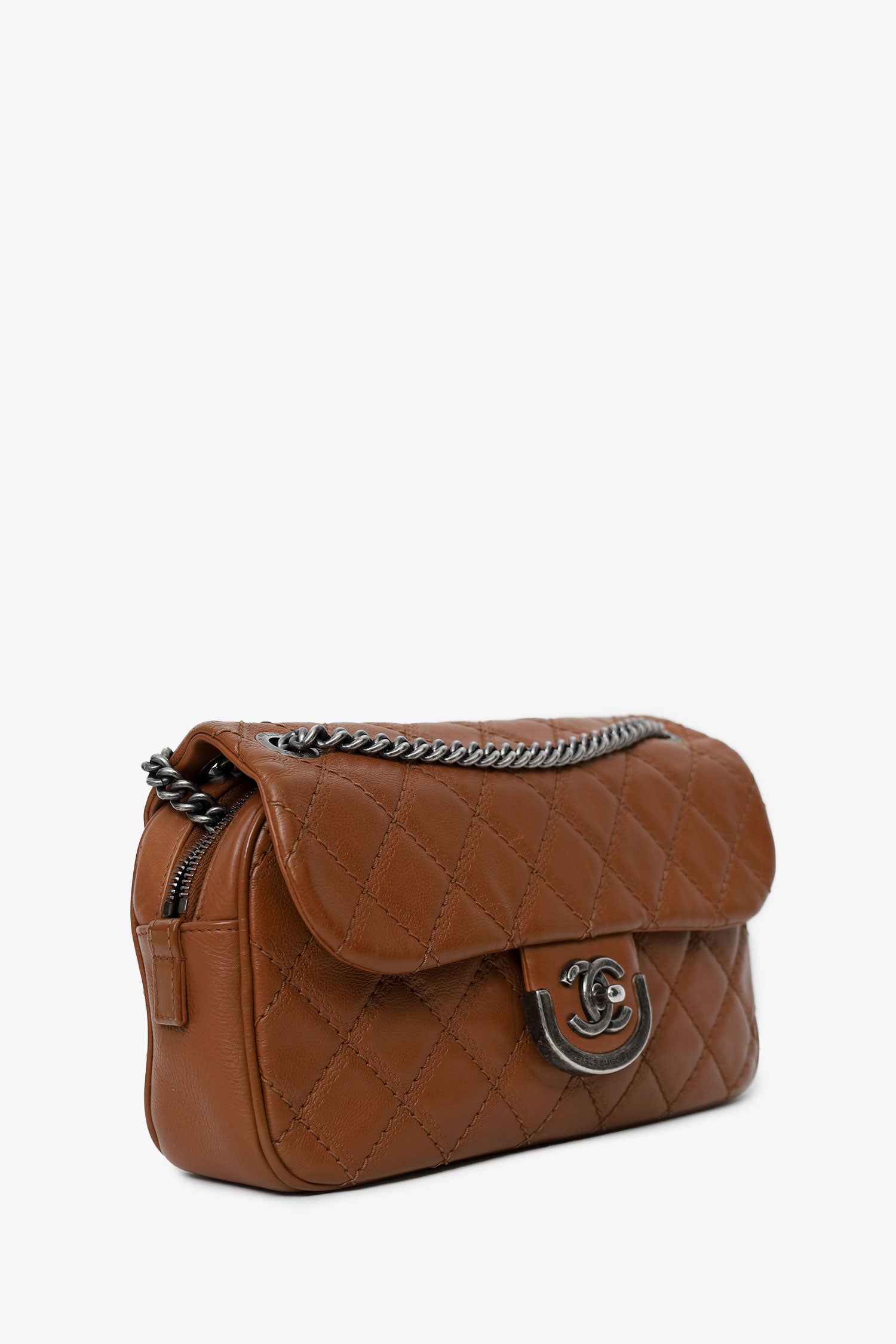Pre-Loved Chanel™ 2013-14 Brown Quilted Leather Medium Coco Sporran Shoulder Bag. Front fold-over flap with turn-lock closure. Twin chainlink strap that can be pulled into one longer strap. 2 interior compartments; front zip with single zip pocket and rear slip. Canvas-lined interior. Palladium-tone hardware. Tonal stitching.