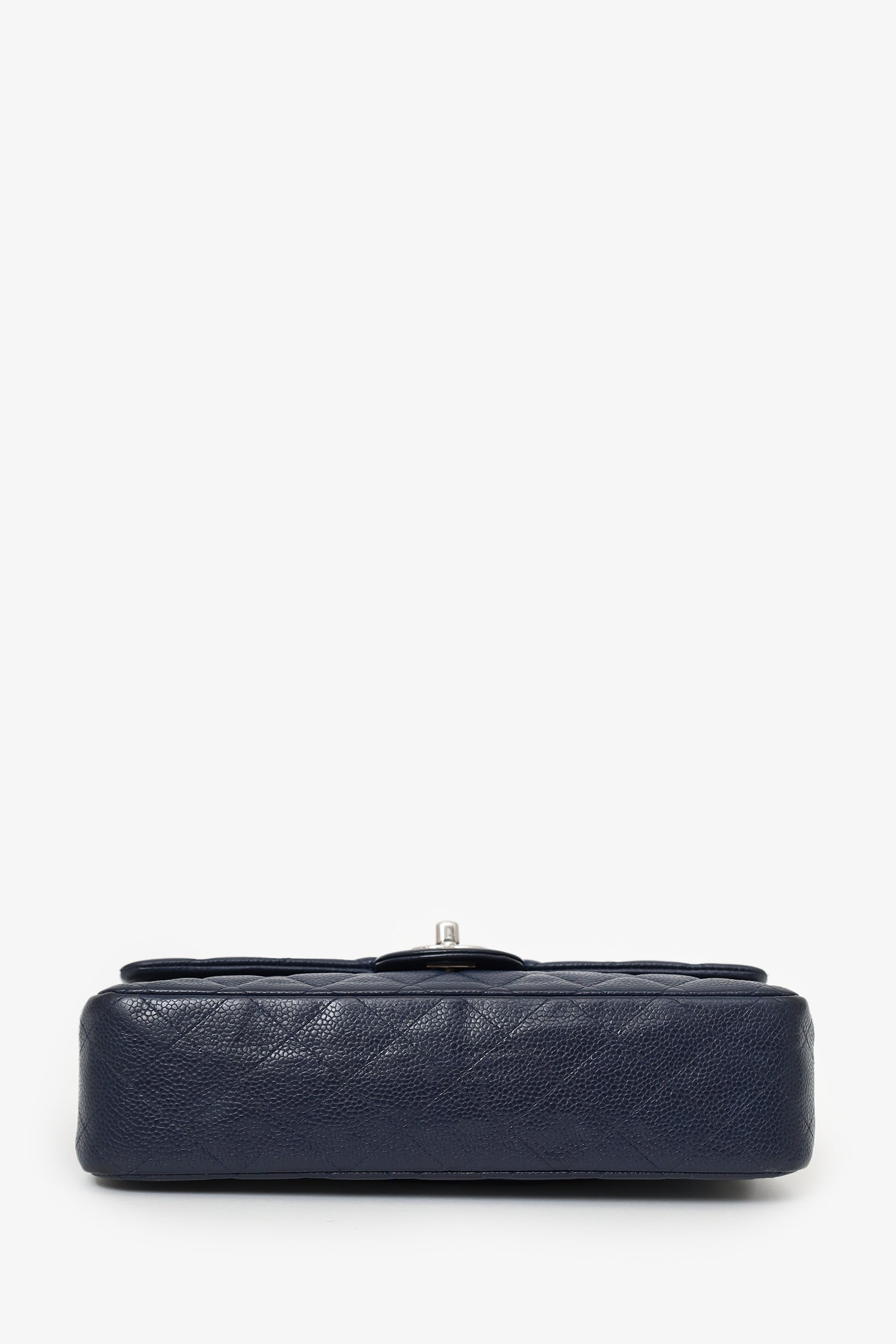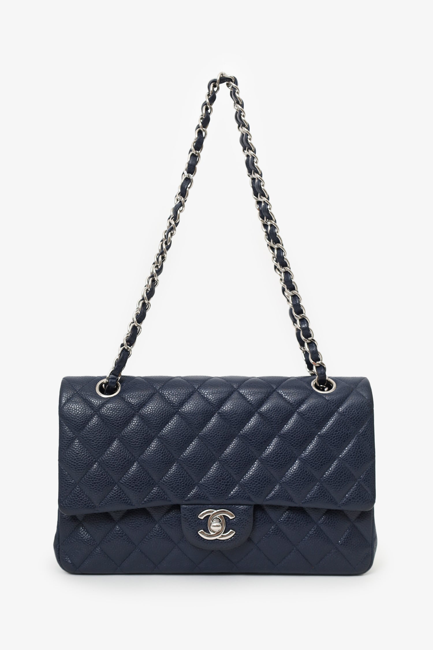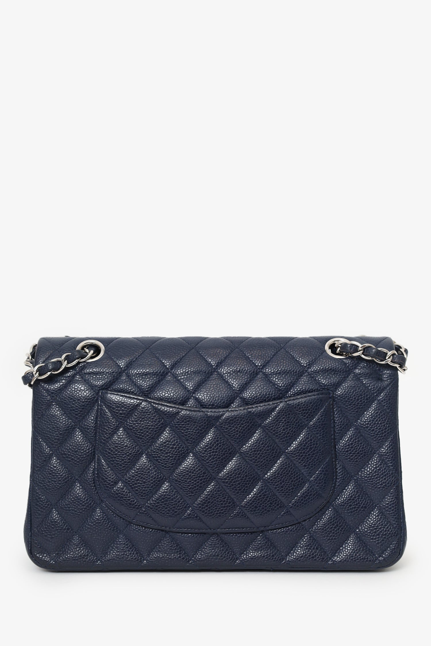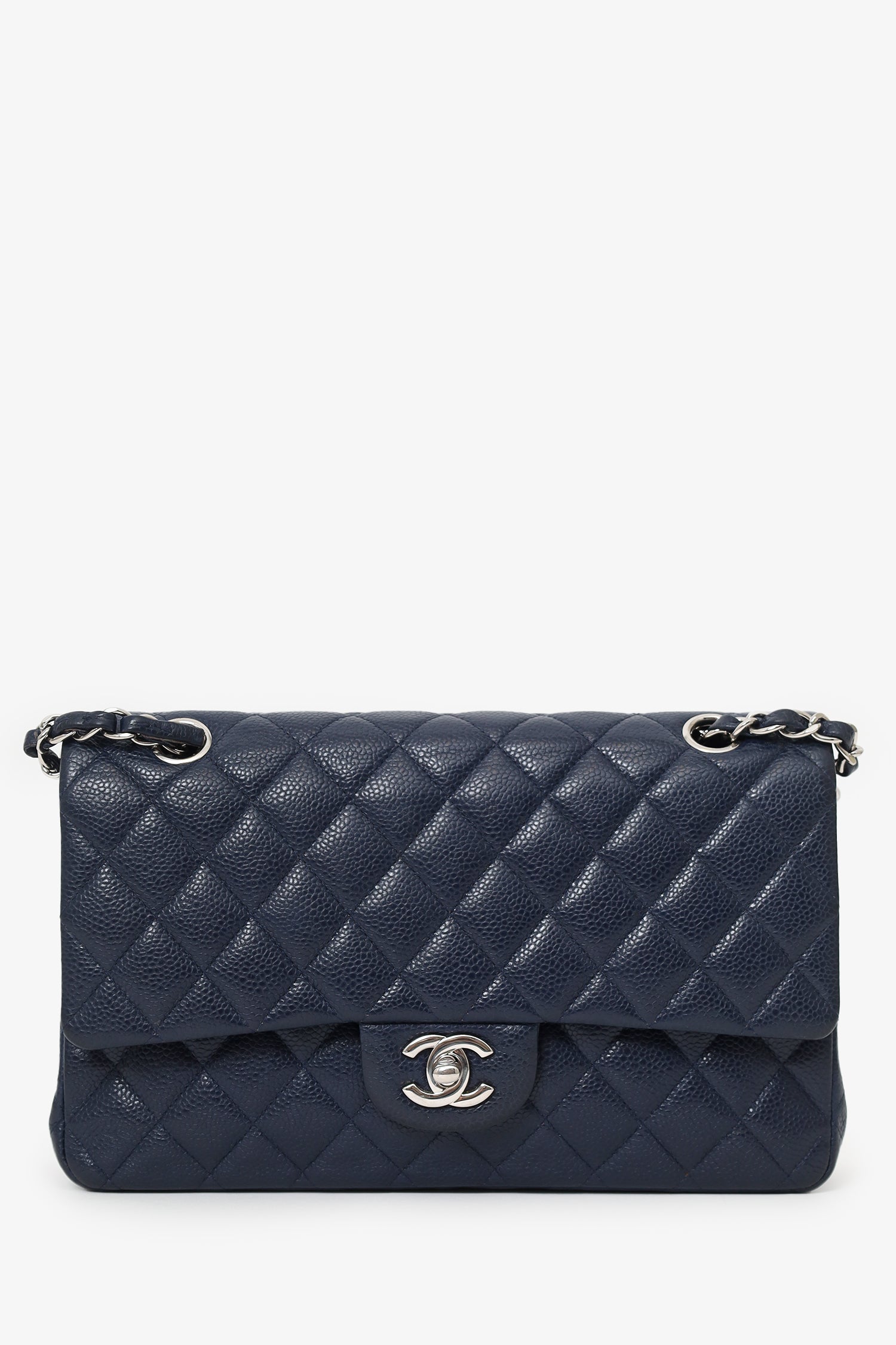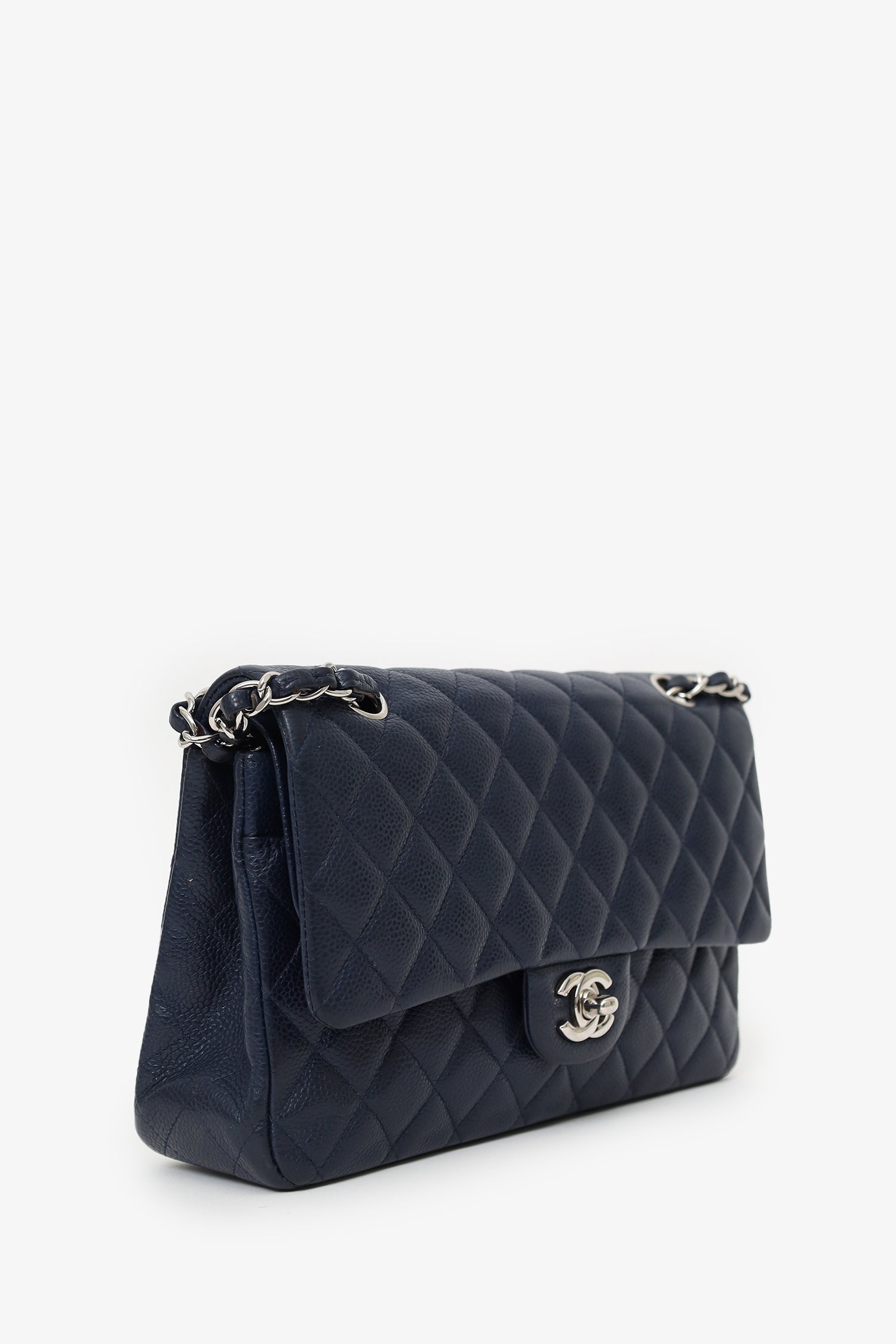 Pre-Loved Chanel™ 2013-14 Caviar Leather Medium Double Flap Bag. Front fold-over flaps; Outer flap with turn-lock closure, inner flap with snap button closure. Twin chainlink shoulder straps that can be pulled in and extended to one long strap. Rear exterior slip pocket. Leather-lined interior. 2 interior compartments; front compartment with 1 large open pocket. 2 interior slip pockets with single lipstick compartment. Back compartment has 1 zip pocket on underside of top fold-over flap. Silver-tone hardware. Tonal stitching.