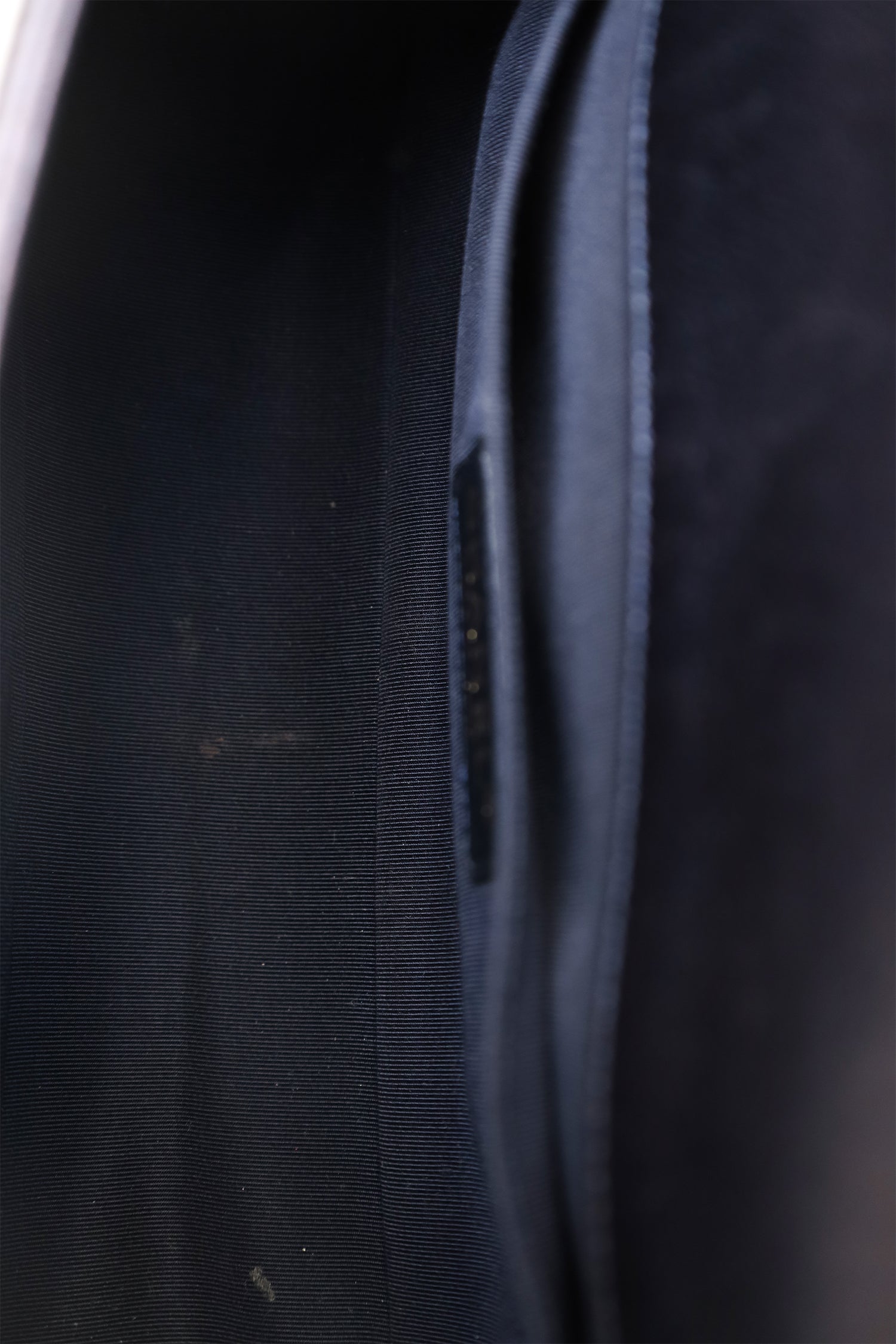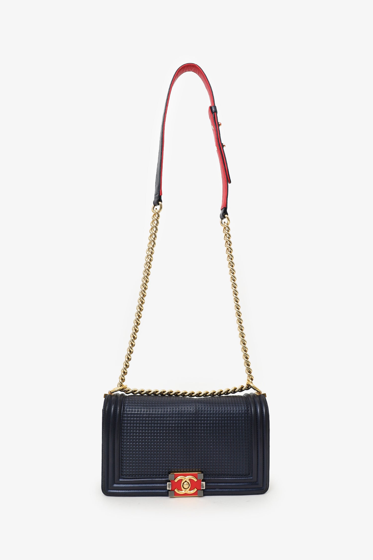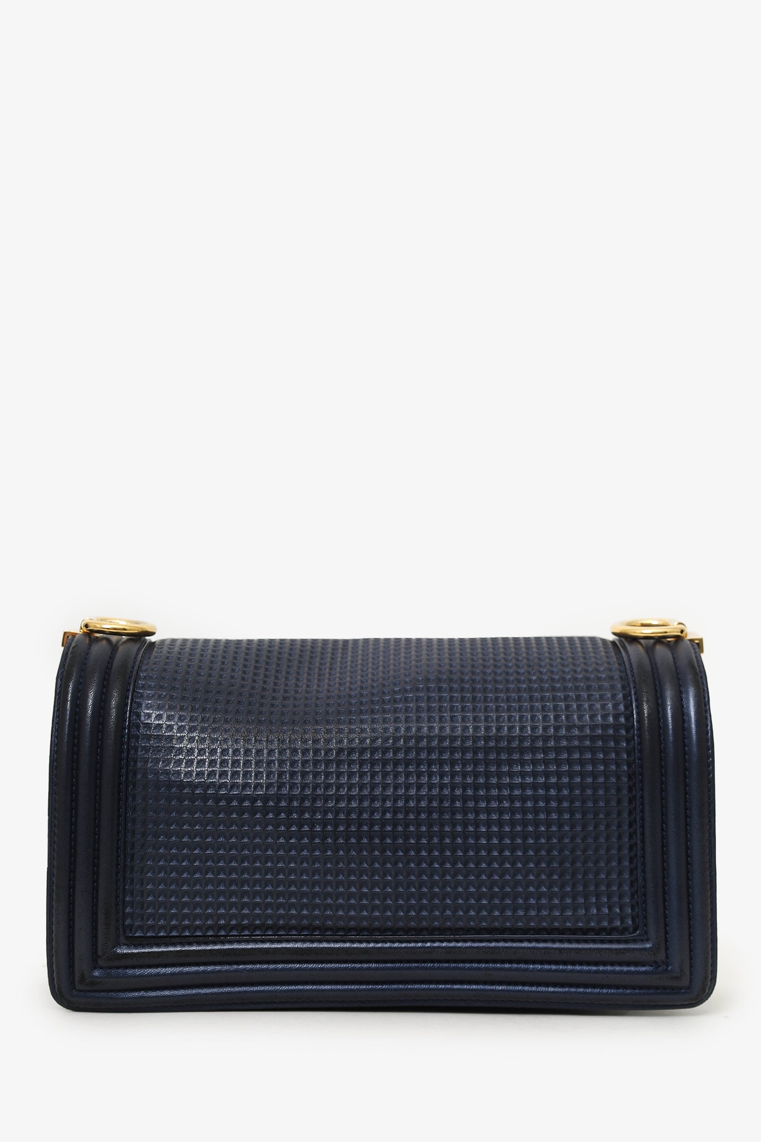 Pre-Loved Chanel™ 2013-14 Navy Lambskin Embossed Medium Cube Boy Shoulder Bag. Front fold-over flap with pinch-lock closure. Chainlink straps that can be pulled into one long strap. Lined interior. Single interior slip pocket. Gold-tone hardware. Tonal stitching.
