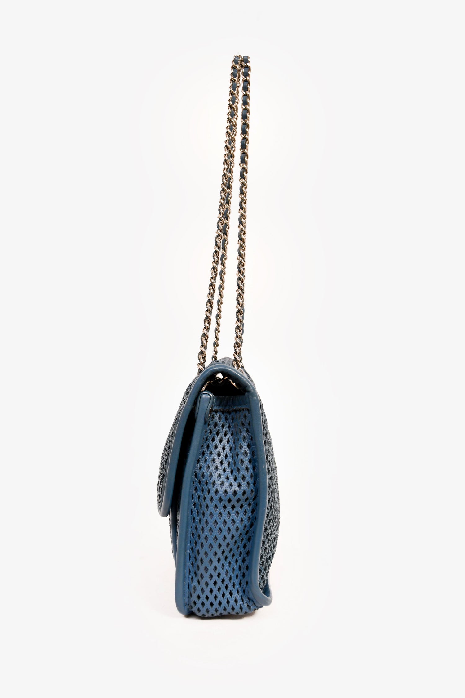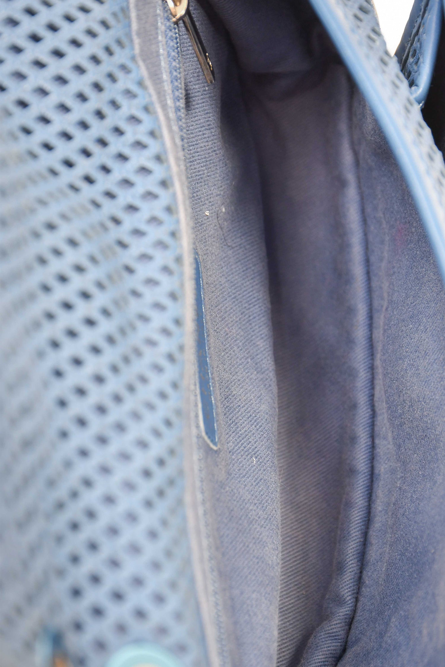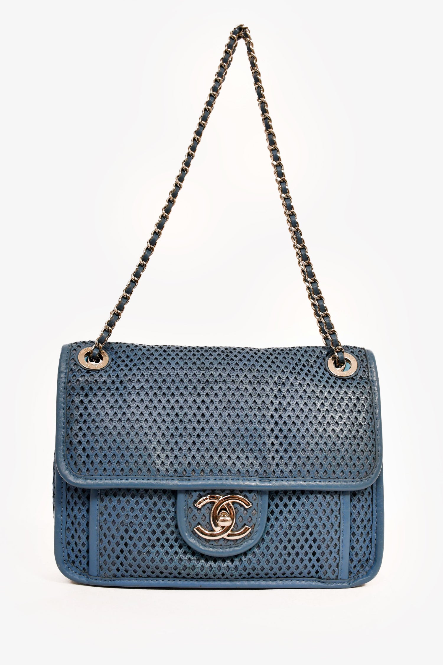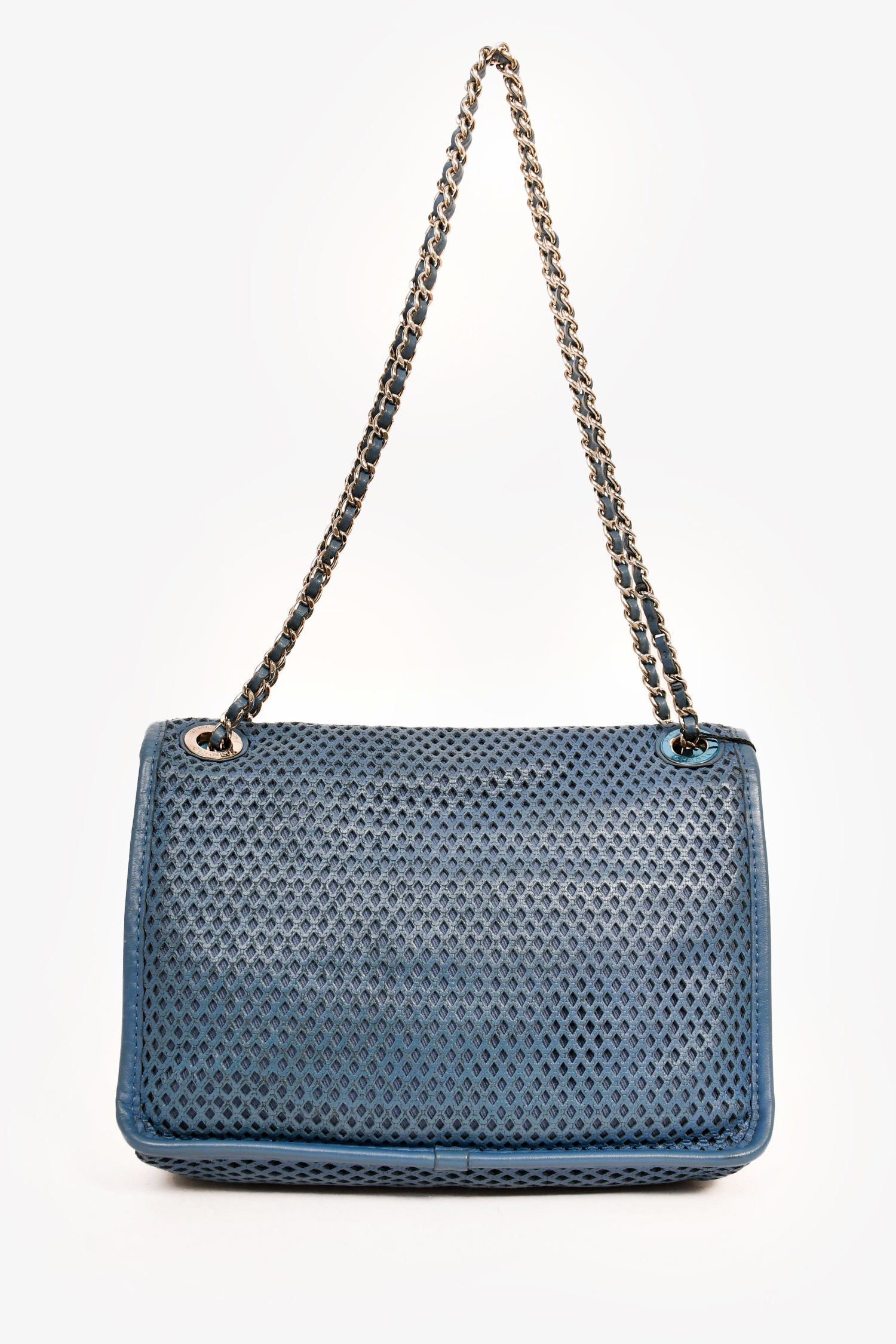 Refresh availabilityPre-Loved Chanel™ 2013C Blue Perforated 'Up In The Air' Small Front Flap Crossbody. Front fold-over flap with turn-lock closure. Slide-around chain strap. Front exterior slip pocket. Single interior compartment with a wall zip pocket. Tonal textile lining. Silver-tone hardware. Tonal stitching.