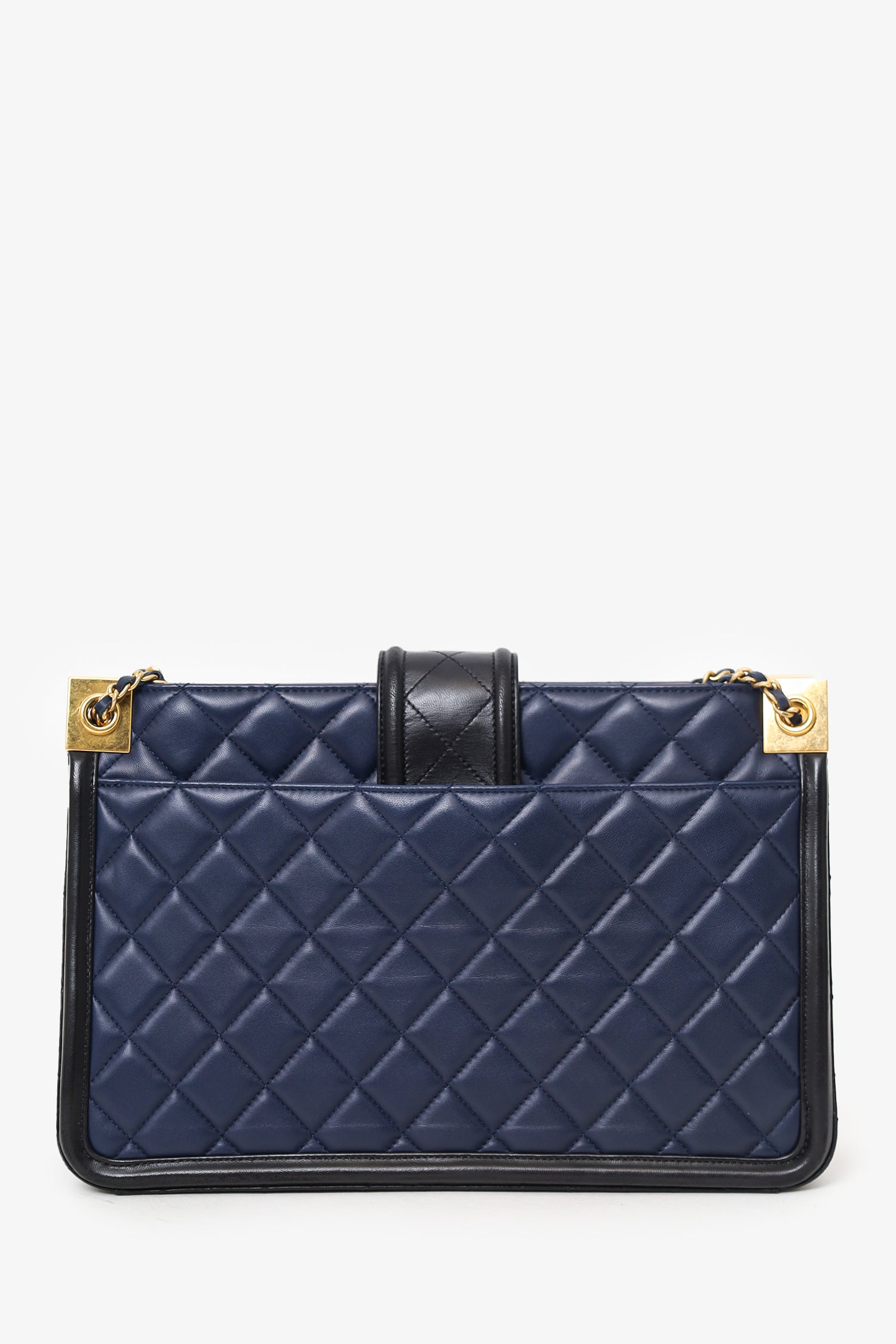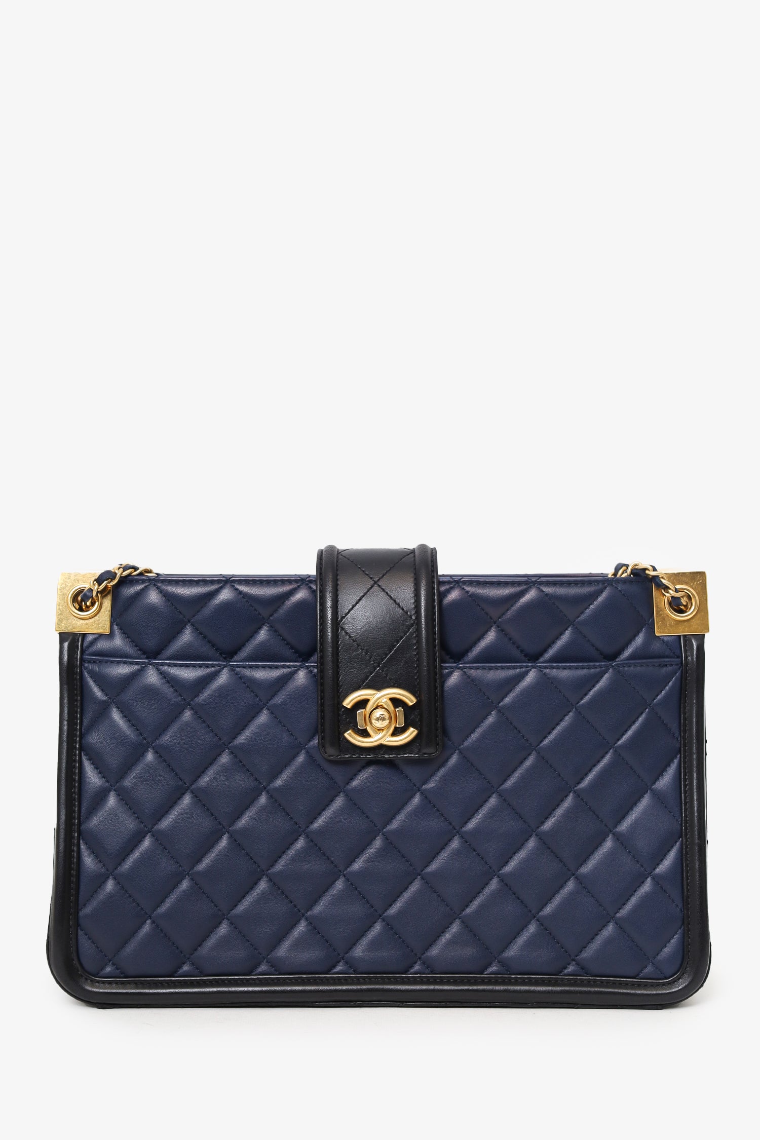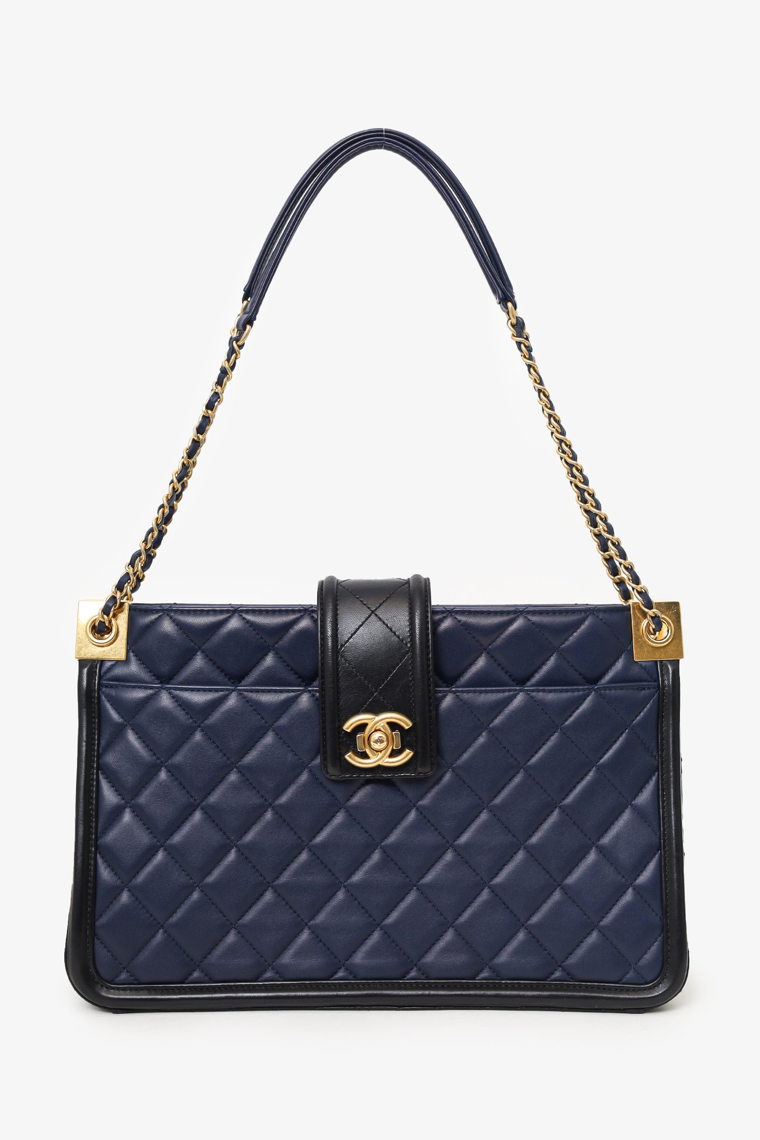 Pre-Loved Chanel™ 2014-15 Navy/Black Quilted Lambskin Elegant Tote. Chain-link top handle that can be worn either as a shoulder bag or a crossbody. Front flap with pinch-lock closure. Front large slip pocket. Interior with fabric lining. 3 interior wall pockets: 2 slip and 1 zip. Rear large slip pocket. Gold-tone hardware. Tonal stitching.