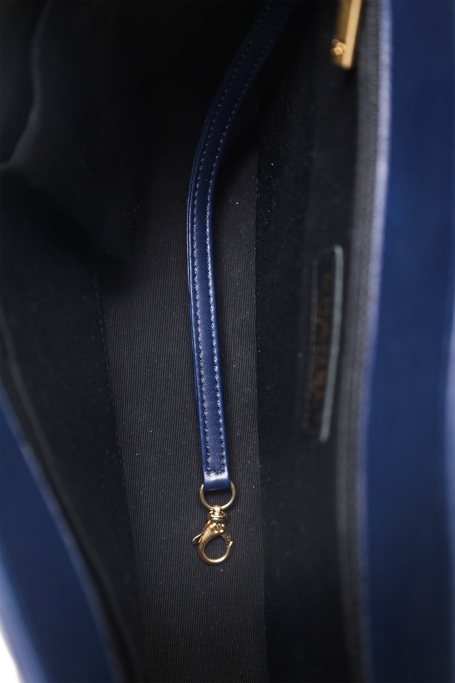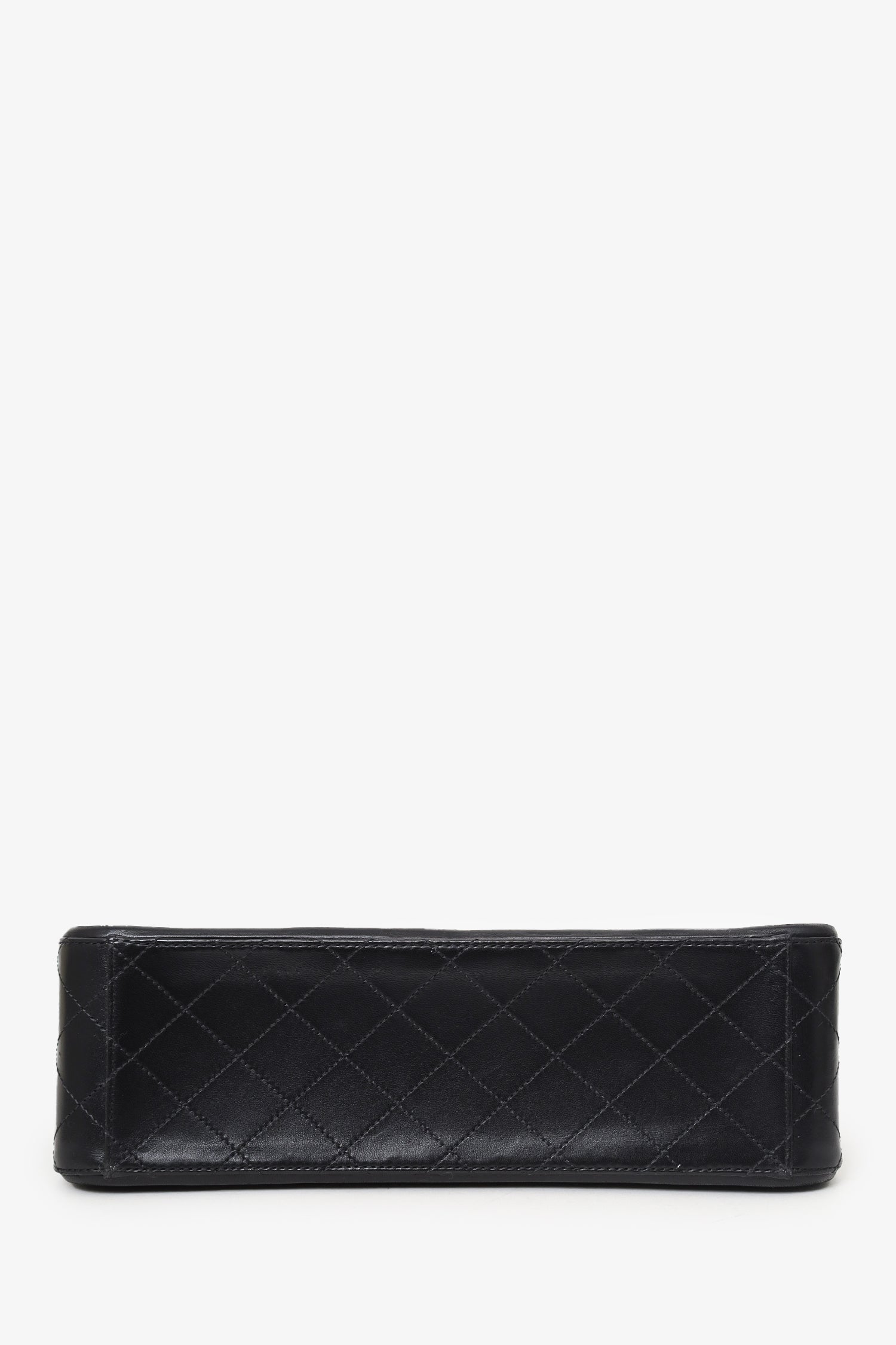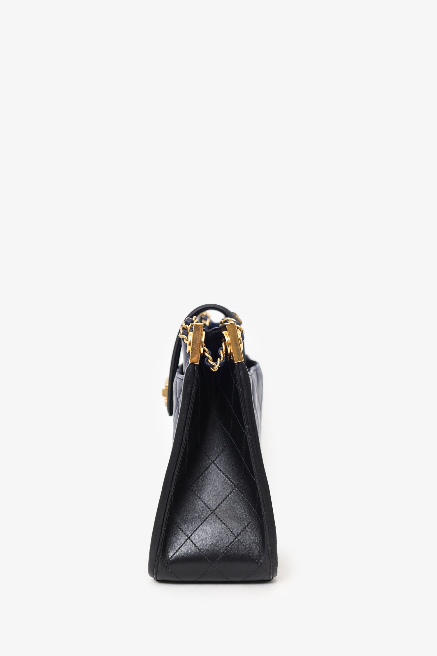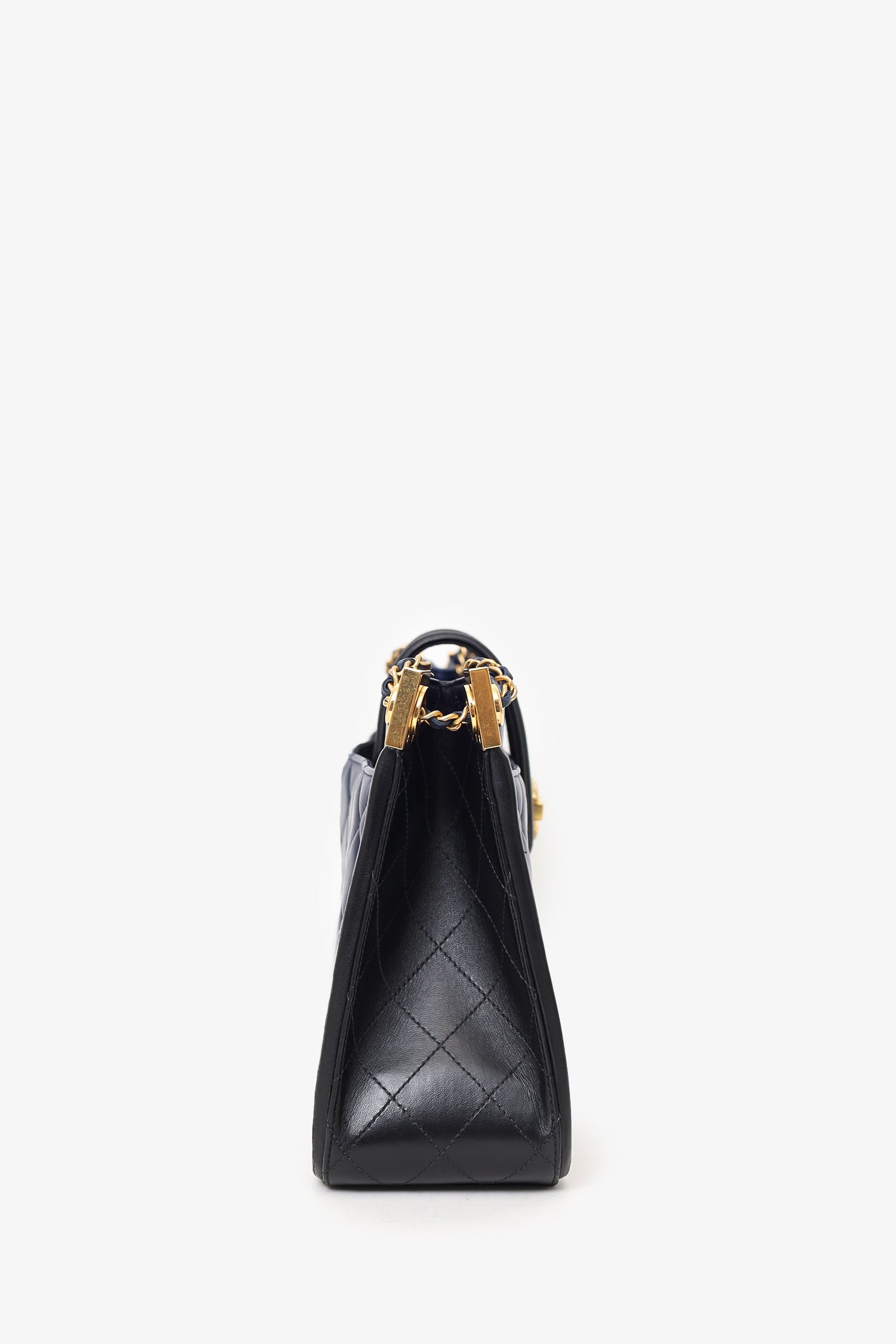 Pre-Loved Chanel™ 2014-15 Navy/Black Quilted Lambskin Elegant Tote. Chain-link top handle that can be worn either as a shoulder bag or a crossbody. Front flap with pinch-lock closure. Front large slip pocket. Interior with fabric lining. 3 interior wall pockets: 2 slip and 1 zip. Rear large slip pocket. Gold-tone hardware. Tonal stitching.