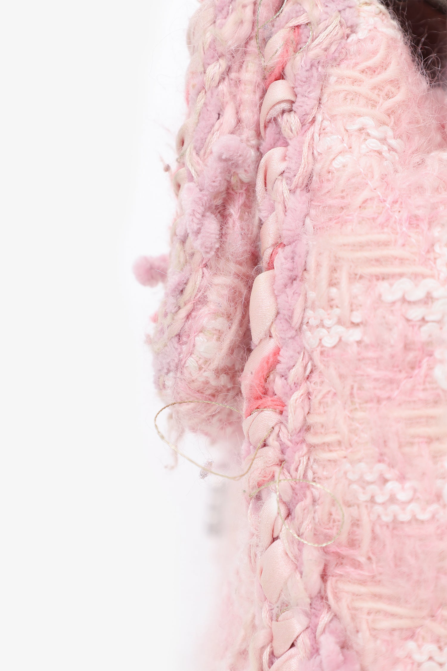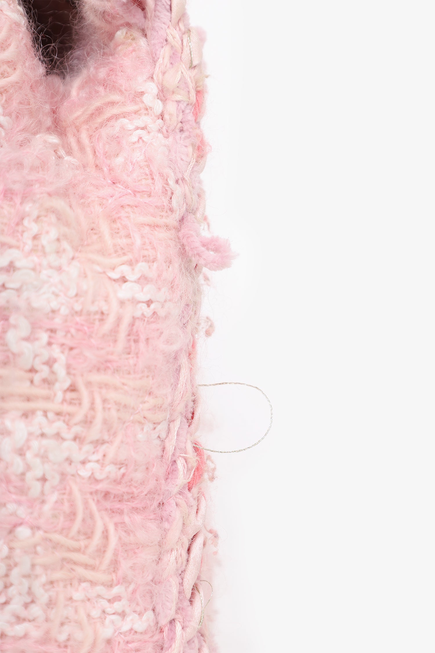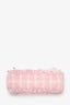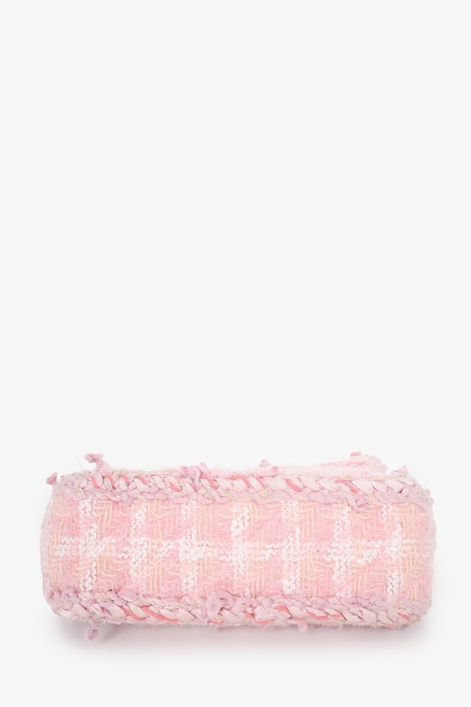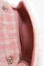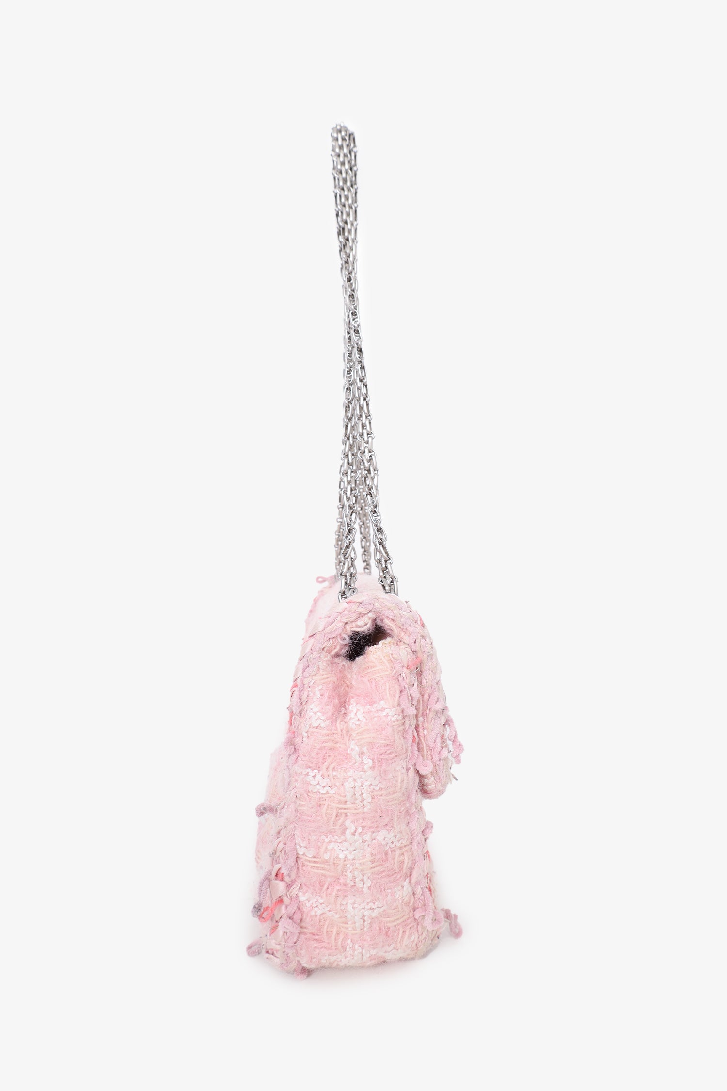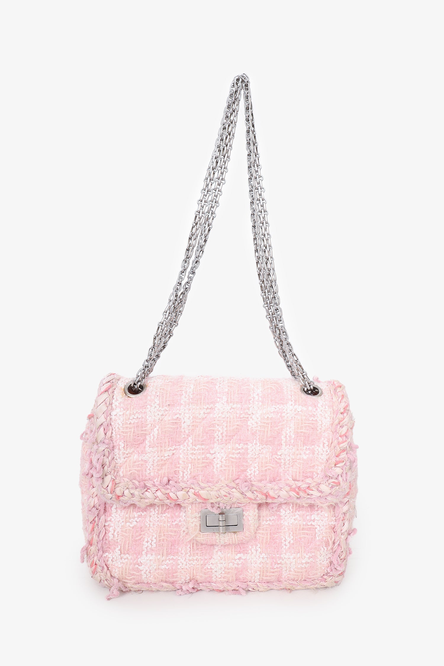 Chanel 2014-15 Pink/White Tweed Reissue 2.55 Square Bag. Front flap with turn-lock closure. 2 interior pockets; 1 zip and 1 slip. Slide-around chain. Silver-toned hardware. Tonal stitching.