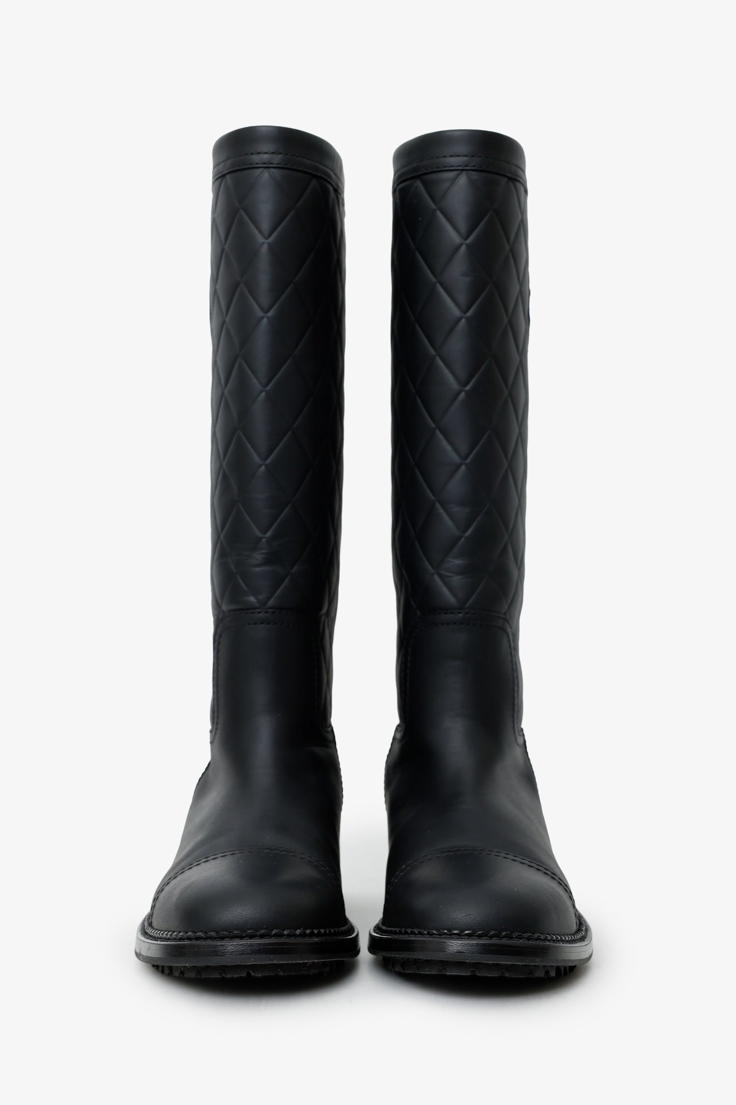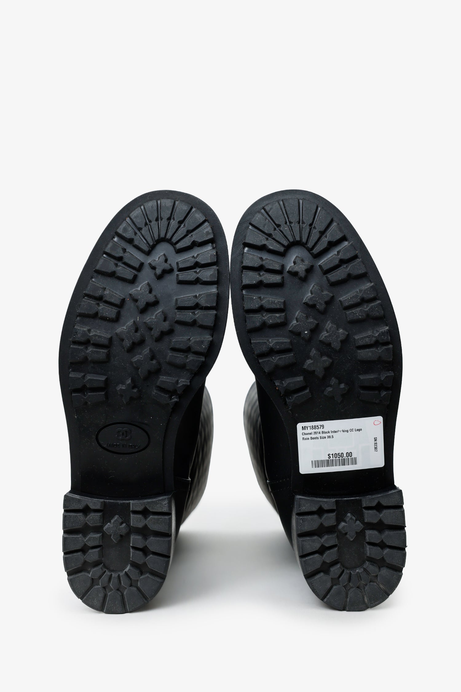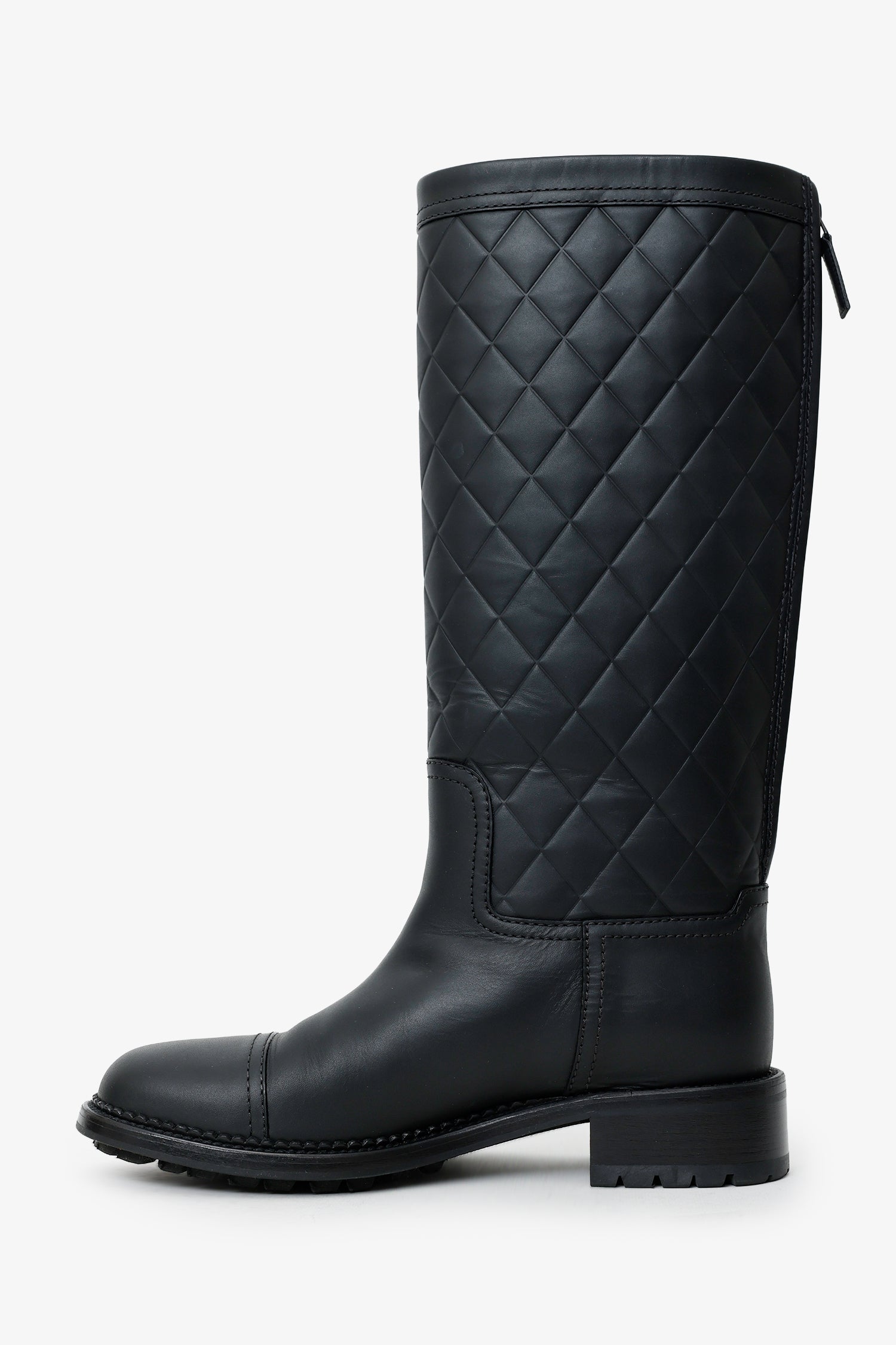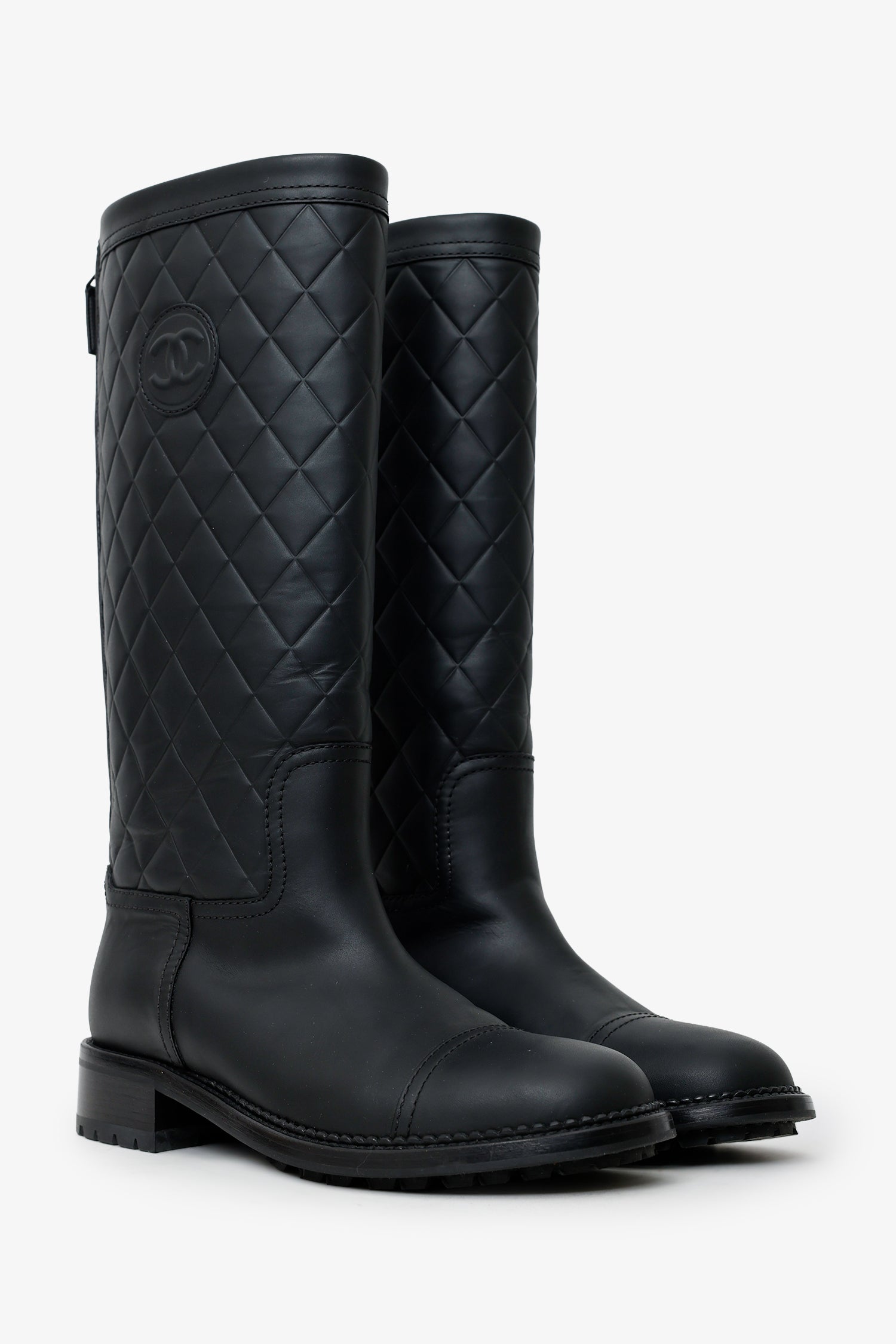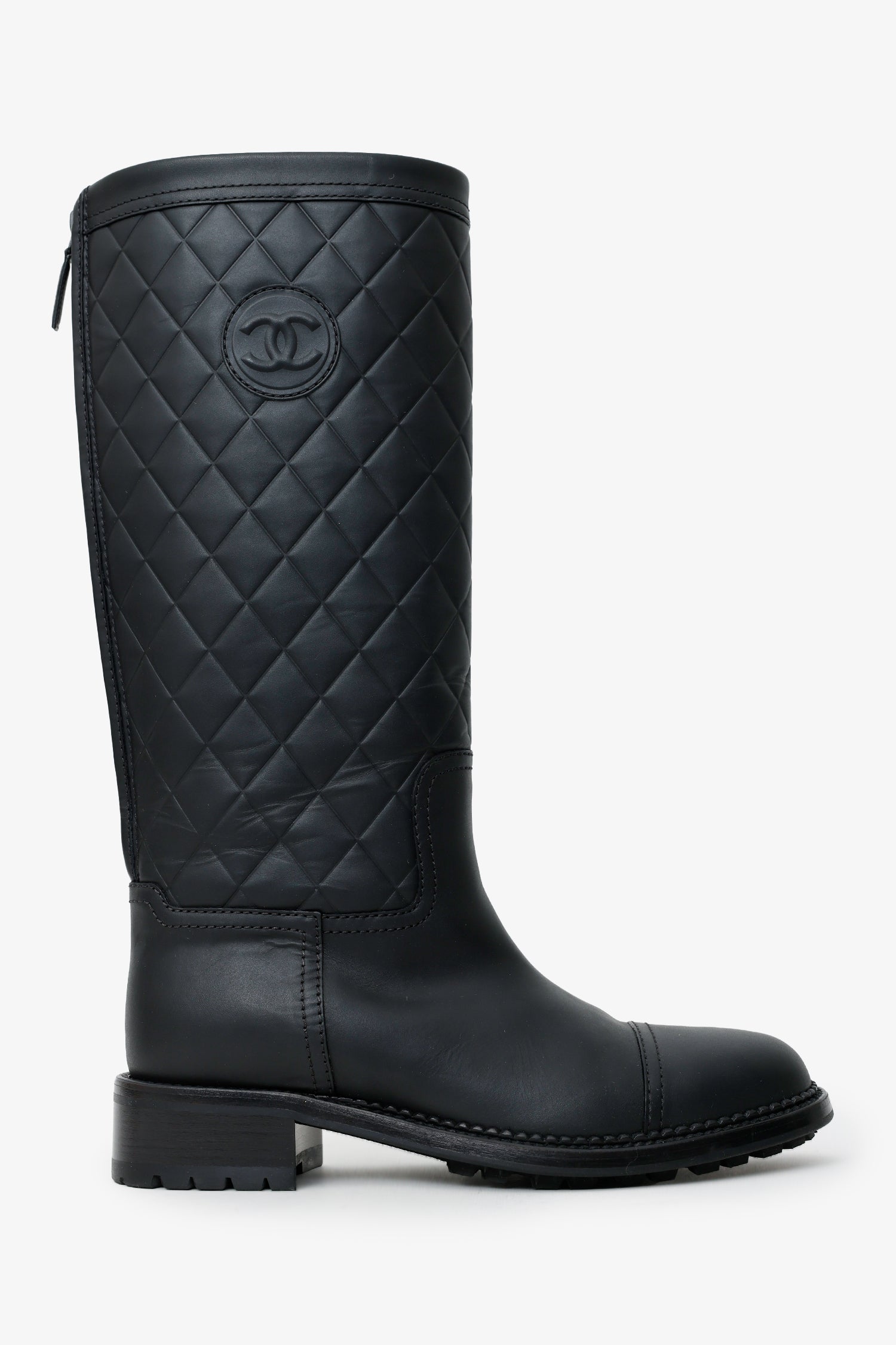 Refresh availabilityPre-Loved Chanel™ 2014 Black Interlocking CC Logo Rain Boots. Round toe. Rear zip closure. Block heel. Tonal stitching.