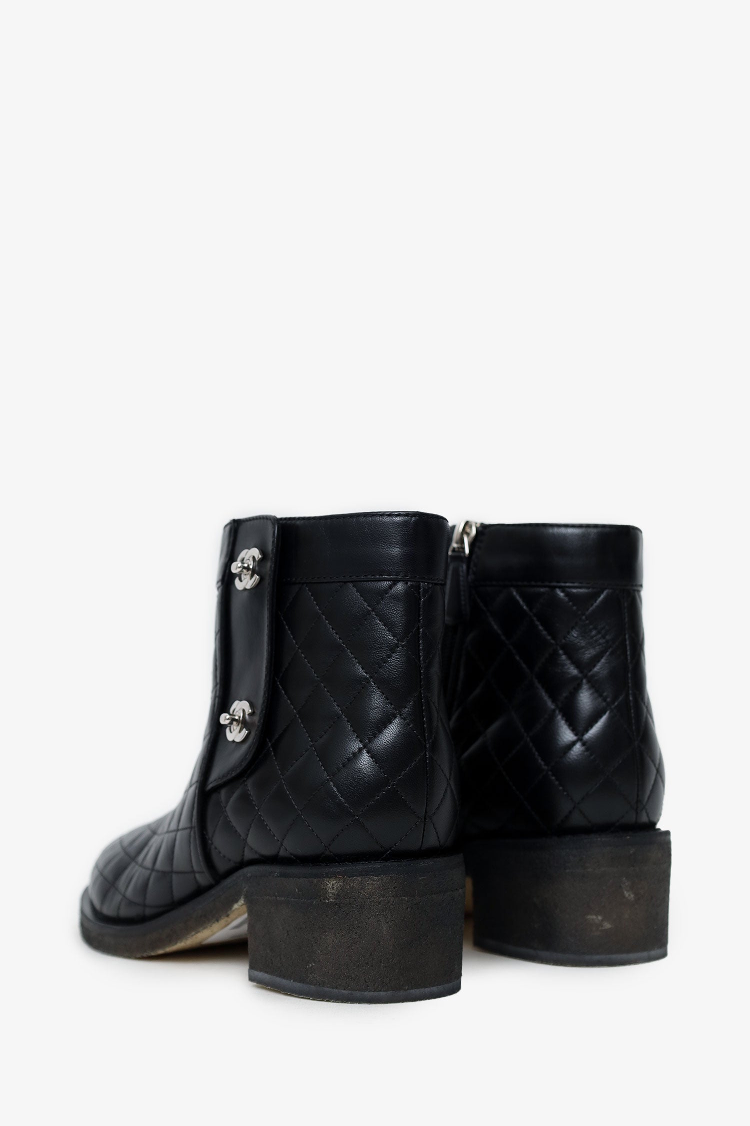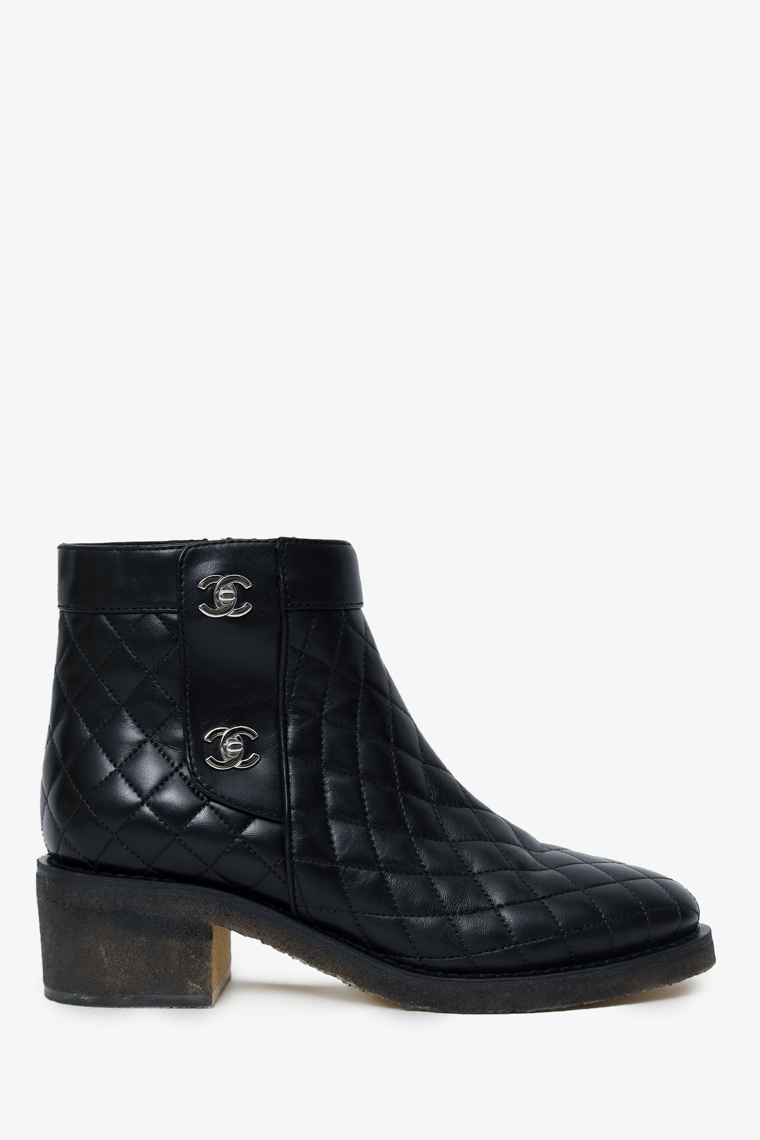 Pre-Loved Chanel™ 2015 Black Leather Interlocking CC Logo Moto Boots. Pull on. Side zip closure. Turn-lock closure detail on exterior side. Round toe. Quilted exterior. Tonal stitching. Silver-tone hardware.