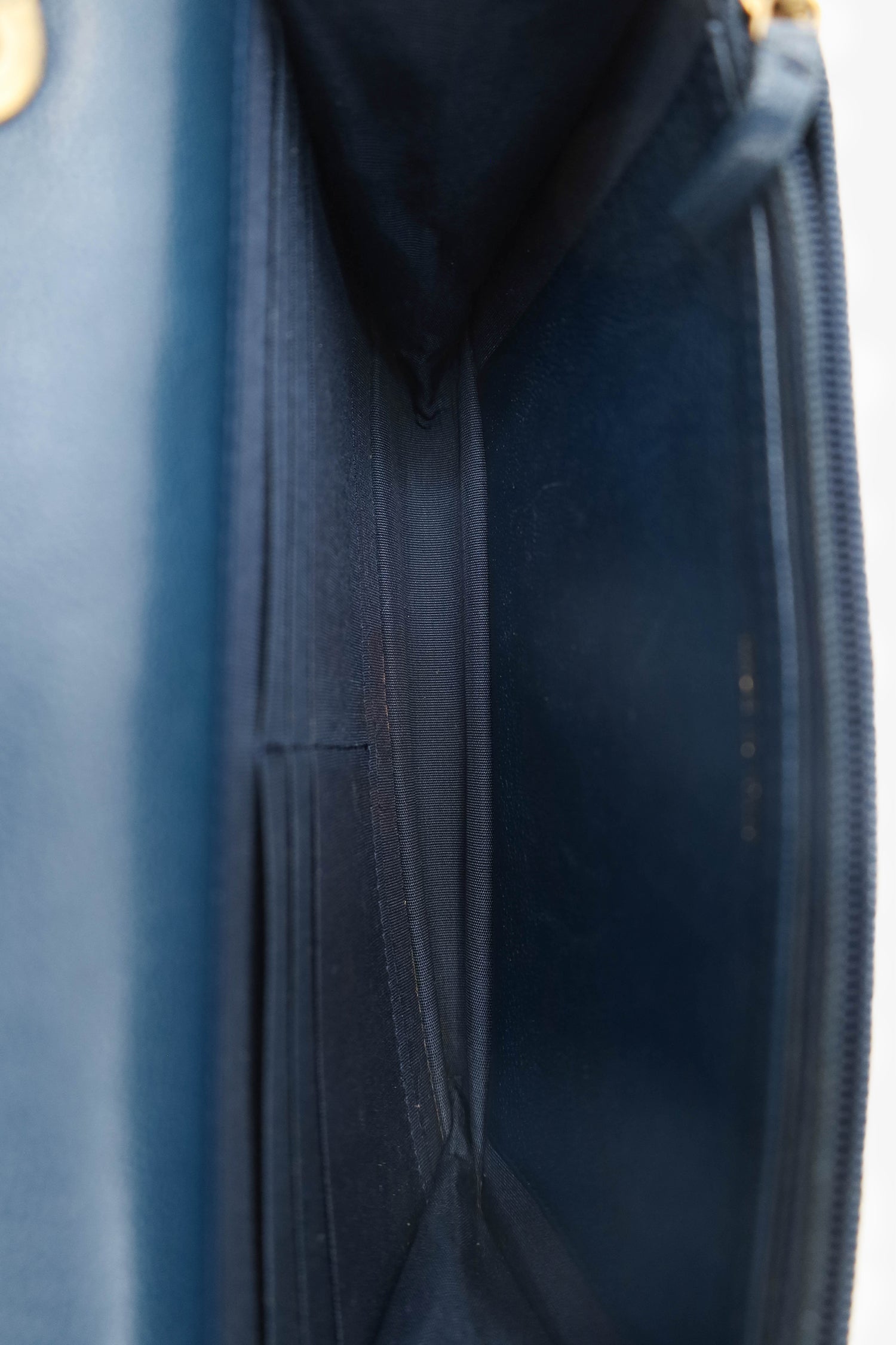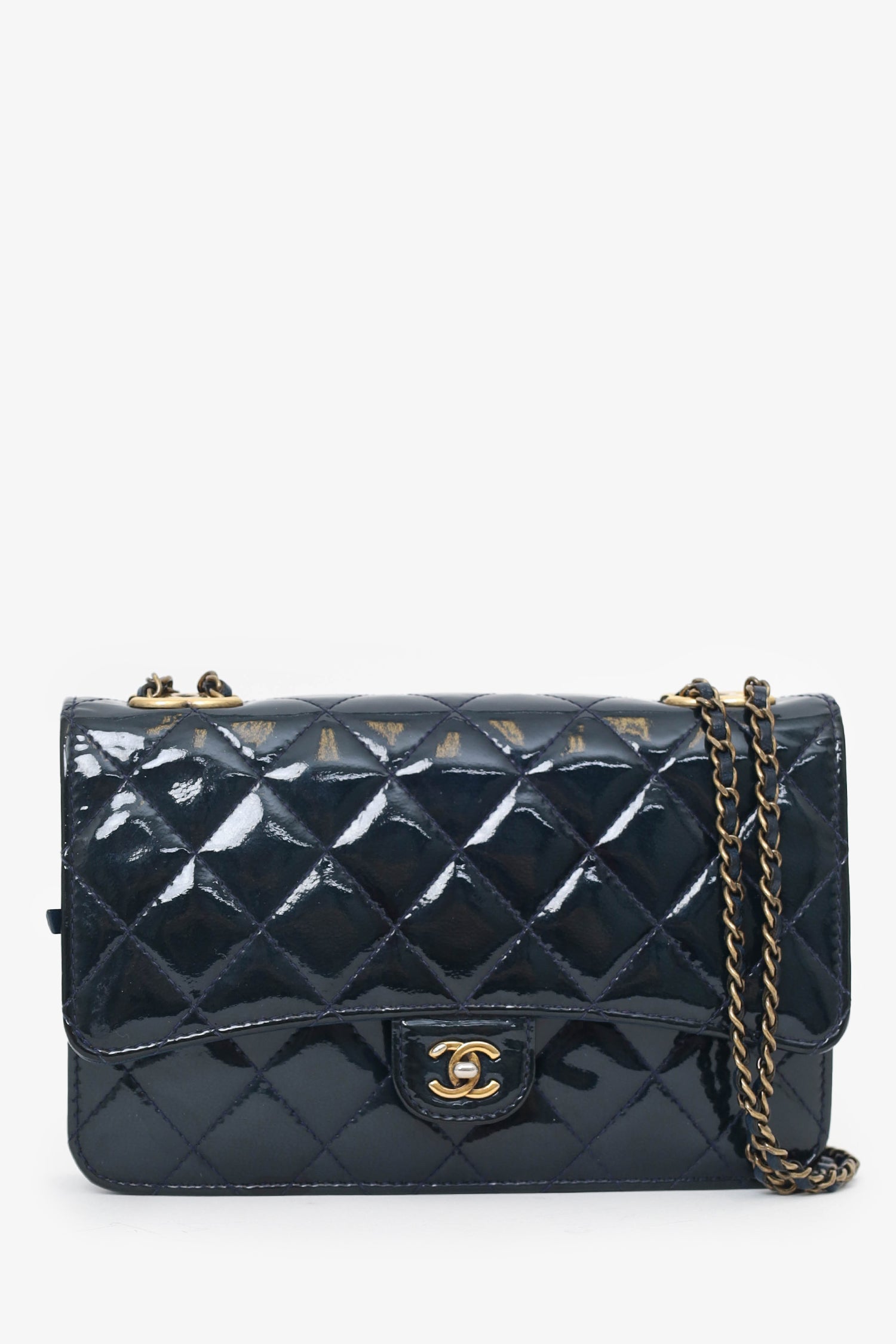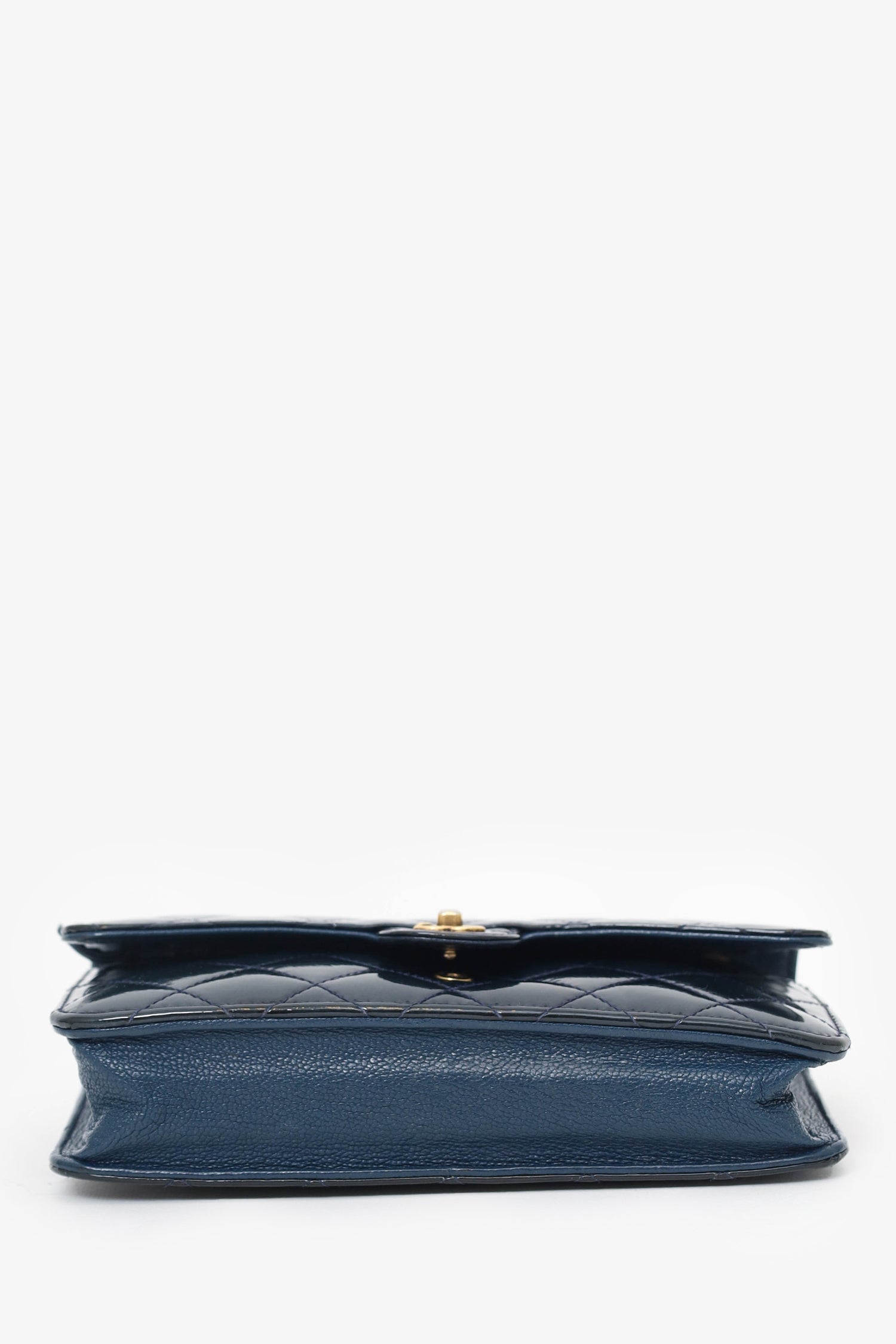Pre-Loved Chanel™ 2015 Navy Patent Leather Quilted CC Eyelet Wallet On Chain. Front fold-over flap with turn-lock closure. Crossbody chainlink strap. Lined interior. 2 interior compartments; front slip and main rear compartment with 1 zip pocket, 1 slip pocket and 6 card slots. Gold-tone hardware. Tonal stitching.