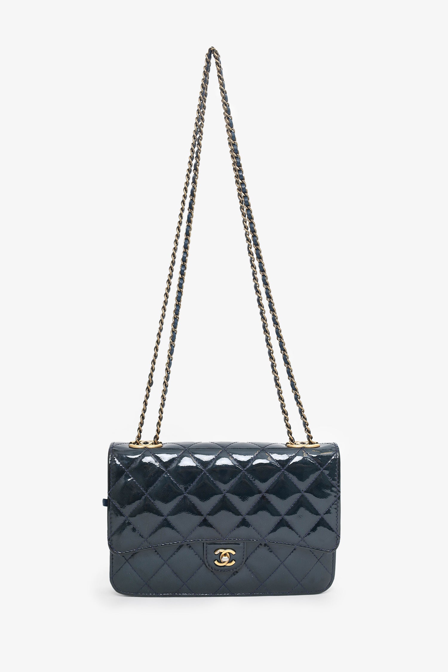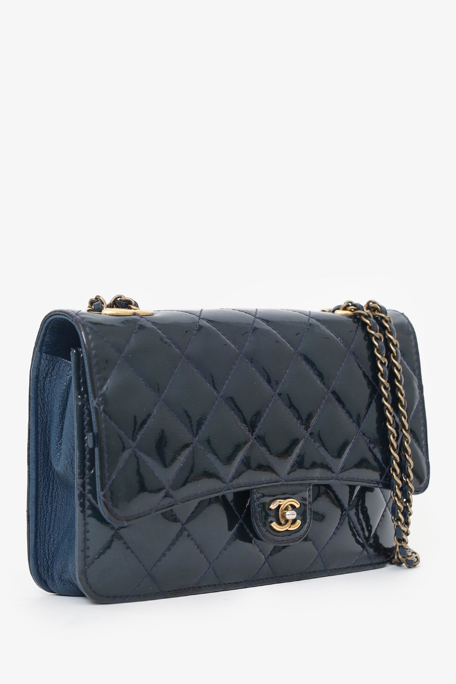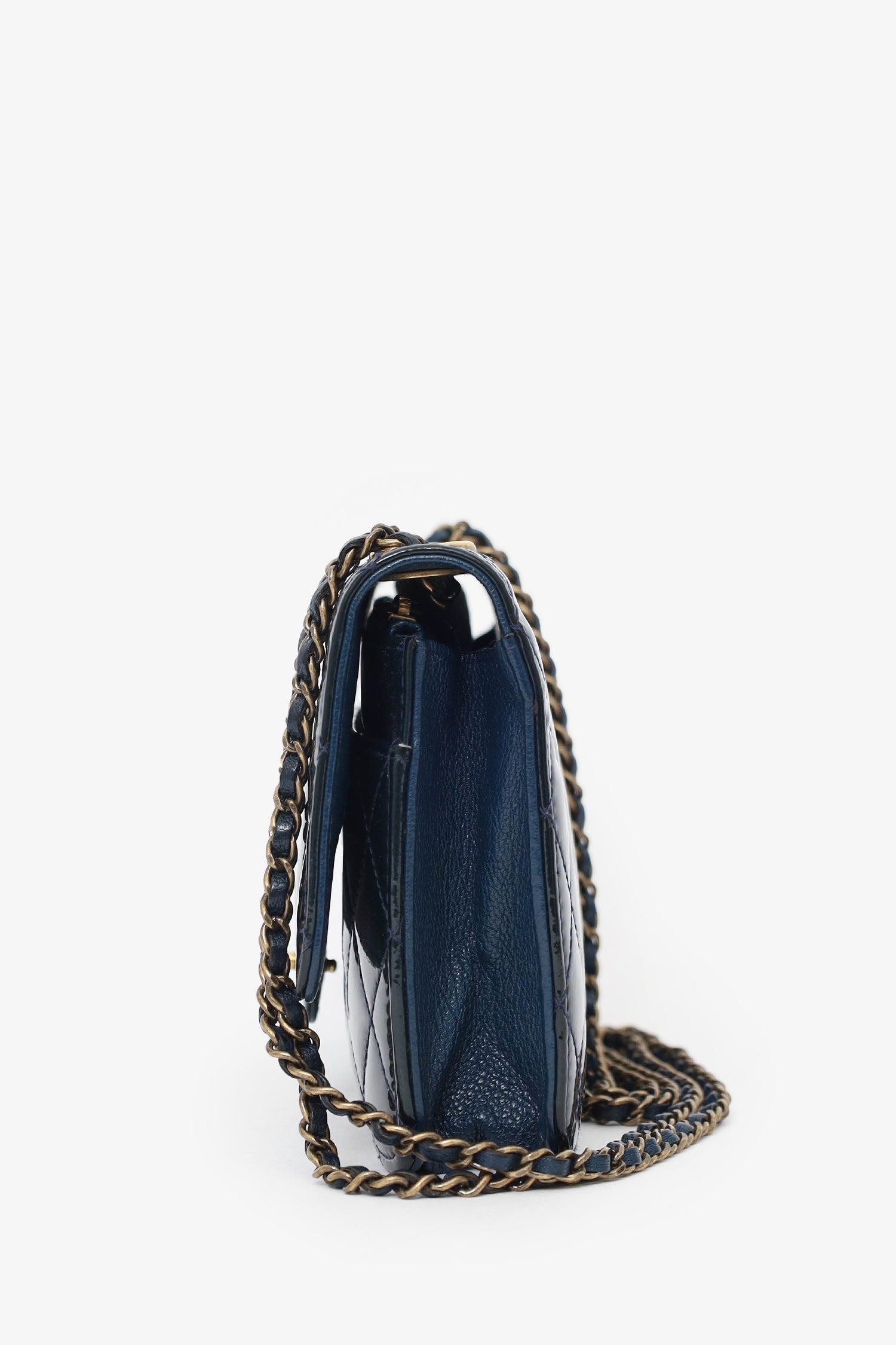 Pre-Loved Chanel™ 2015 Navy Patent Leather Quilted CC Eyelet Wallet On Chain