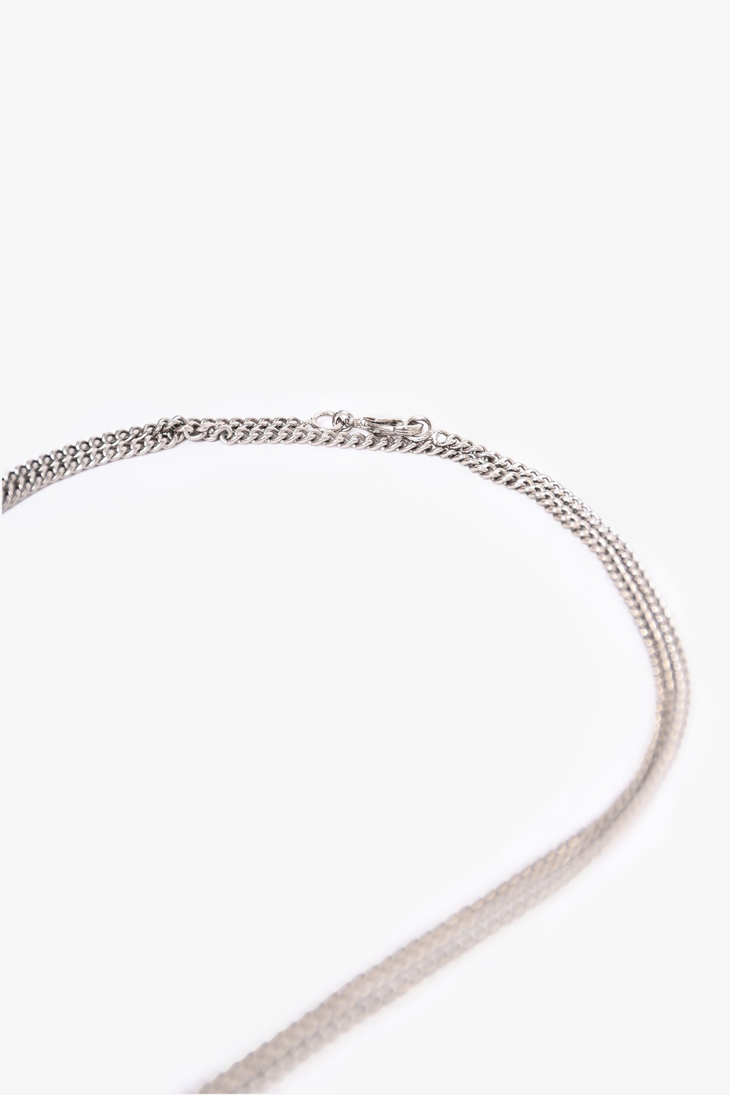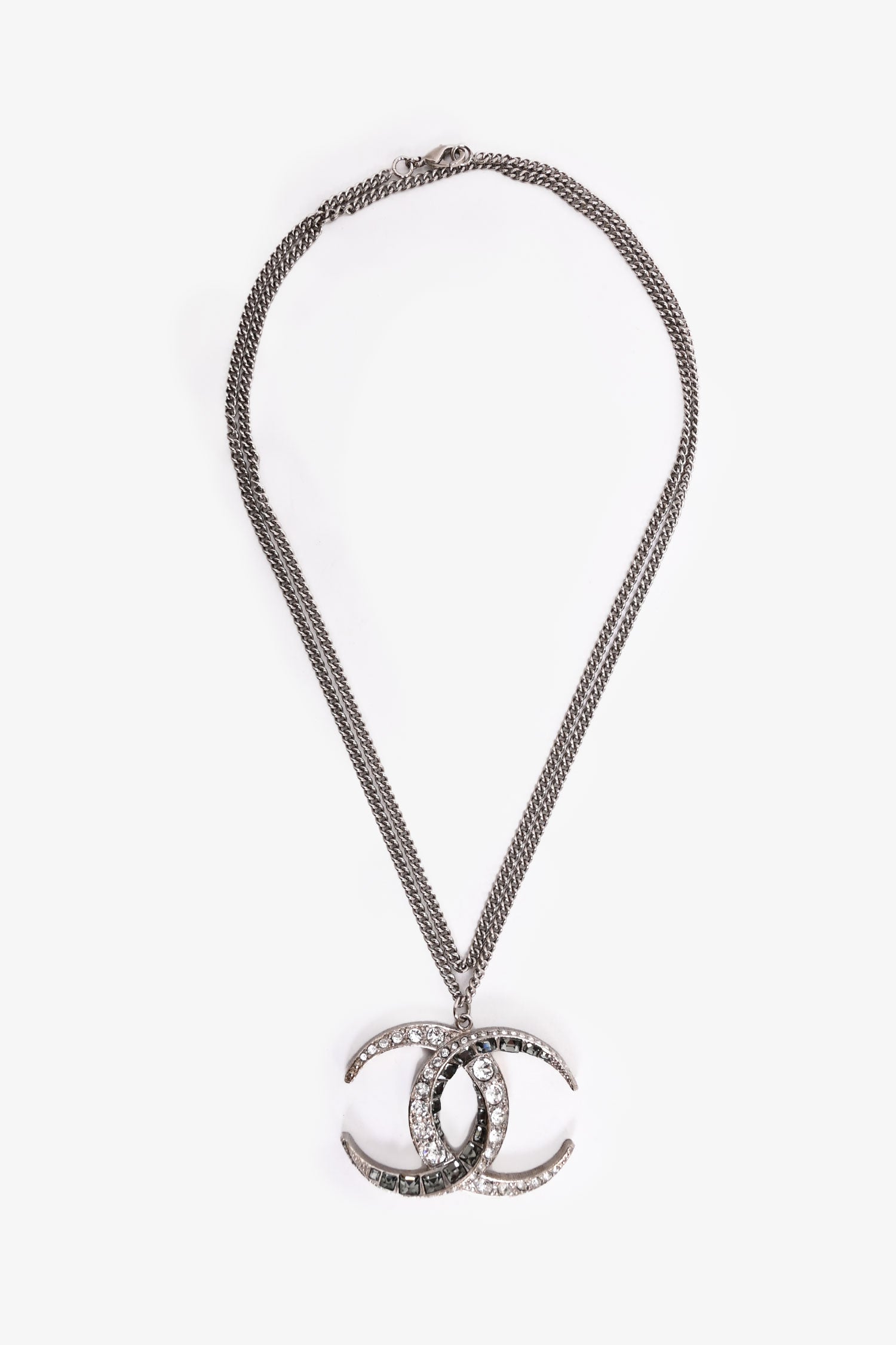 Pre-Loved Chanel™ 2015 Silver Toned Dubai Moon Crystal CC Pendant Necklace. Lobster clasp closure. Cable link chain. Antiqued silver-tone hardware. Crystal embellishment.
