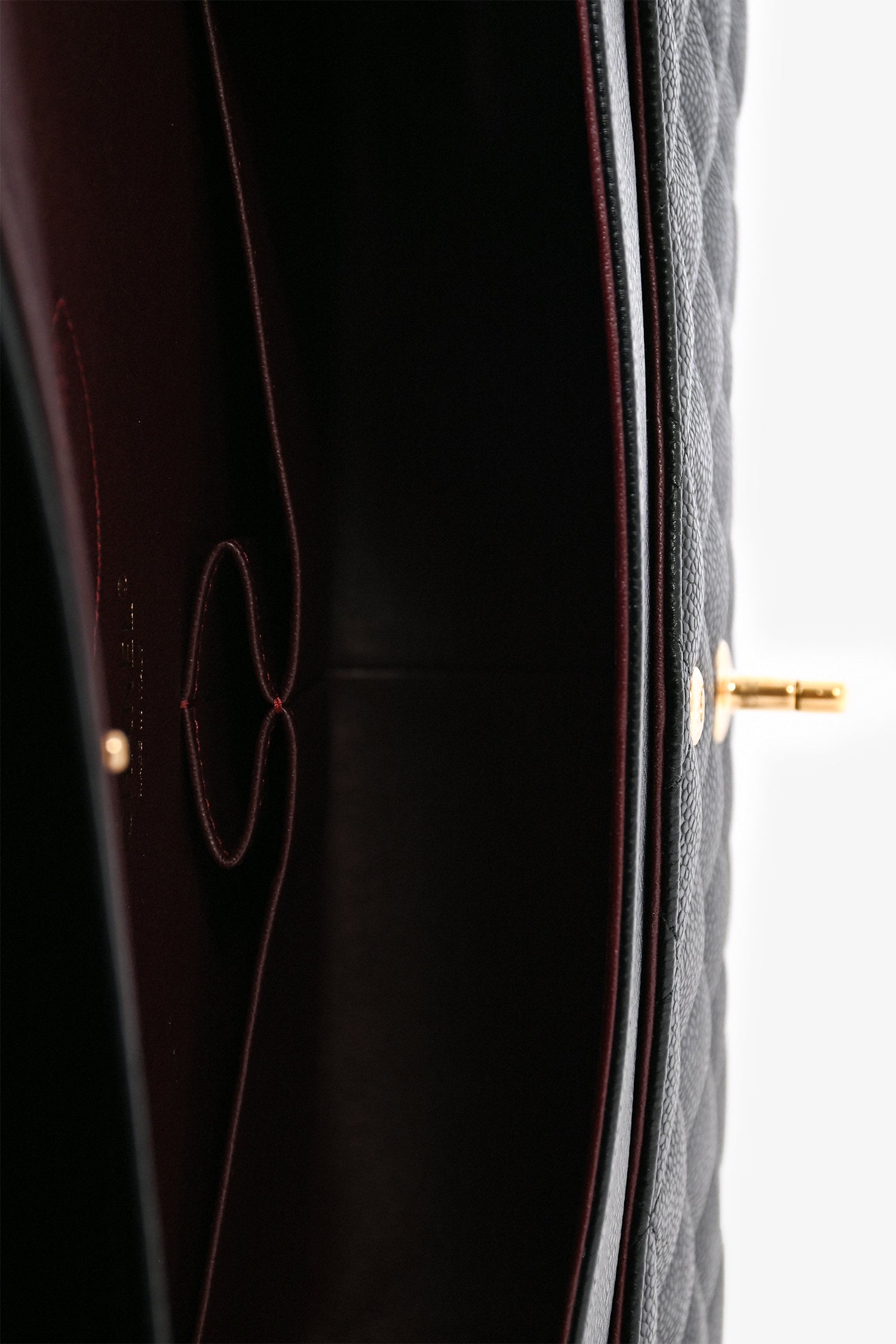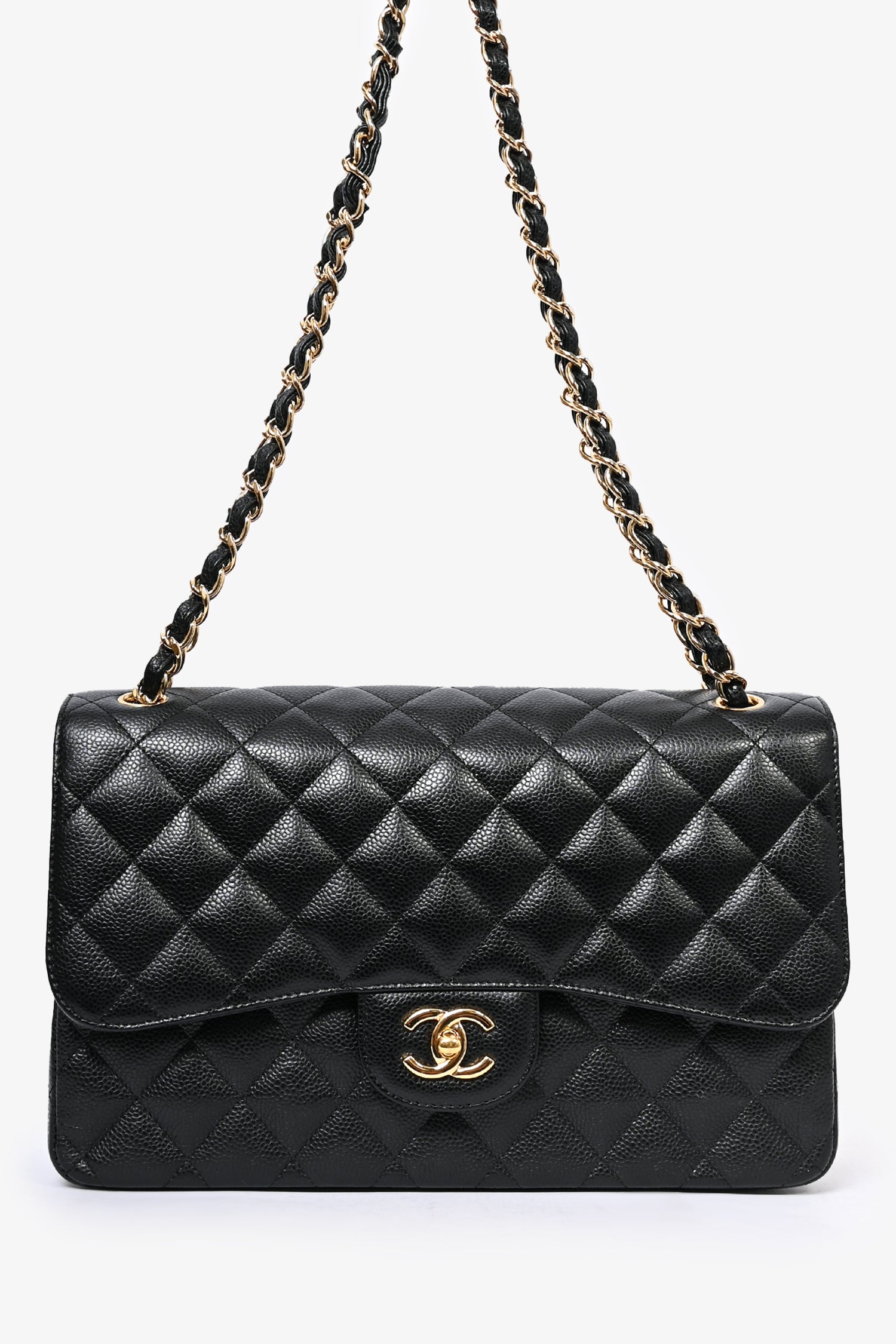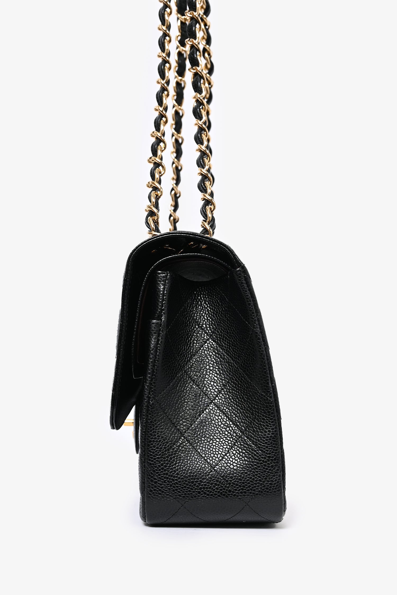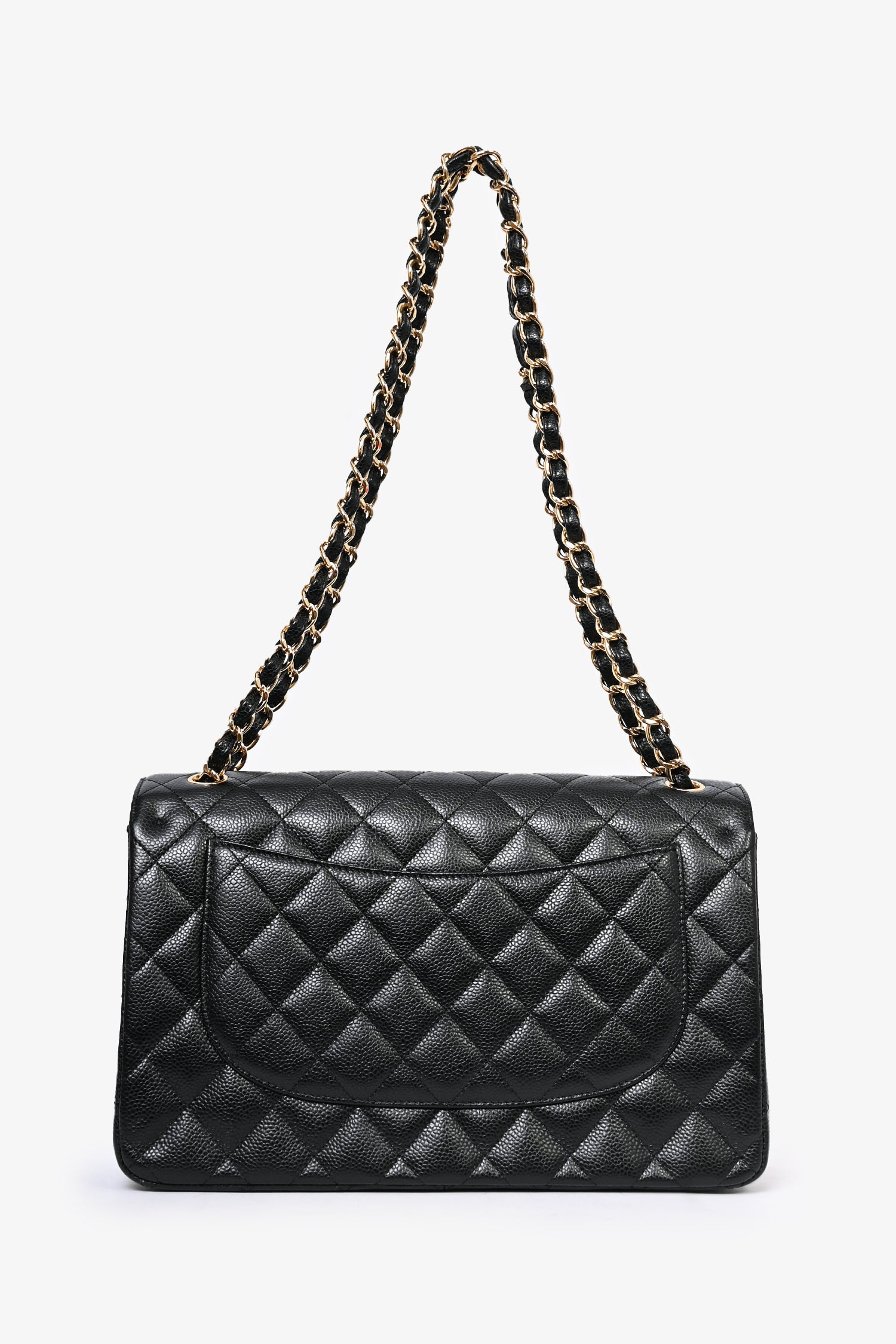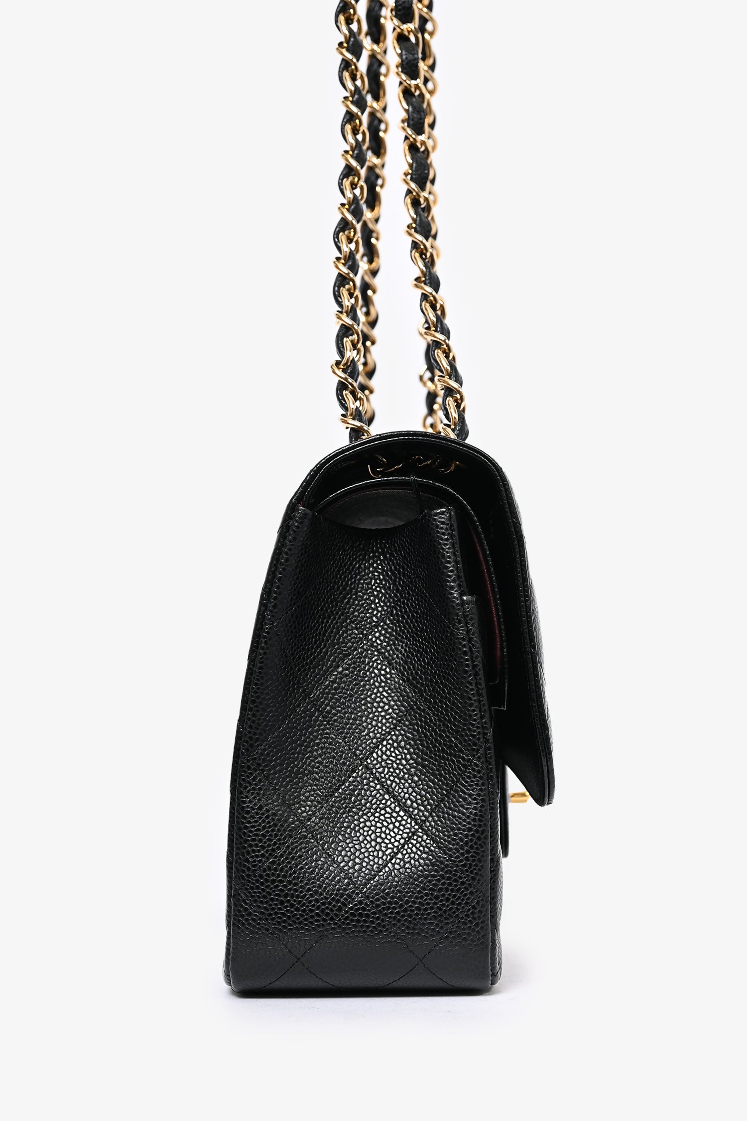 Pre-Loved Chanel™ 2016/17 Black Caviar Leather Jumbo Double Flap Bag. Quilted motif. Front fold-over flap with turn lock closure, single zip closure pocket underneath. Second interior fold-over flap with front wall slip pocket, open interior and 2 back wall slip pockets, with snap button closure. Single exterior slip pocket on back. Adjustable shoulder/crossbody strap. Gold-tone hardware. Tonal stitching.
