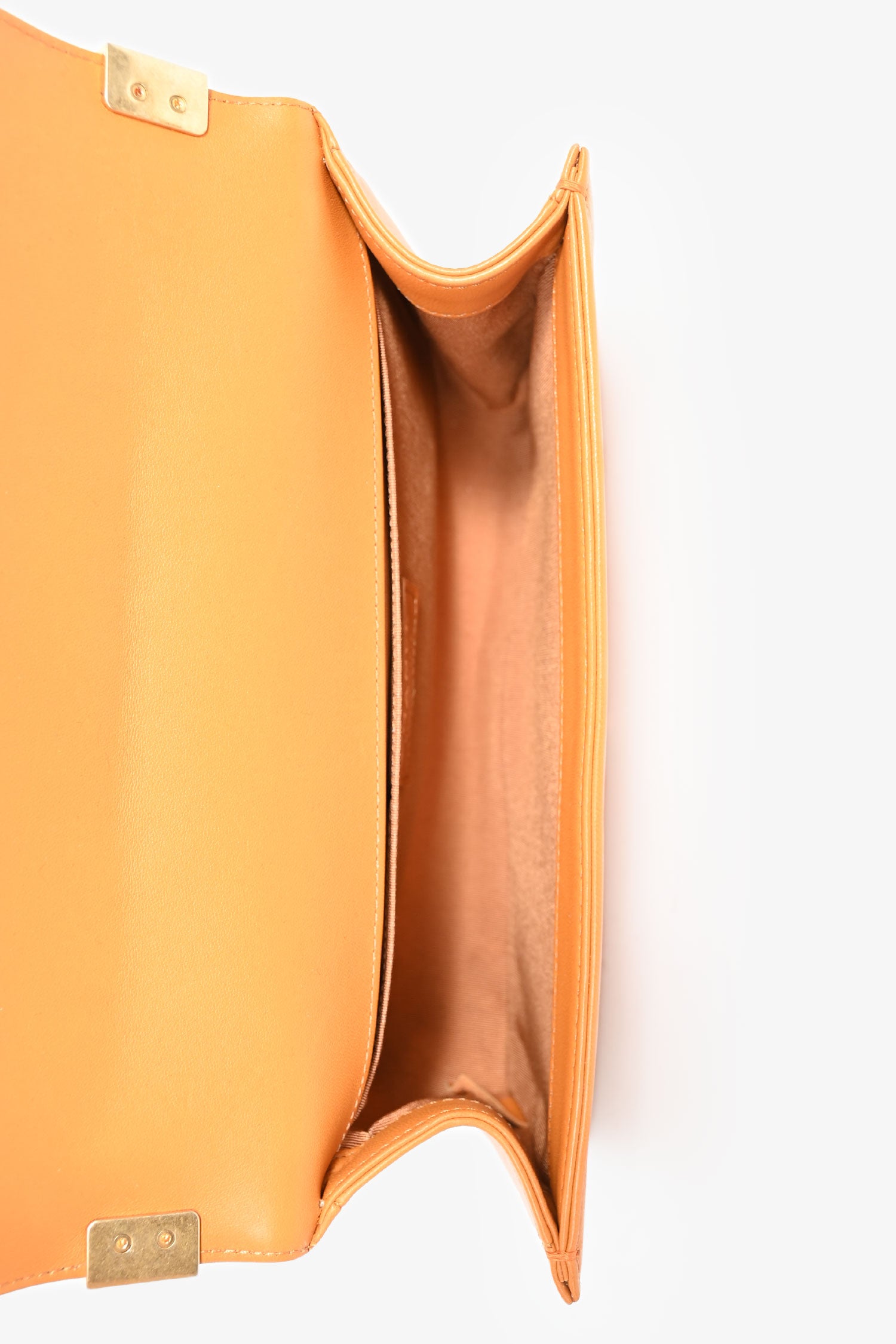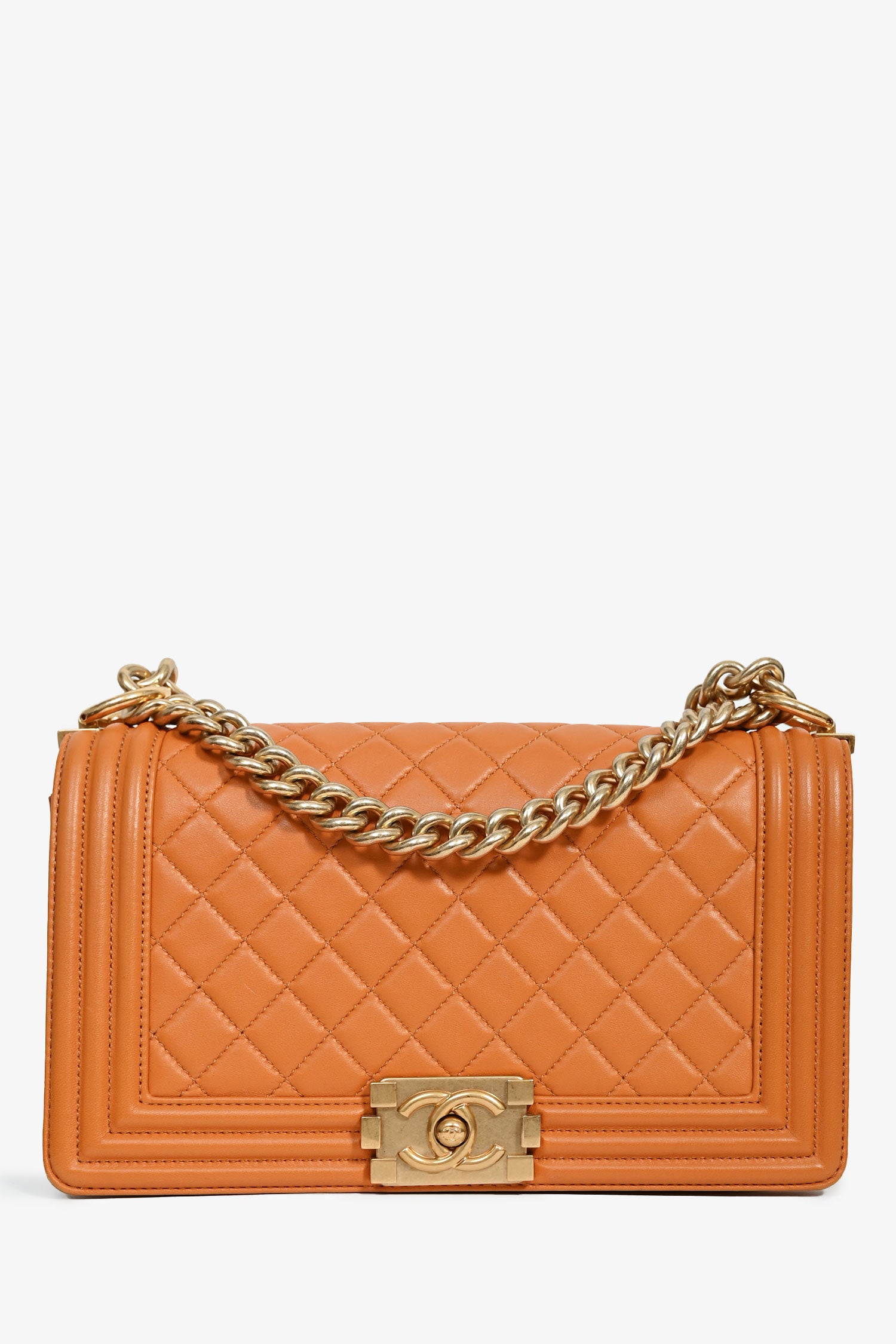 Refresh availabilityPre-Loved Chanel™ 2016-17 Orange Quilted Lambskin Medium Boy Bag. Gold-tone hardware. Fold-over flap with a push-open closure. Chain-link shoulder strap with a leather shoulder strip. Grosgrain-lined interior with a slip compartment. Tonal stitching.