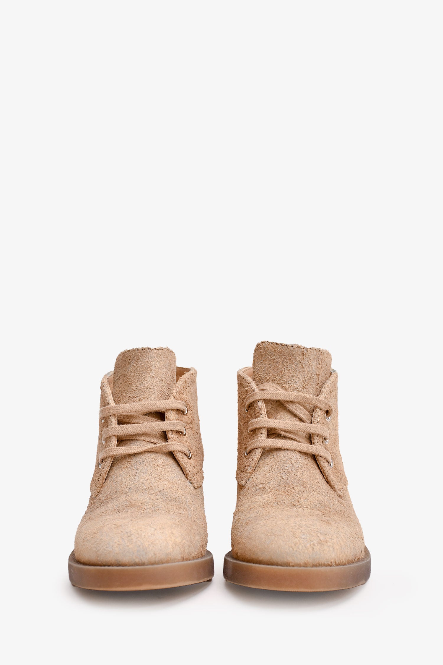 Pre-Loved Chanel™ 2016 Beige Suede CC Logo Lace Up Ankle Boots. Lace-up. Silver-tone hardware. Tonal stitching.