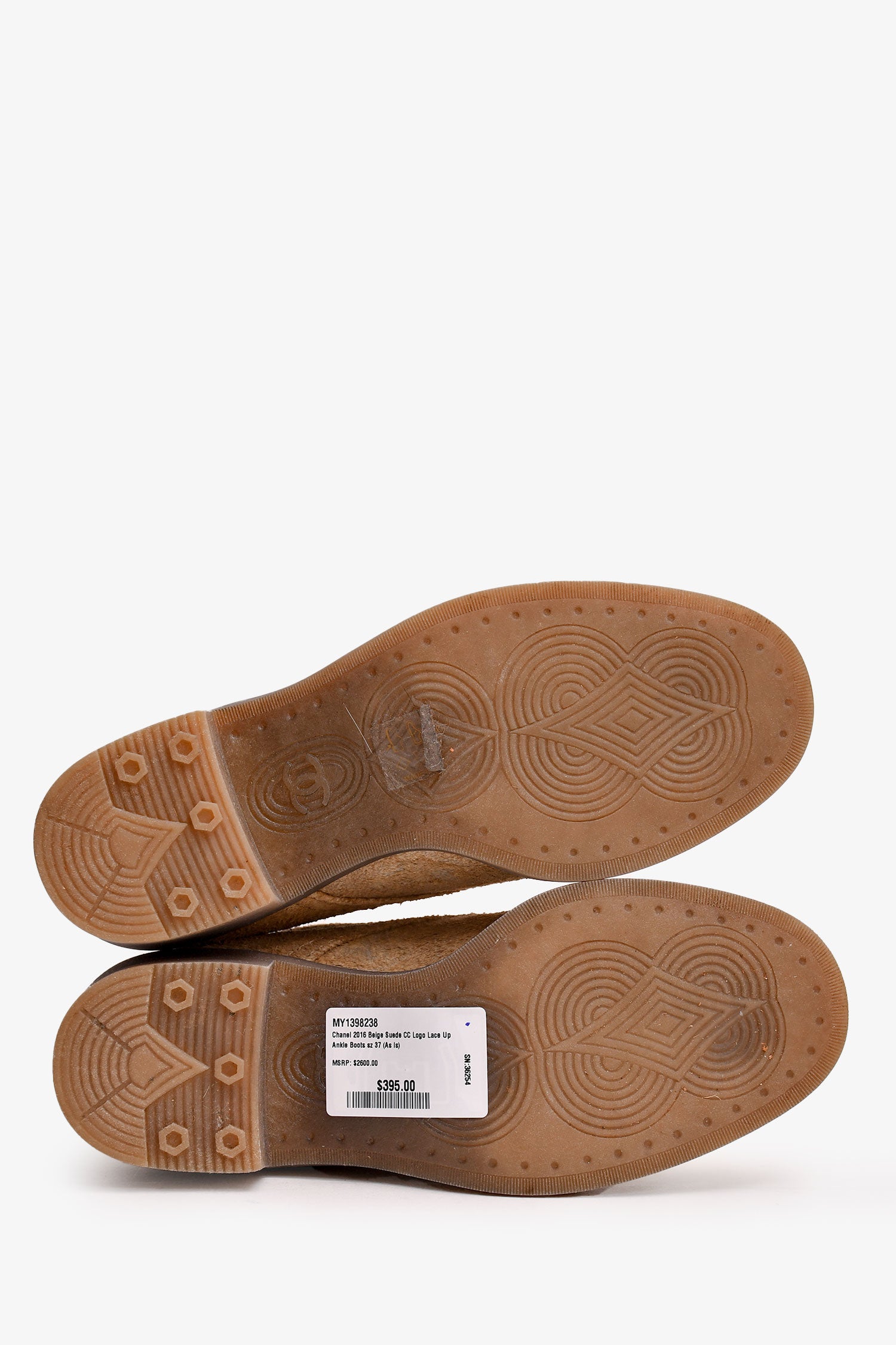 Pre-Loved Chanel™ 2016 Beige Suede CC Logo Lace Up Ankle Boots Size 37 (As Is)