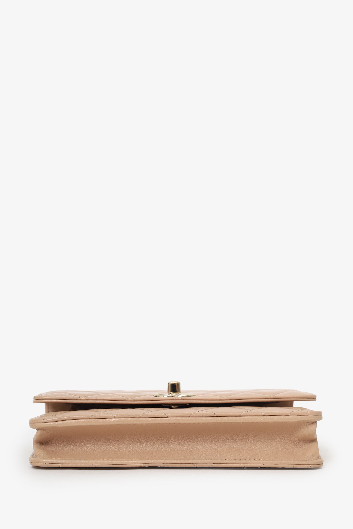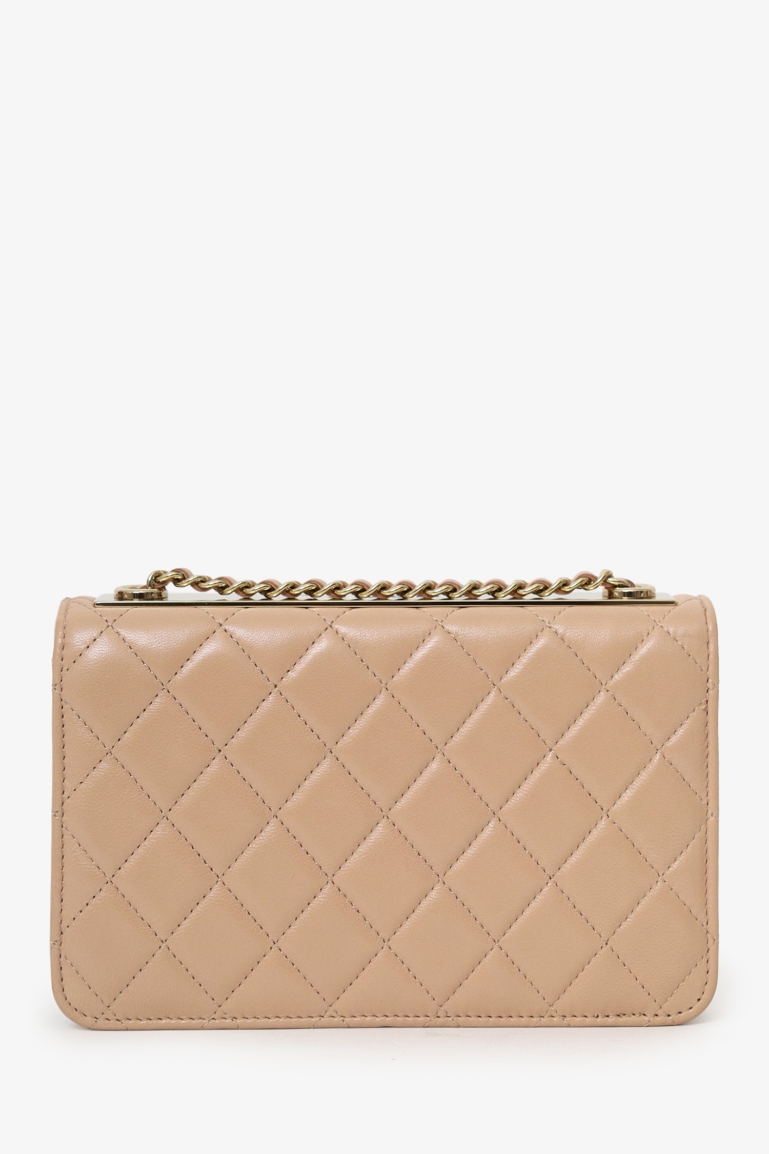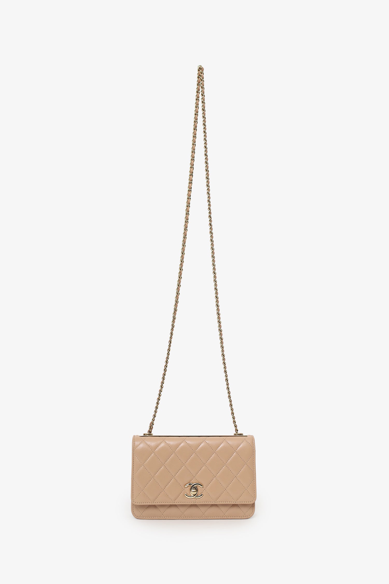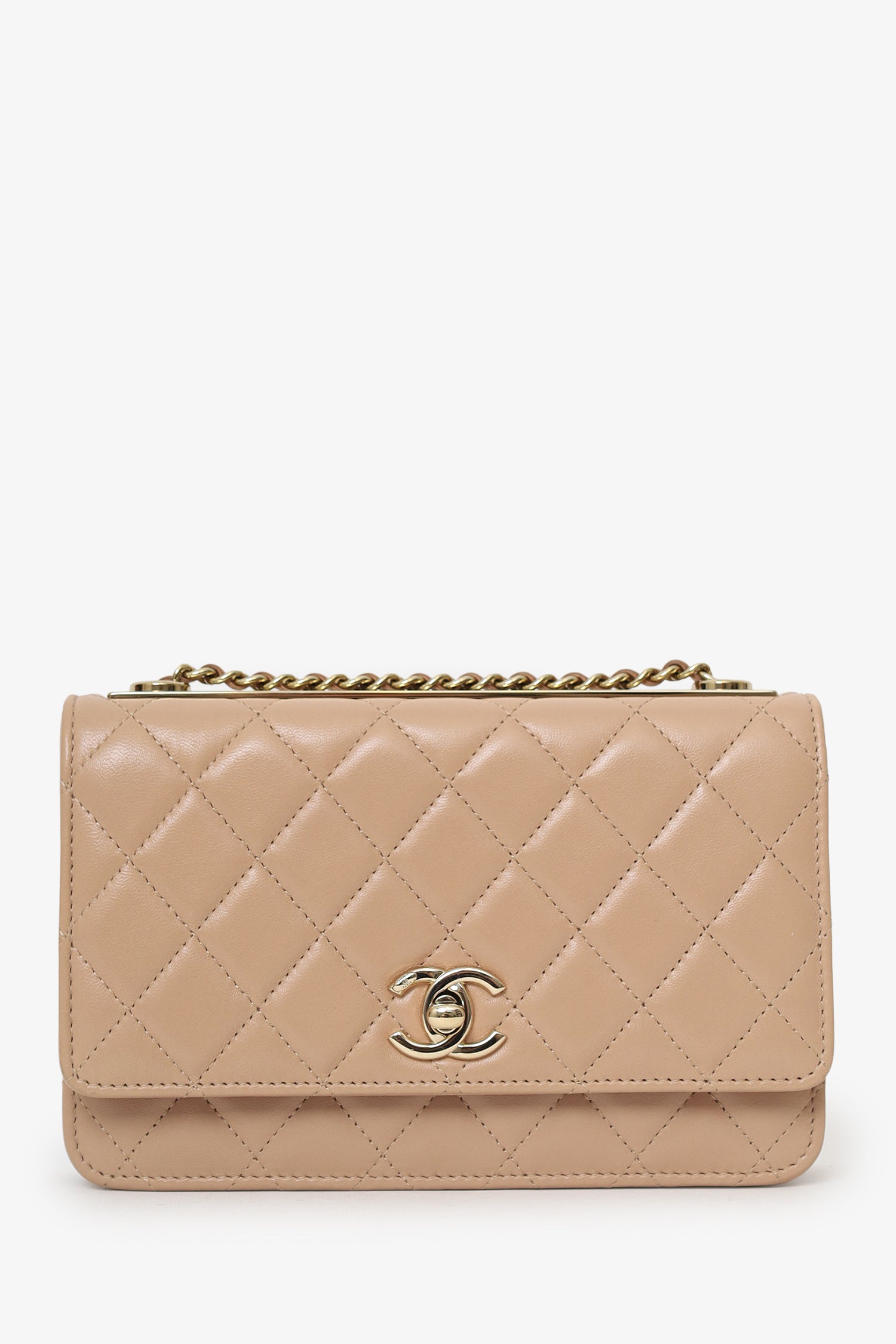 Refresh availabilityPre-Loved Chanel™ 2016/17 Beige Lambskin 'Trendy' Wallet On Chain. Front fold-over-flap with turn-lock closure. Crossbody chain link strap. Leather-lined interior with 10 pockets; 2 front slip, 1 front zip, 6 rear card slots, and 1 rear zip. Gold-tone hardware. Tonal stitching.