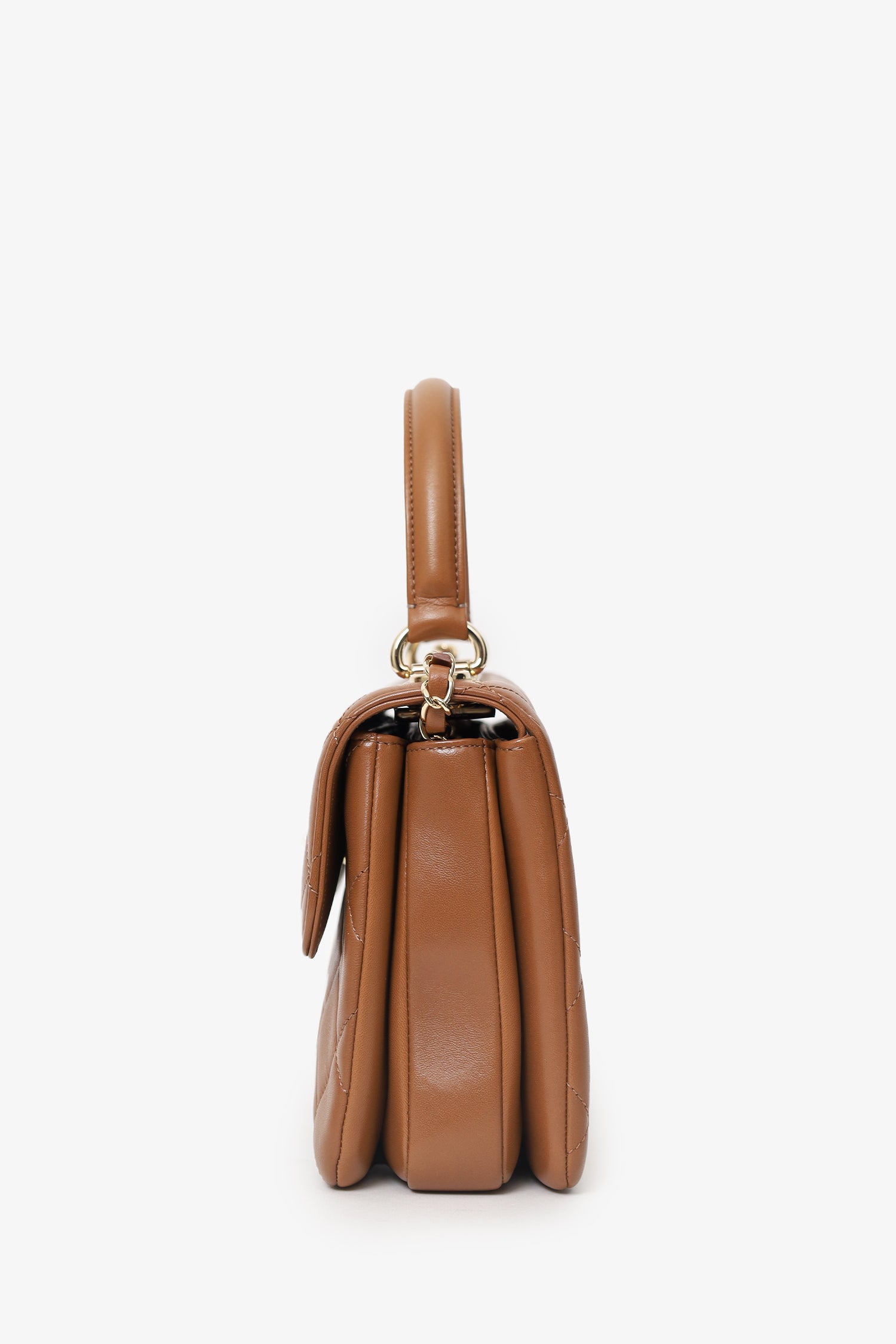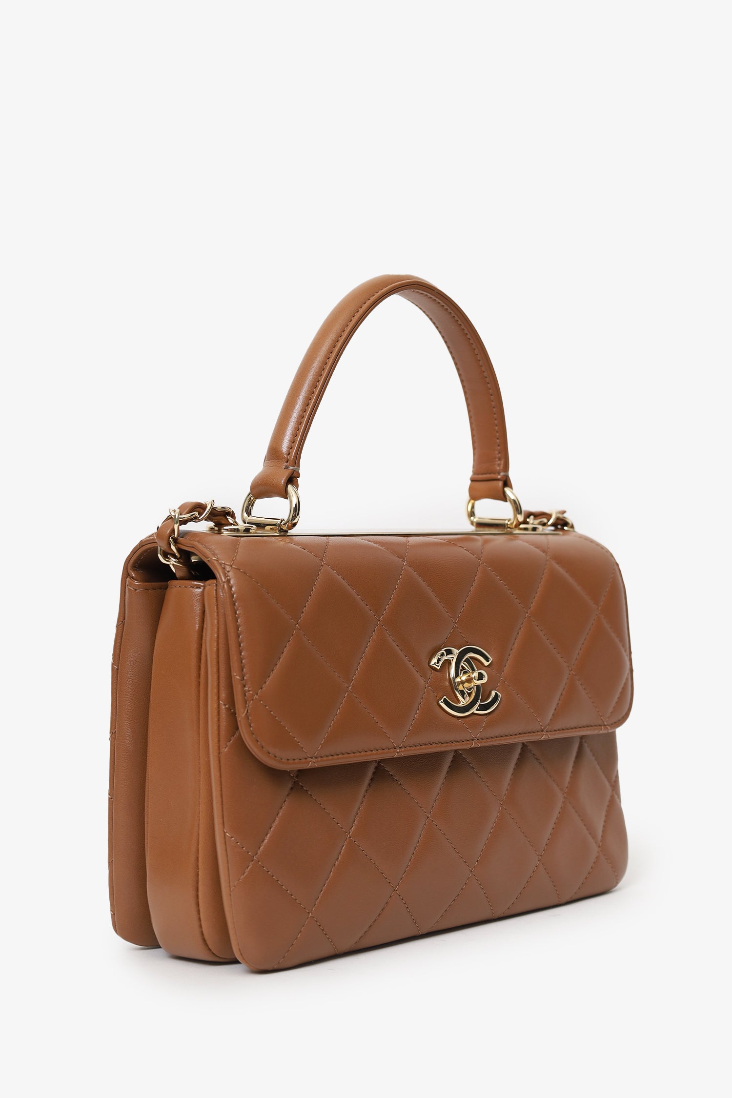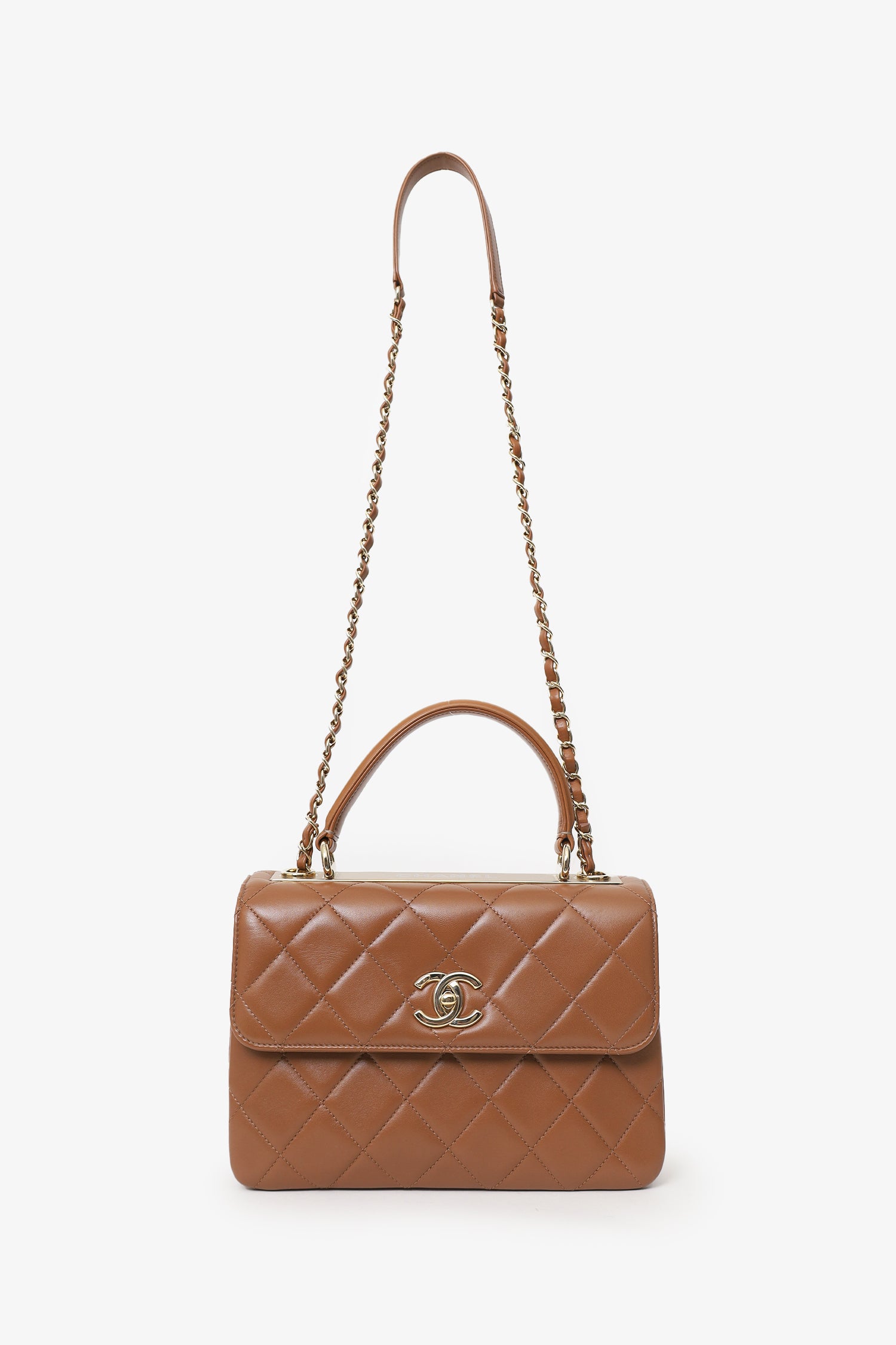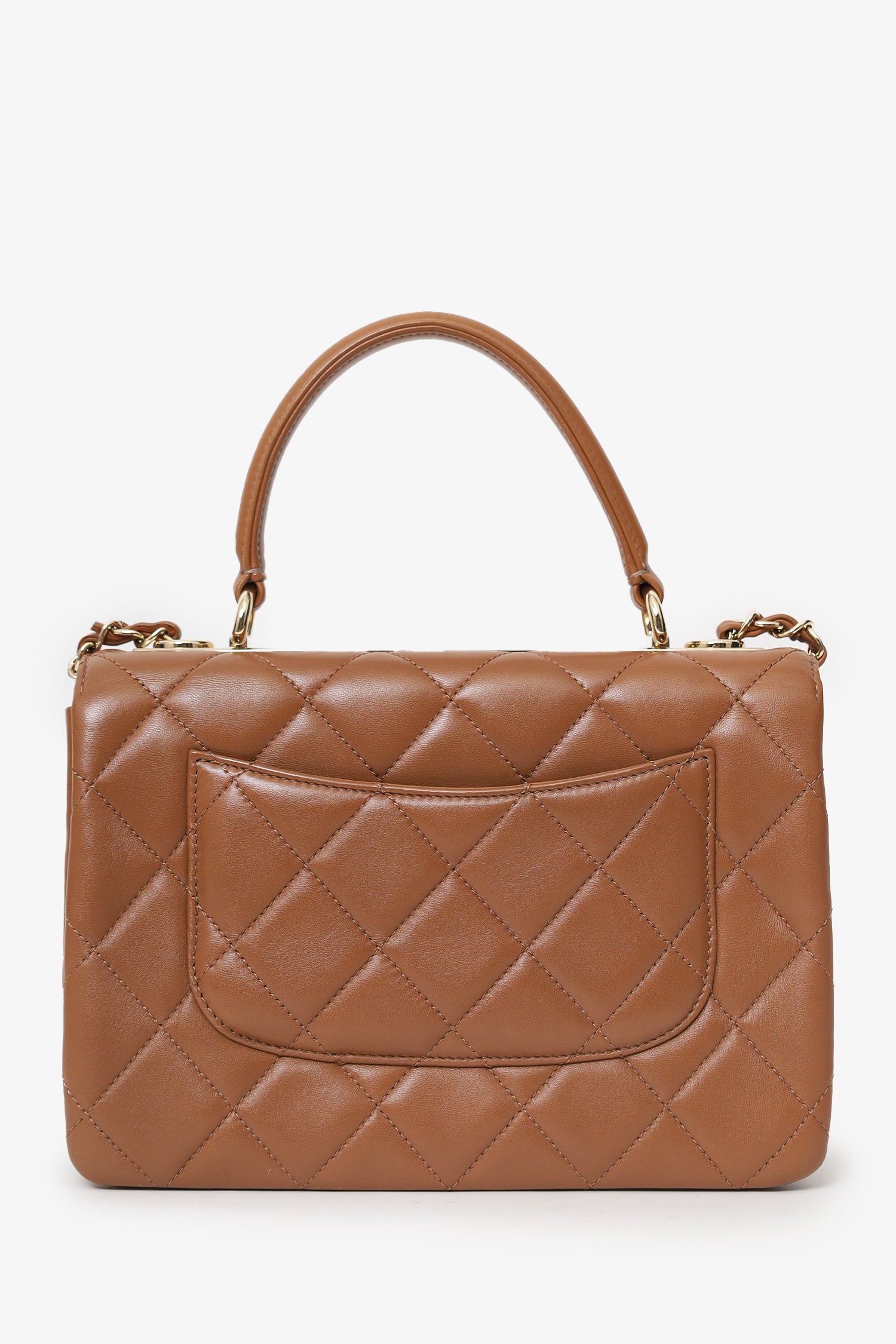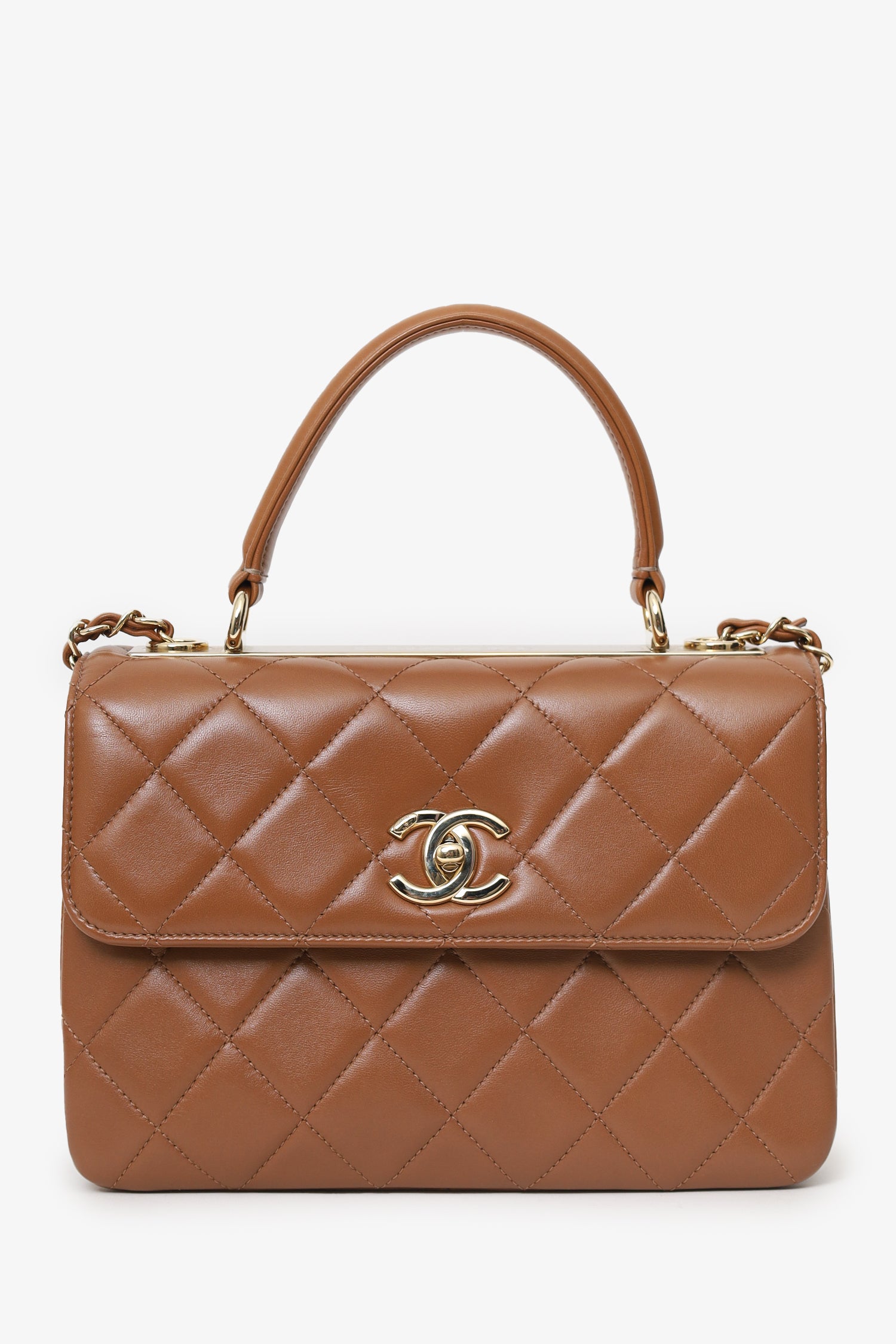 Refresh availabilityPre-Loved Chanel™ 2016/17 Light Brown Leather Quilted Trendy Top Handle. Front fold-over flap with turn-lock closure. Top handle. Removable chainlink shoulder strap. Single rear slip pocket. Lined interior with 5 pockets; 4 slip, and 1 lipstick. Gold-tone hardware. Tonal stitching.