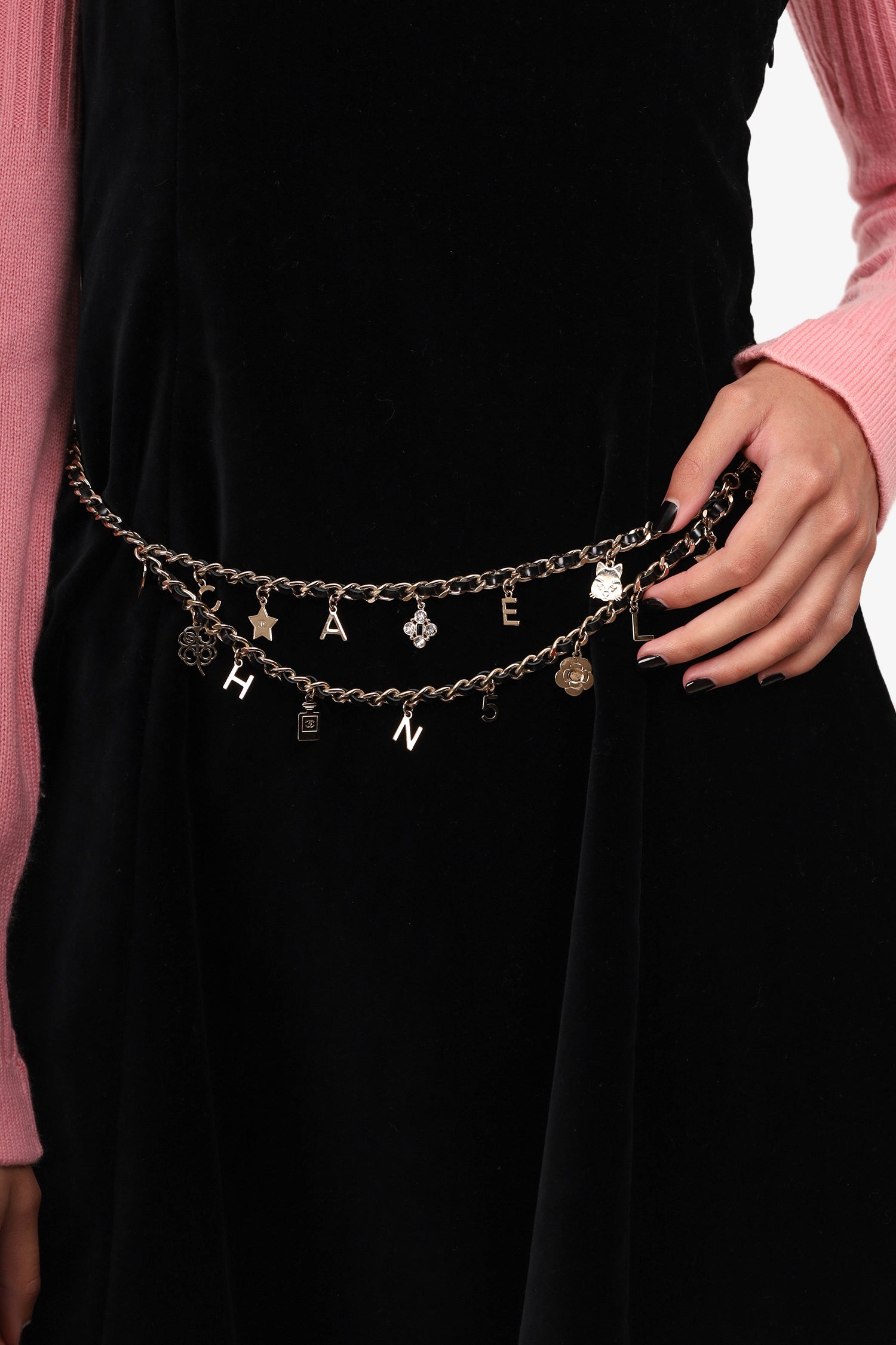 Chanel 2017 Gold Tone Woven Leather 'Chanel' Charm Belt. Patent leather woven in chain. Lobster claw clasp. Gold-tone hardware.