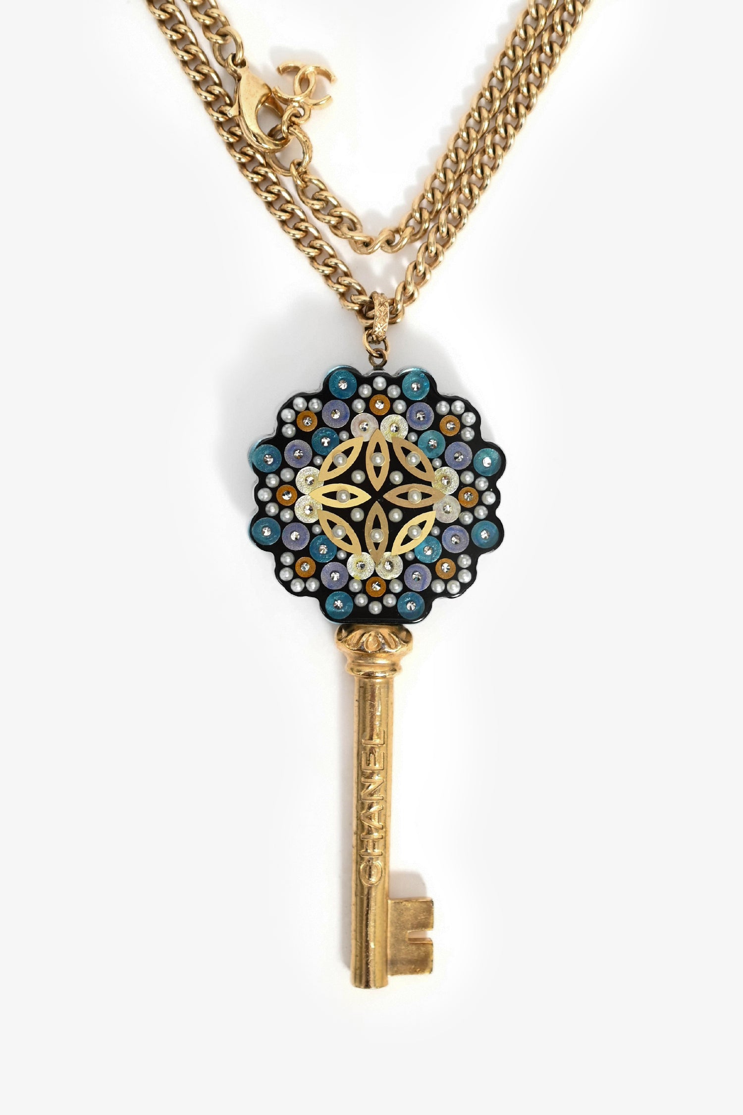 Refresh availabilityPre-Loved Chanel™ 2017 Gold Tone 'Collectables Key' Resin Pendant Necklace. Gold-tone hardware. Coated resin. Embellished sequins. Lobster clasp closure.