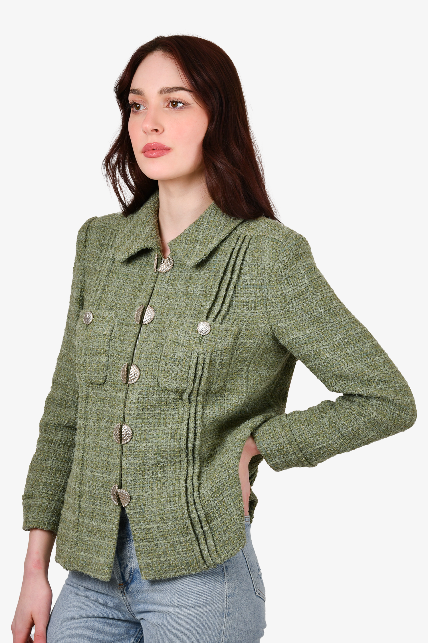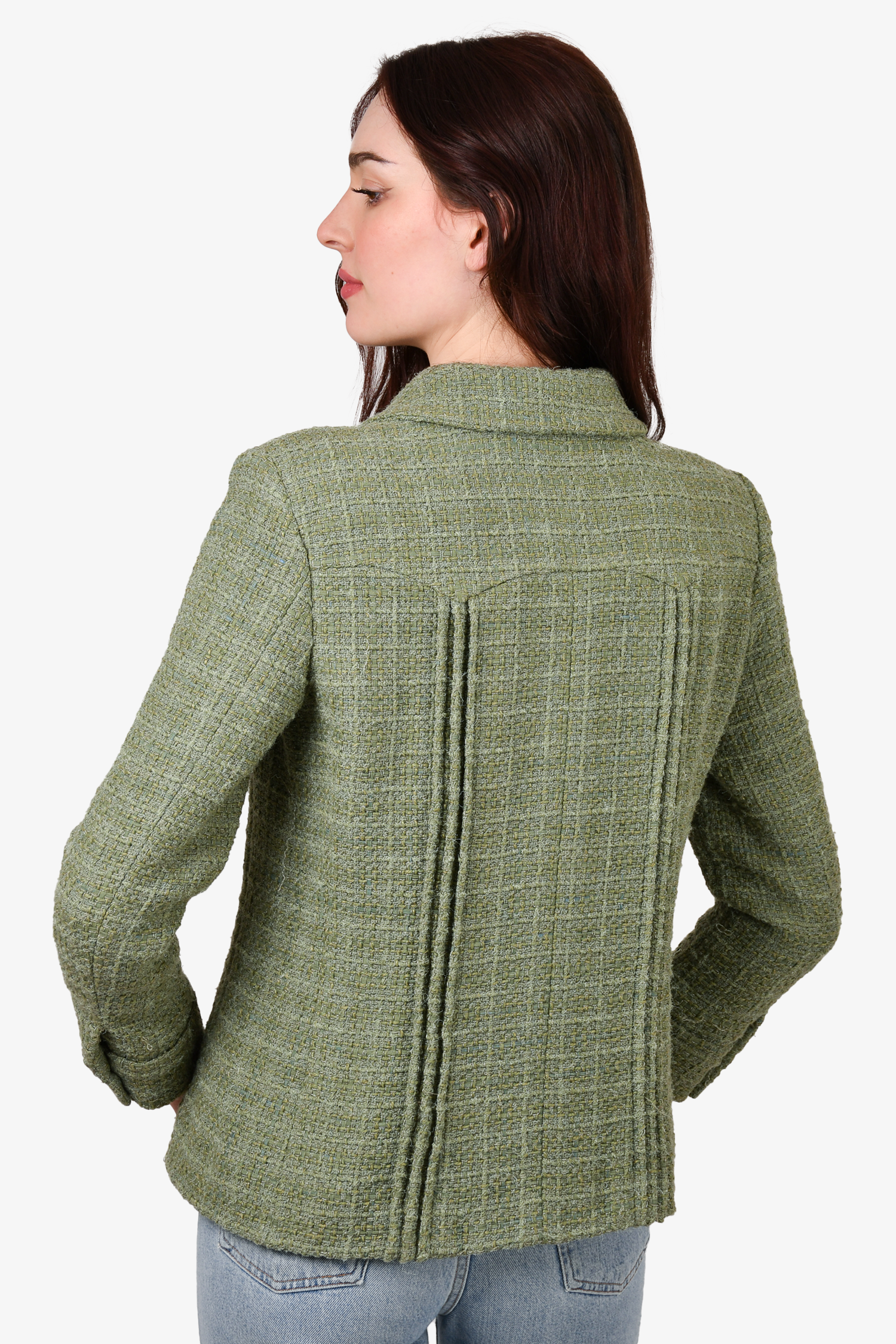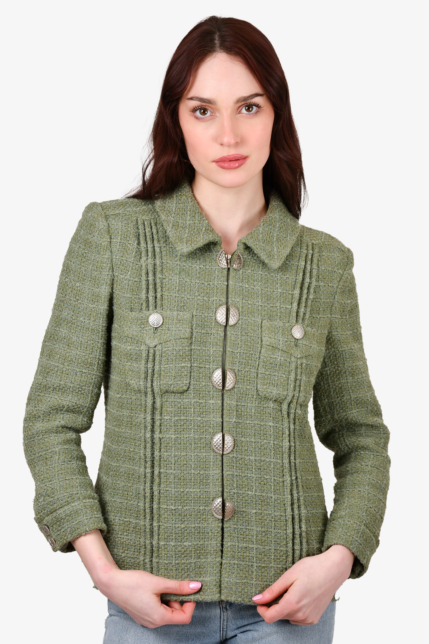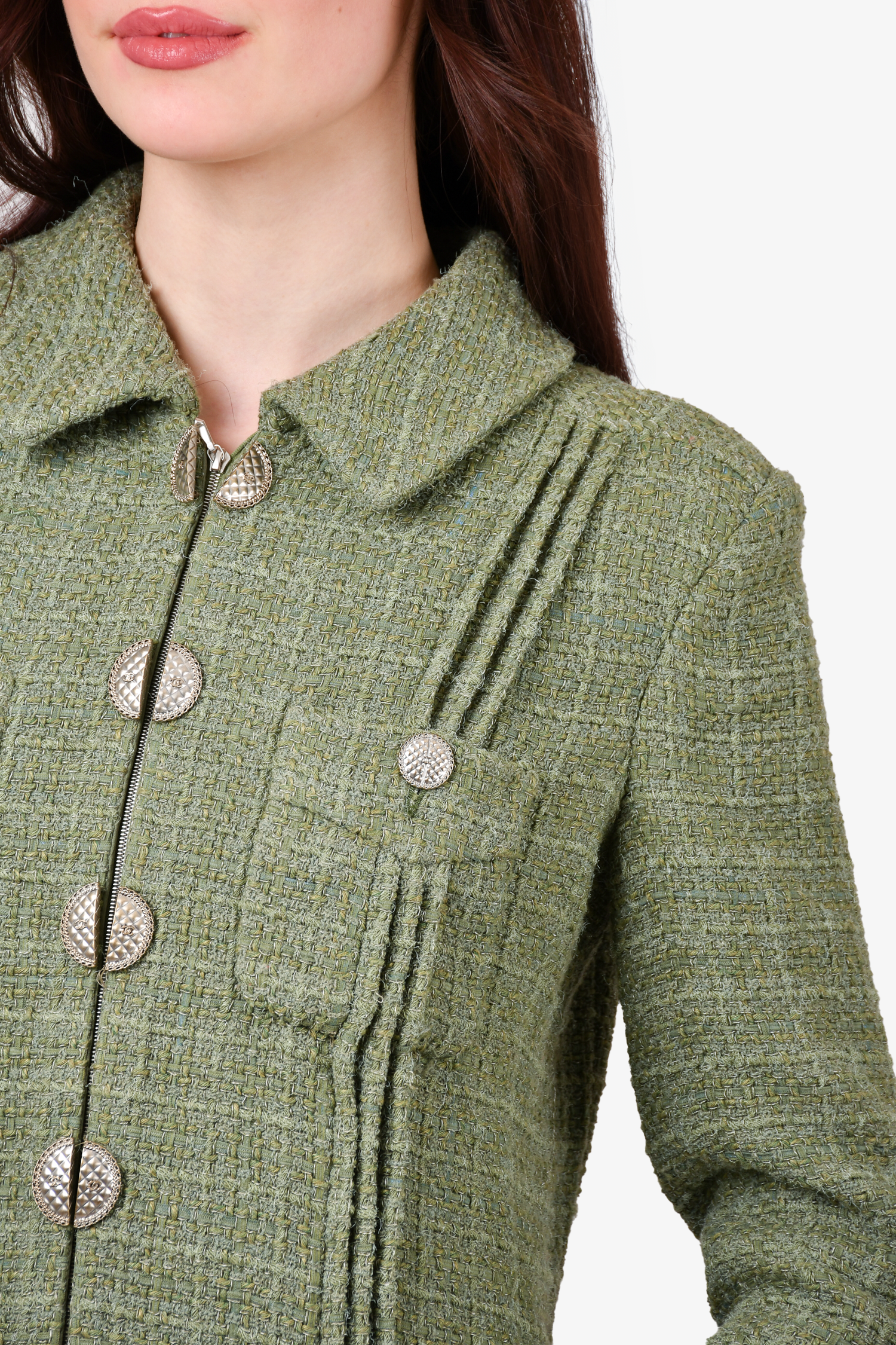 Pre-loved Chanel™ 2017 Green Tweed "Paris-Cuba" Zip-Up Blazer. Front chest pockets. Lined. Padded shoulders. Tonal stitching.